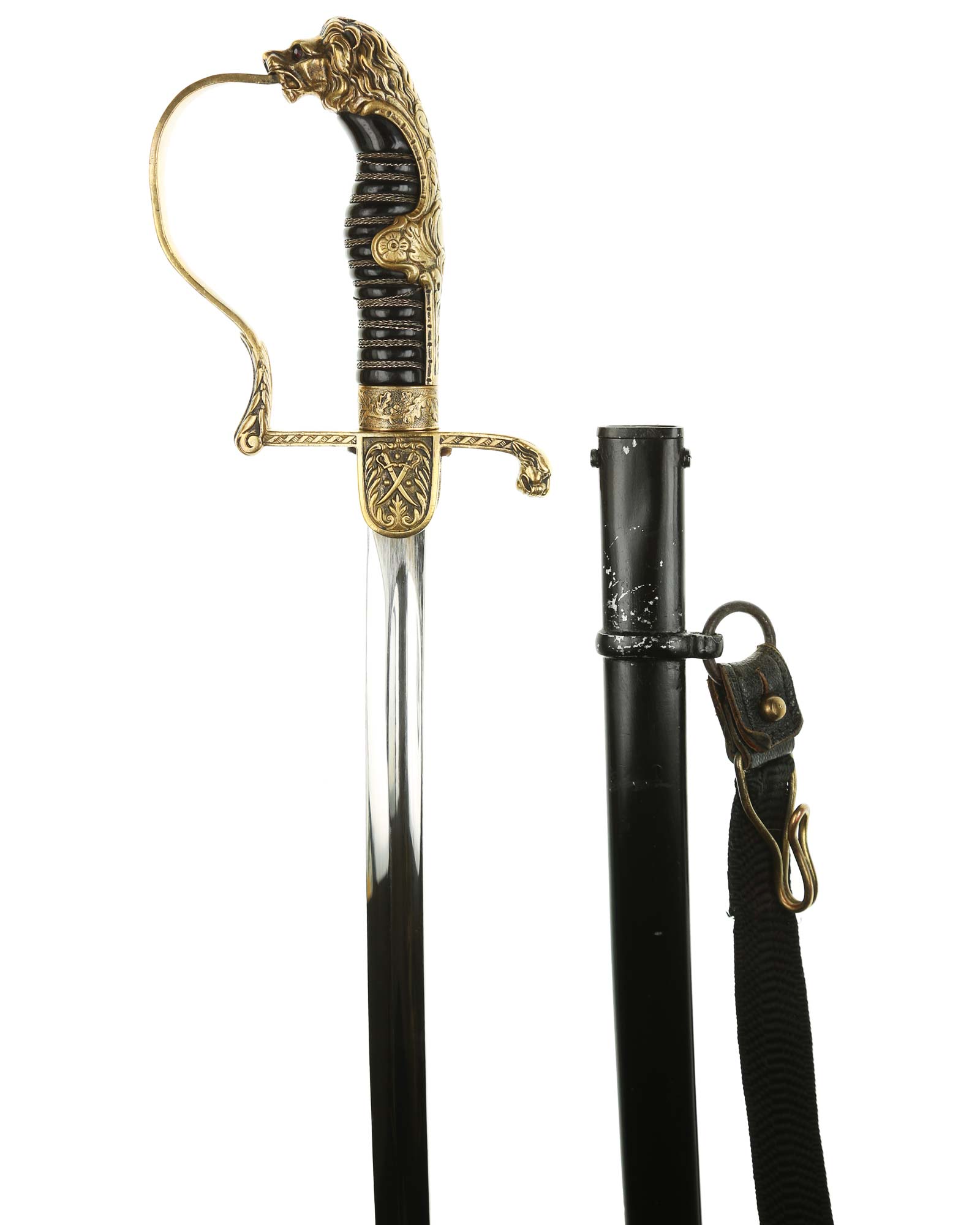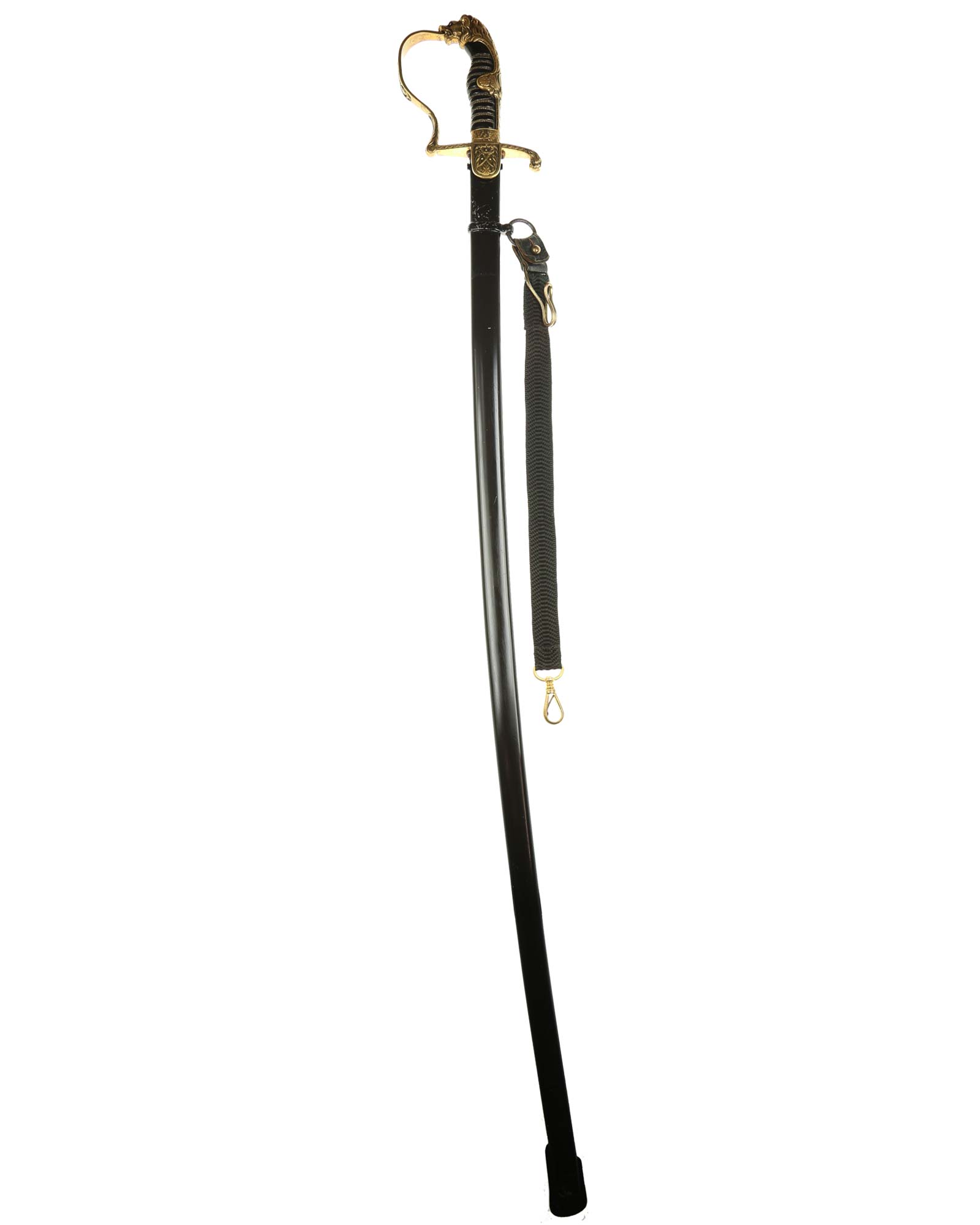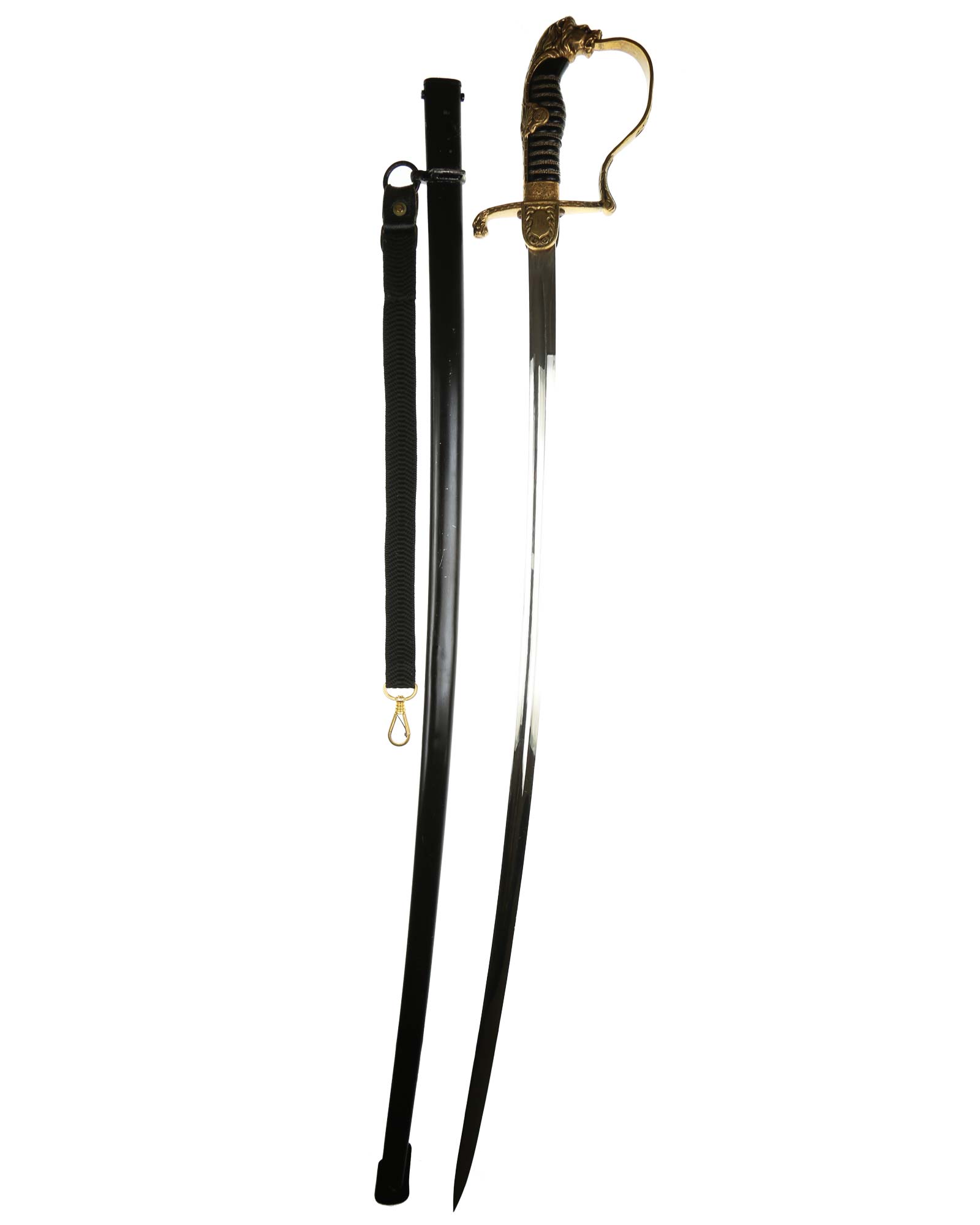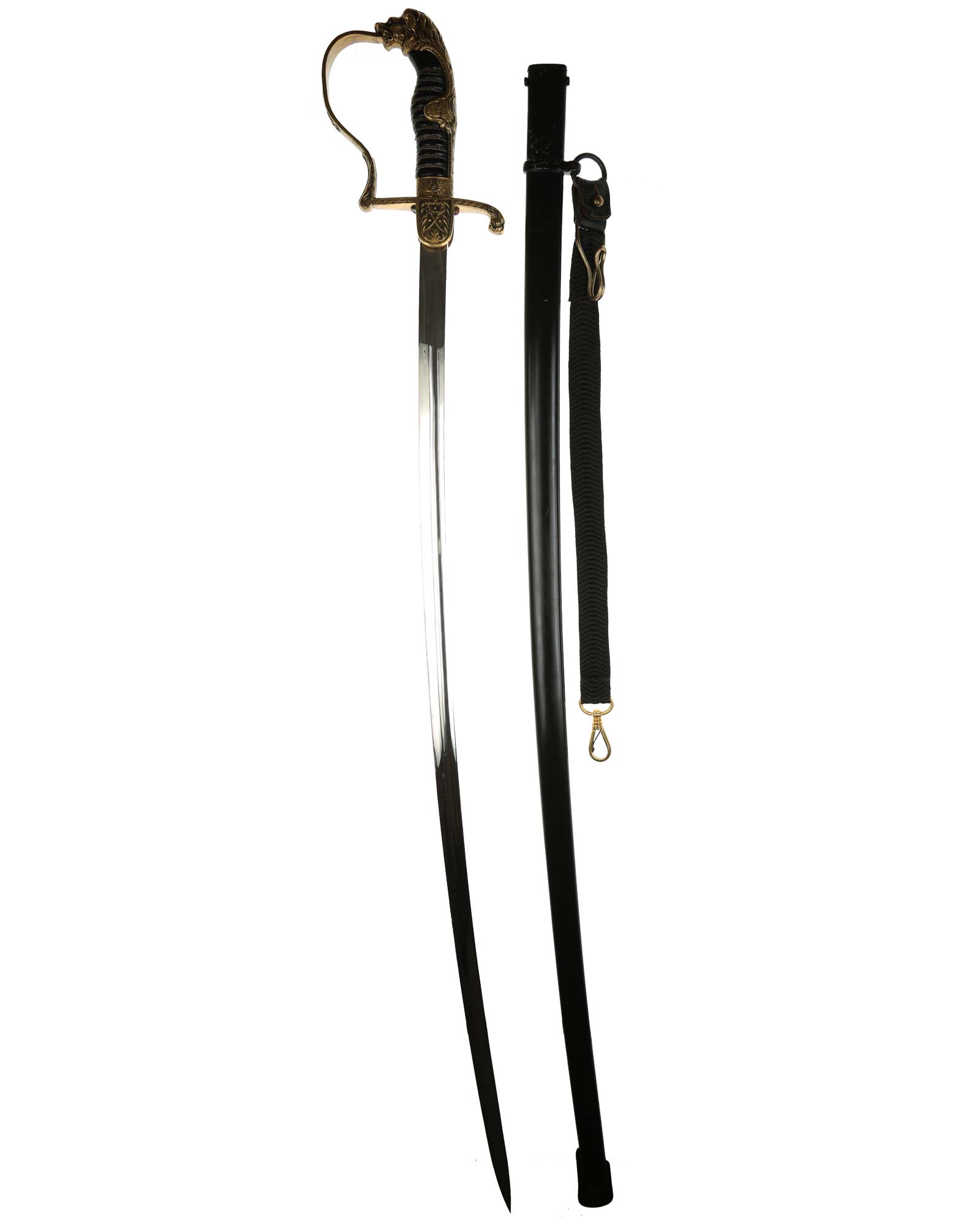 Reichswehr Säbel für Offiziere mit Gehänge (Löwenkopf-Säbel) von Carl Eickhorn Solingen. Löwenkopfgefäß mit verzierten Parierbügel, schwarzer Griff mit intakter Drahtwicklung. Beide Parierstangen-Lappen sind dekoriert, auf der Vorderseite mit gekreuzten Schwertern. Leicht gekrümmte Klinge, zwei Hohlkehlen. Rückseite mit Herstellerlogo Original Eickhorn Solingen. Stahlscheide mit einem Tragering und Gehänge.