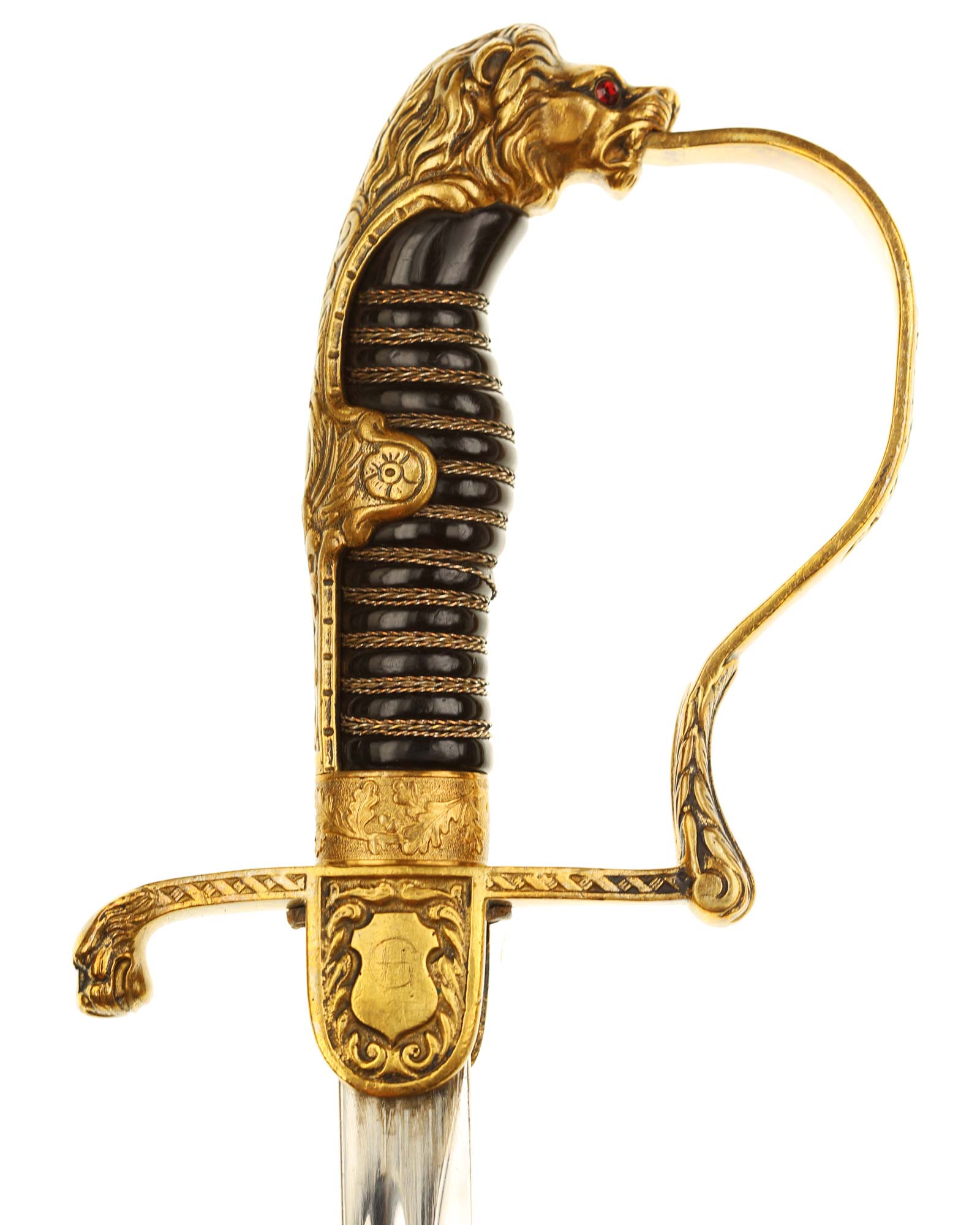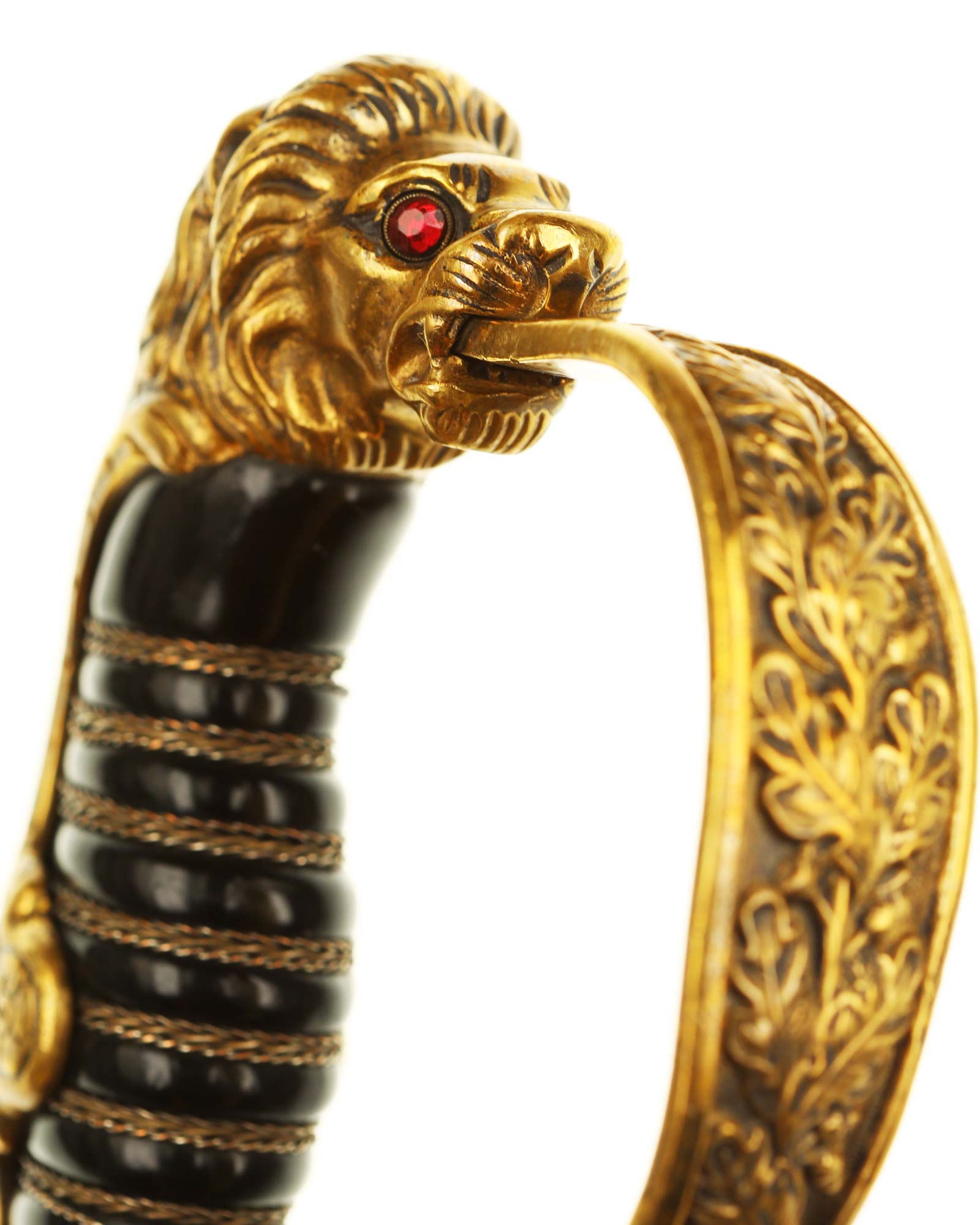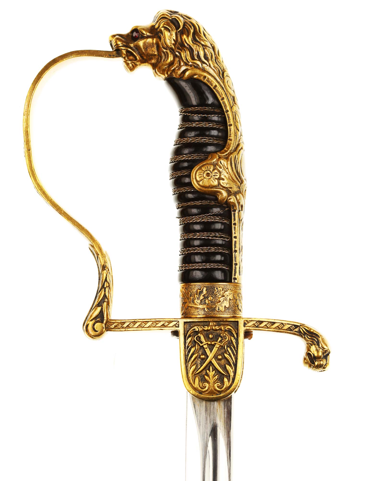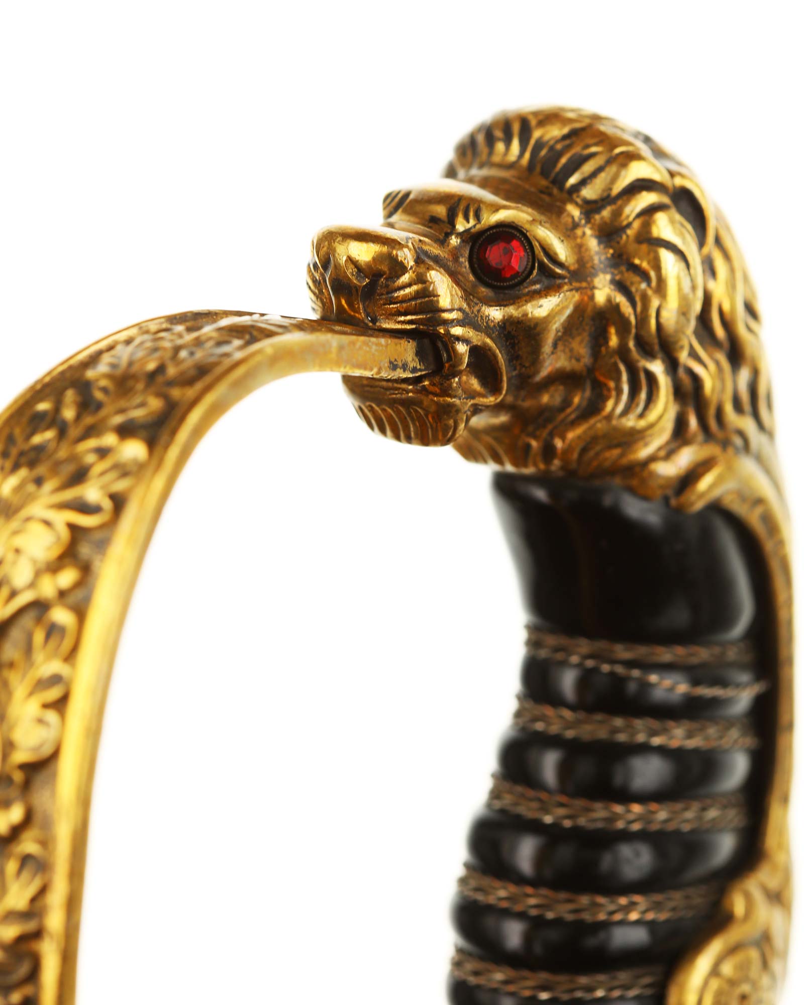 Reichswehr Säbel für Offiziere mit Gehänge (Löwenkopf-Säbel) von Carl Eickhorn Solingen. Löwenkopfgefäß mit verzierten Parierbügel, schwarzer Griff mit intakter Drahtwicklung. Beide Parierstangen-Lappen sind dekoriert, auf der Vorderseite mit gekreuzten Schwertern. Leicht gekrümmte Klinge, zwei Hohlkehlen. Rückseite mit Herstellerlogo Original Eickhorn Solingen. Stahlscheide mit einem Tragering und Gehänge.