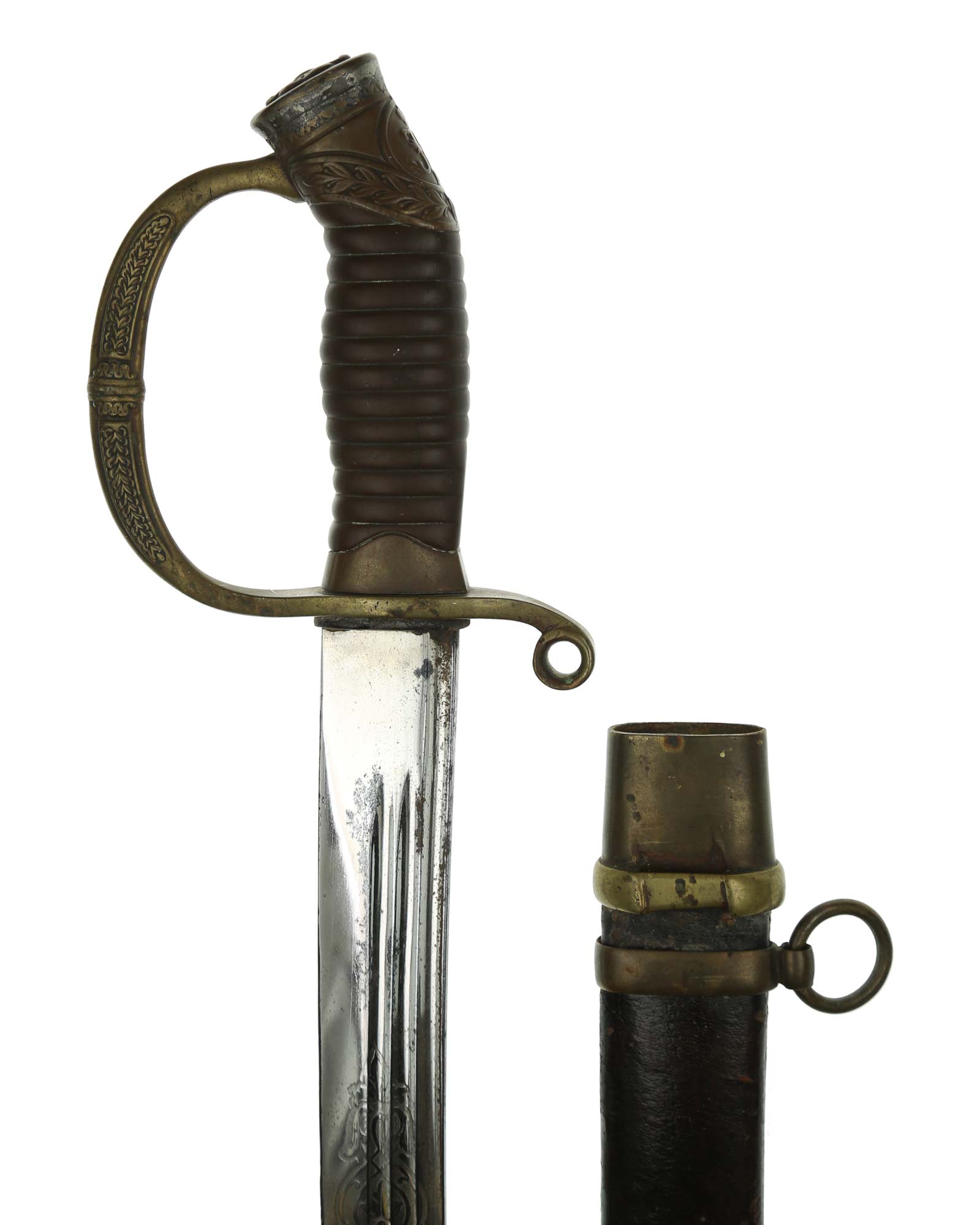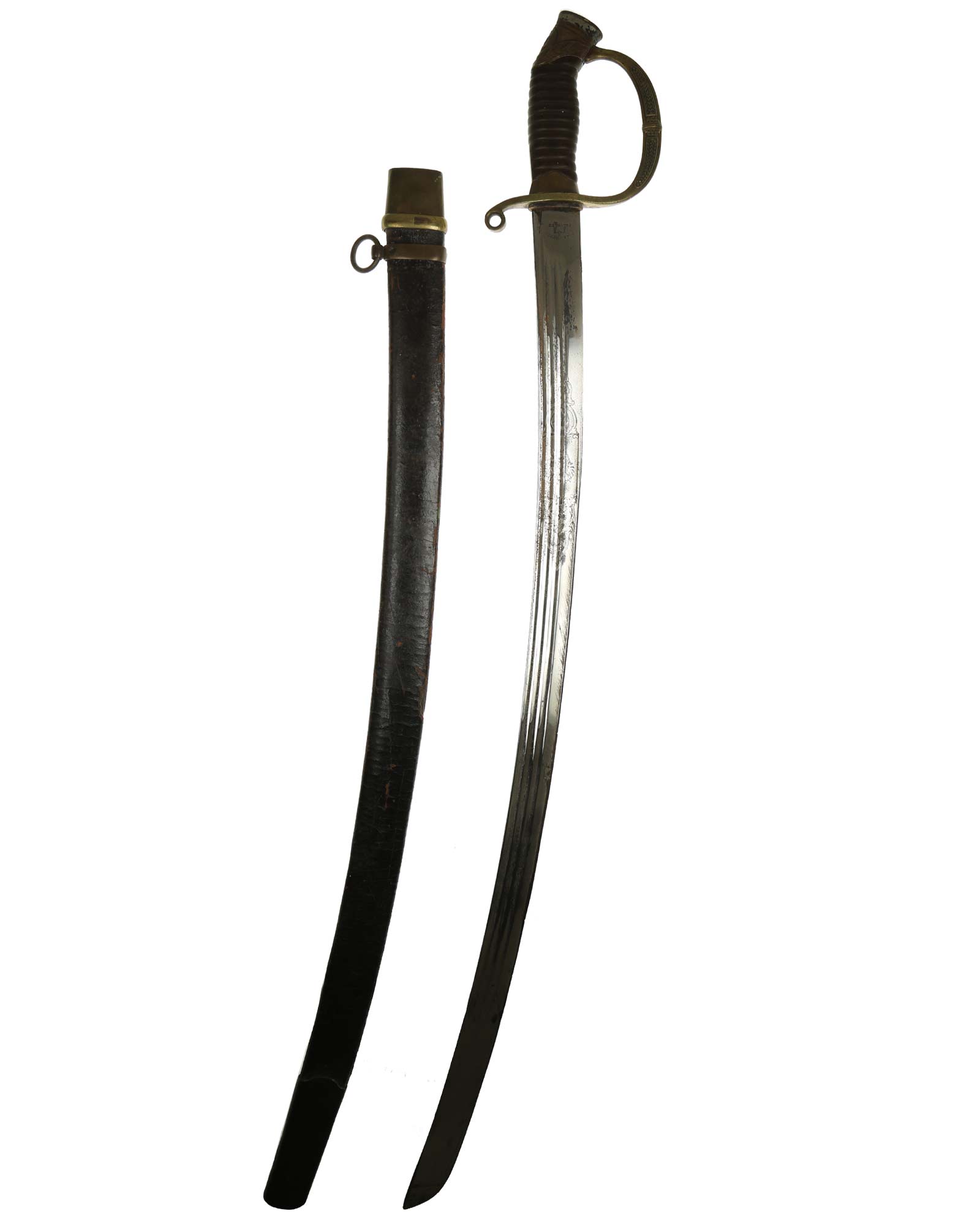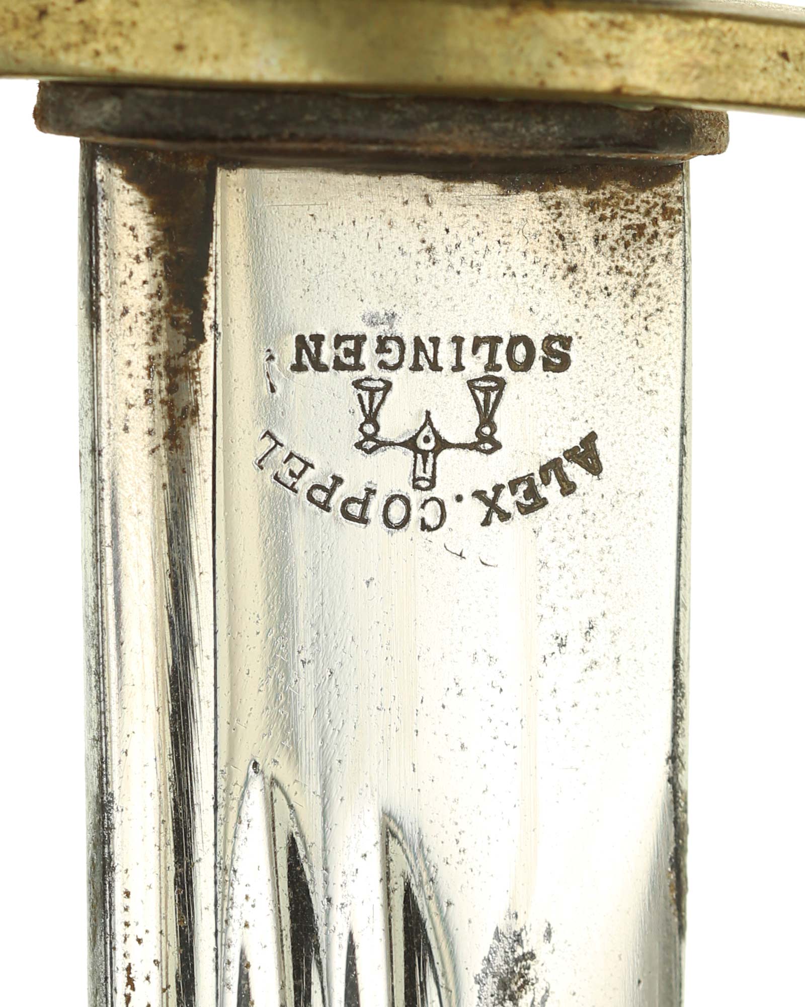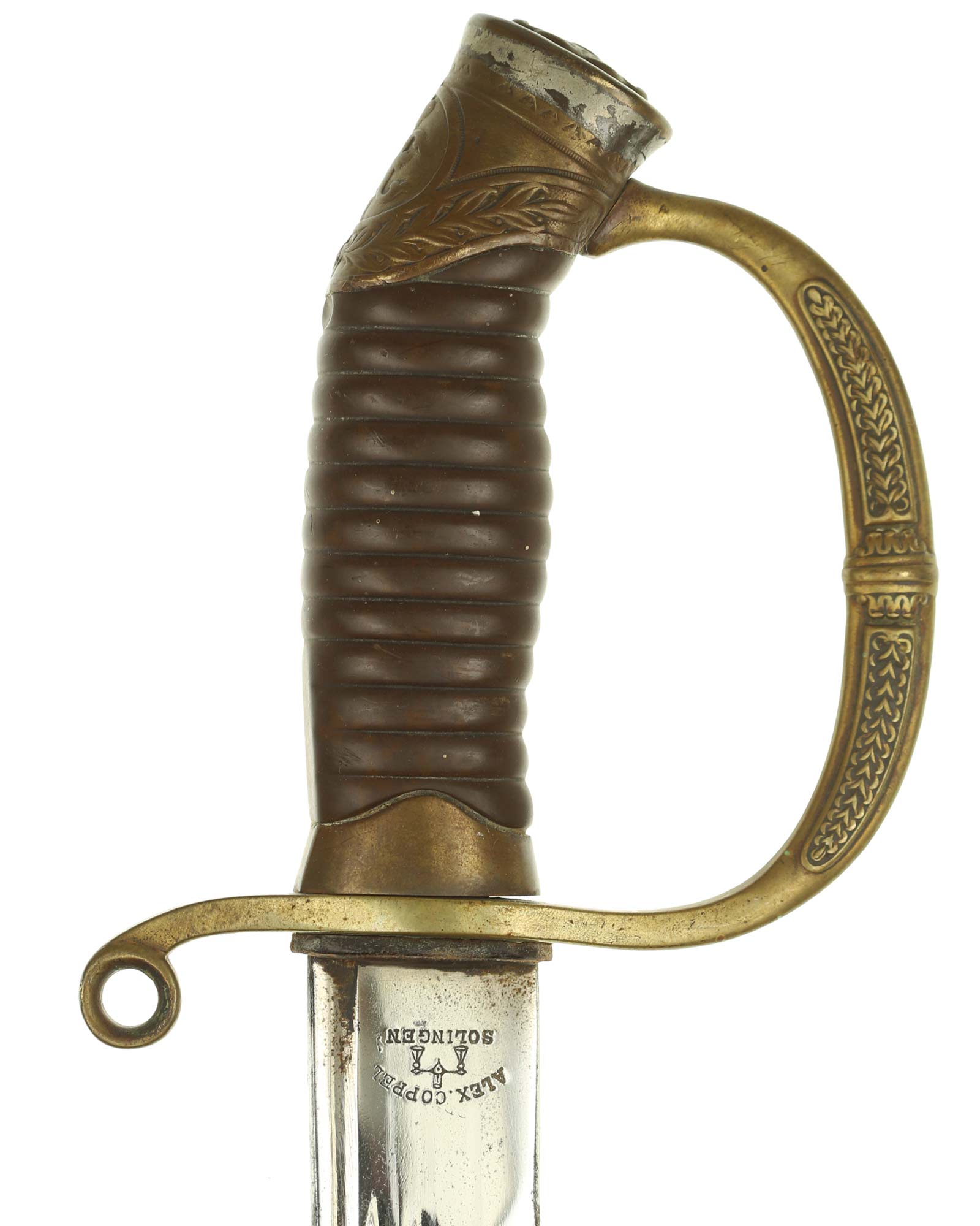 Dragoner Schaschka für Offiziere Modell 1881/1909. Messingbügelgefäß, auf dem Kappenrücken kyrillische Chiffre, schwarzer Horngriff. Die Klinge ist leicht geschwungen, beidseitig gekehlt und geätzt. Die Rückseite ist mit Solinger Hersteller Alex Coppel Solingen. Schwarzbelederte Scheide mit Messingbeschlägen.
