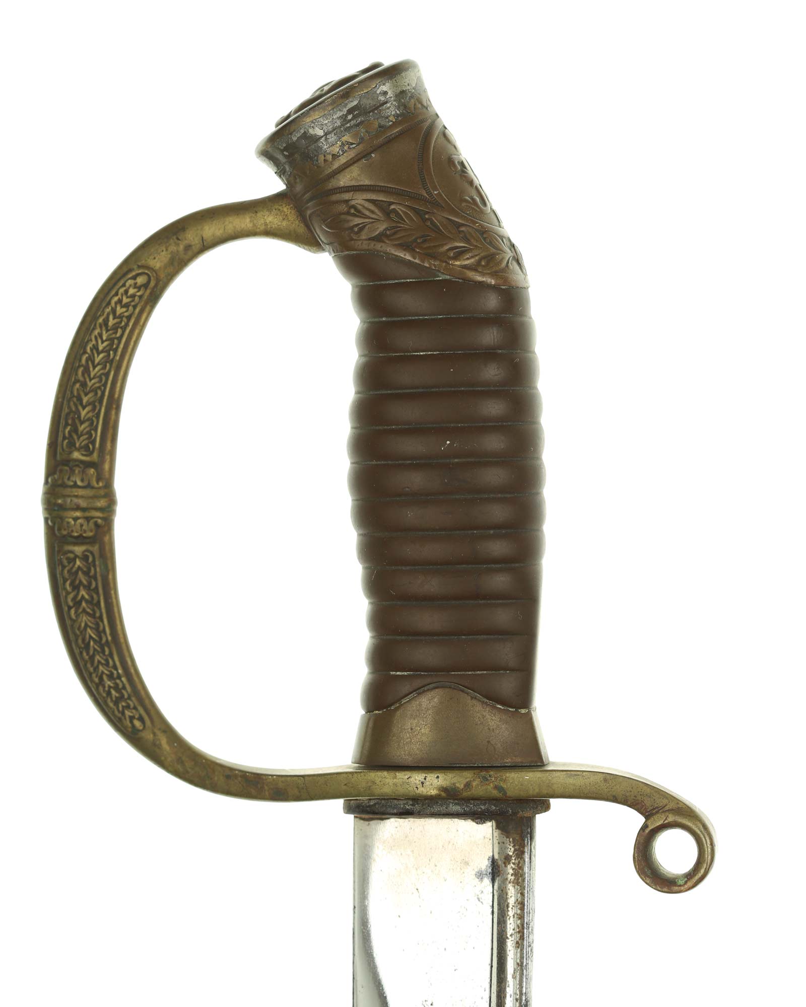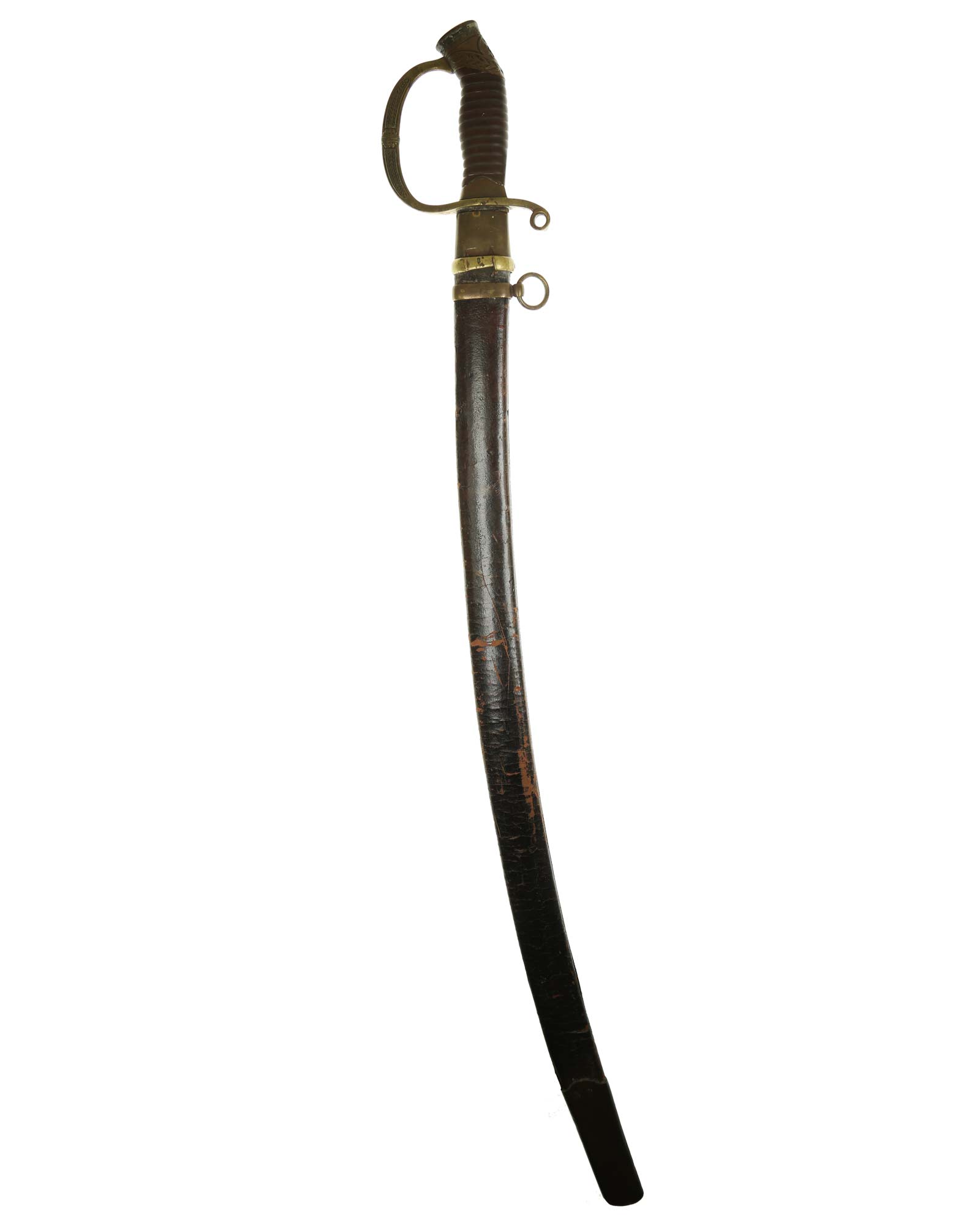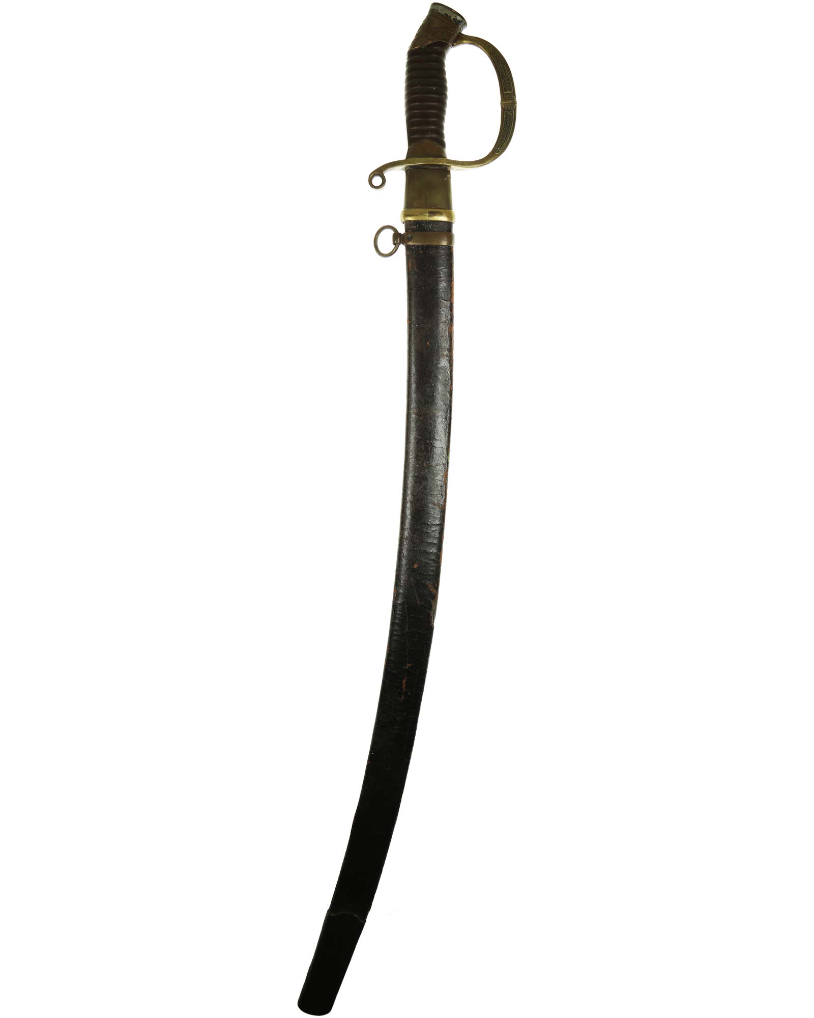 Dragoner Schaschka für Offiziere Modell 1881/1909. Messingbügelgefäß, auf dem Kappenrücken kyrillische Chiffre, schwarzer Horngriff. Die Klinge ist leicht geschwungen, beidseitig gekehlt und geätzt. Die Rückseite ist mit Solinger Hersteller Alex Coppel Solingen. Schwarzbelederte Scheide mit Messingbeschlägen.