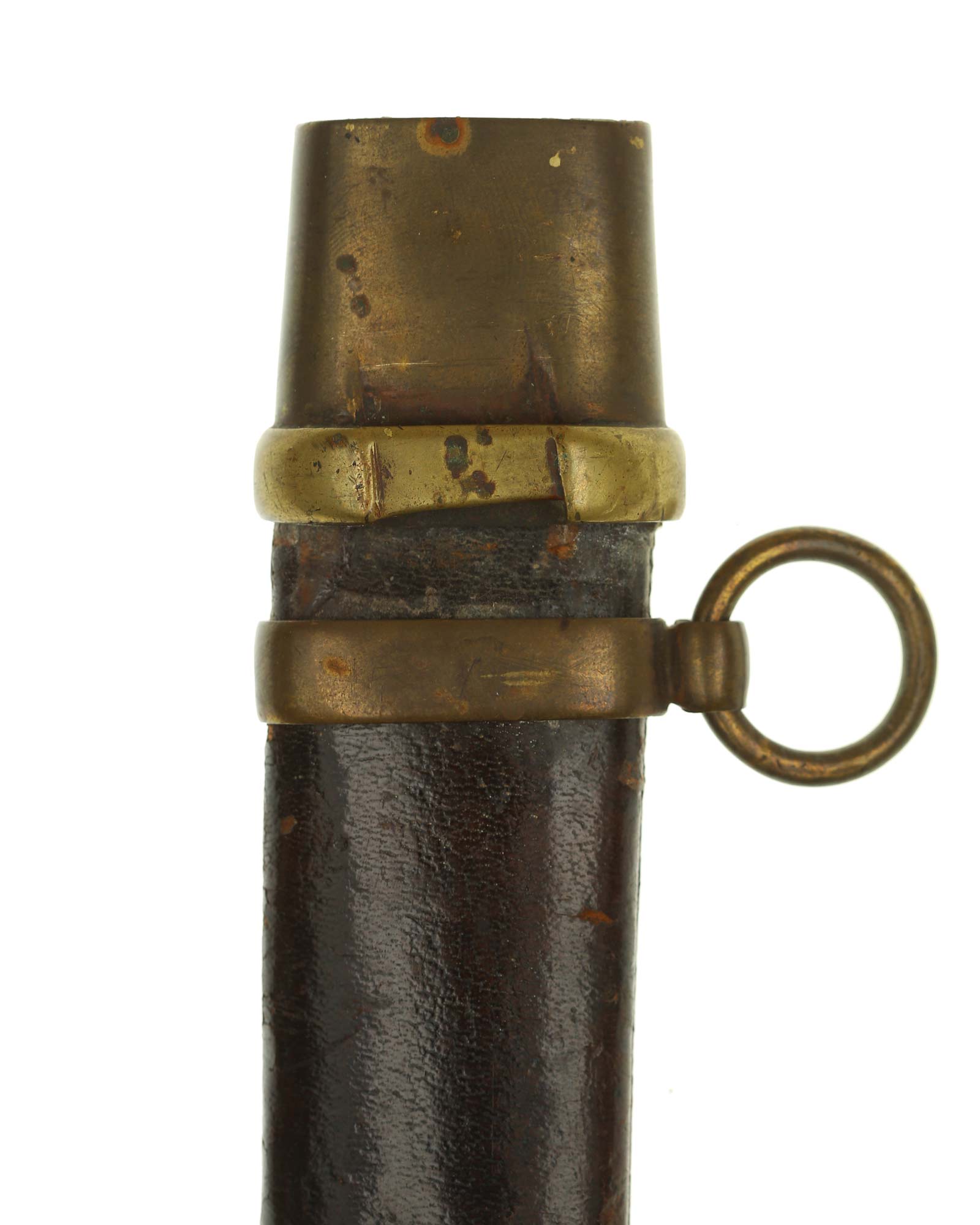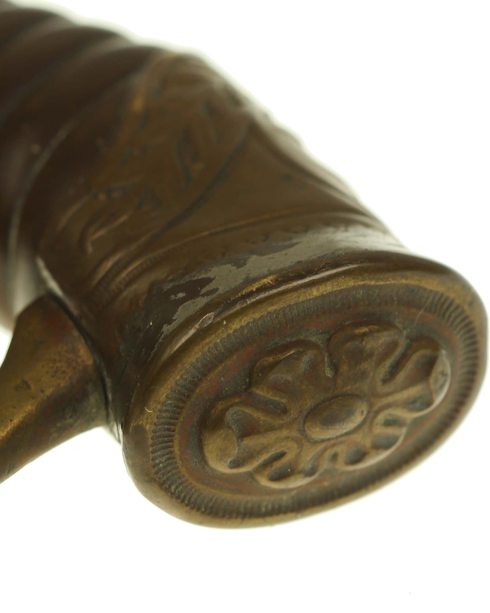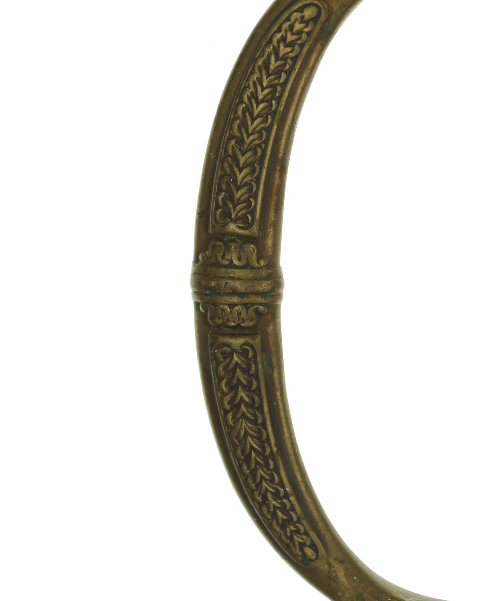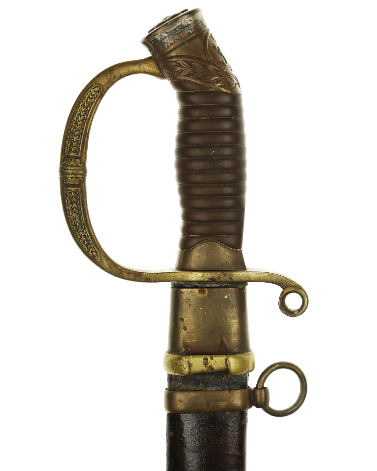 Dragoner Schaschka für Offiziere Modell 1881/1909. Messingbügelgefäß, auf dem Kappenrücken kyrillische Chiffre, schwarzer Horngriff. Die Klinge ist leicht geschwungen, beidseitig gekehlt und geätzt. Die Rückseite ist mit Solinger Hersteller Alex Coppel Solingen. Schwarzbelederte Scheide mit Messingbeschlägen.