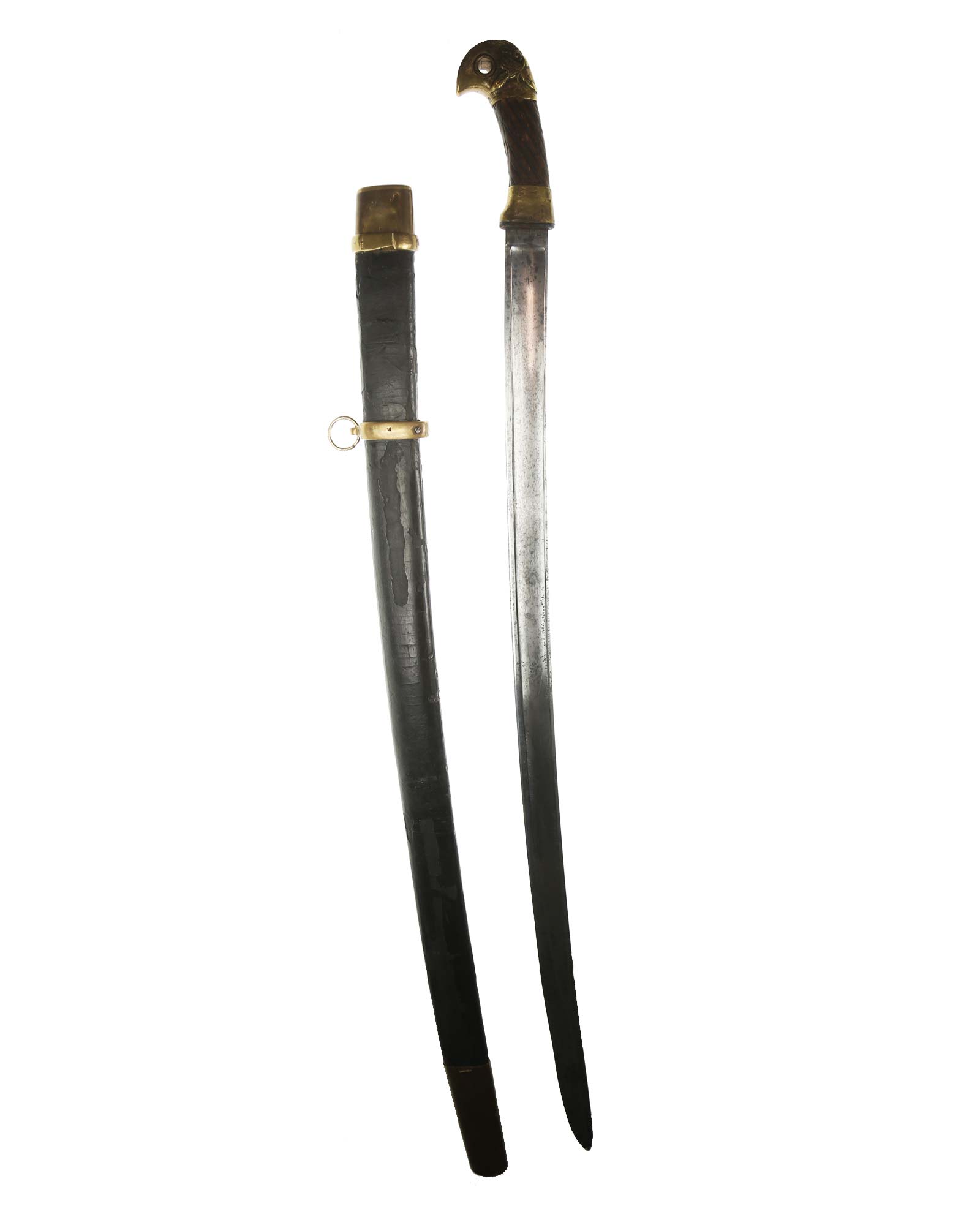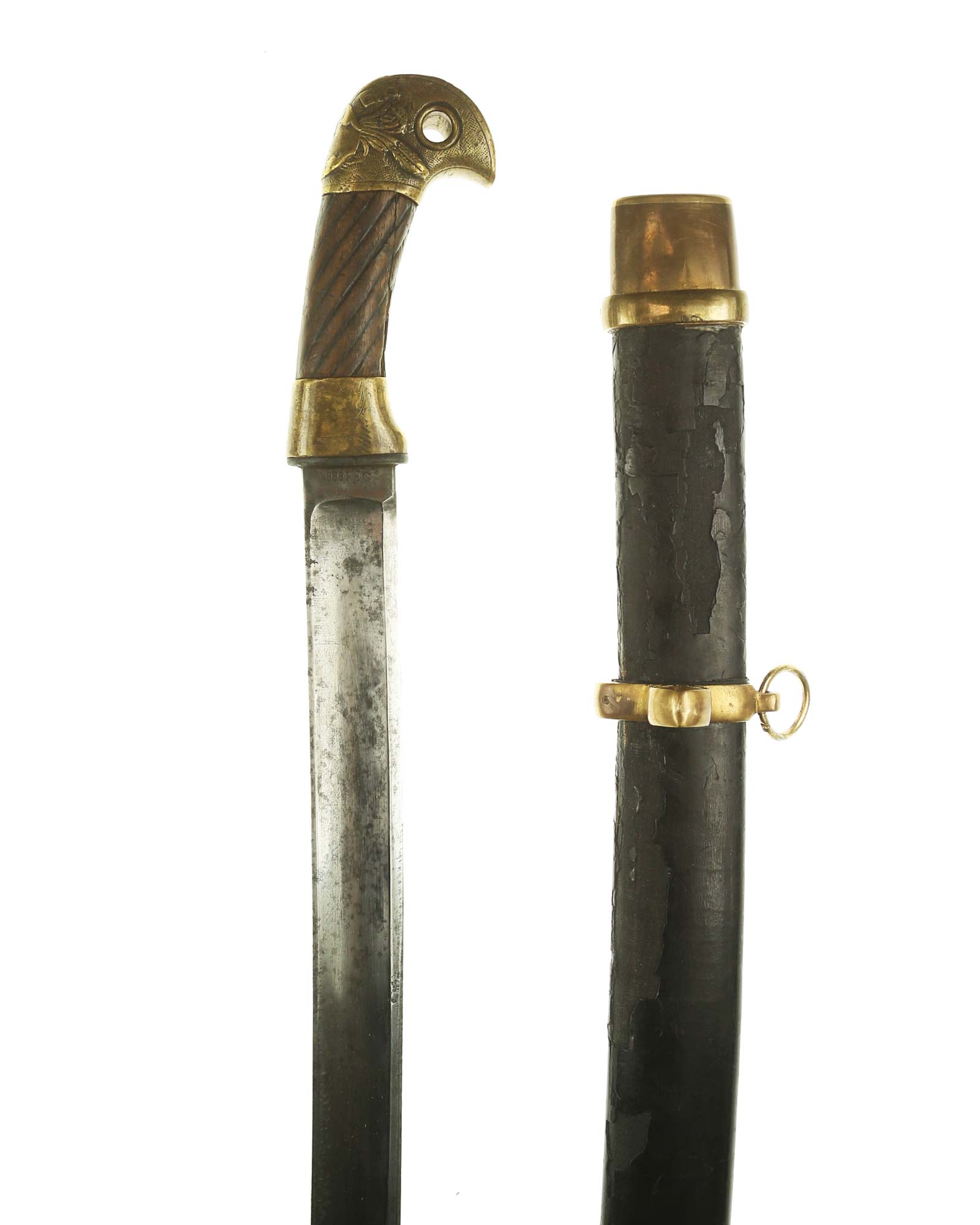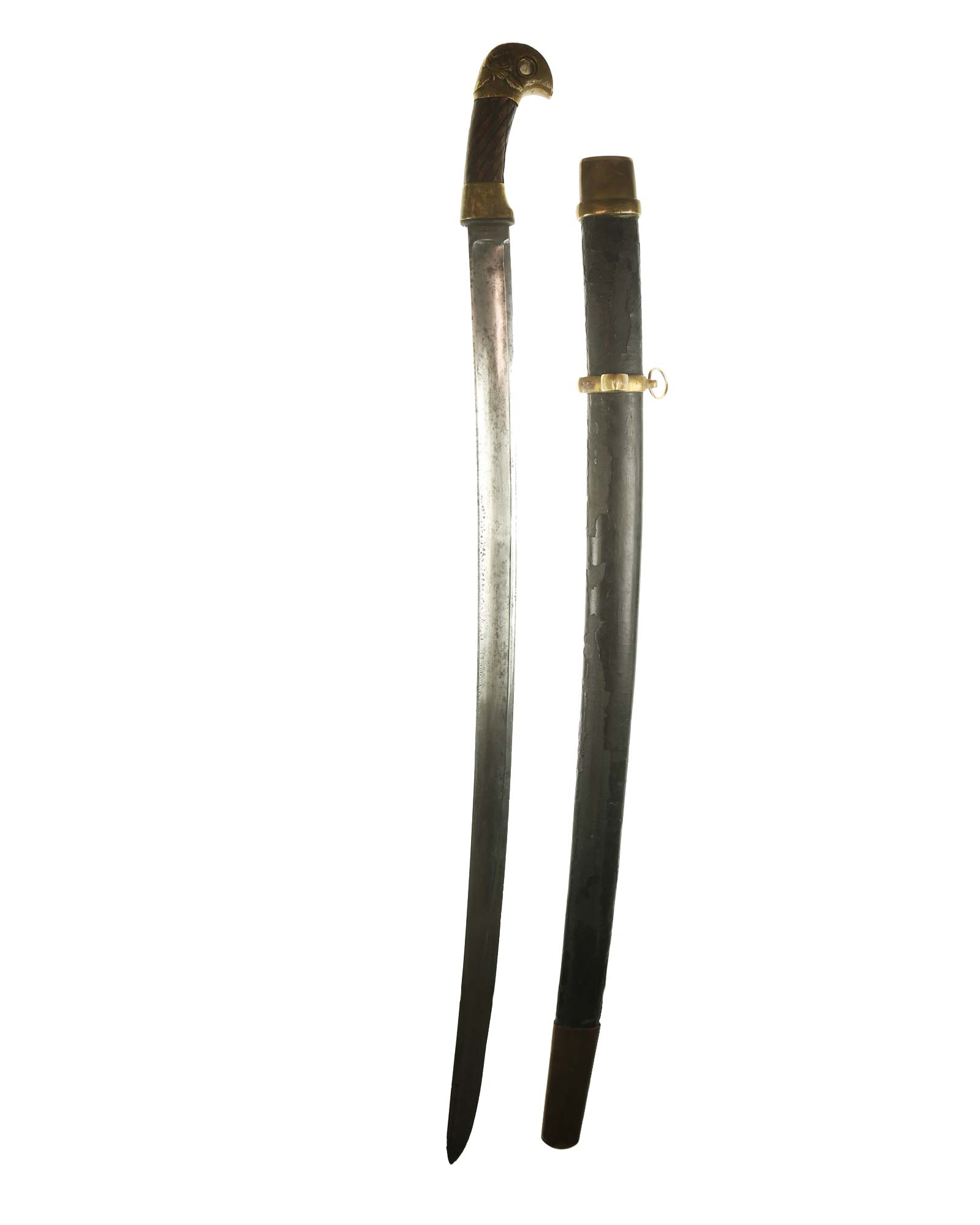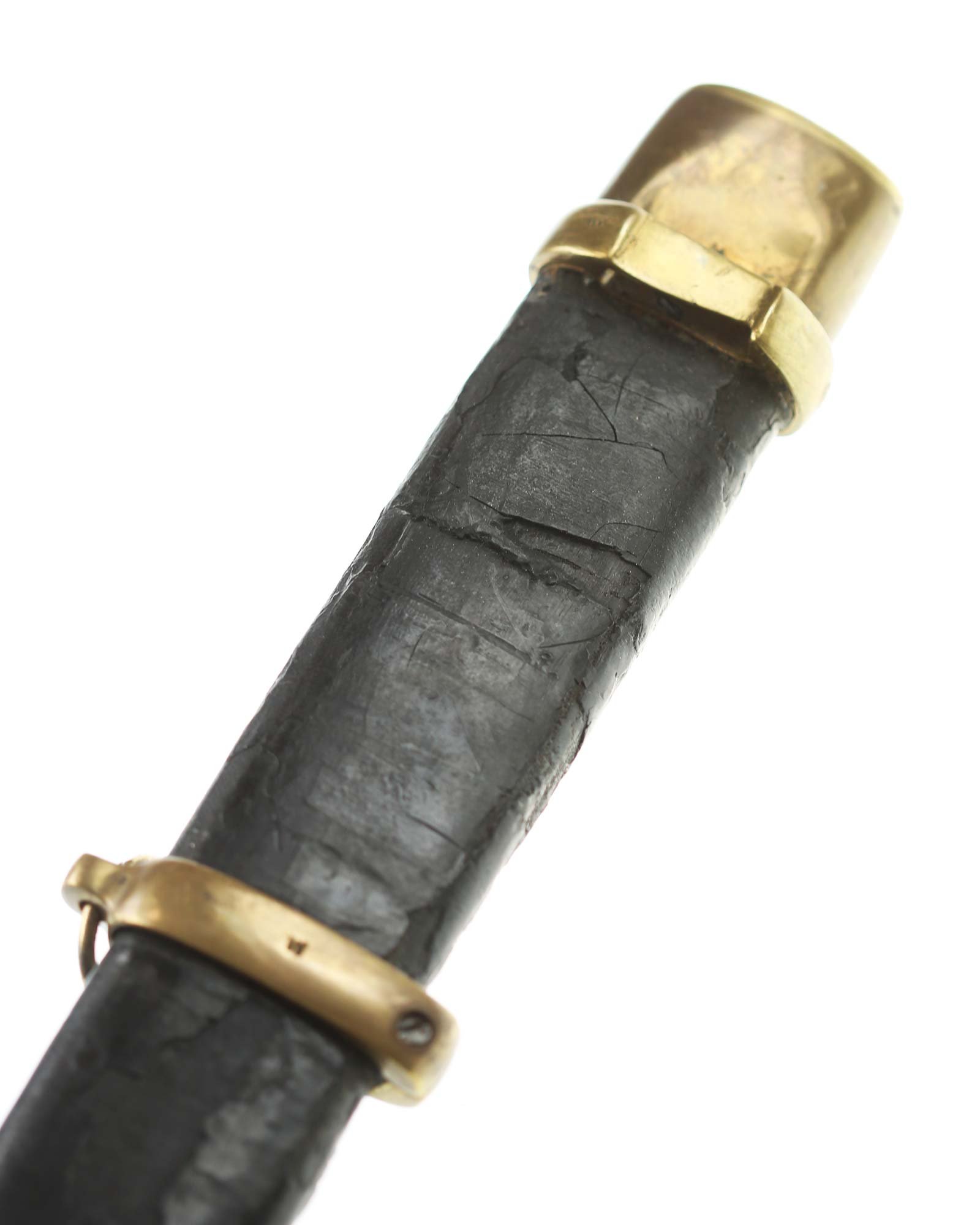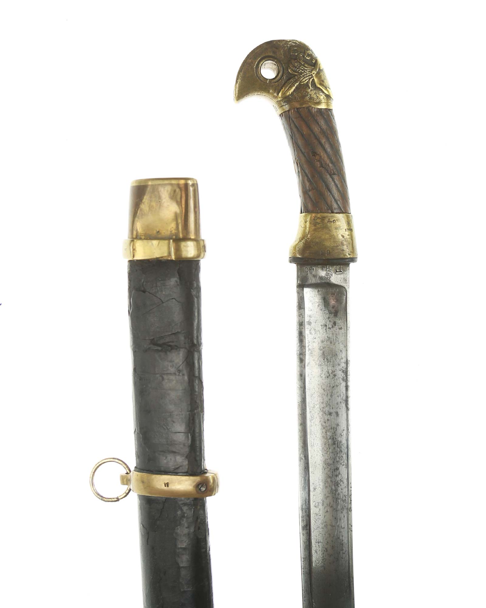 Schaschka Modell 1881 für Offiziere, Sowjetunion, datiert 1928. Gekehlte Rückenklinge mit zweischneidiger Spitze, auf der Fehlschärfe kyrillische Abnahmemarke und Datierung "1928". Gestempeltes Messinggefäß mit Marke von Slatoust mit Hammer und Sichel sowie "C.C.C.P." auf der Knaufkappe. Spiralförmig geschnitzter Holzgriff. Schwarzledern bezogene Holzscheide mit Messingmontierung.