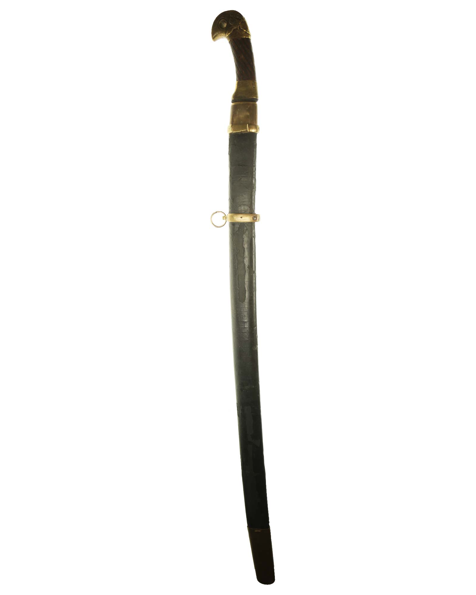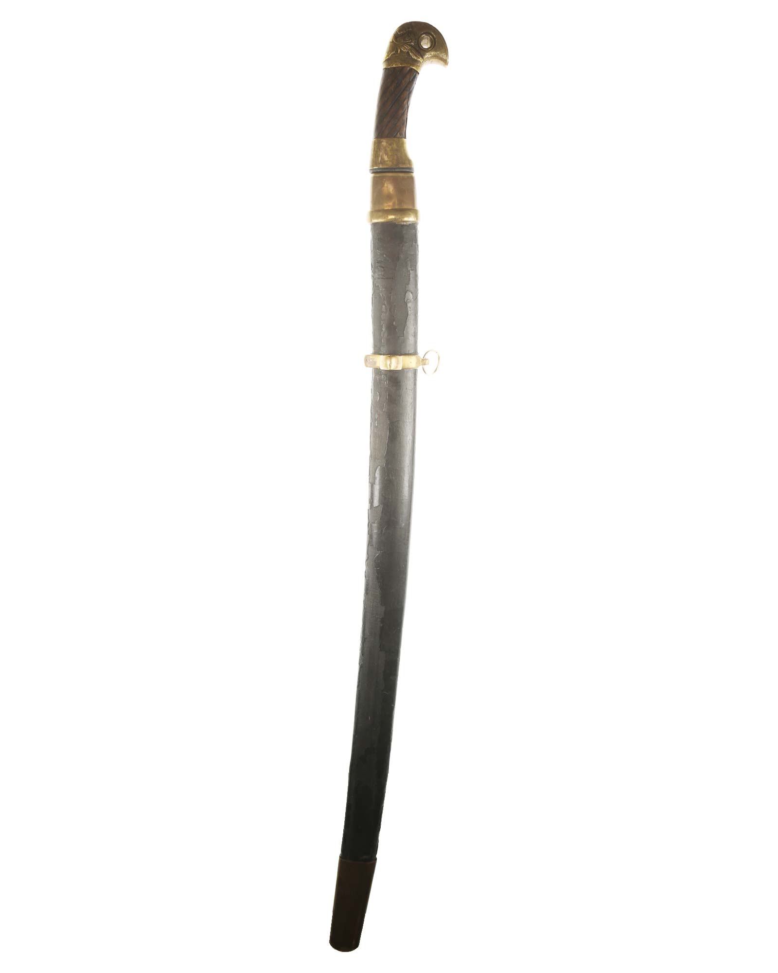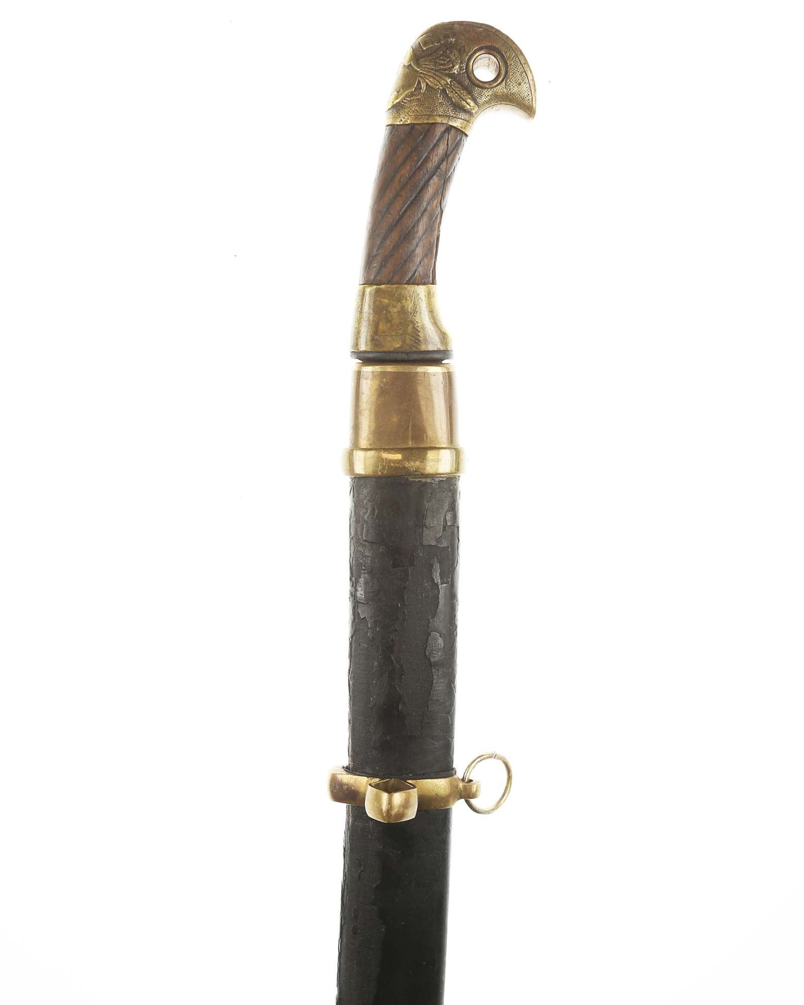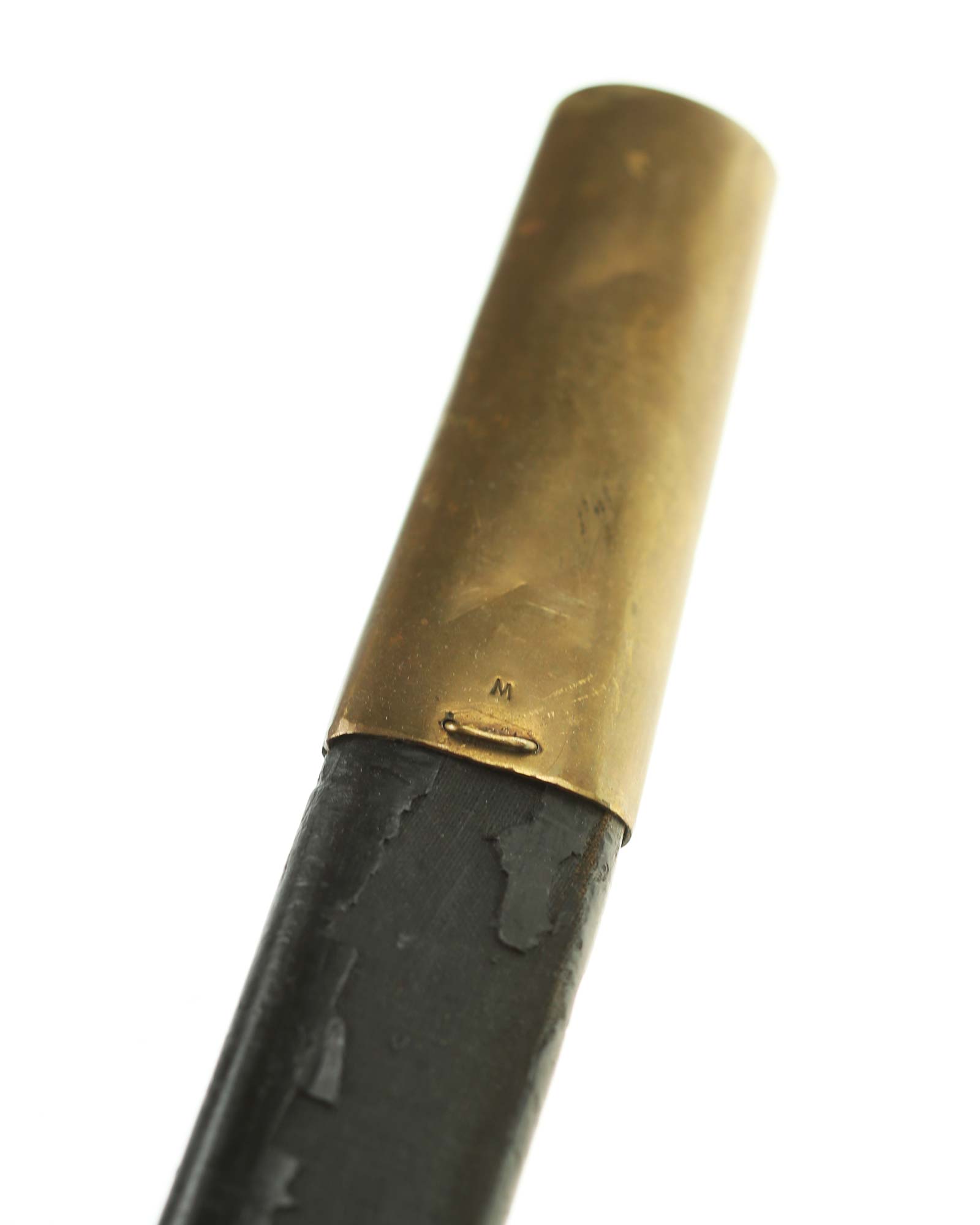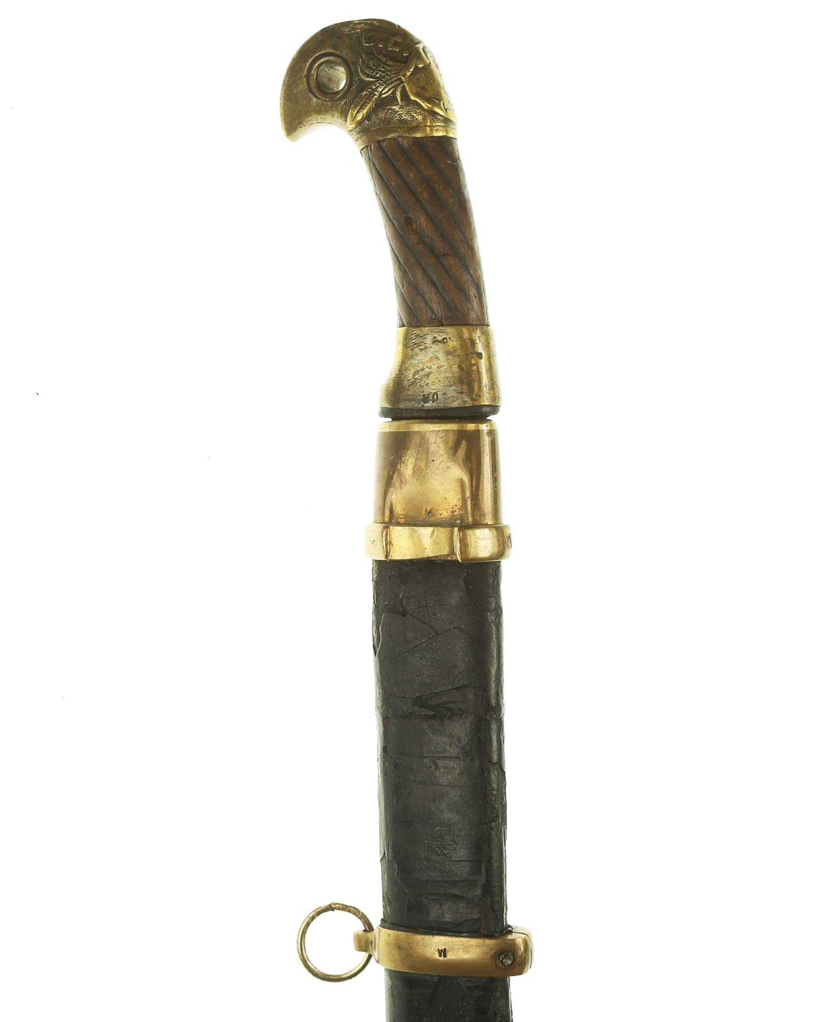 Schaschka Modell 1881 für Offiziere, Sowjetunion, datiert 1928. Gekehlte Rückenklinge mit zweischneidiger Spitze, auf der Fehlschärfe kyrillische Abnahmemarke und Datierung "1928". Gestempeltes Messinggefäß mit Marke von Slatoust mit Hammer und Sichel sowie "C.C.C.P." auf der Knaufkappe. Spiralförmig geschnitzter Holzgriff. Schwarzledern bezogene Holzscheide mit Messingmontierung.