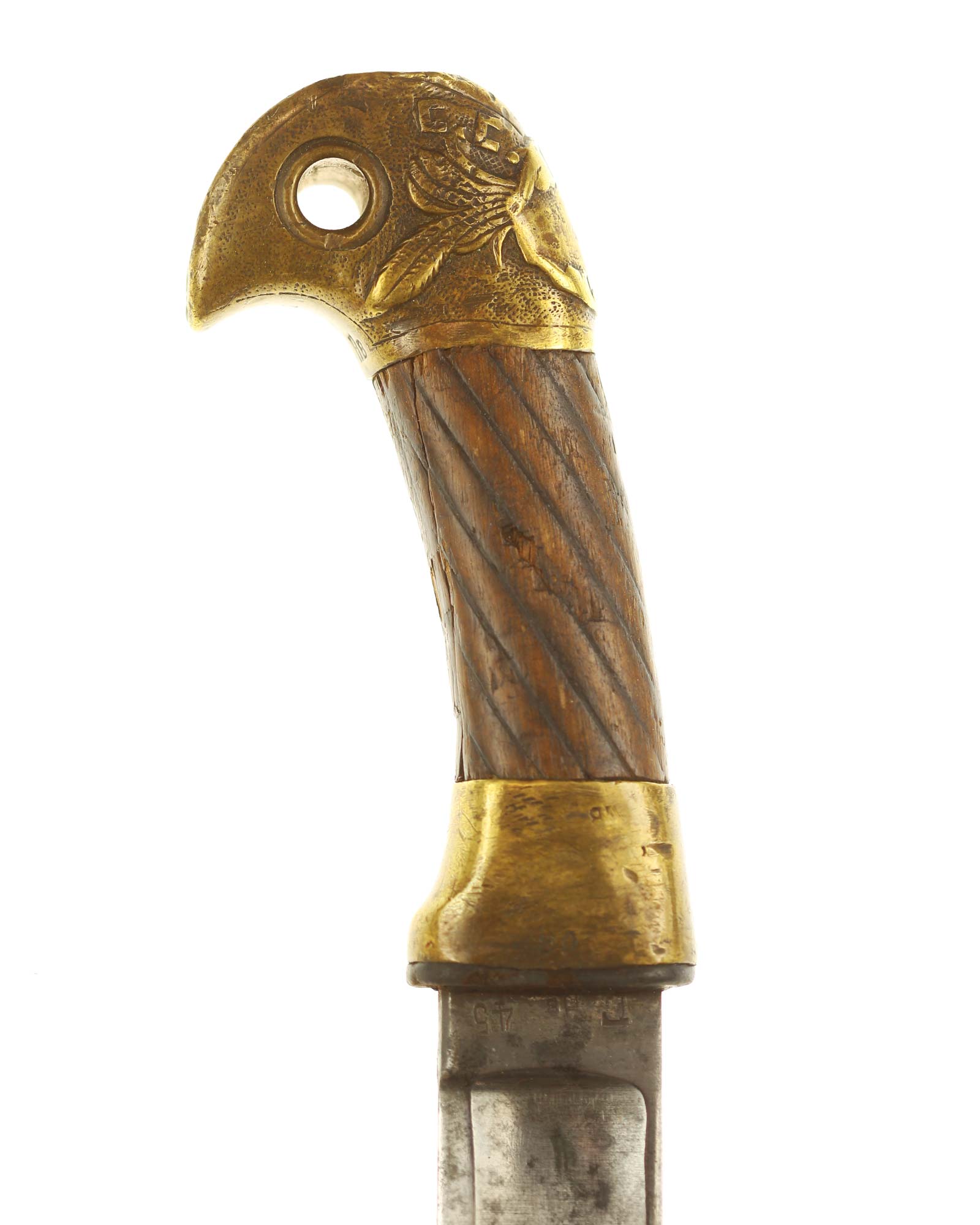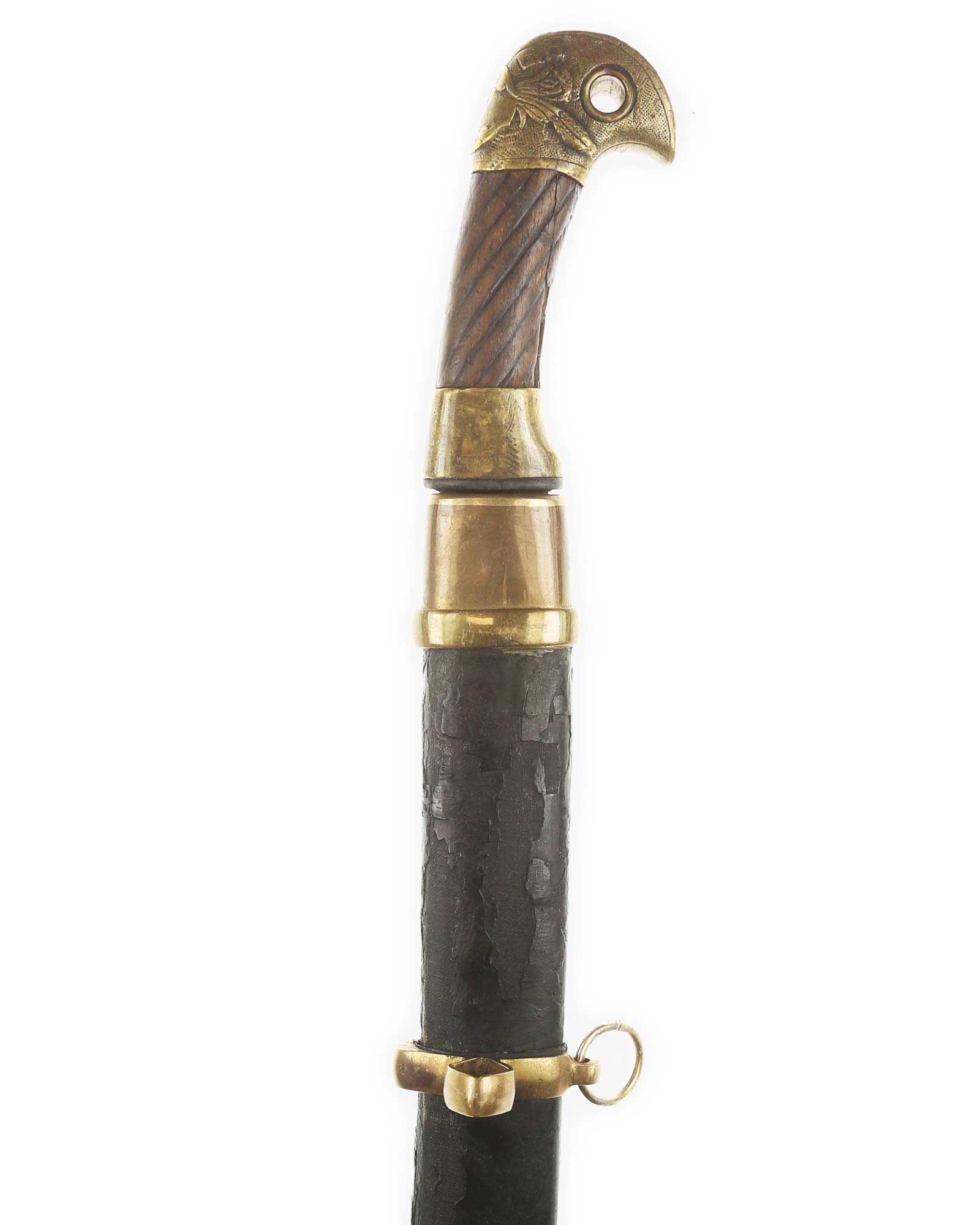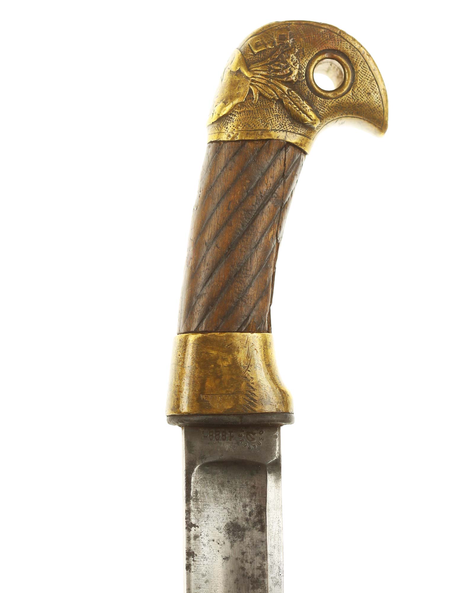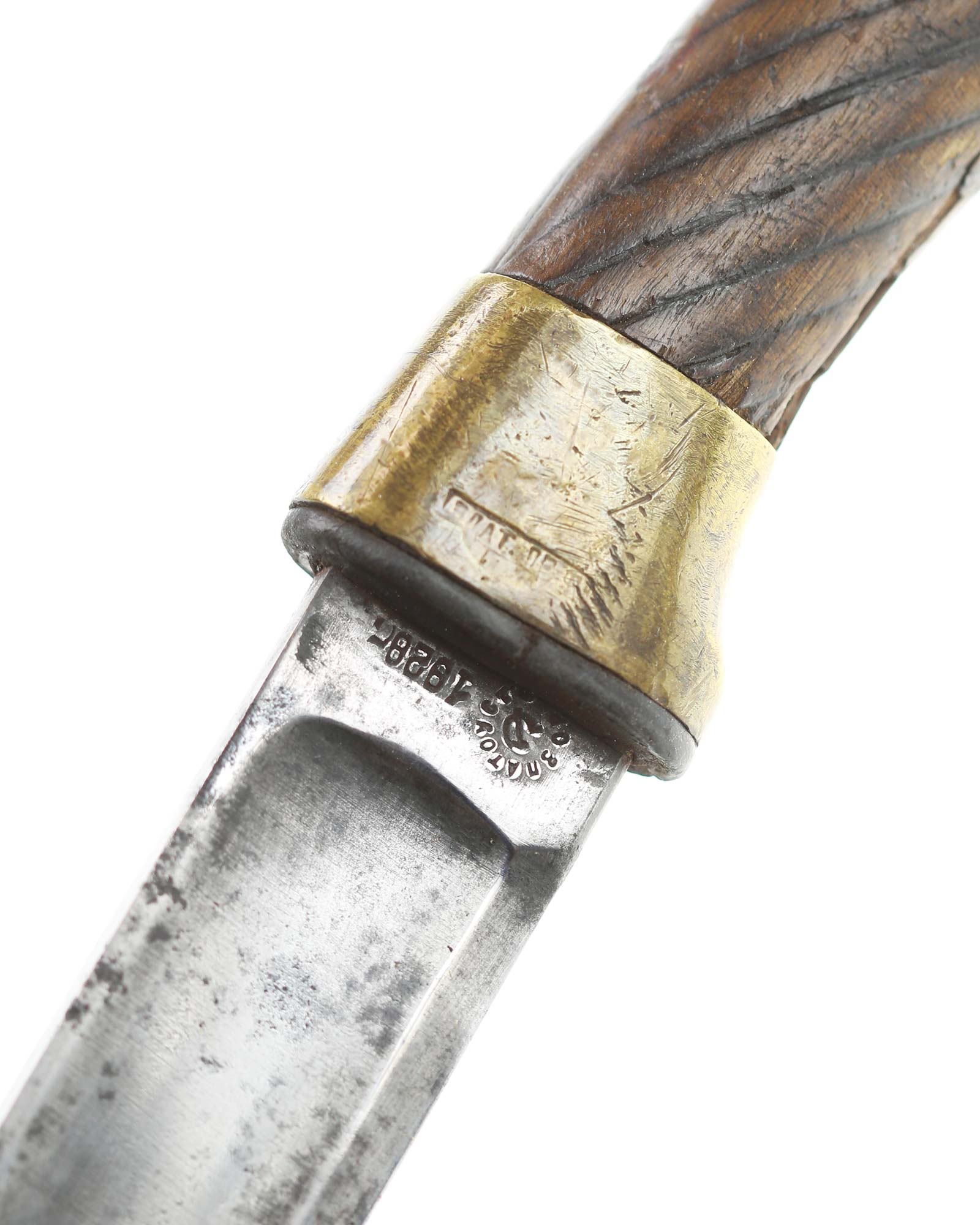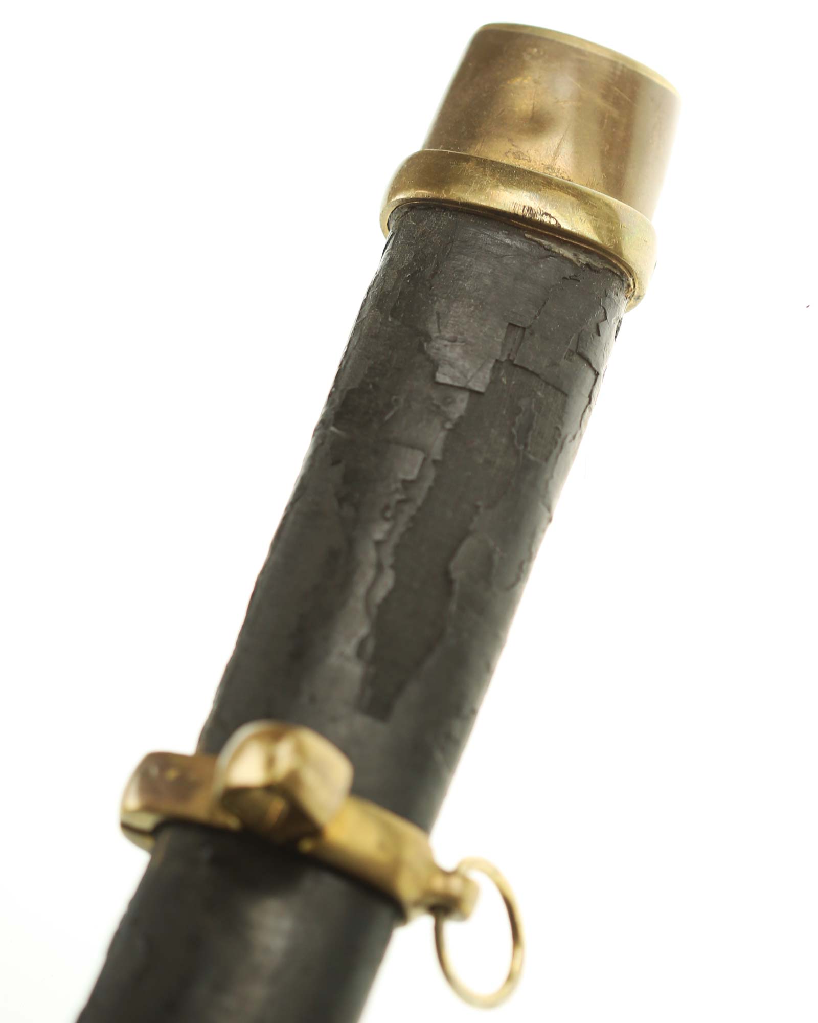 Schaschka Modell 1881 für Offiziere, Sowjetunion, datiert 1928. Gekehlte Rückenklinge mit zweischneidiger Spitze, auf der Fehlschärfe kyrillische Abnahmemarke und Datierung "1928". Gestempeltes Messinggefäß mit Marke von Slatoust mit Hammer und Sichel sowie "C.C.C.P." auf der Knaufkappe. Spiralförmig geschnitzter Holzgriff. Schwarzledern bezogene Holzscheide mit Messingmontierung.