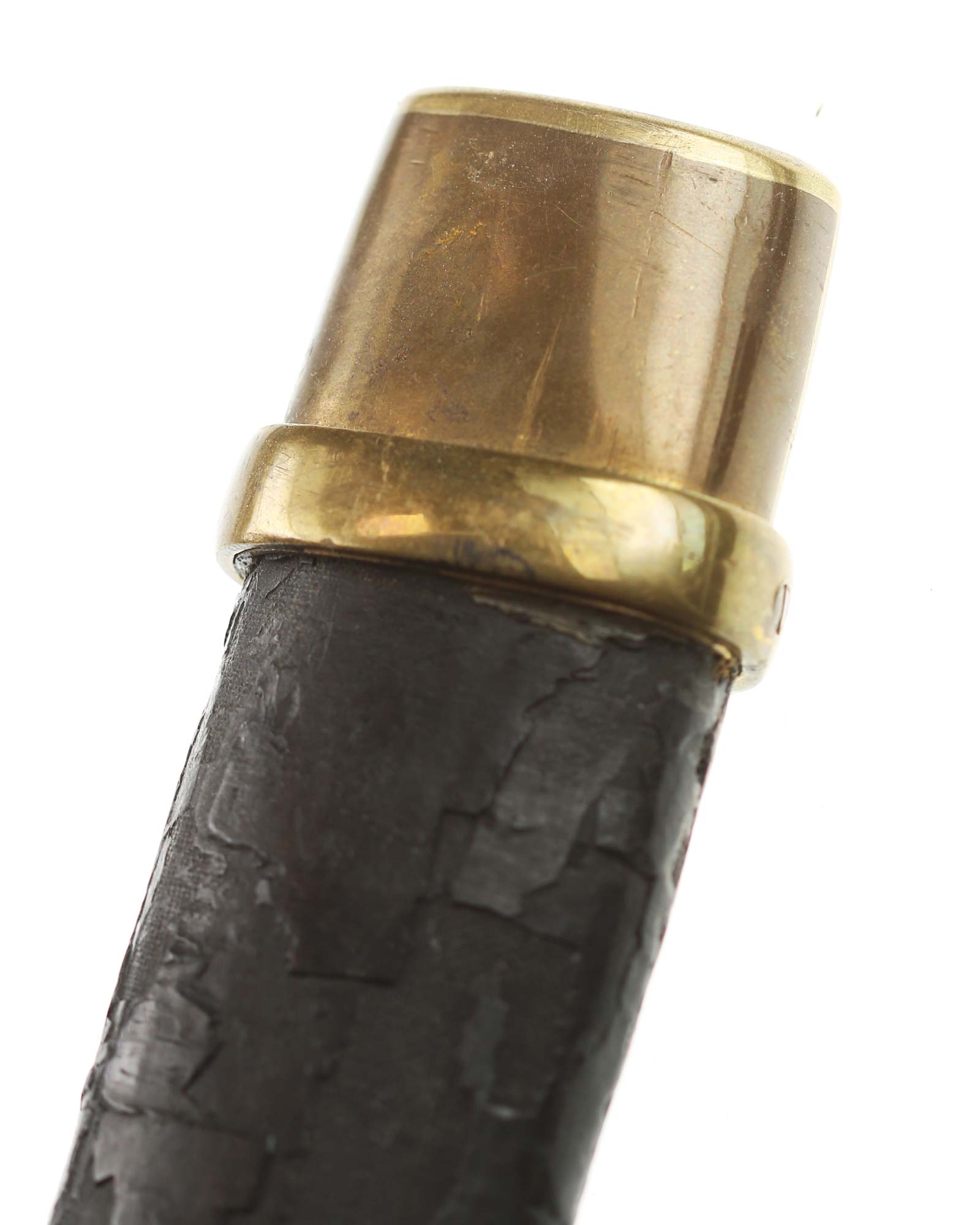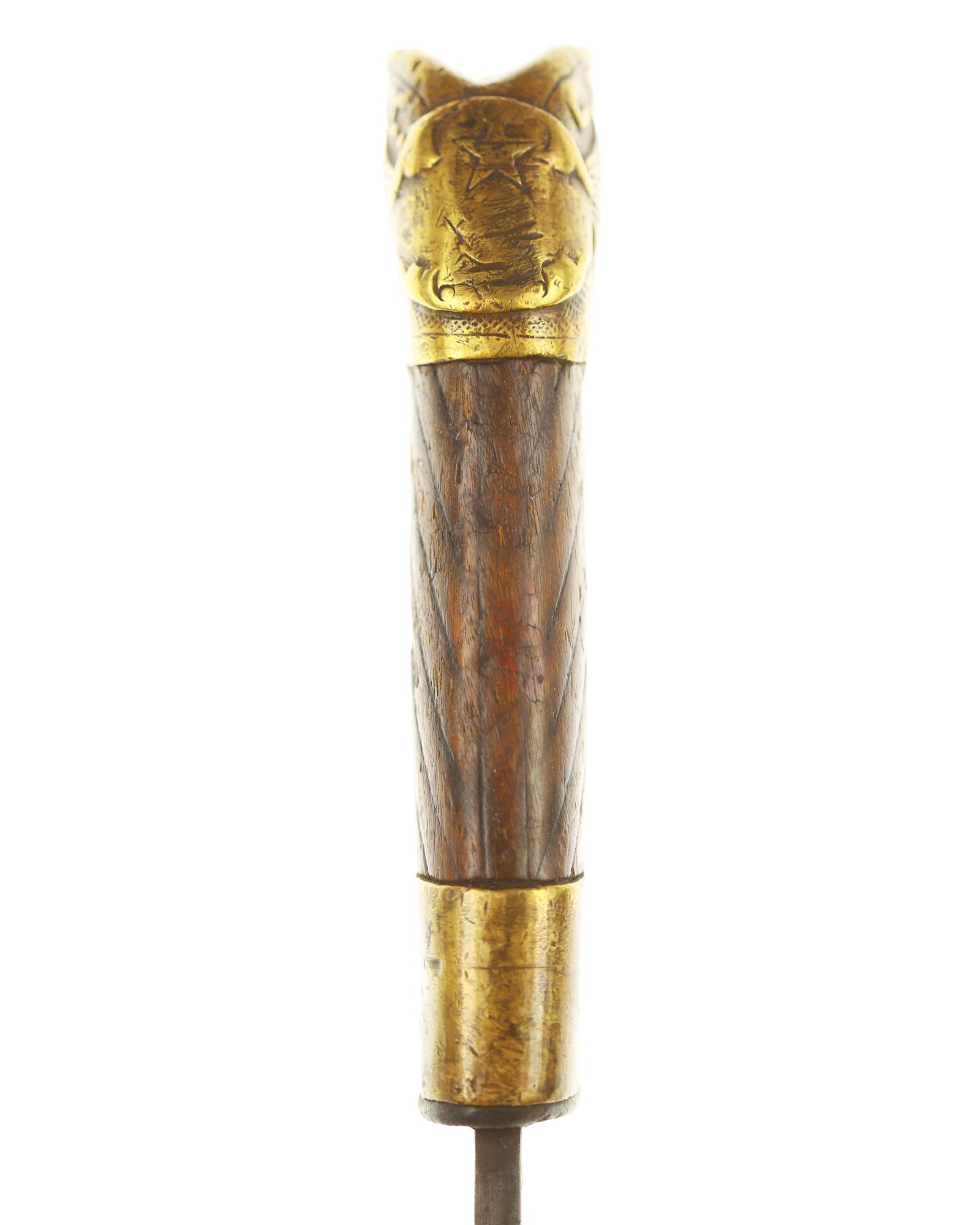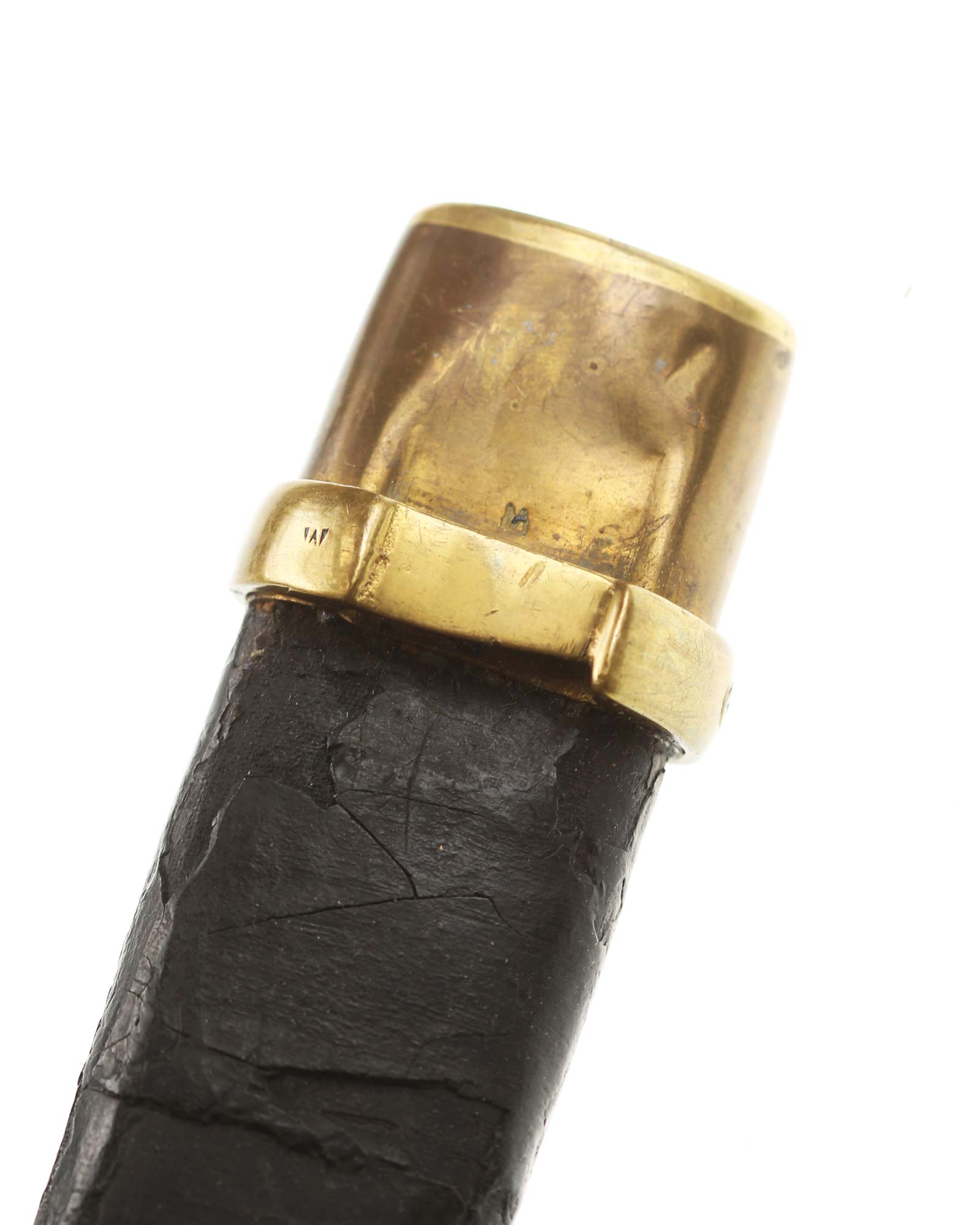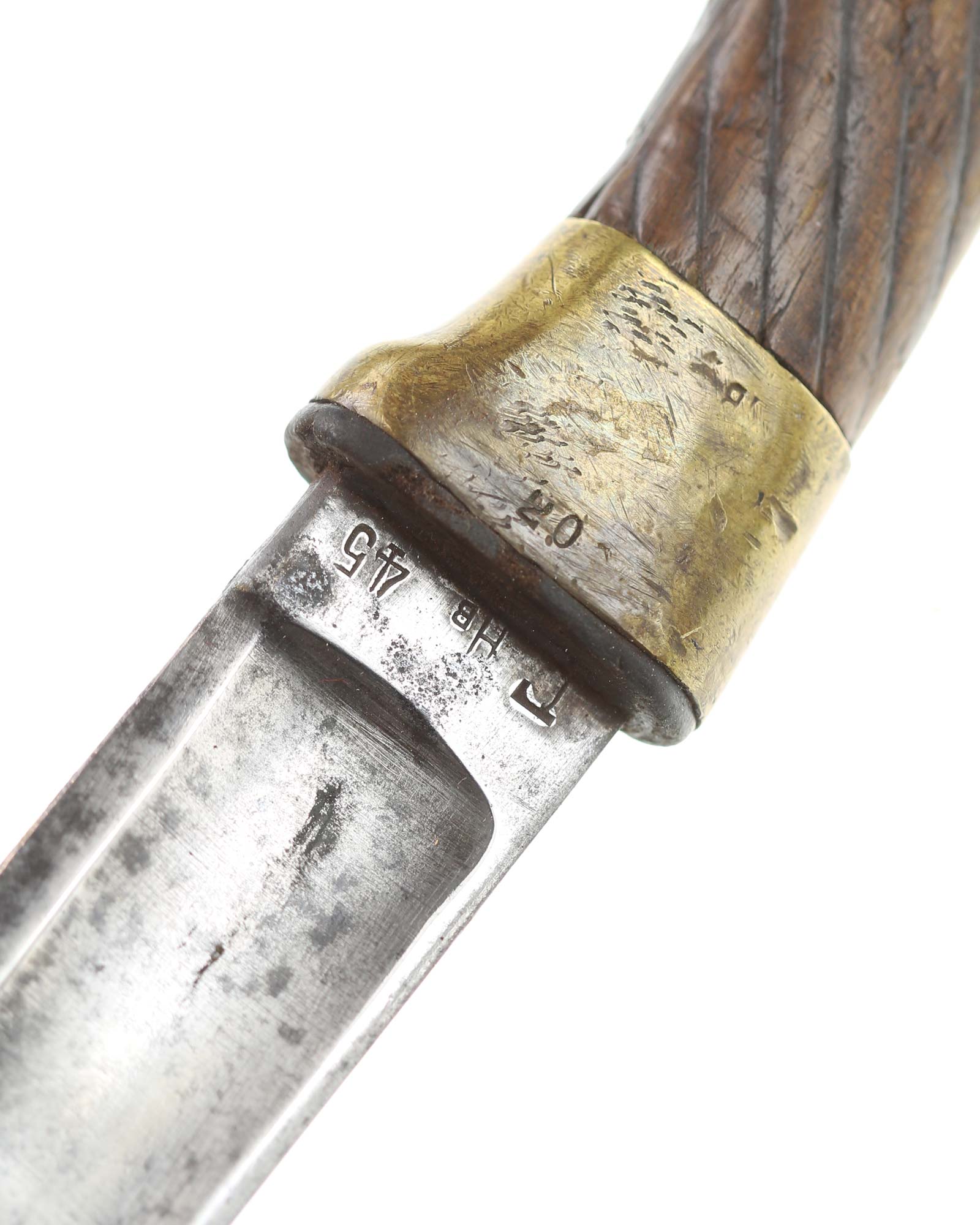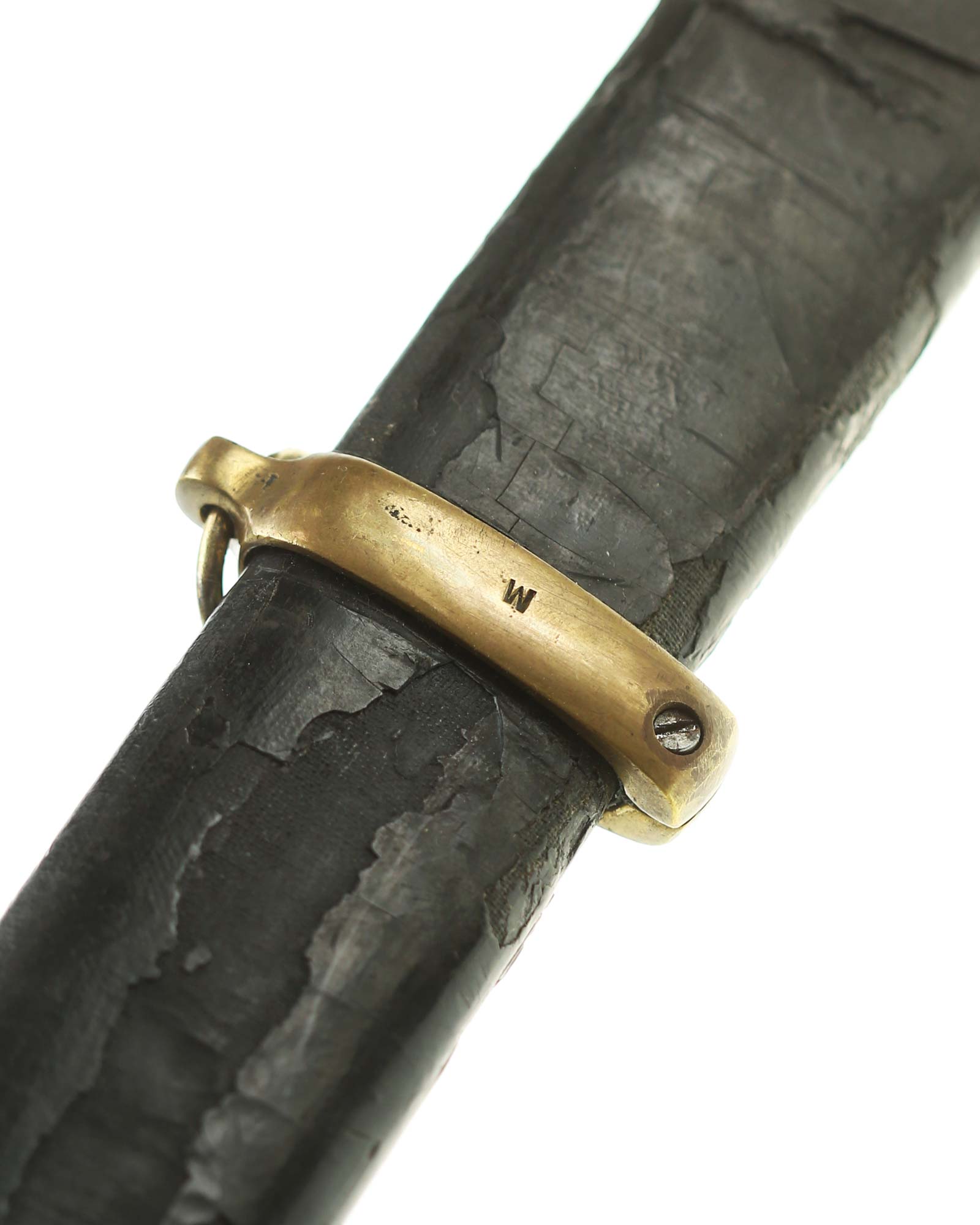 Schaschka Modell 1881 für Offiziere, Sowjetunion, datiert 1928. Gekehlte Rückenklinge mit zweischneidiger Spitze, auf der Fehlschärfe kyrillische Abnahmemarke und Datierung "1928". Gestempeltes Messinggefäß mit Marke von Slatoust mit Hammer und Sichel sowie "C.C.C.P." auf der Knaufkappe. Spiralförmig geschnitzter Holzgriff. Schwarzledern bezogene Holzscheide mit Messingmontierung.