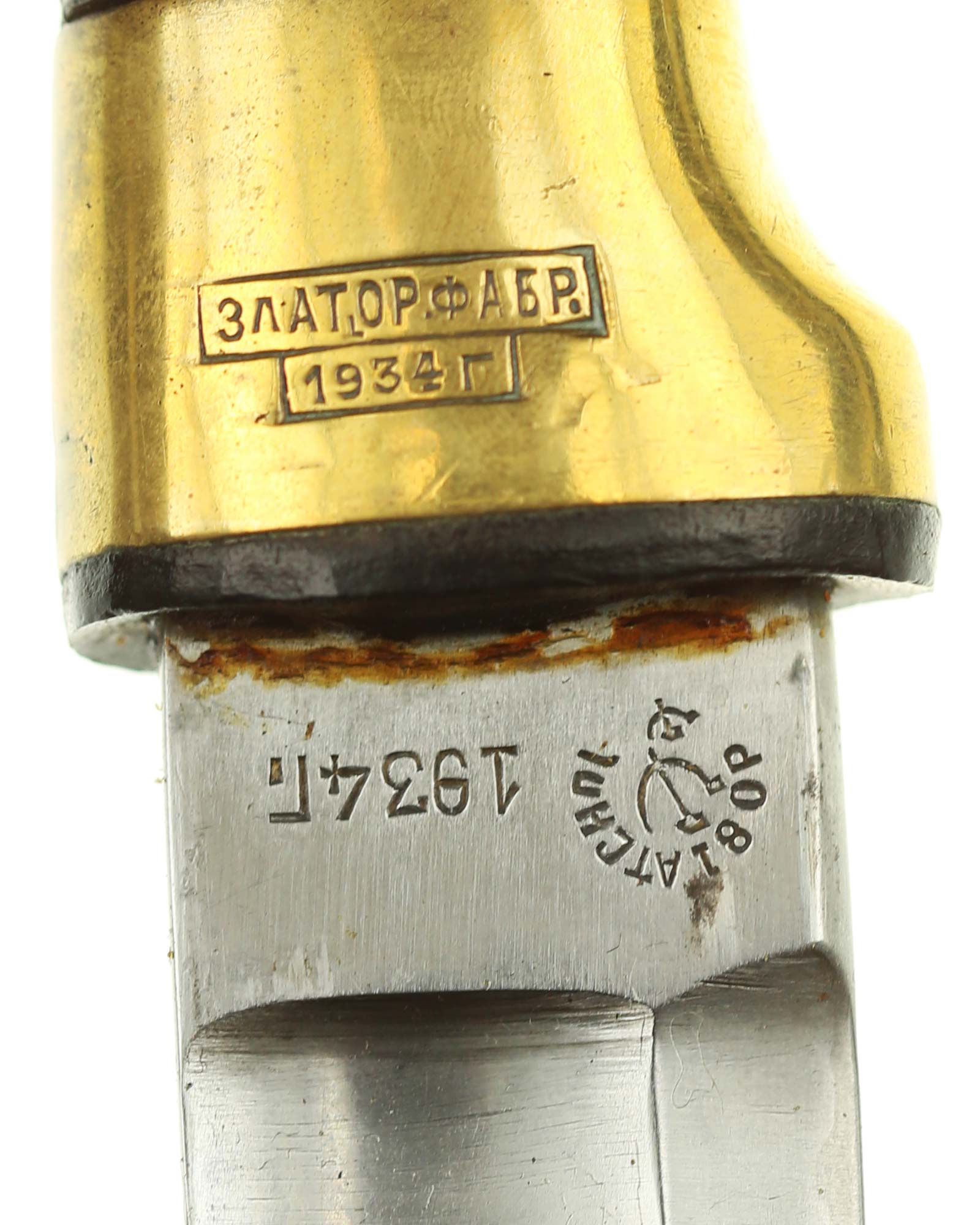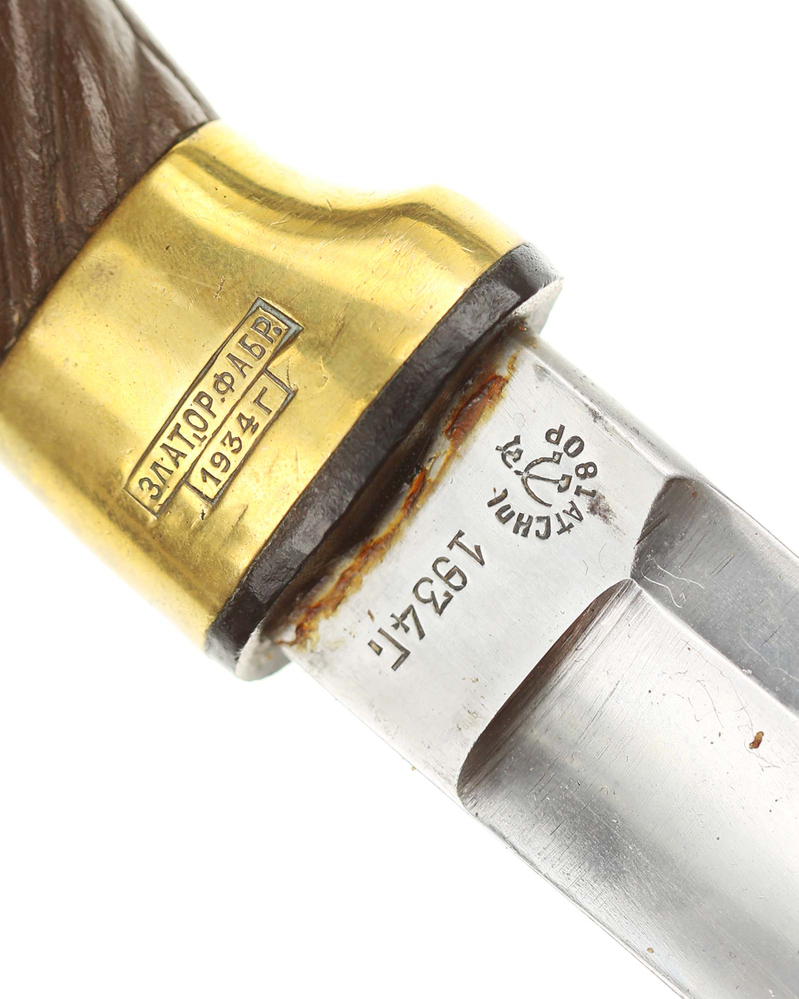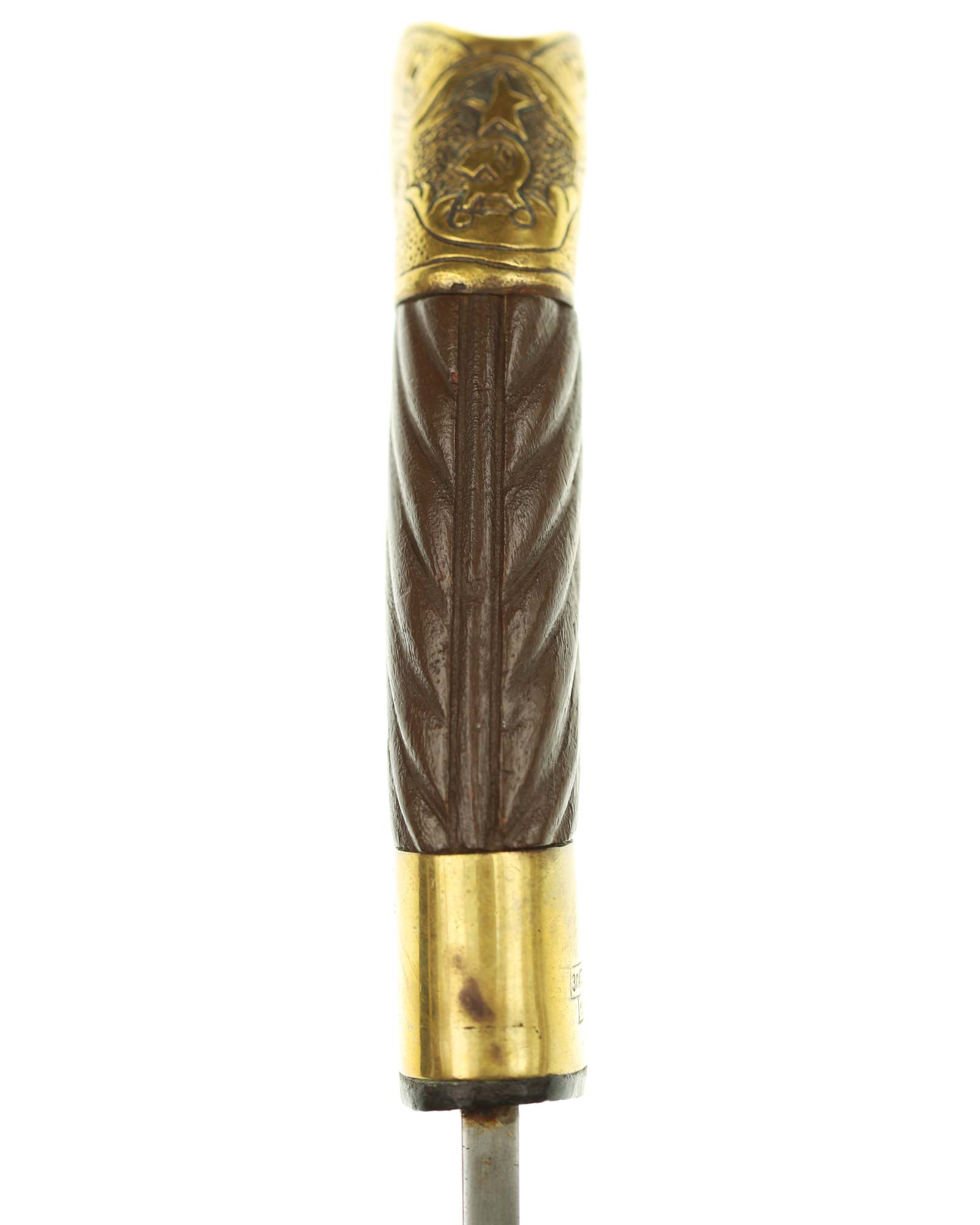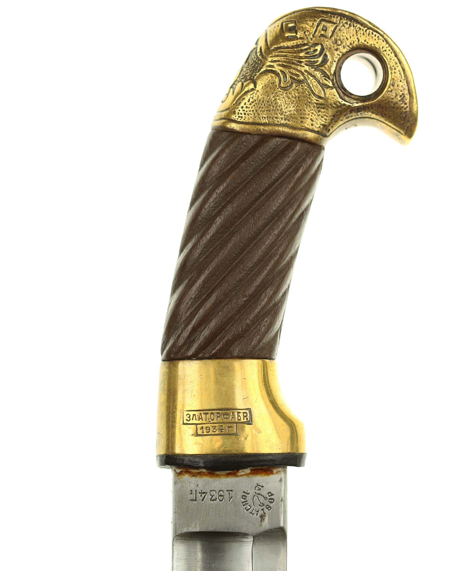 Schaschka Modell 1881 für Offiziere, Sowjetunion, datiert 1934. Gekehlte Rückenklinge mit zweischneidiger Spitze, auf der Fehlschärfe kyrillische Abnahmemarke und Datierung "1934". Gestempeltes Messinggefäß mit Marke von Slatoust mit Hammer und Sichel sowie "C.C.C.P." auf der Knaufkappe. Spiralförmig geschnitzter Holzgriff. Schwarzledern bezogene Holzscheide mit Messingmontierung
