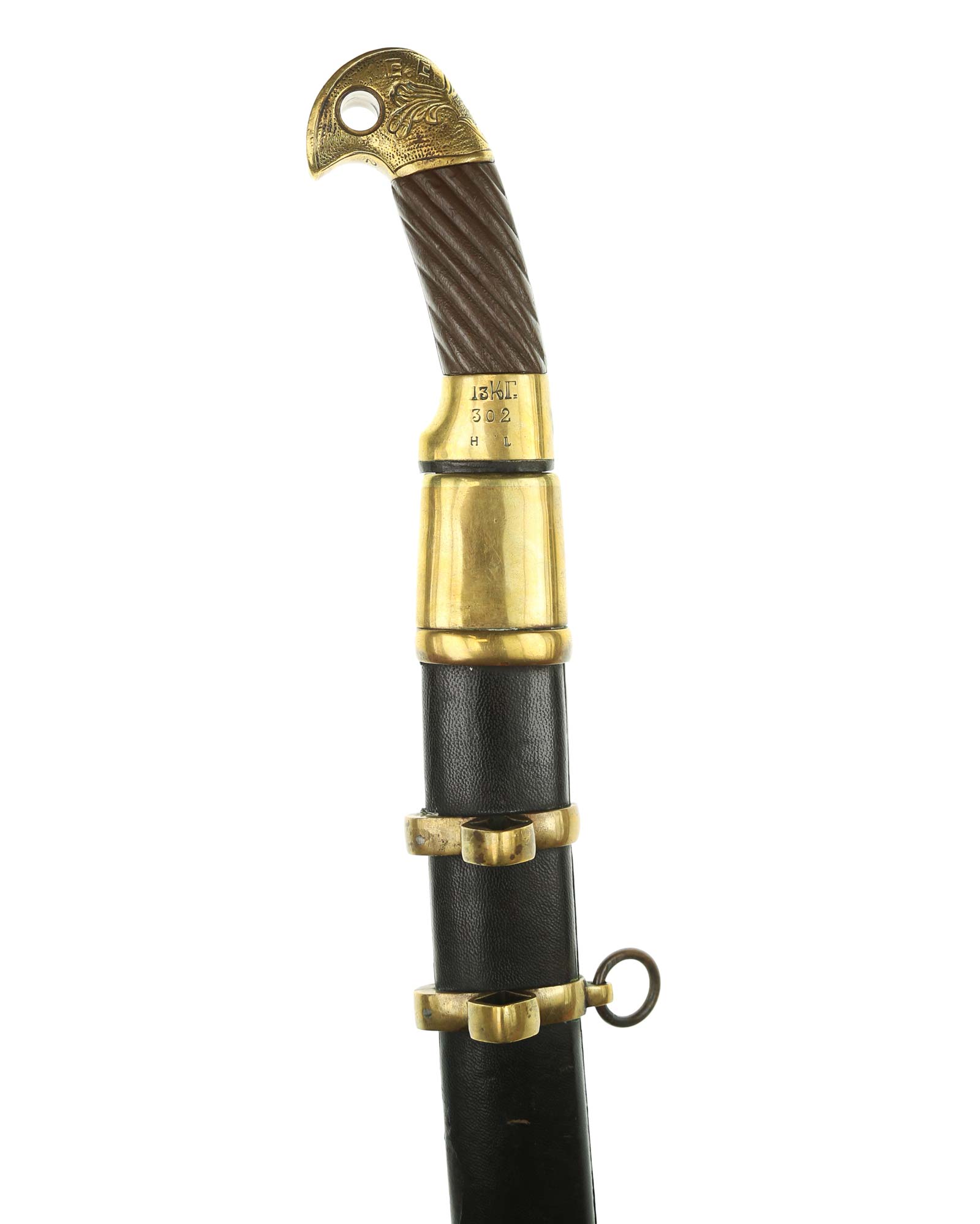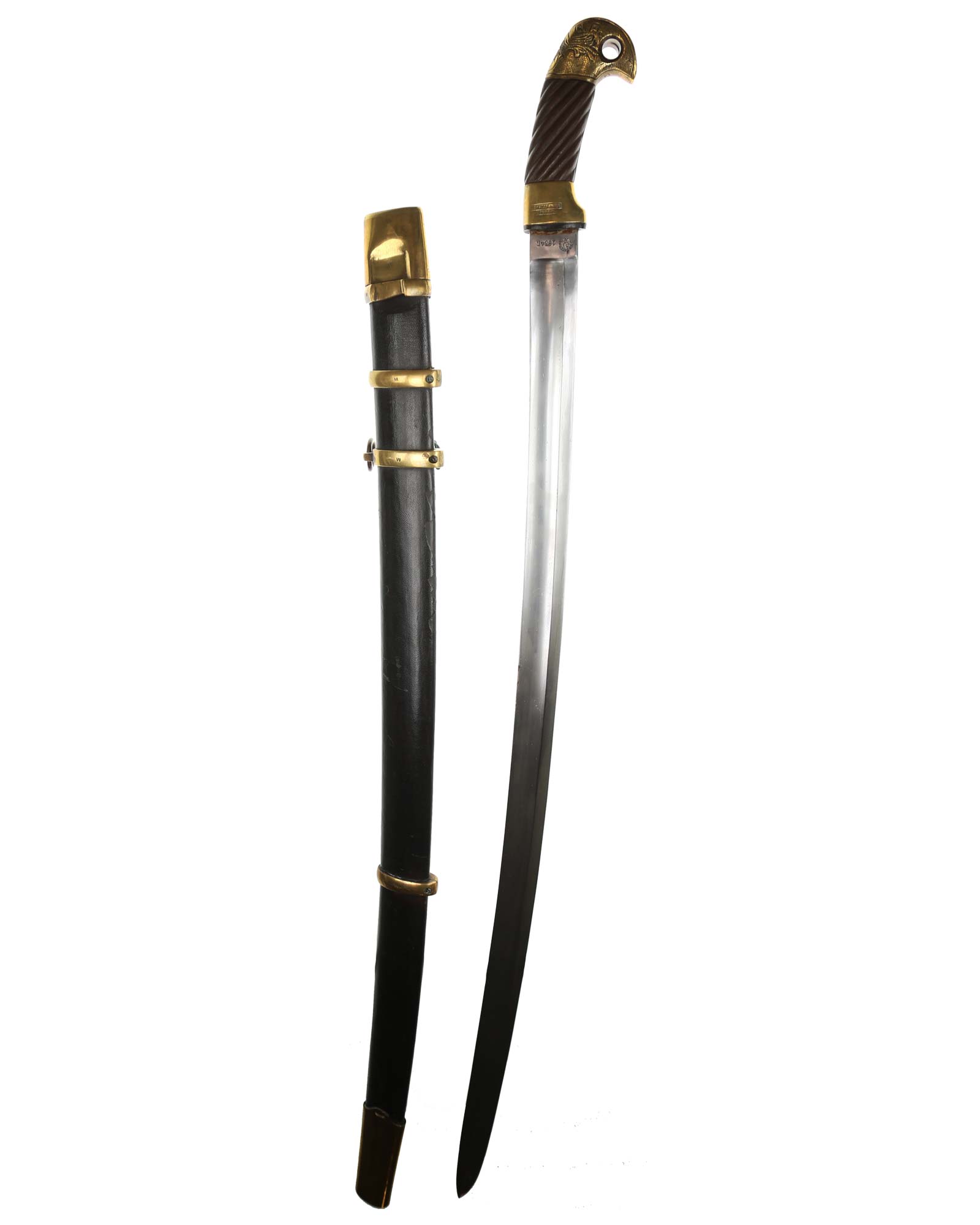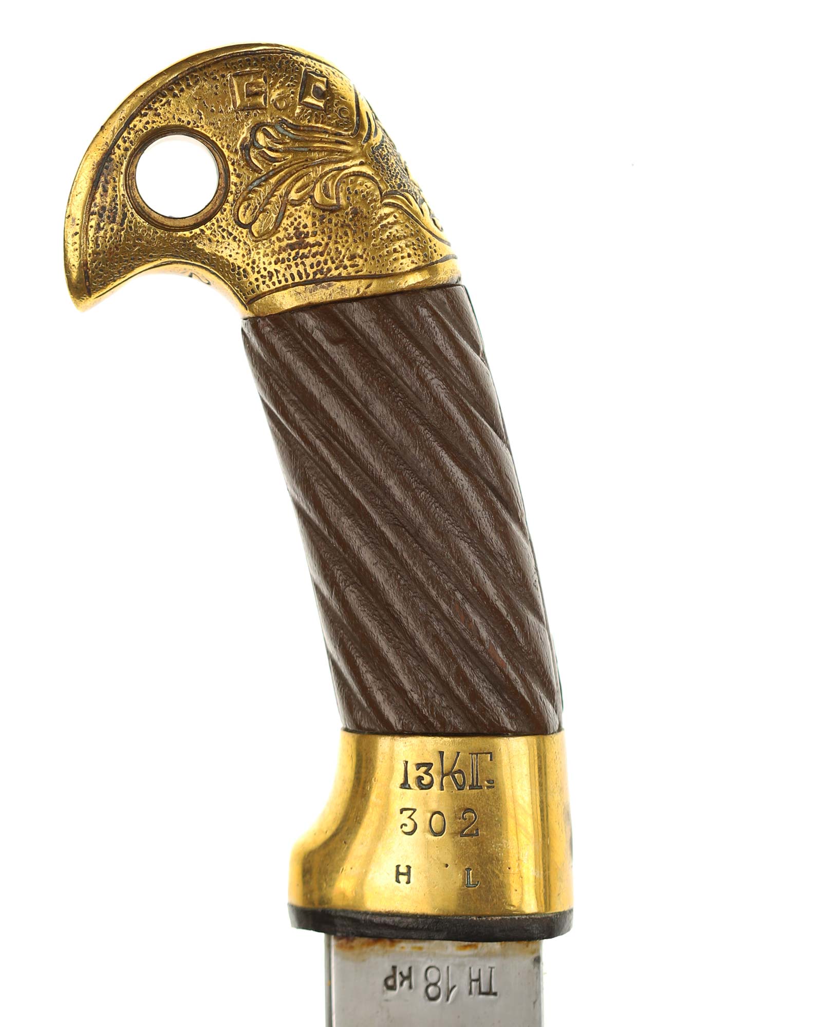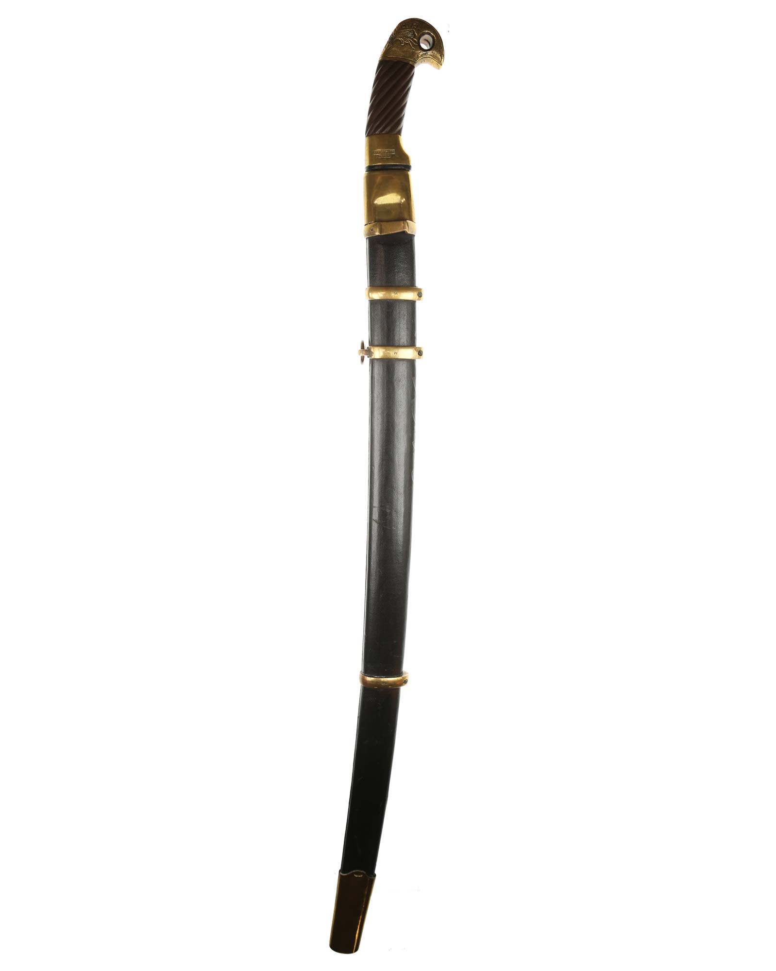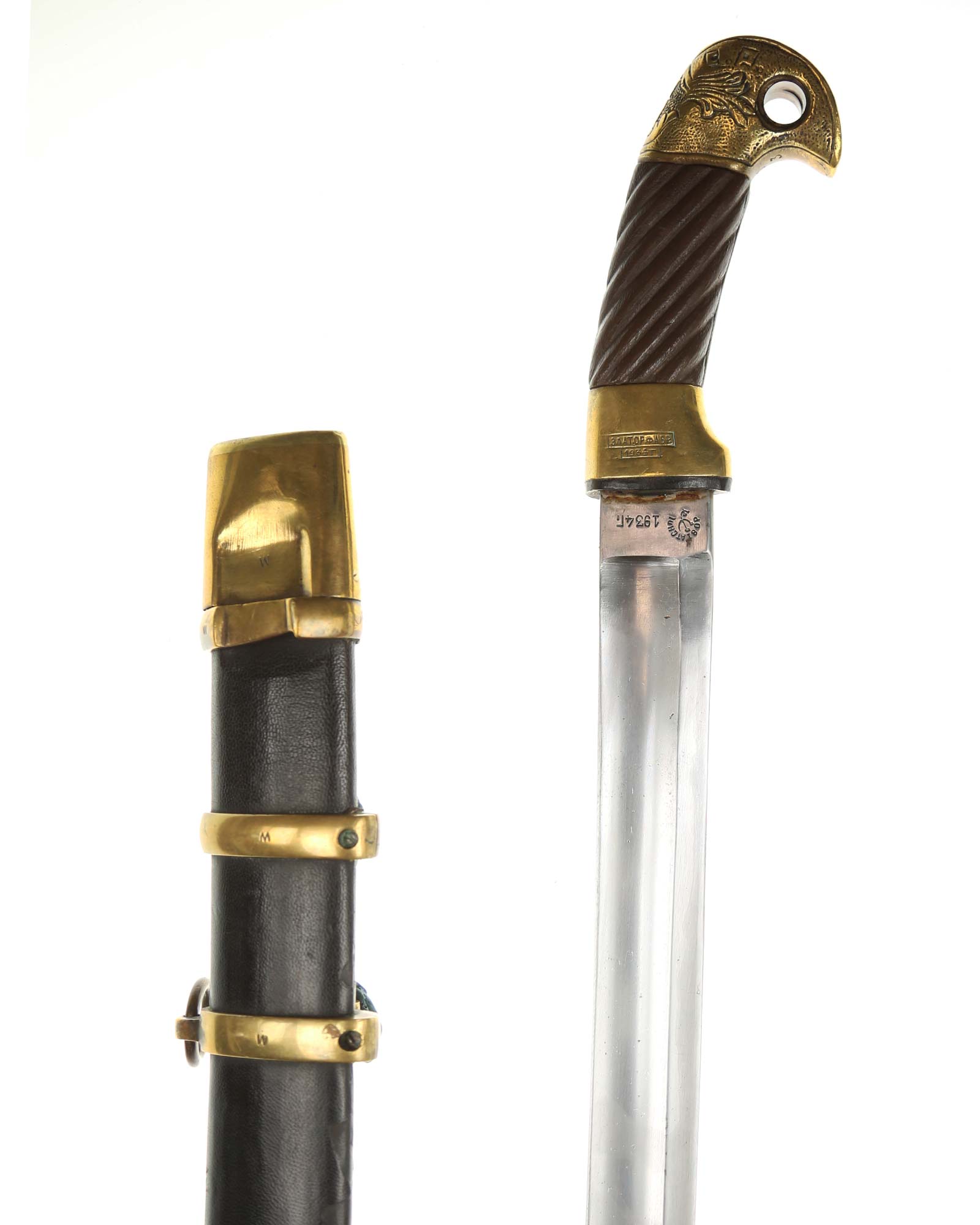 Schaschka Modell 1881 für Offiziere, Sowjetunion, datiert 1934. Gekehlte Rückenklinge mit zweischneidiger Spitze, auf der Fehlschärfe kyrillische Abnahmemarke und Datierung "1934". Gestempeltes Messinggefäß mit Marke von Slatoust mit Hammer und Sichel sowie "C.C.C.P." auf der Knaufkappe. Spiralförmig geschnitzter Holzgriff. Schwarzledern bezogene Holzscheide mit Messingmontierung