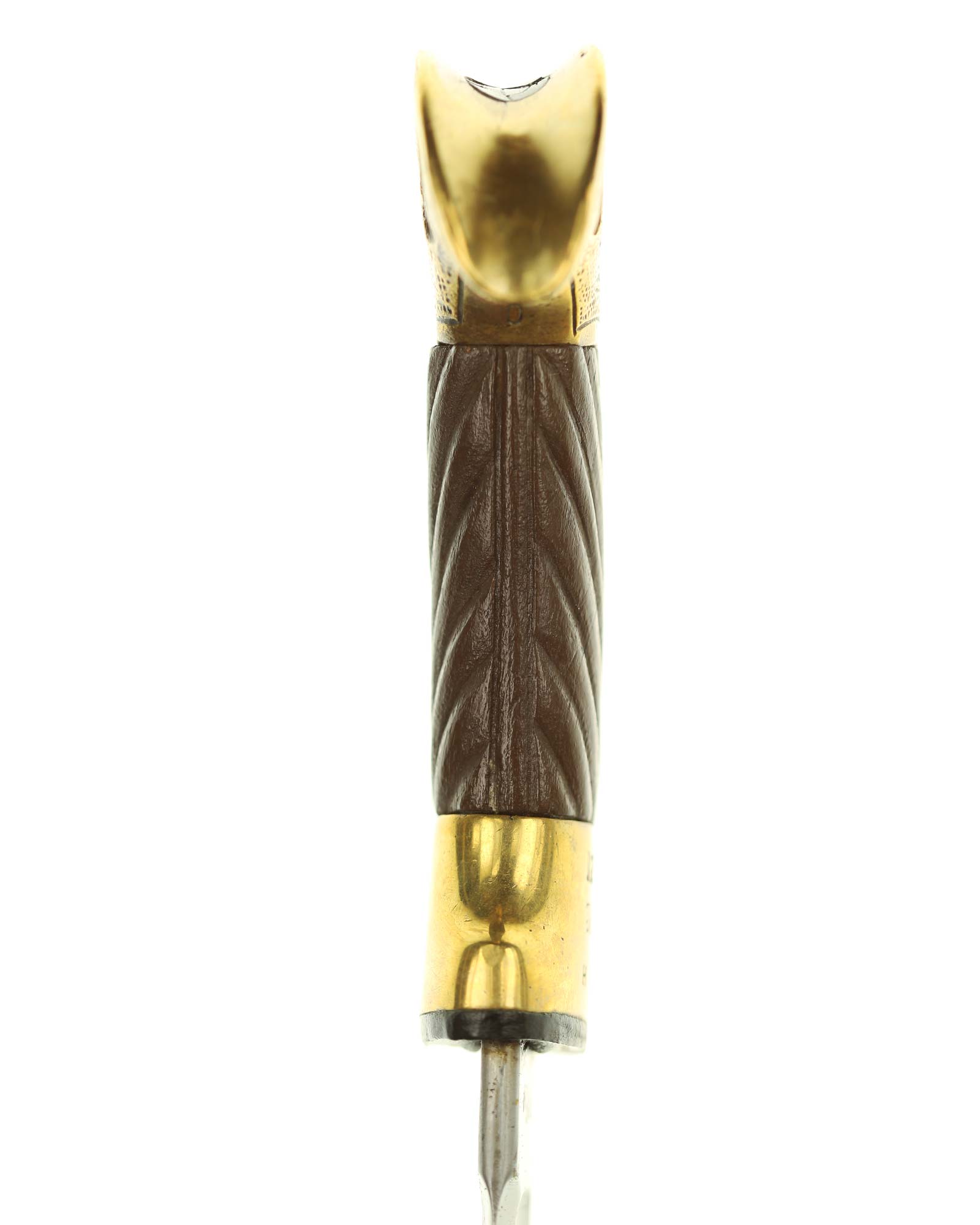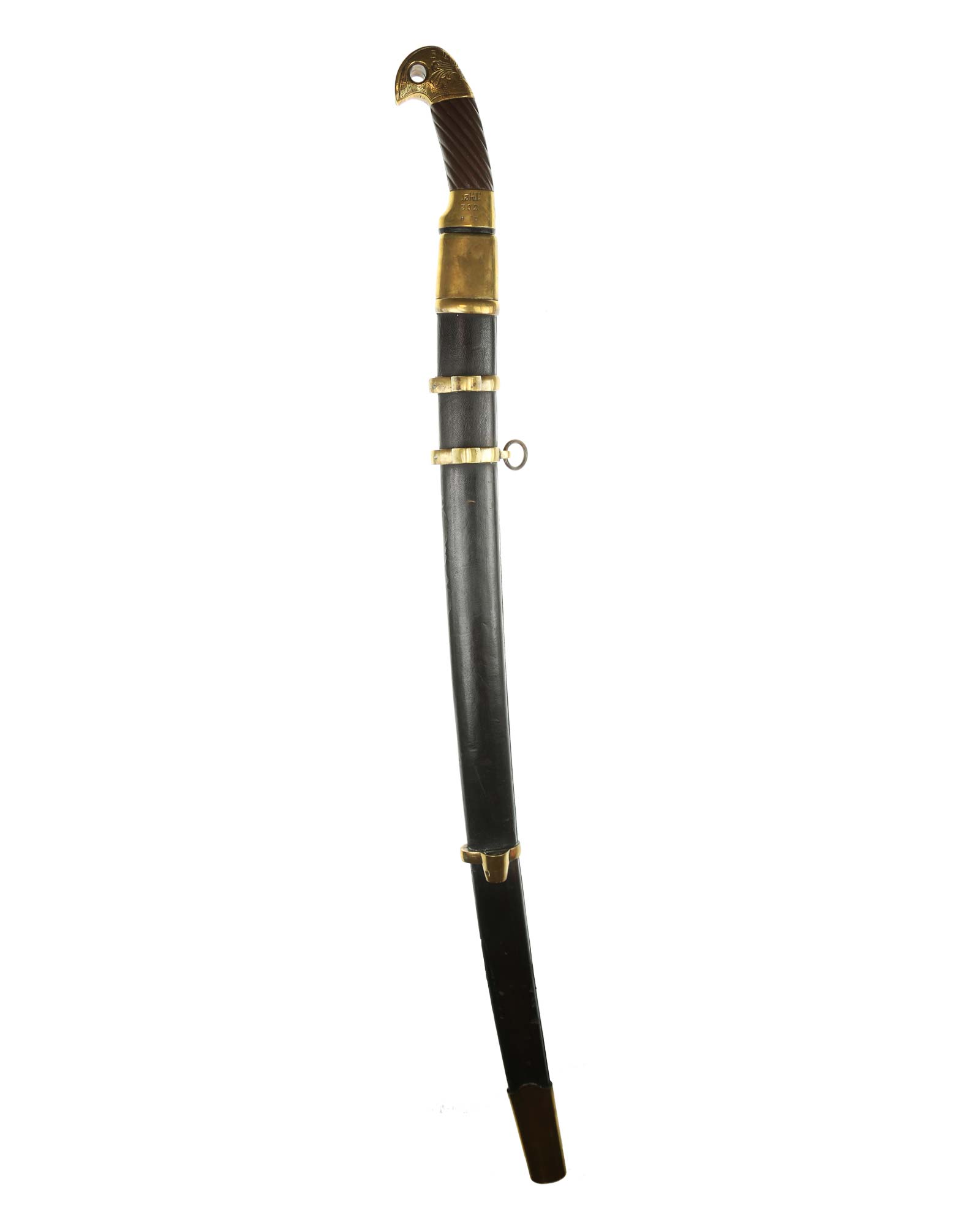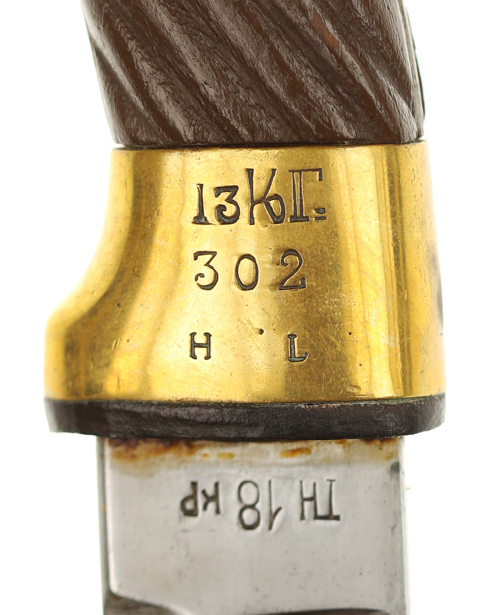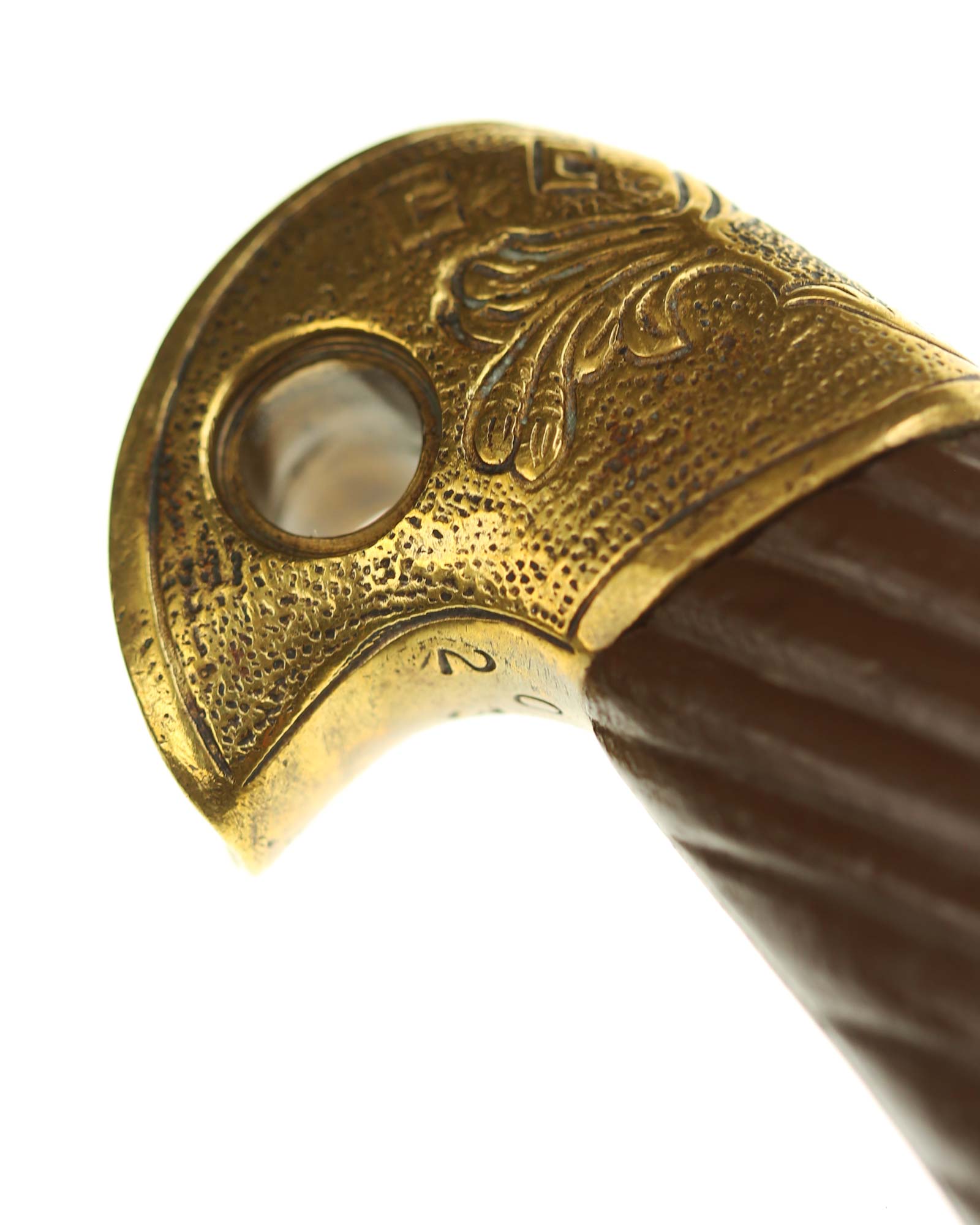 Schaschka Modell 1881 für Offiziere, Sowjetunion, datiert 1934. Gekehlte Rückenklinge mit zweischneidiger Spitze, auf der Fehlschärfe kyrillische Abnahmemarke und Datierung "1934". Gestempeltes Messinggefäß mit Marke von Slatoust mit Hammer und Sichel sowie "C.C.C.P." auf der Knaufkappe. Spiralförmig geschnitzter Holzgriff. Schwarzledern bezogene Holzscheide mit Messingmontierung