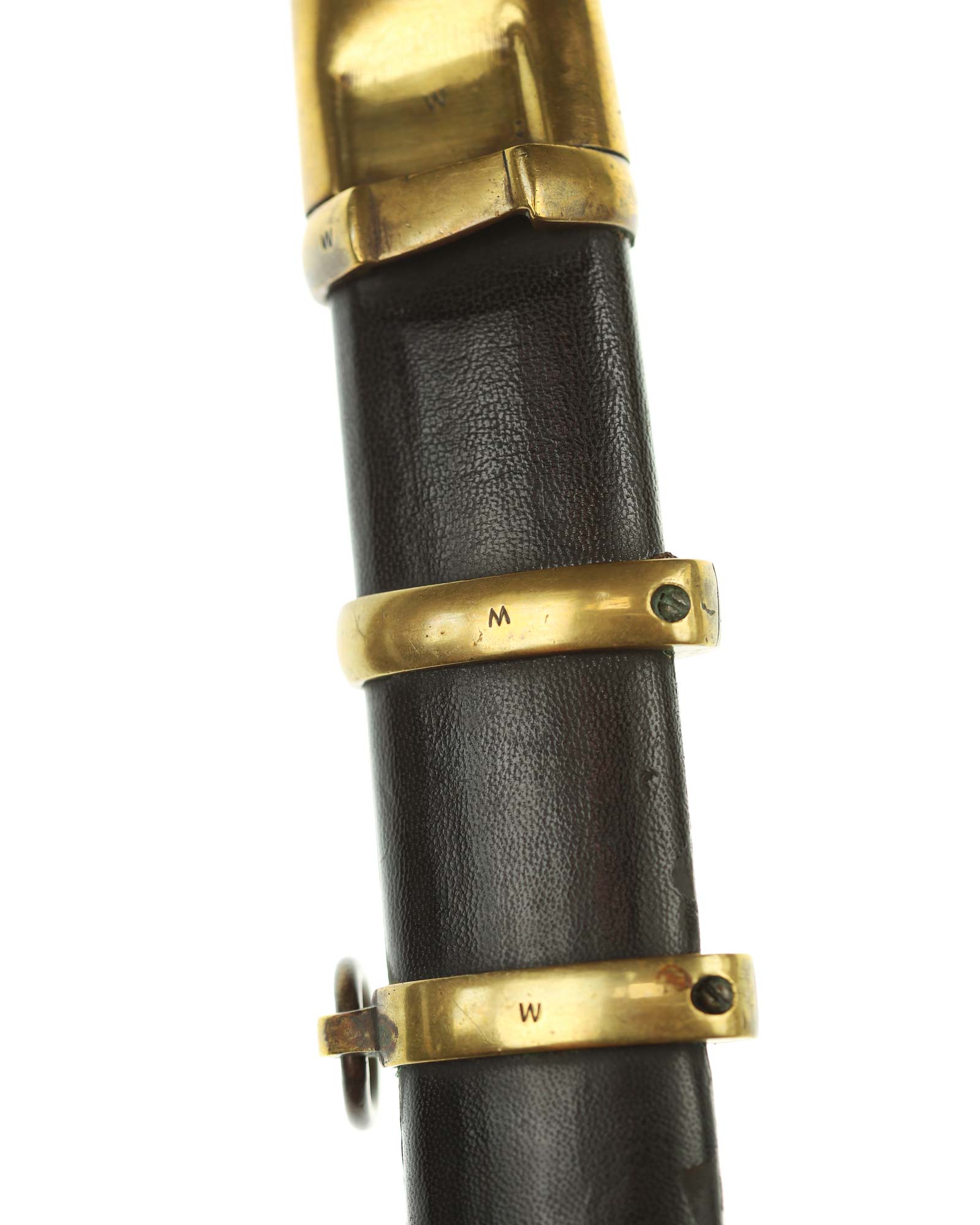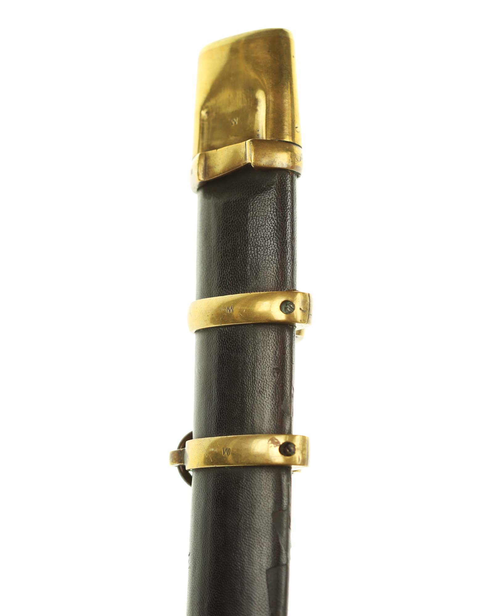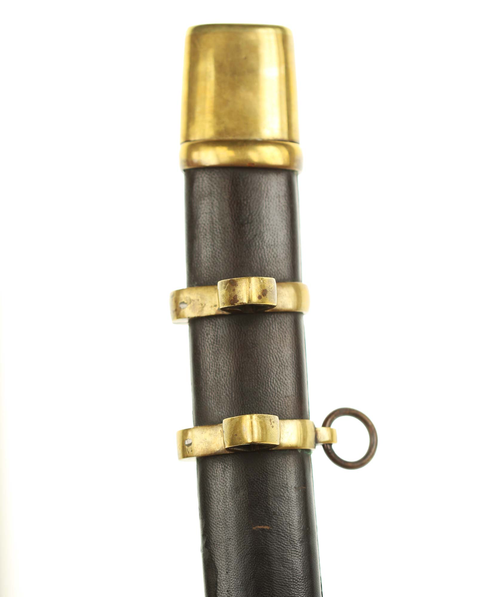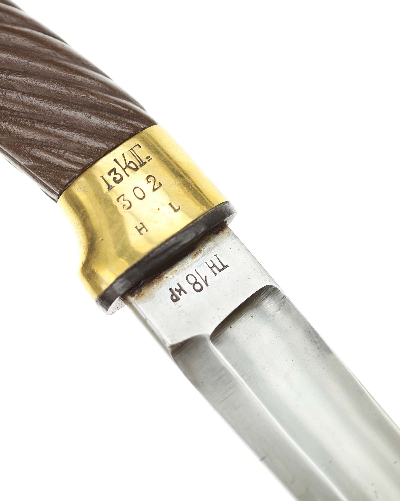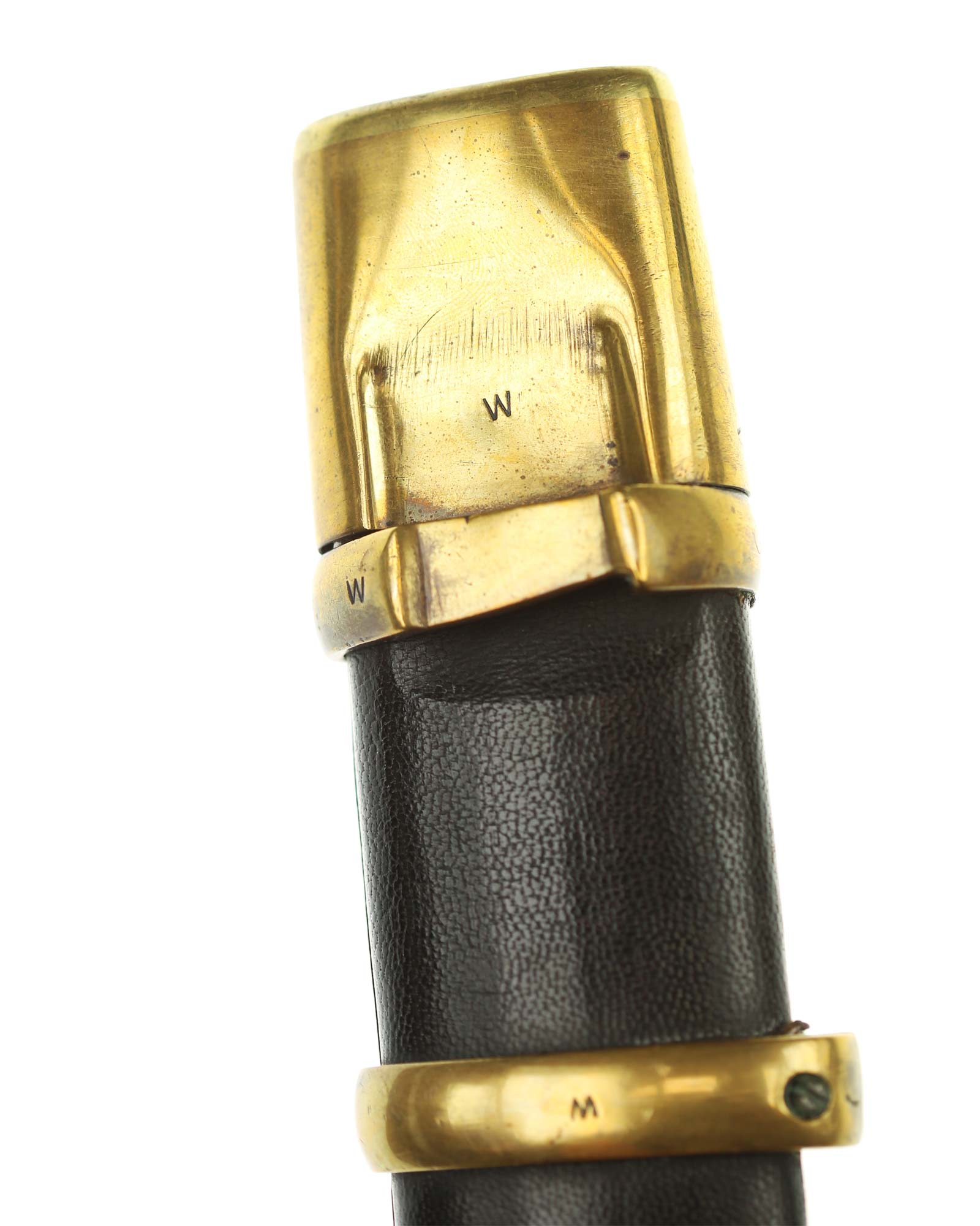 Schaschka Modell 1881 für Offiziere, Sowjetunion, datiert 1934. Gekehlte Rückenklinge mit zweischneidiger Spitze, auf der Fehlschärfe kyrillische Abnahmemarke und Datierung "1934". Gestempeltes Messinggefäß mit Marke von Slatoust mit Hammer und Sichel sowie "C.C.C.P." auf der Knaufkappe. Spiralförmig geschnitzter Holzgriff. Schwarzledern bezogene Holzscheide mit Messingmontierung