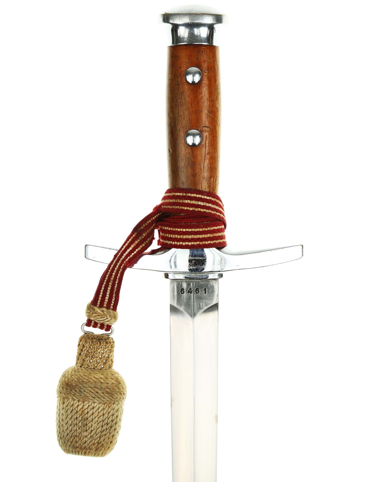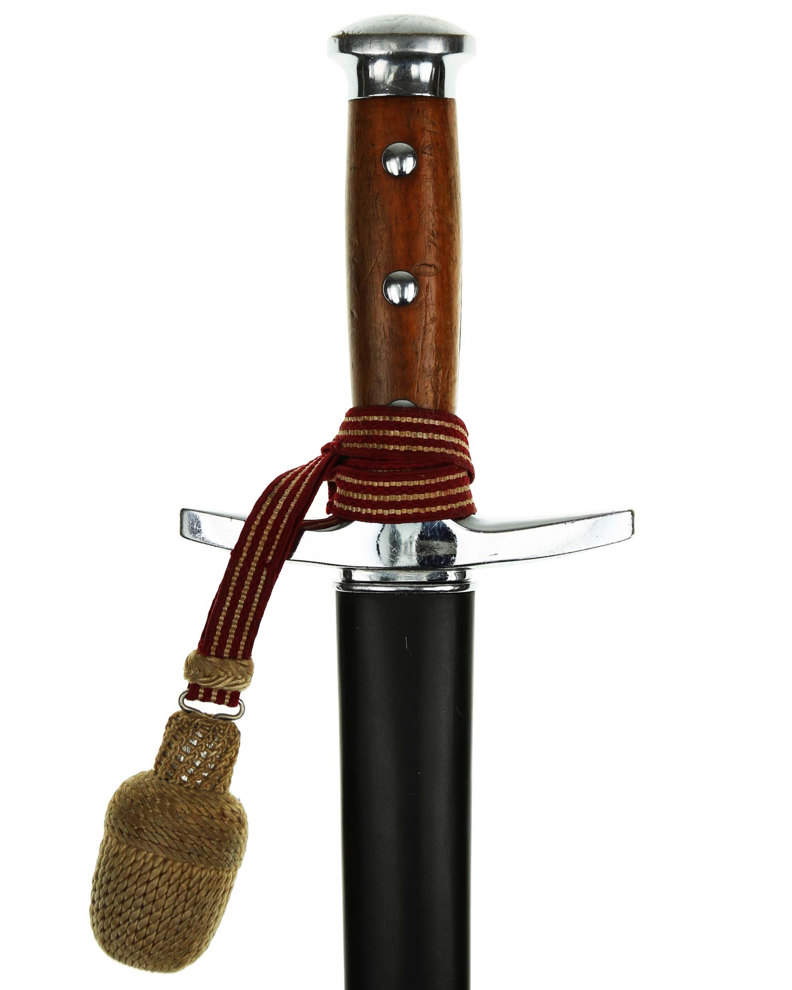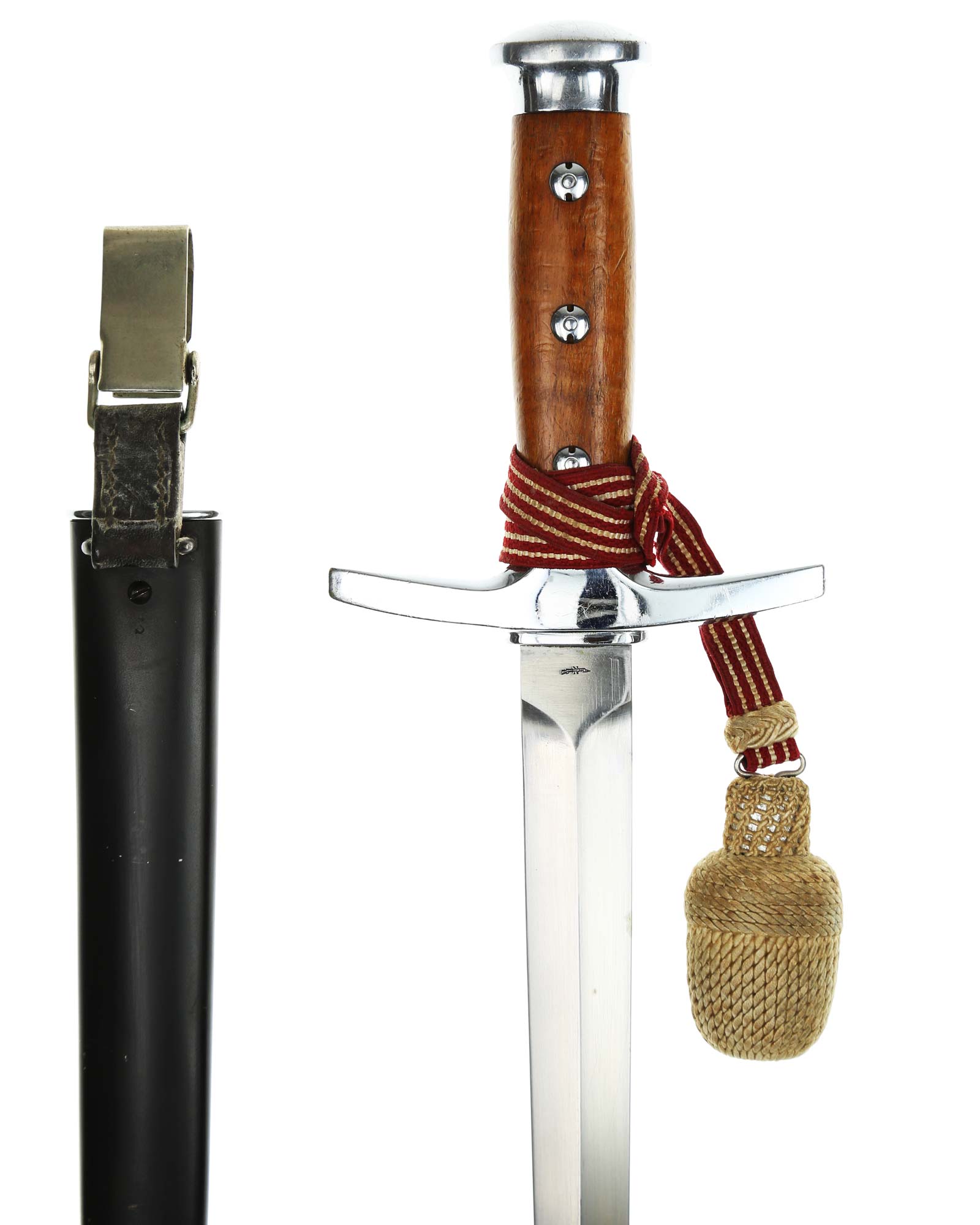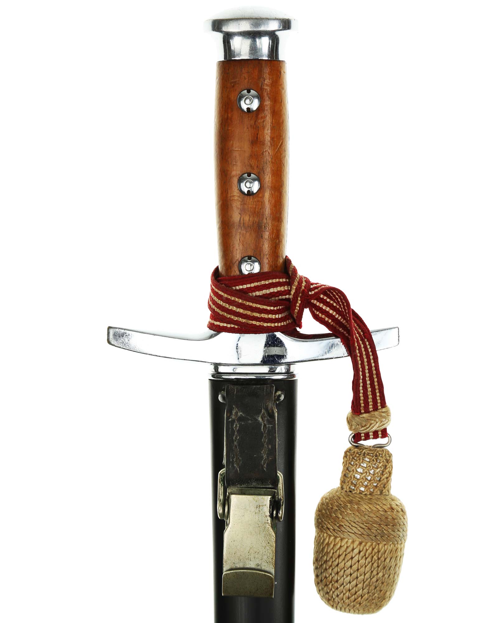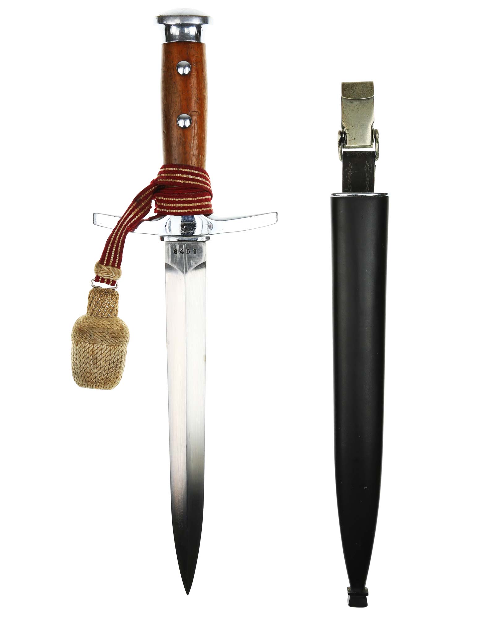 Offiziersdolch der Schweiz, Modell 1943 mit Metallscheide, Gehänge und Portepee. Der Schweizer Offiziersdolch hat dreifach verschraubte Holzgriffschalen. Die Klinge ist blank und zweischneidig ohne Hohlkehle, auf der Vorderseite der Klinge befindet sich die Nummer #6461, Rückseite mit Herstellerlogo von SIG Neuhausen (Gewehr mit N). Schwarzlackierte Stahlscheide mit einem Karabinerhaken zum Einhängen an einer Öse des Offiziersgurtes.