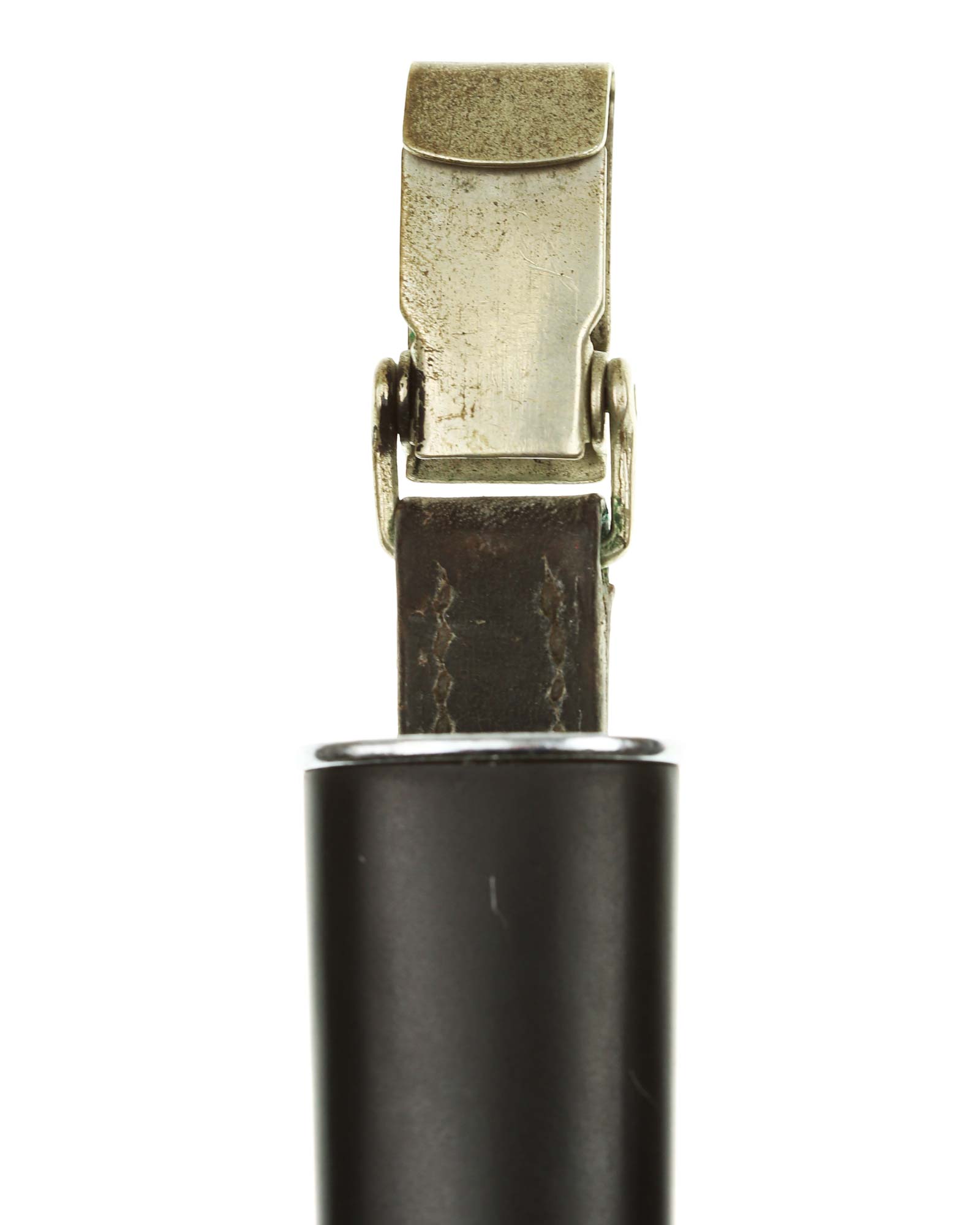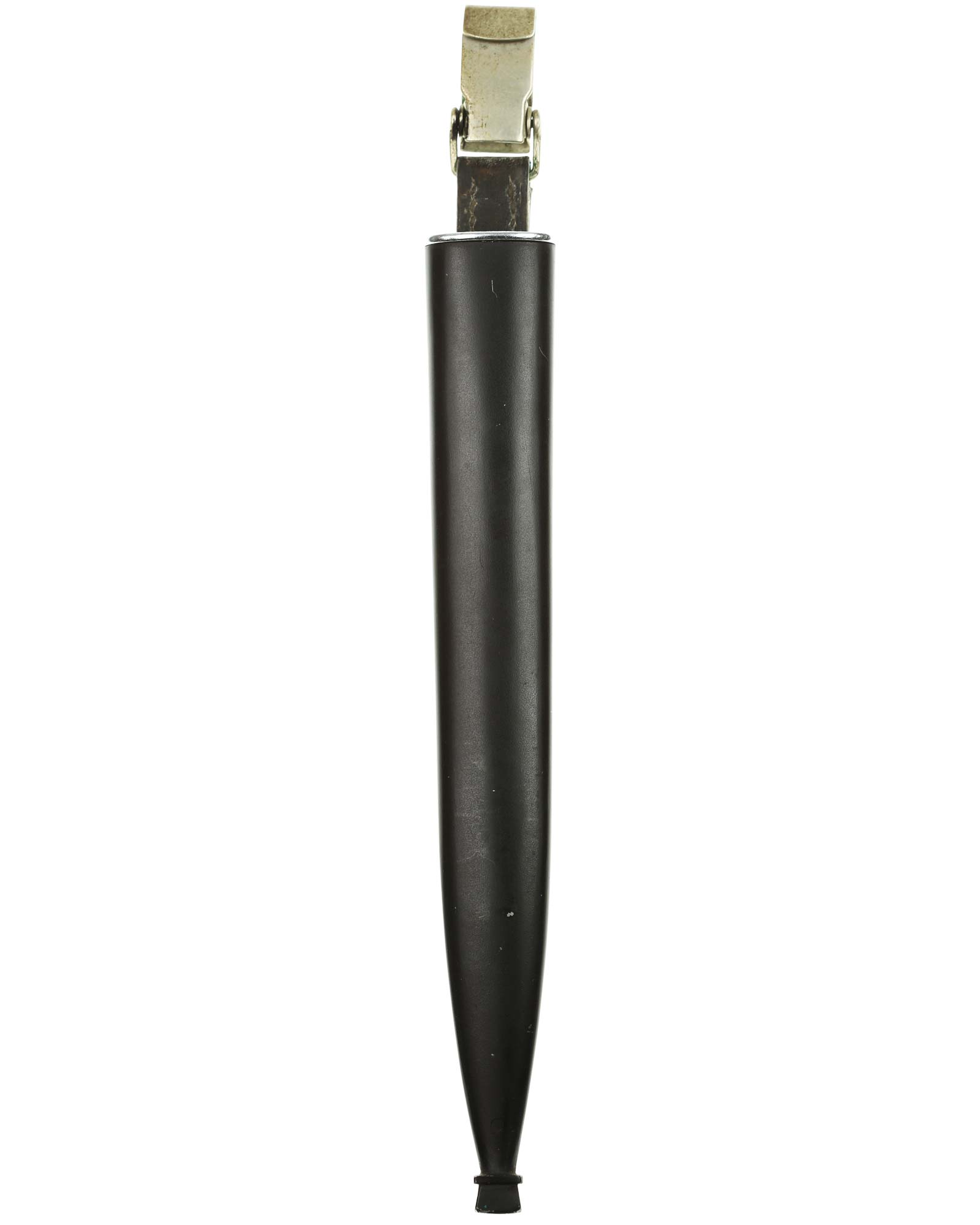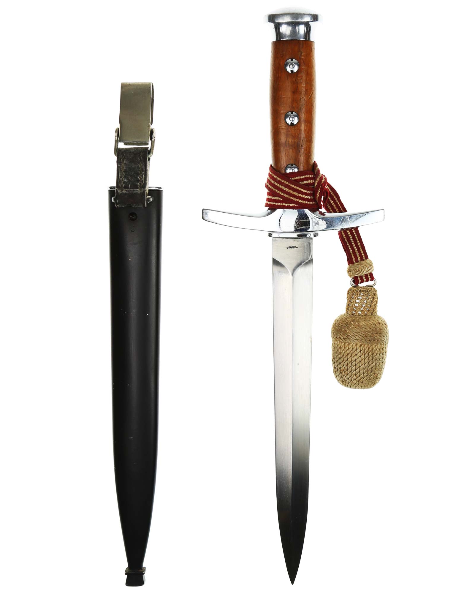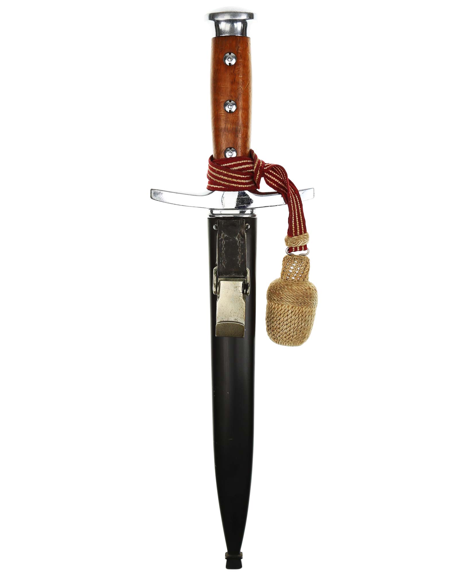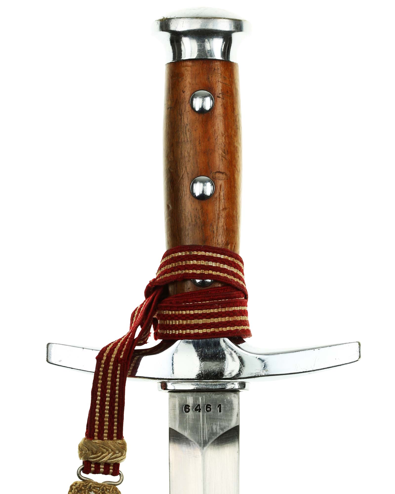 Offiziersdolch der Schweiz, Modell 1943 mit Metallscheide, Gehänge und Portepee. Der Schweizer Offiziersdolch hat dreifach verschraubte Holzgriffschalen. Die Klinge ist blank und zweischneidig ohne Hohlkehle, auf der Vorderseite der Klinge befindet sich die Nummer #6461, Rückseite mit Herstellerlogo von SIG Neuhausen (Gewehr mit N). Schwarzlackierte Stahlscheide mit einem Karabinerhaken zum Einhängen an einer Öse des Offiziersgurtes.