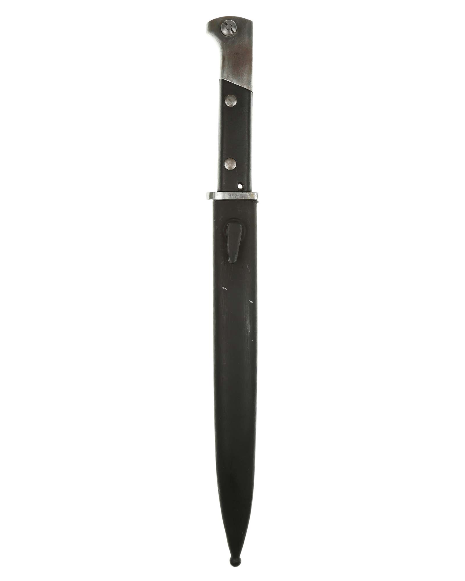 Polnisches WZ 28 Seitengewehr für Mauser-Gewehre/Karabiner. Einschneidige, blanke Klinge mit beidseitiger Hohlbahn, gemarkt mit dem polnischen Adler über "W.P.", auf der anderen Seite mit Hersteller: F.B. RADOM. Geschlitzter Drücker, Griffschalen aus Holz, Parierstange gestempelt "A23". Die Stahlscheide ist schwarz lackiert.