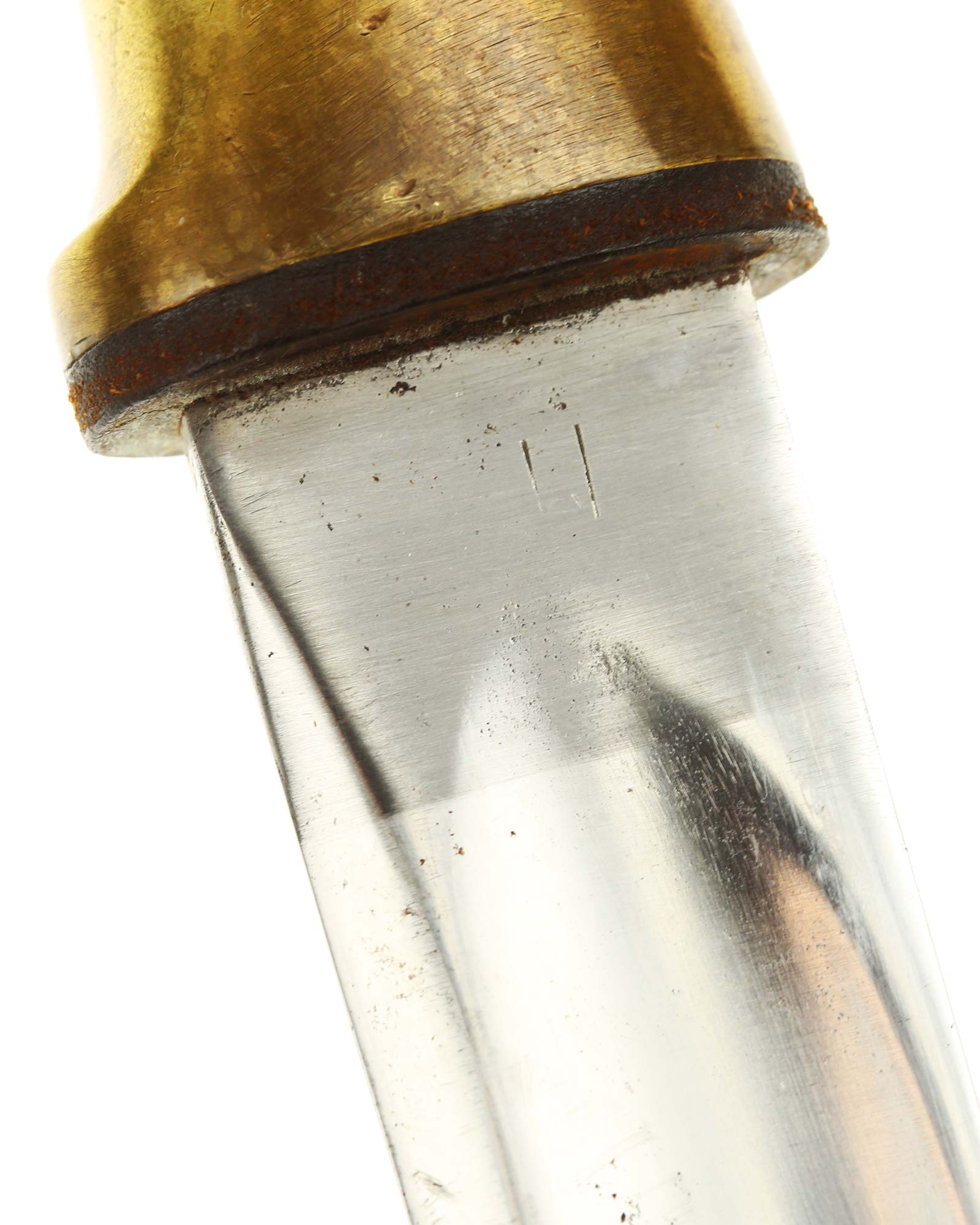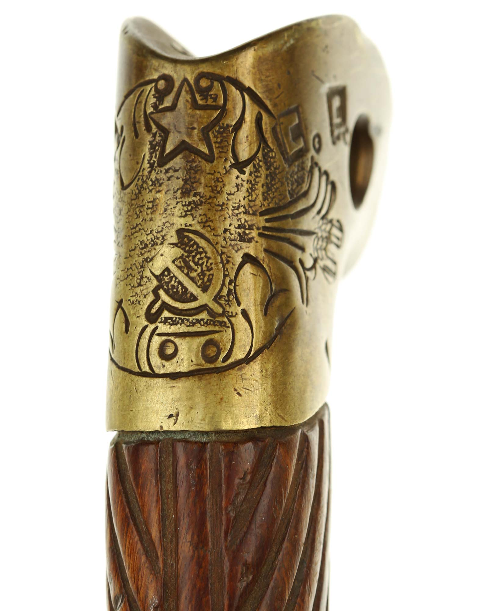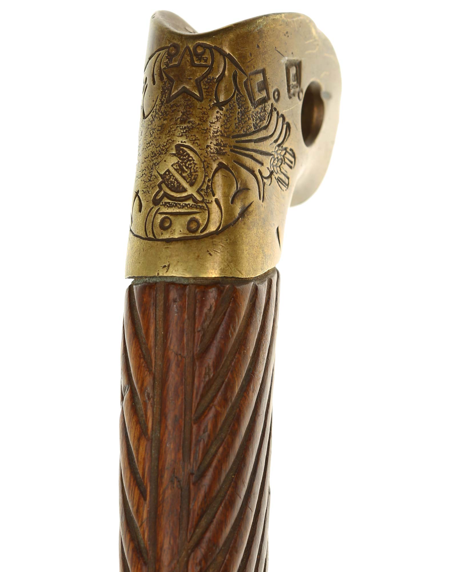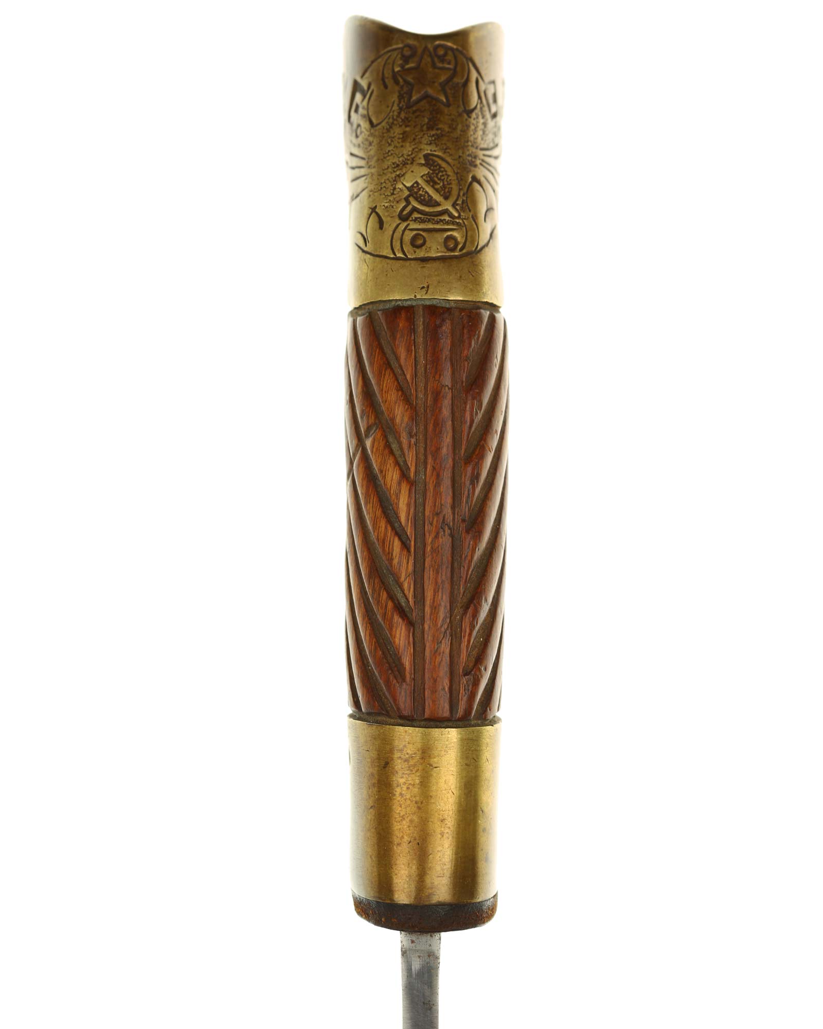 Sowjetunion Schaschka M1927 der Kavallerie. Die Klinge ist leicht geschwungen, beidseitig gekehlt mit zweischneidiger Spitze. Messinggefäß am Kopf mit sowjetischen Staatssymbol CCCP und Stempelungen. Dunkelbrauner gerillter Holzgriff, belederte Scheide mit Stahlbeschlägen, die Ringbänder jedoch aus Messing.