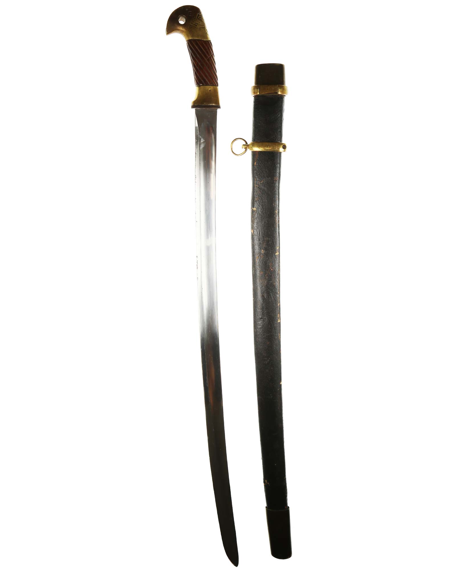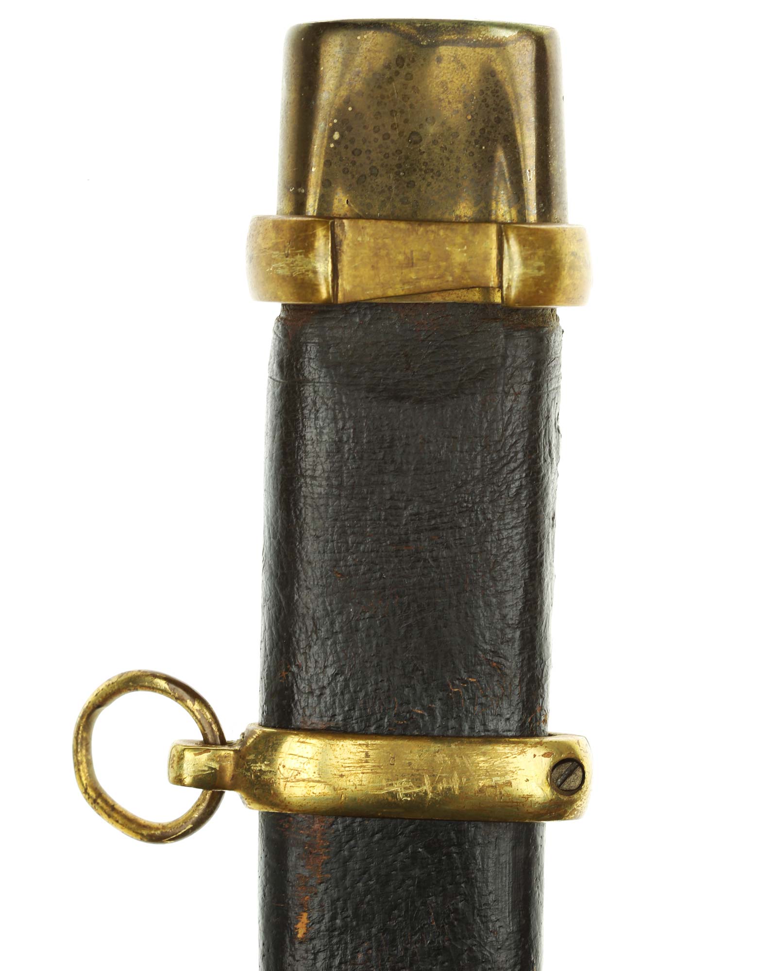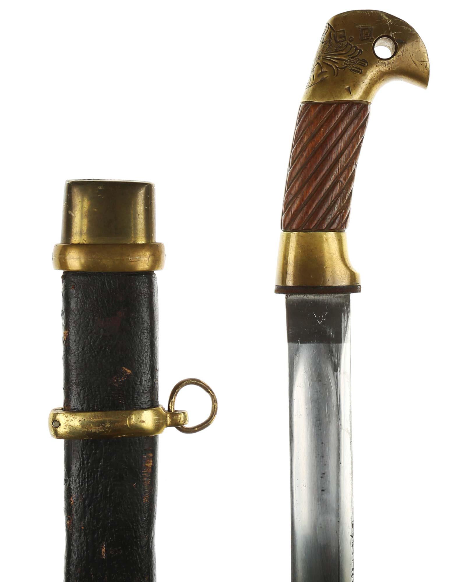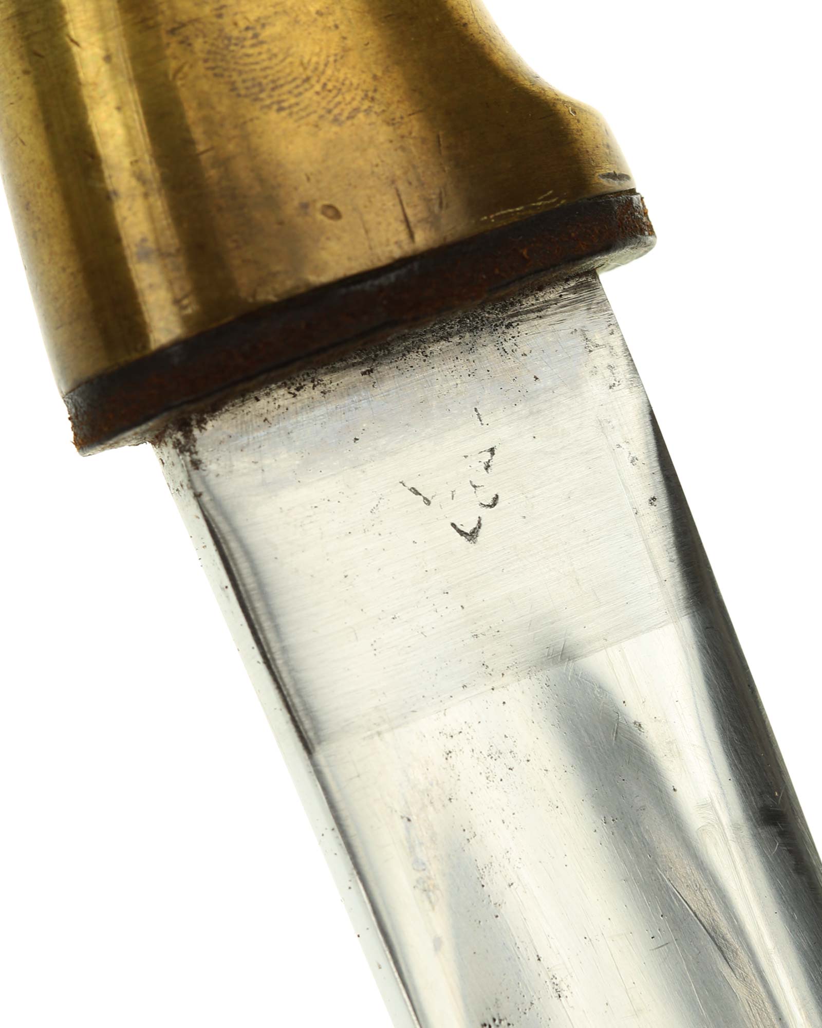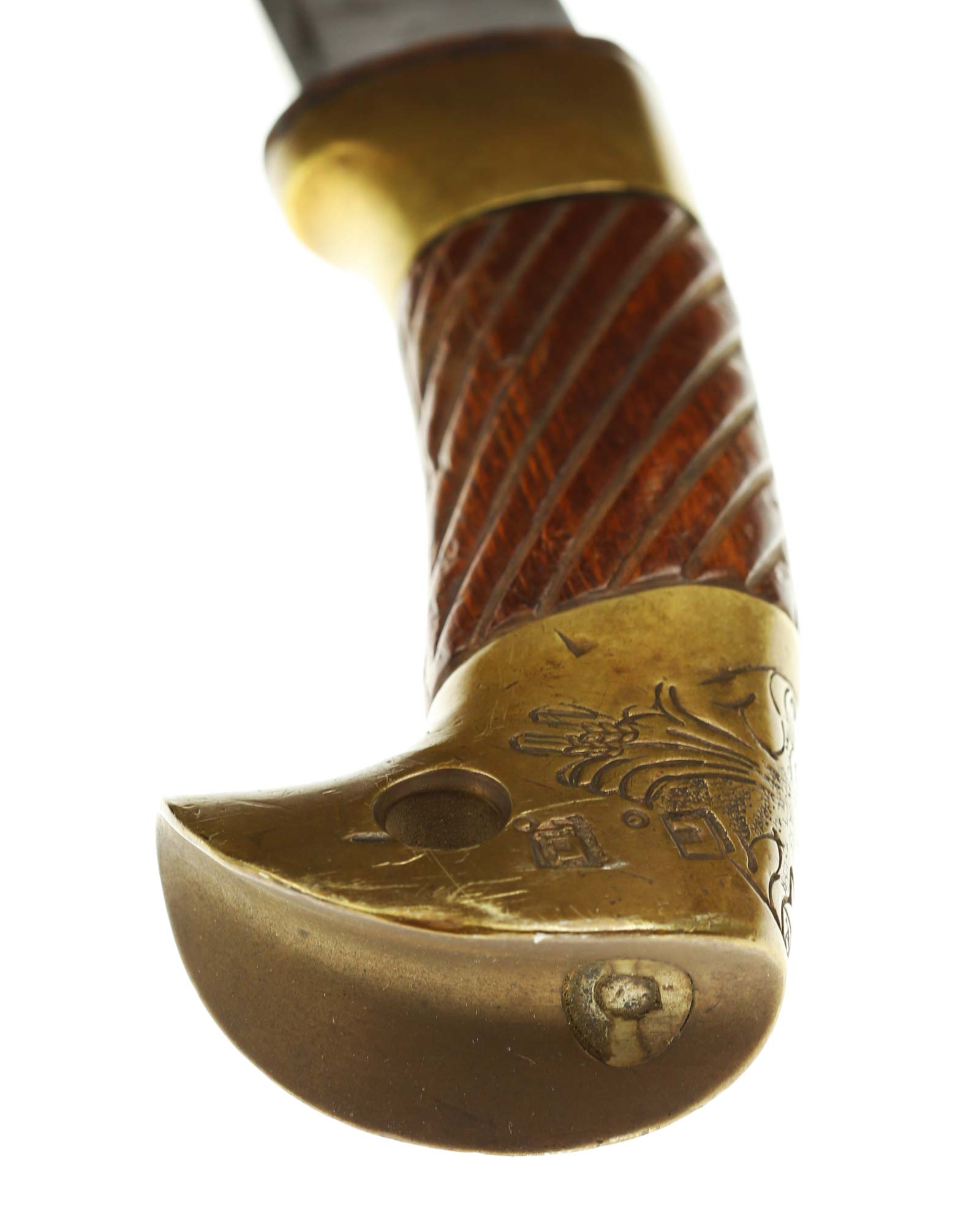 Sowjetunion Schaschka M1927 der Kavallerie. Die Klinge ist leicht geschwungen, beidseitig gekehlt mit zweischneidiger Spitze. Messinggefäß am Kopf mit sowjetischen Staatssymbol CCCP und Stempelungen. Dunkelbrauner gerillter Holzgriff, belederte Scheide mit Stahlbeschlägen, die Ringbänder jedoch aus Messing.