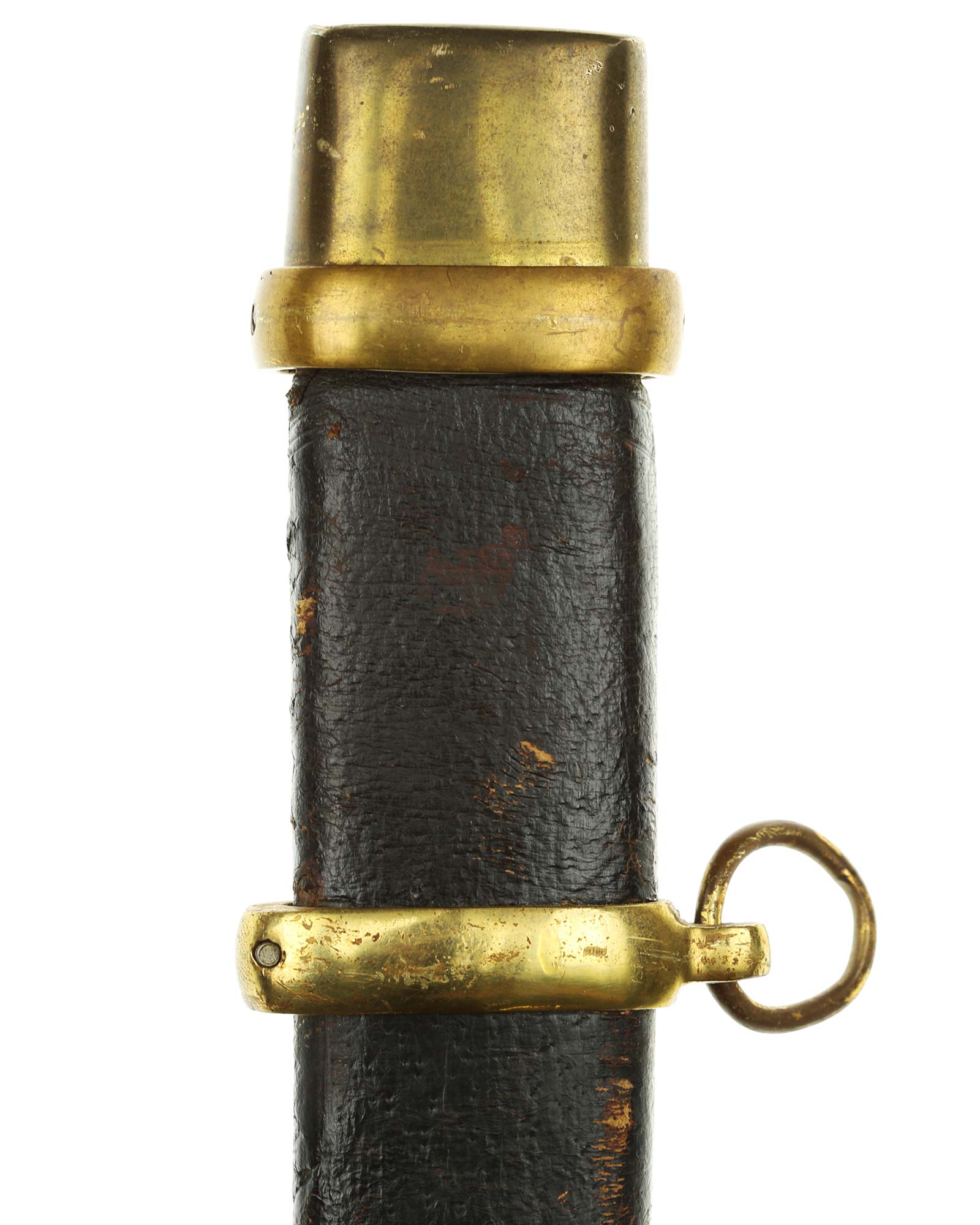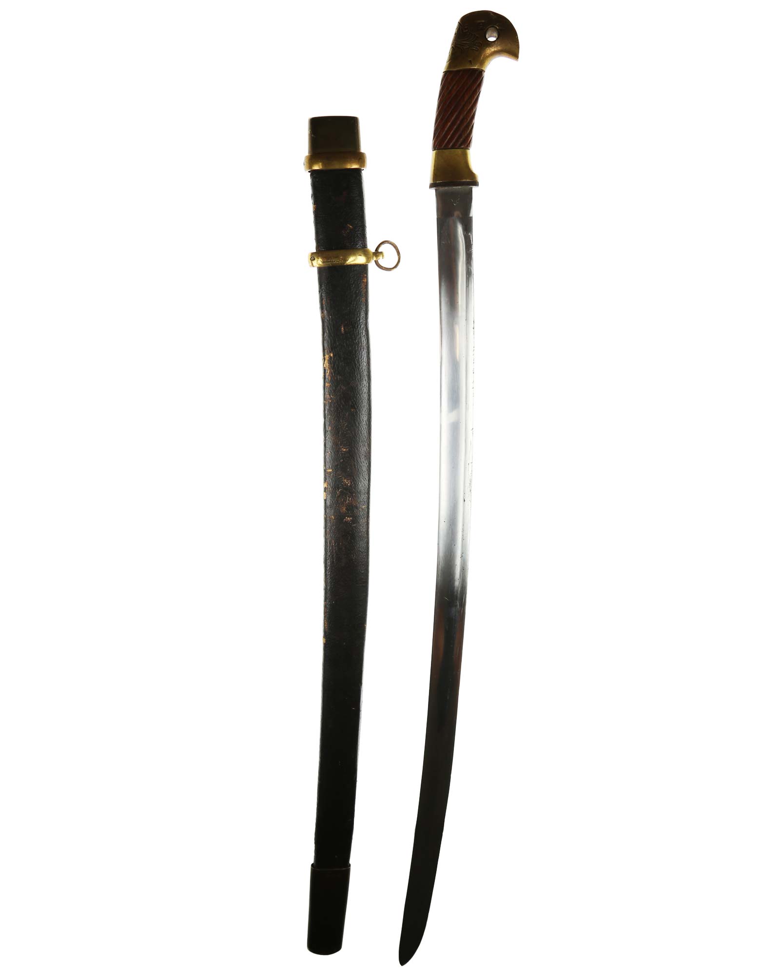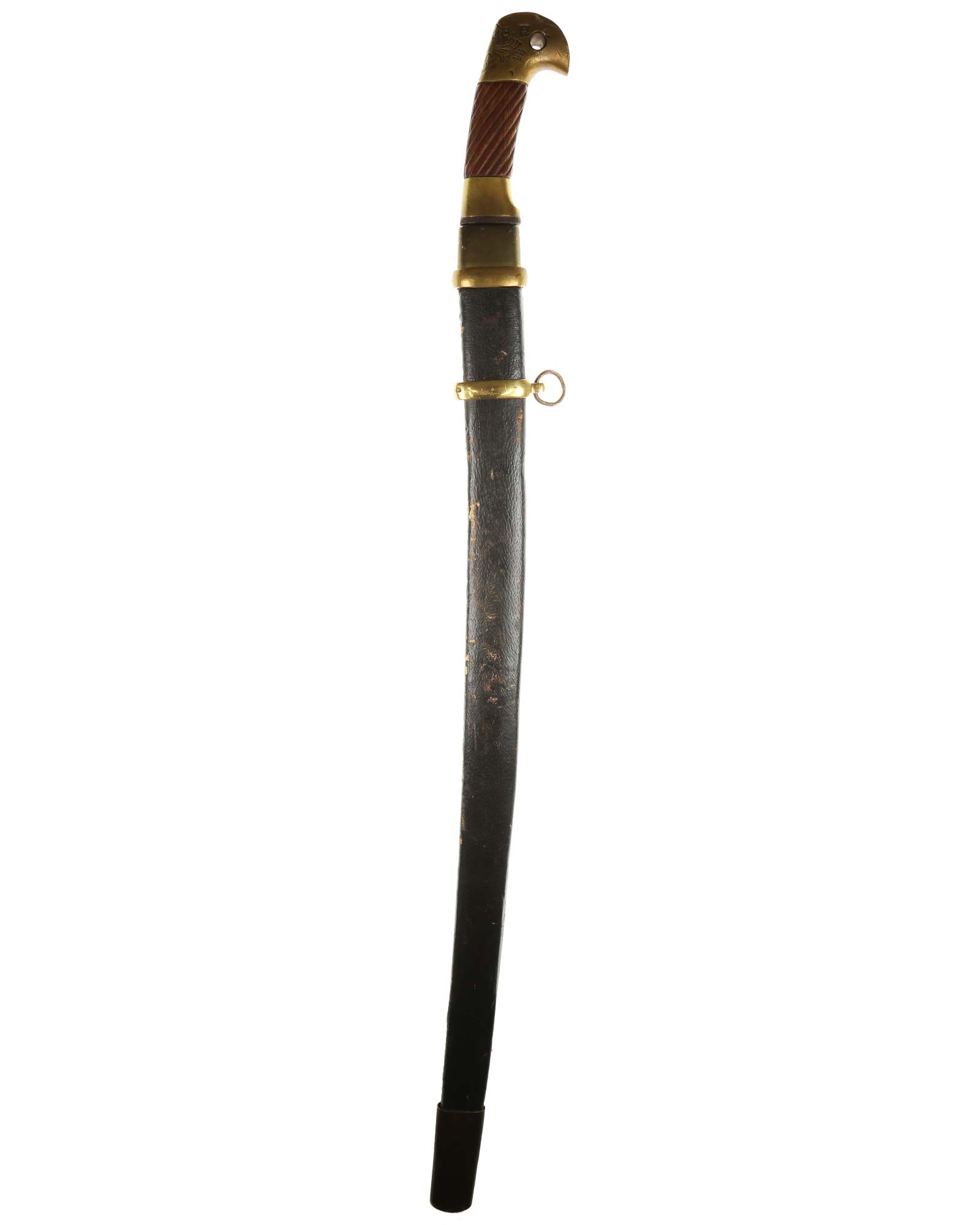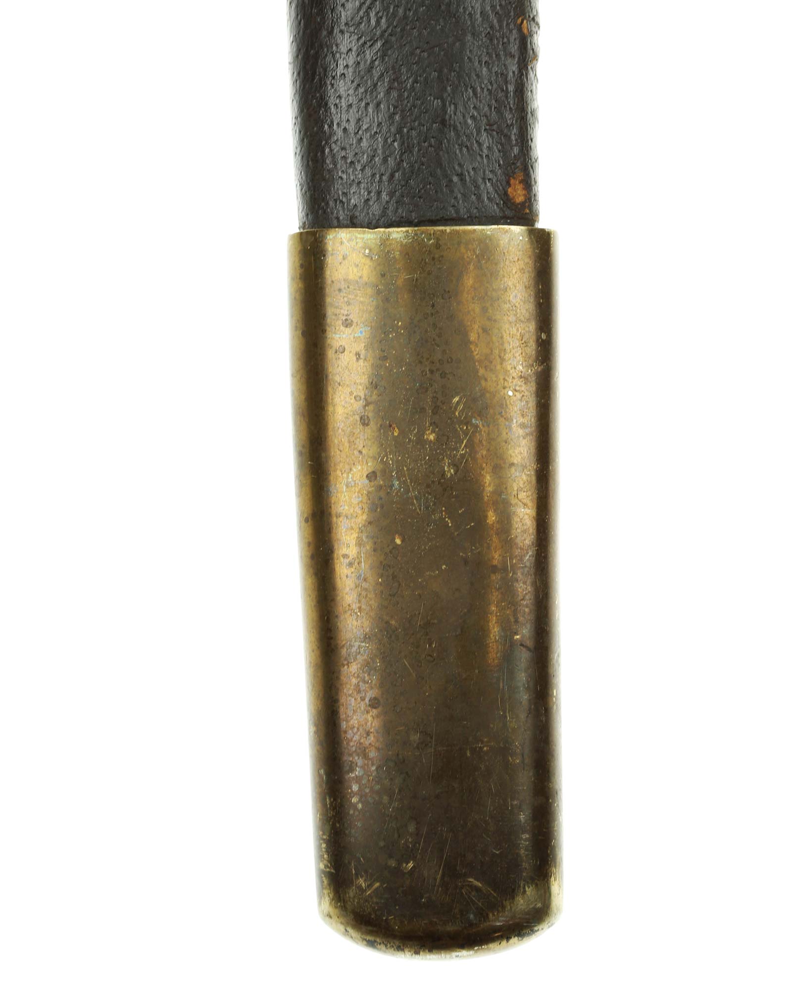 Sowjetunion Schaschka M1927 der Kavallerie. Die Klinge ist leicht geschwungen, beidseitig gekehlt mit zweischneidiger Spitze. Messinggefäß am Kopf mit sowjetischen Staatssymbol CCCP und Stempelungen. Dunkelbrauner gerillter Holzgriff, belederte Scheide mit Stahlbeschlägen, die Ringbänder jedoch aus Messing.