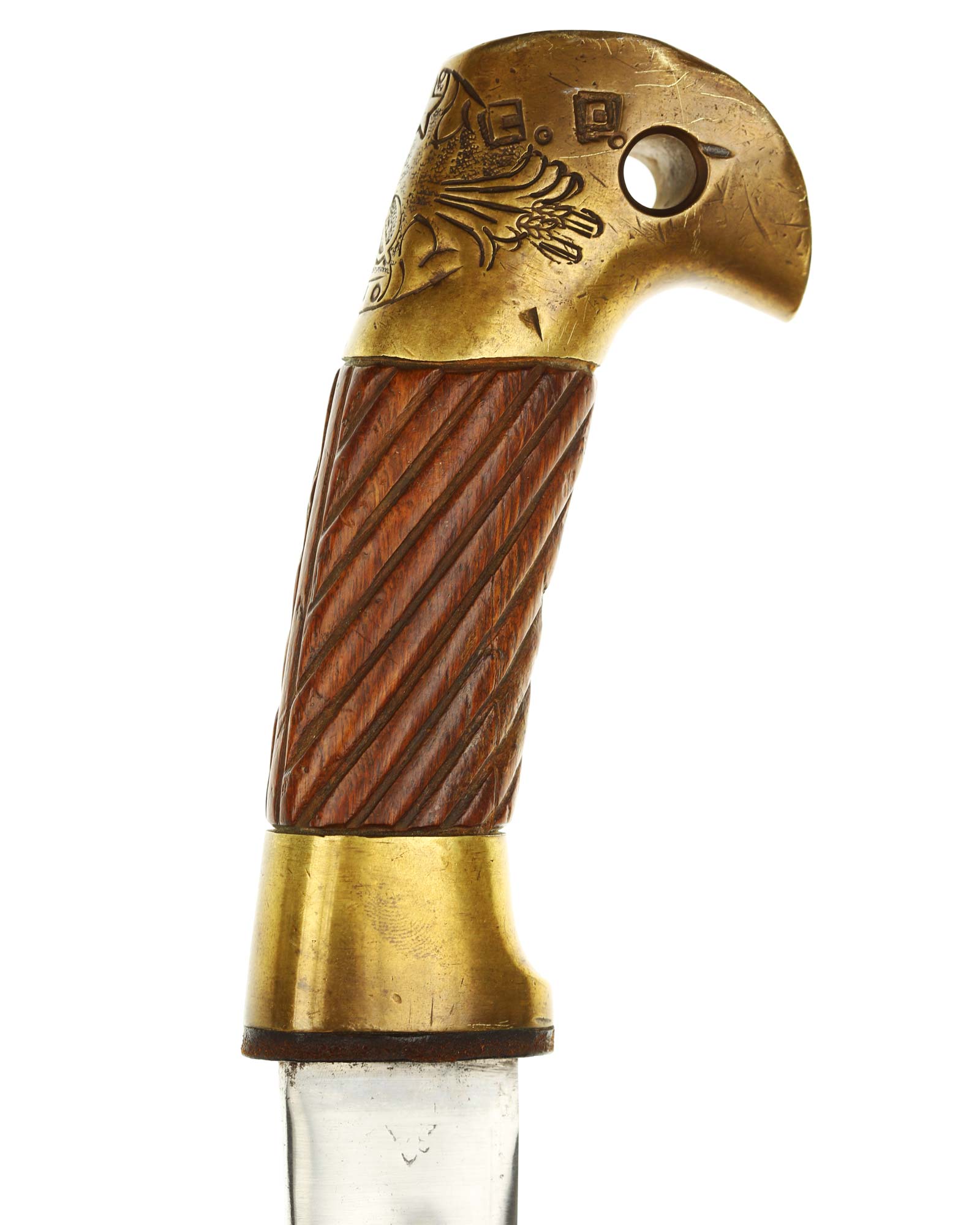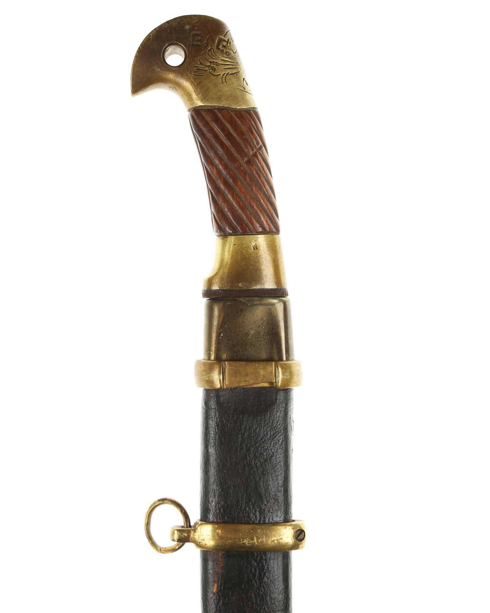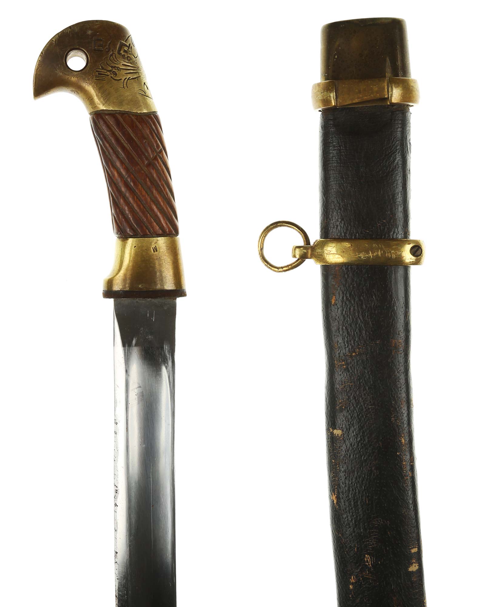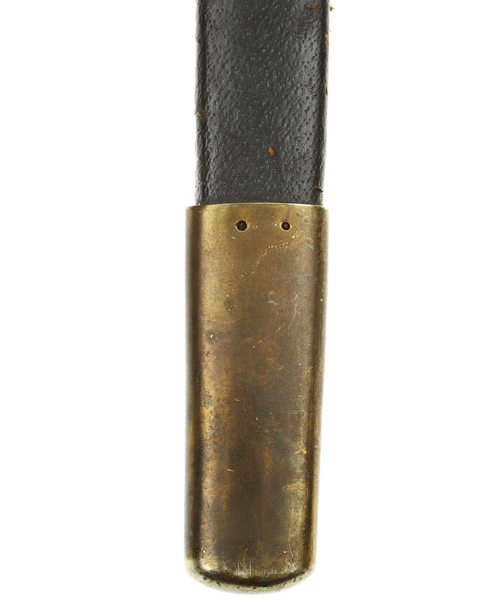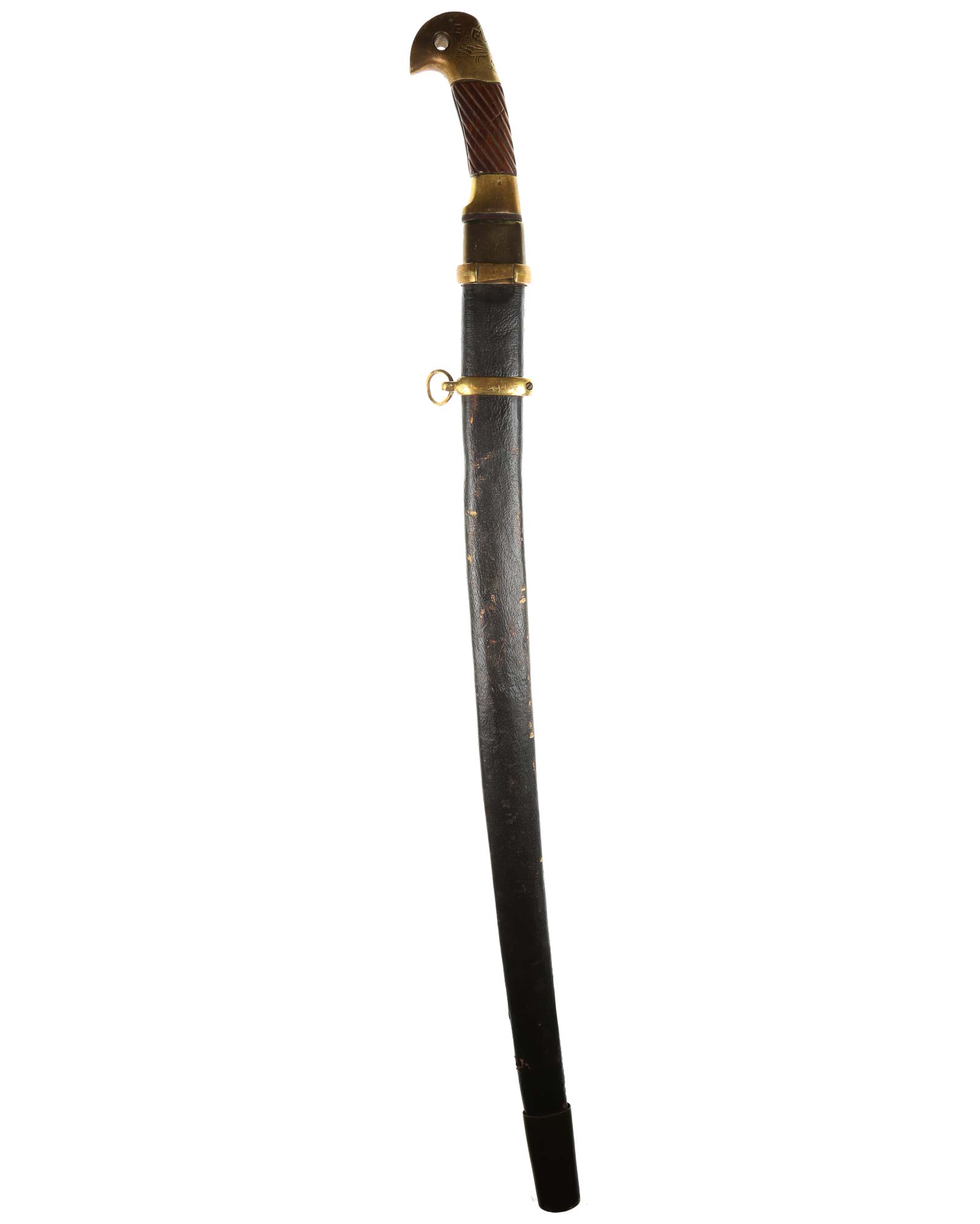 Sowjetunion Schaschka M1927 der Kavallerie. Die Klinge ist leicht geschwungen, beidseitig gekehlt mit zweischneidiger Spitze. Messinggefäß am Kopf mit sowjetischen Staatssymbol CCCP und Stempelungen. Dunkelbrauner gerillter Holzgriff, belederte Scheide mit Stahlbeschlägen, die Ringbänder jedoch aus Messing.