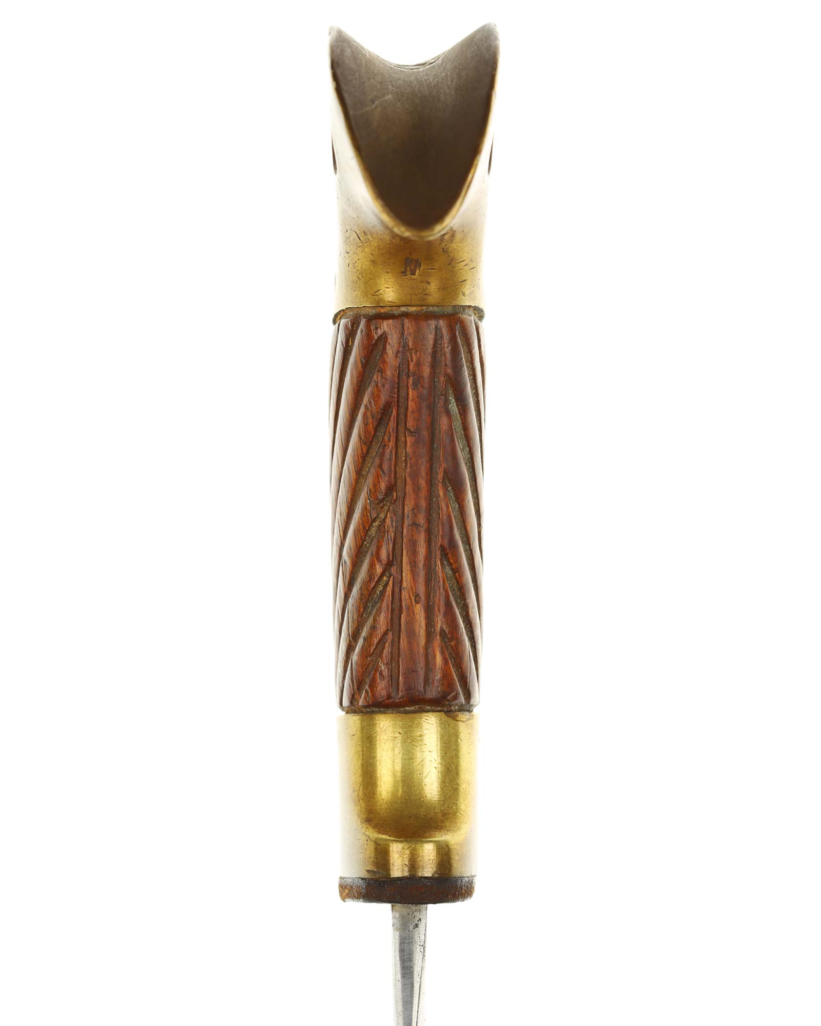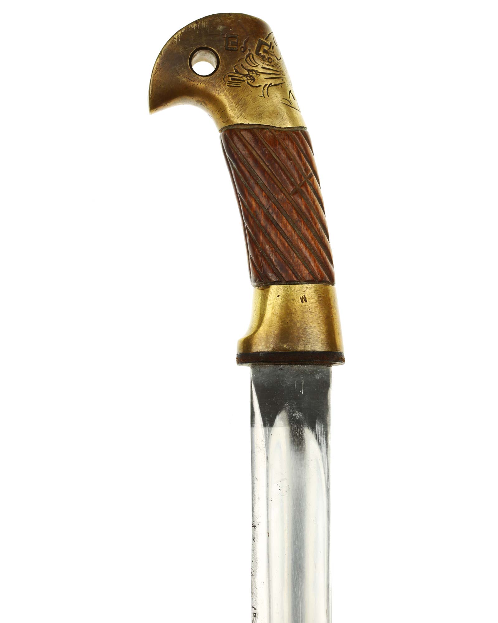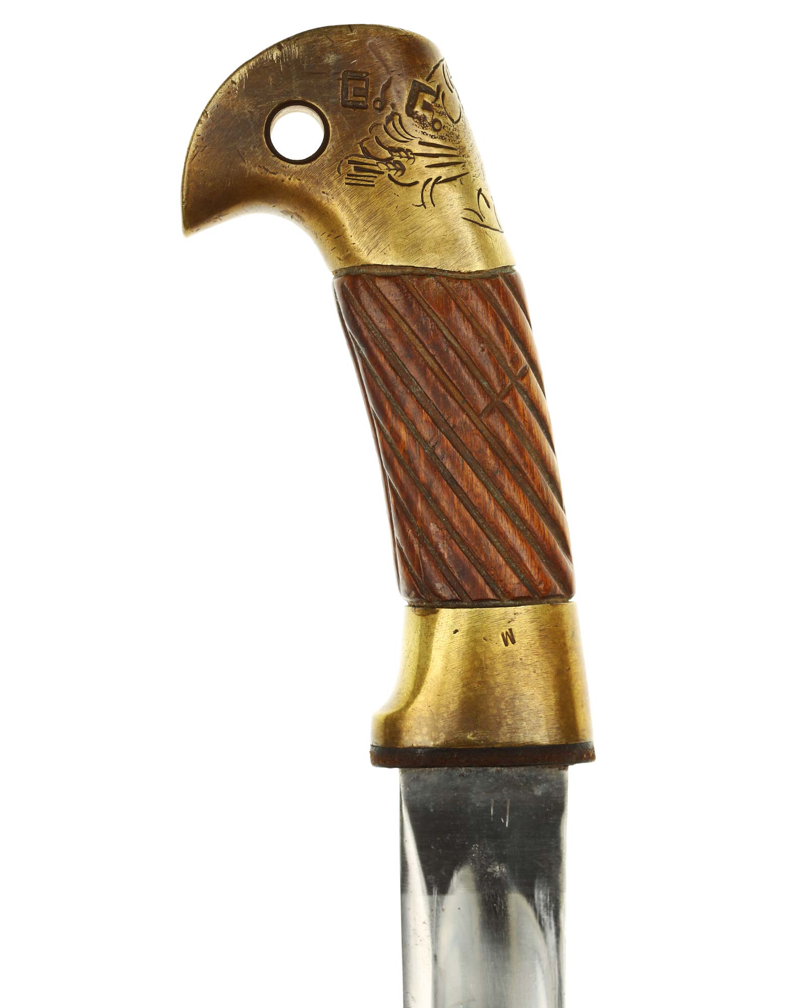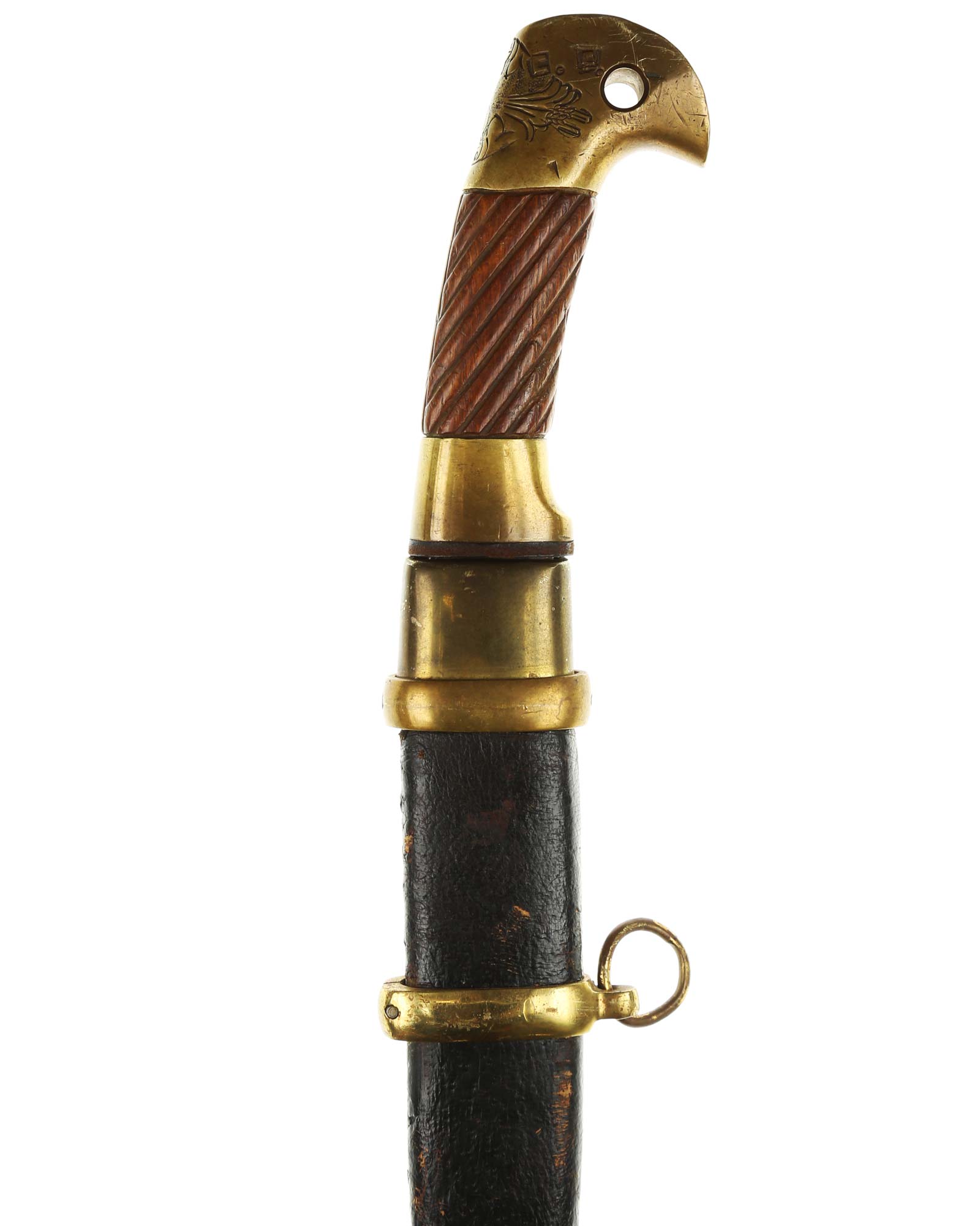 Sowjetunion Schaschka M1927 der Kavallerie. Die Klinge ist leicht geschwungen, beidseitig gekehlt mit zweischneidiger Spitze. Messinggefäß am Kopf mit sowjetischen Staatssymbol CCCP und Stempelungen. Dunkelbrauner gerillter Holzgriff, belederte Scheide mit Stahlbeschlägen, die Ringbänder jedoch aus Messing.