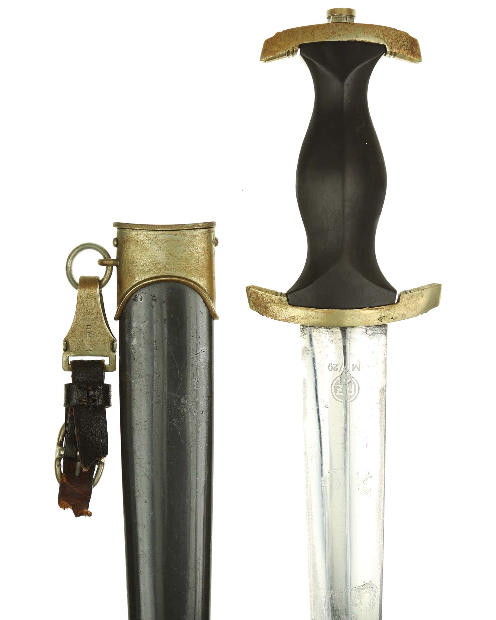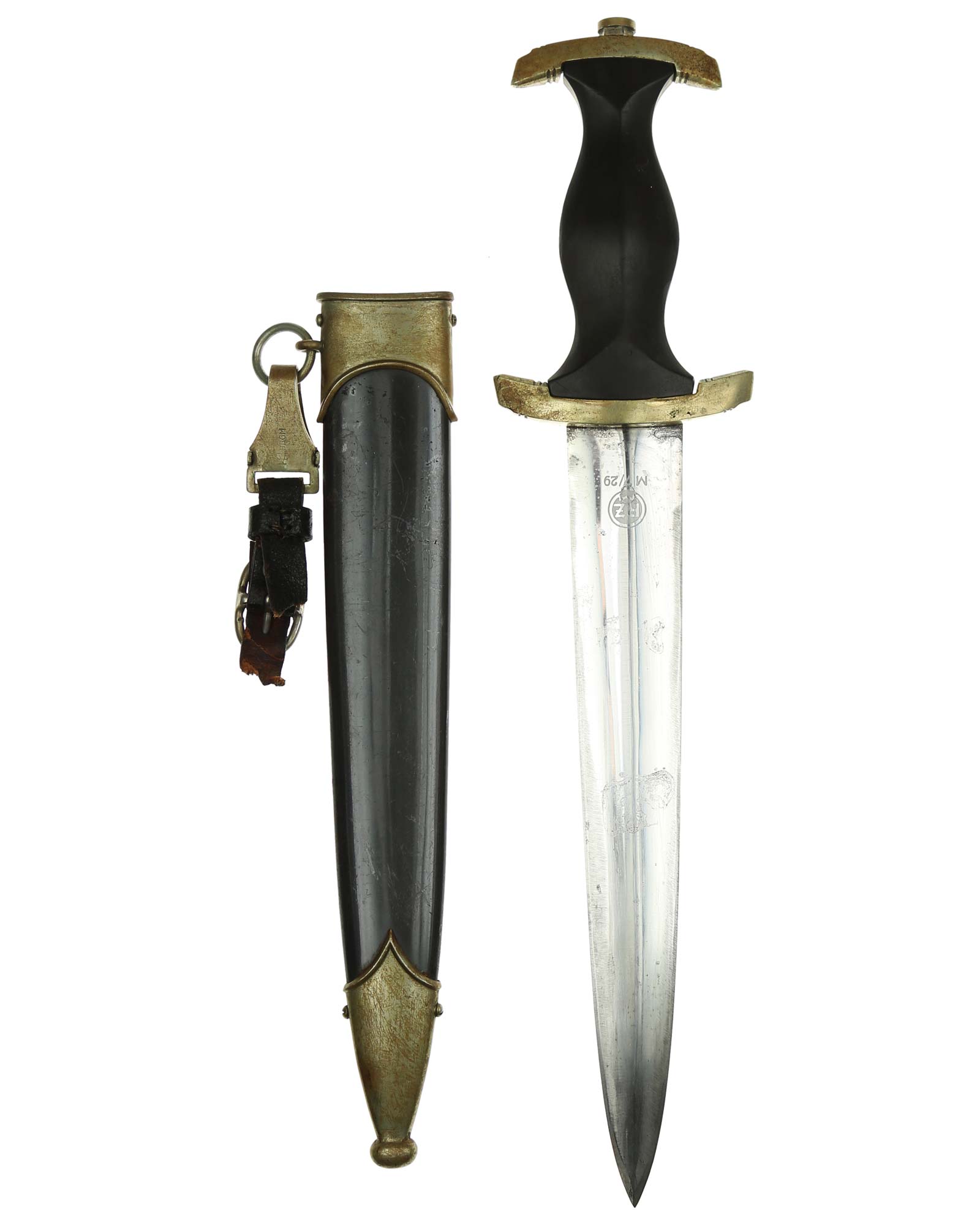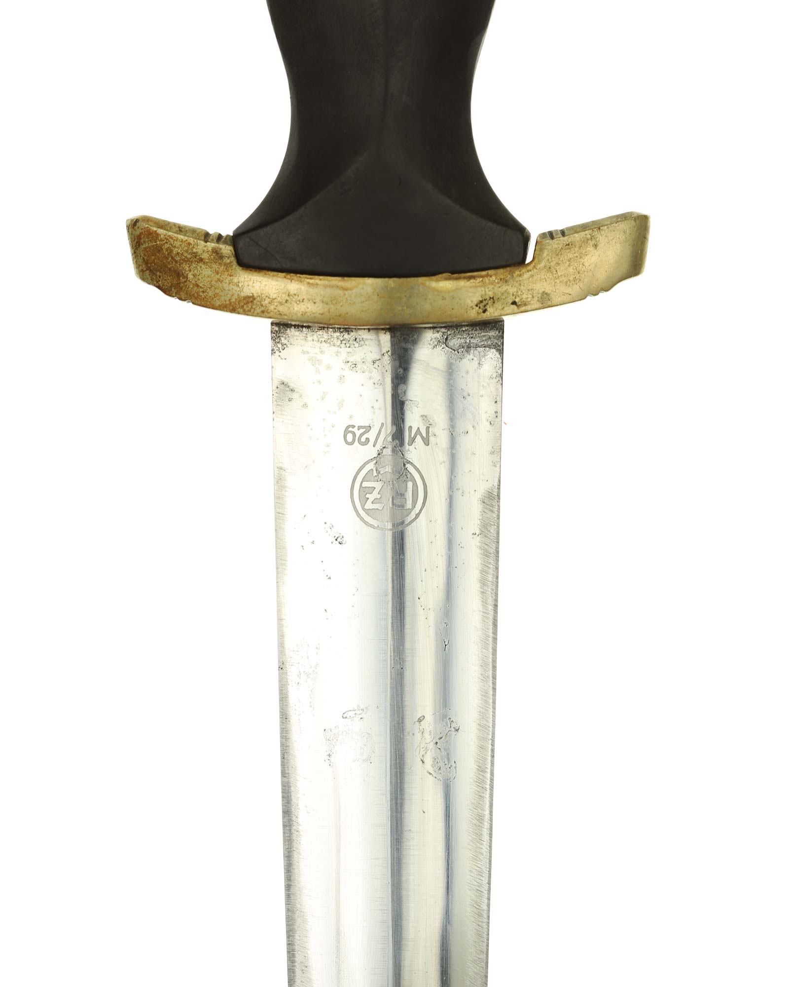 Klinge: Auf der Vorderseite der Klinge befindet sich die SS Devise mit der Inschrift: Meine Ehre heißt Treue "!", die Rückseite ist mit dem RZM Code: RZM M7/29 (Klittermann Haan & Moog GmbH, Solingen).