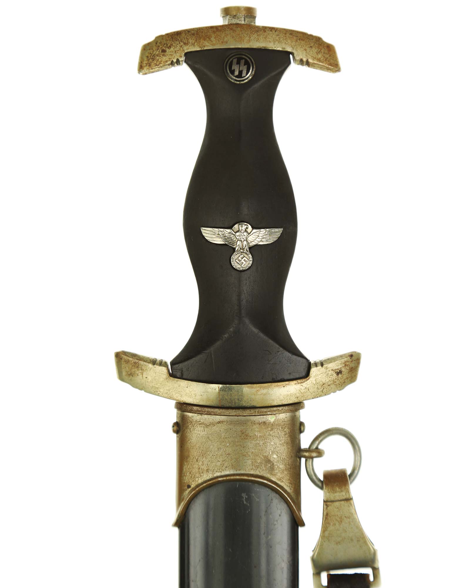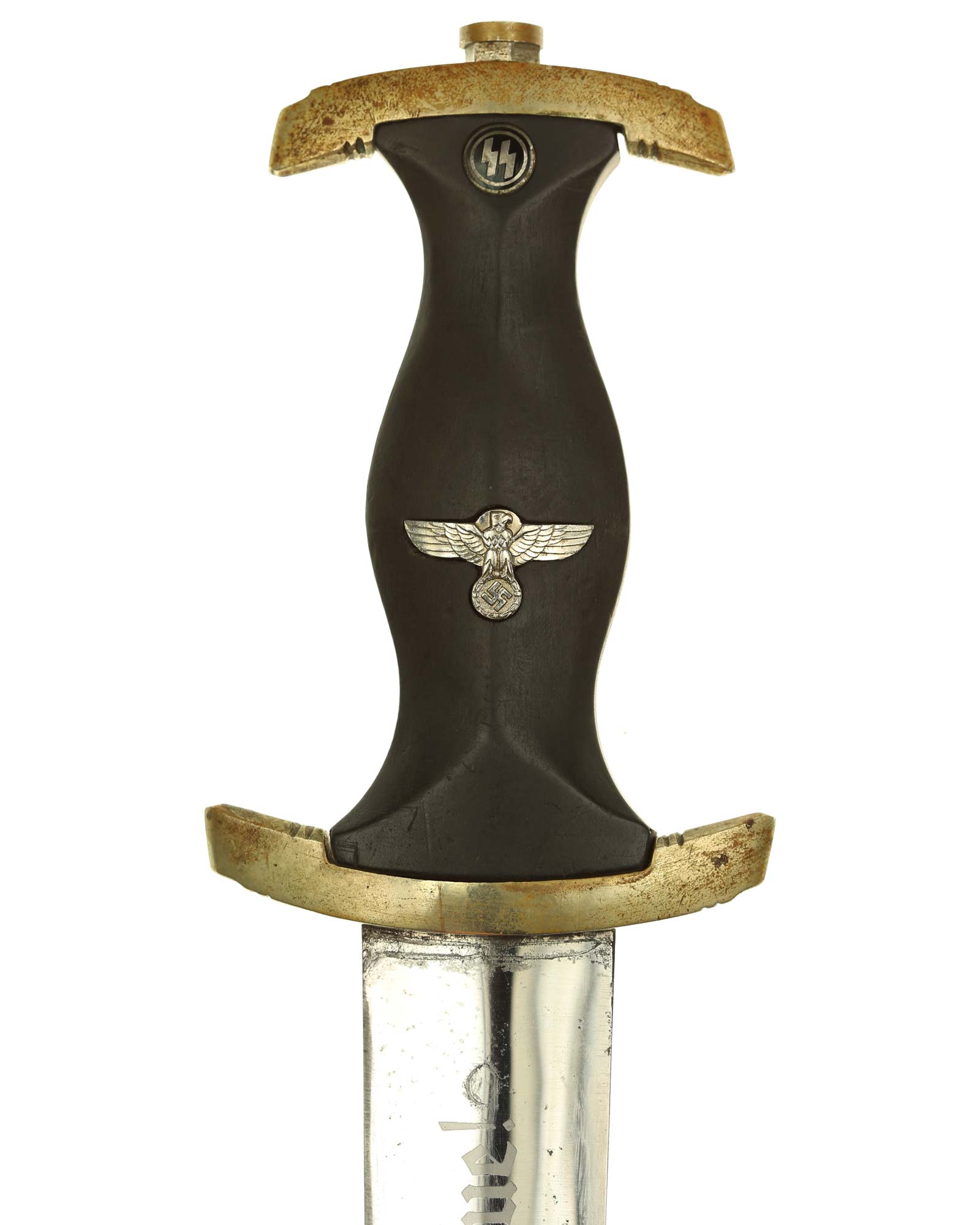 Griff: Der Griff besteht aus schwarzem Ebenholz, auf diesem befinden sich die SS Runen und der Hoheitsadler, diese sind innen geklammert. Die Parierstangen sind aus Neusilber und mit Patina überzogen.
