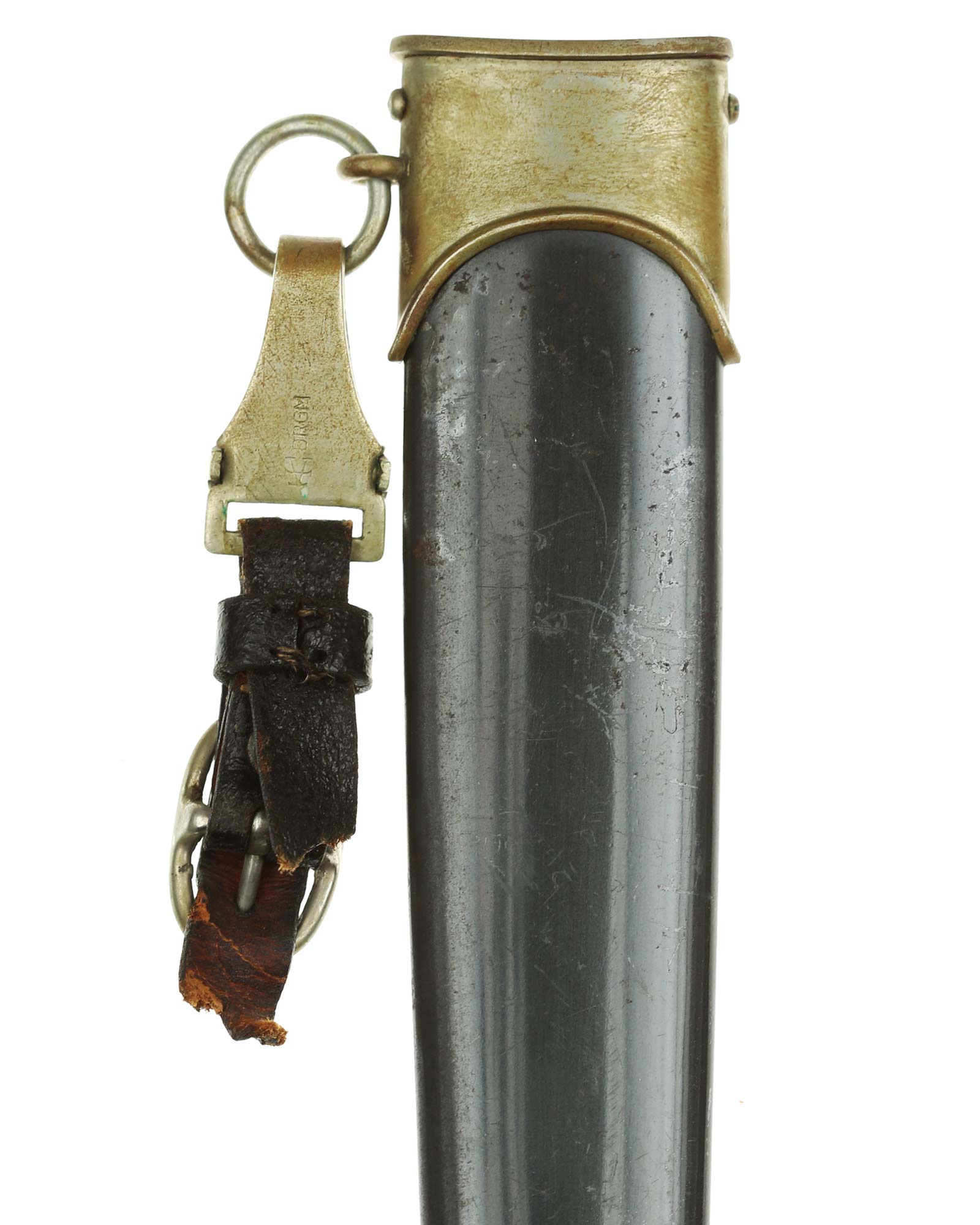 Scheide: Die Scheide ist aus Eisen und mit orig. schwarzer Brünierung. Die beiden Scheidenbeschläge sind mit Patina überzogen. Die Beschläge werden mit jeweils zwei Schräubchen seitlich gehalten. Am oberen Beschlag befindet sich der Ring für das Tragegehänge.