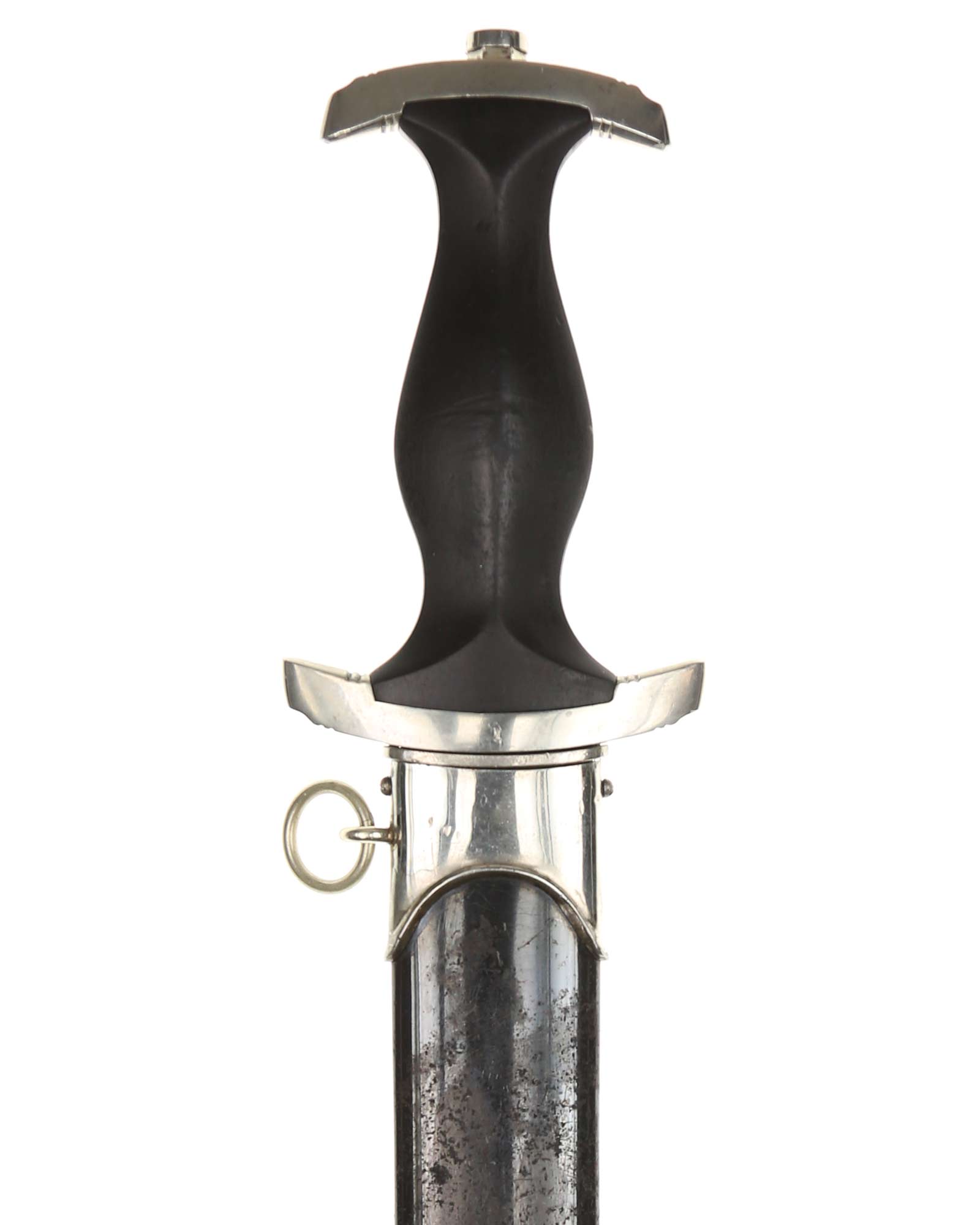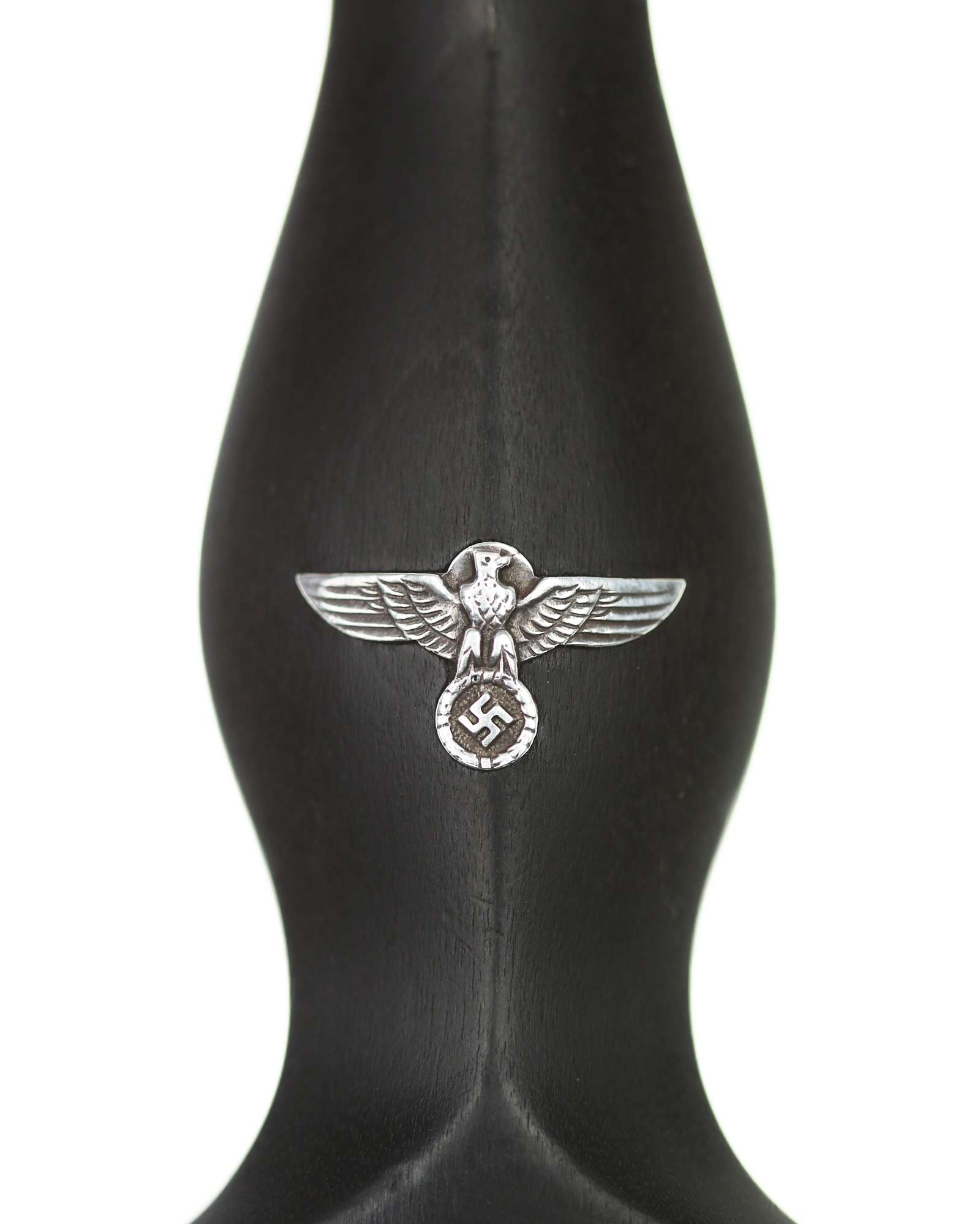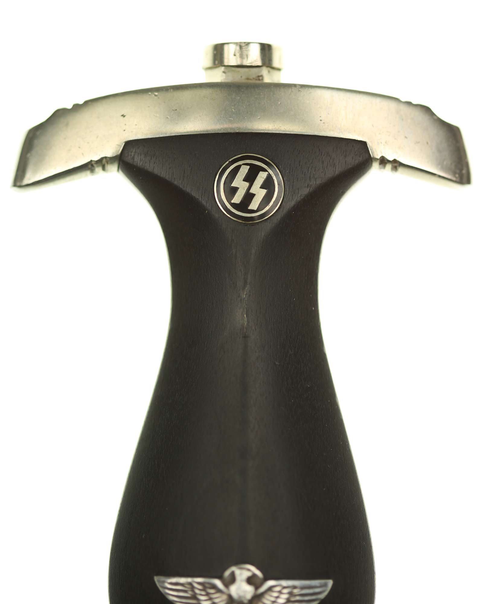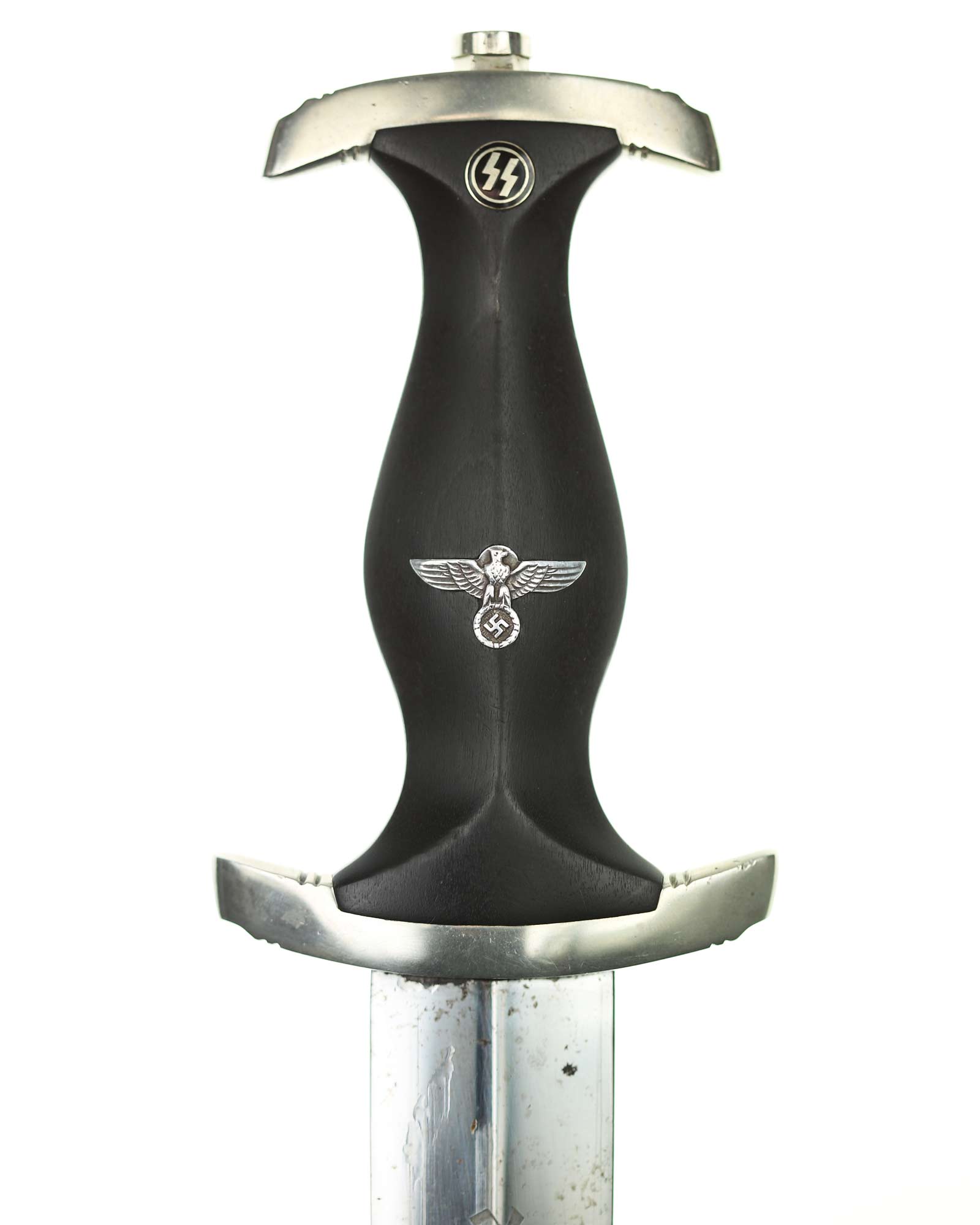 Griff: Der Griff besteht aus Ebenholz, der Hoheitsadler im Griff ist in Nickelausführung, darüber befindet sich das emaillierte SS-Emblem, diese sind innen geklammert. Beide Parierstangen sind aus Neusilber. Die untere Parierstange ist auf der Rückseite mit einer Römischen Ziffer "I" [München] handgestanzt.