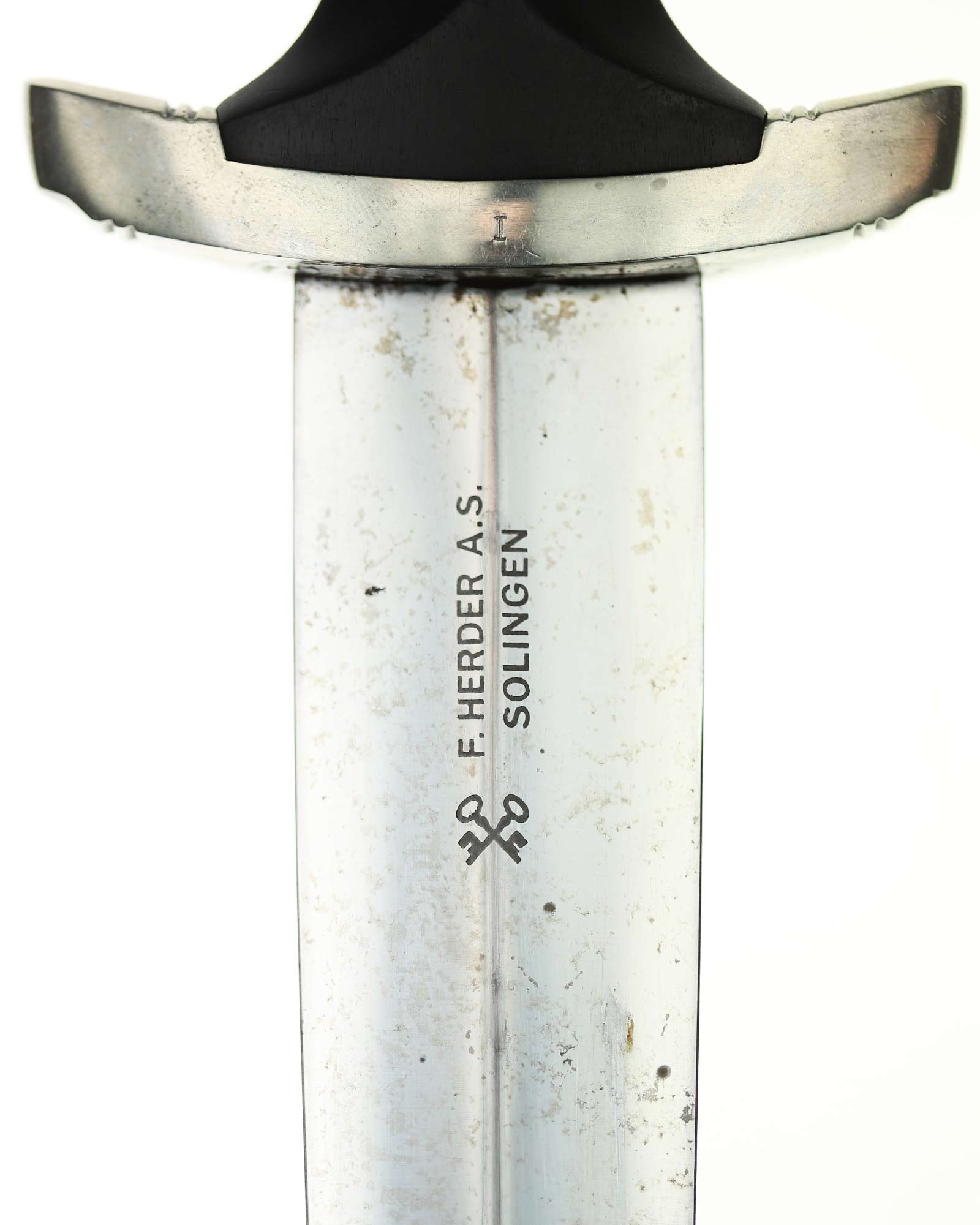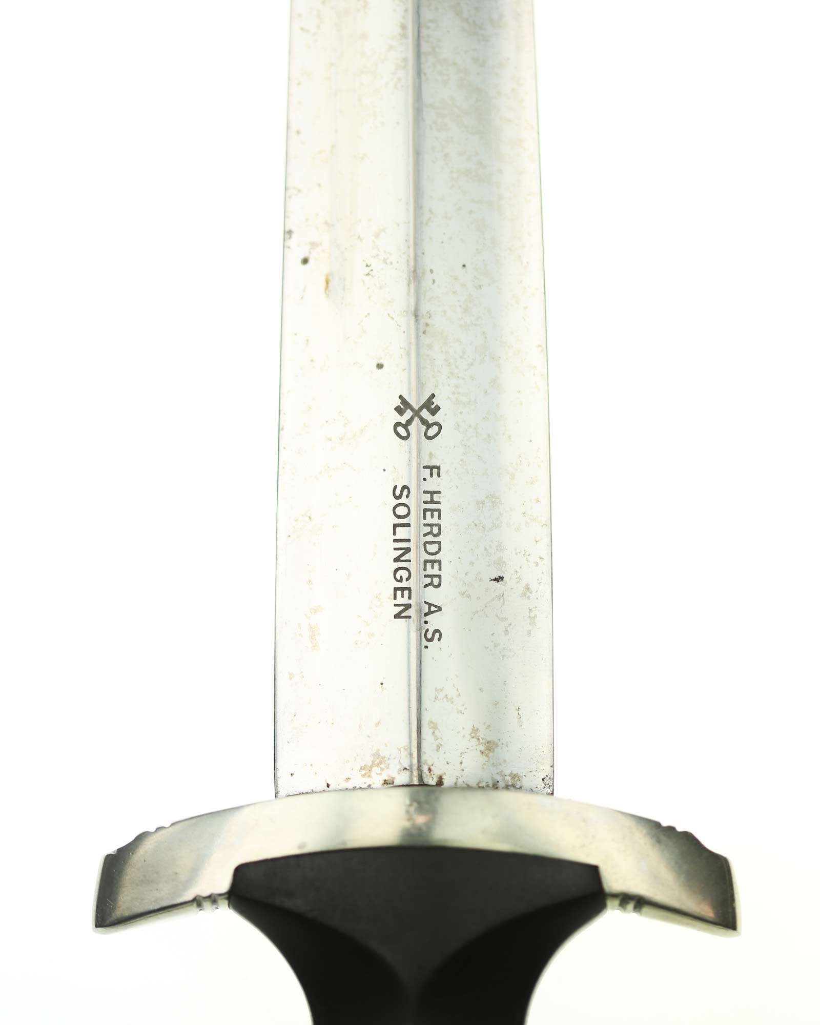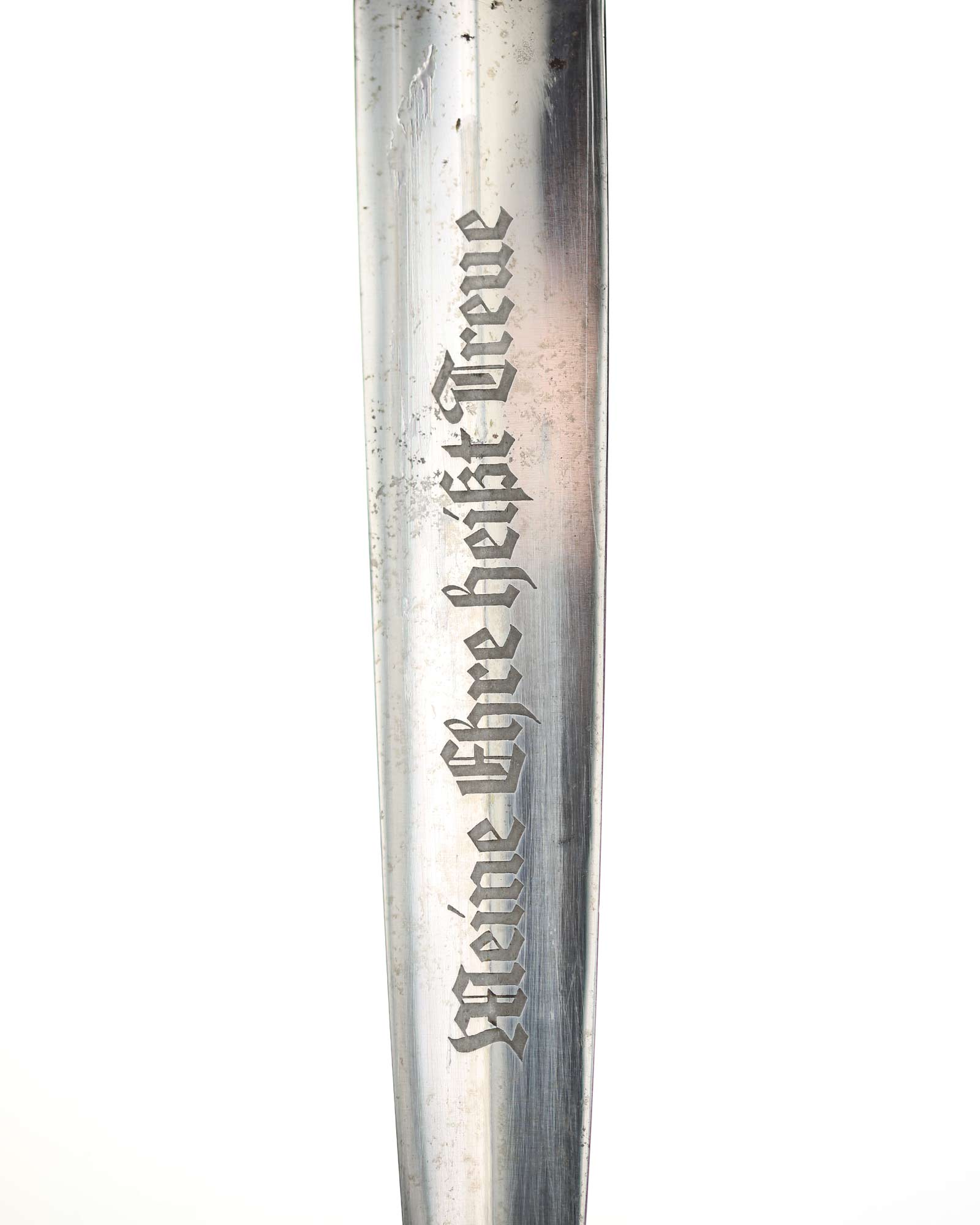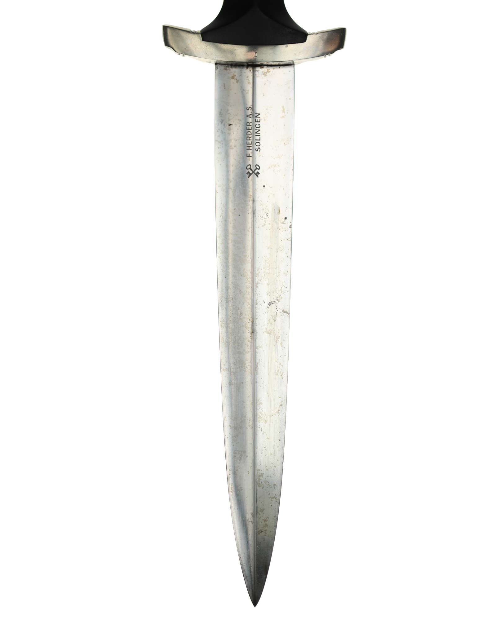 Klinge: Die Klinge ist zweischneidig. Auf der Vorderseite der Klinge befindet sich die SS Devise mit der Inschrift: Meine Ehre heißt Treue, diese ist tief und zackig. Die Rückseite ist mit dem Herstellerlogo von F. Herder A. & S. Solingen.