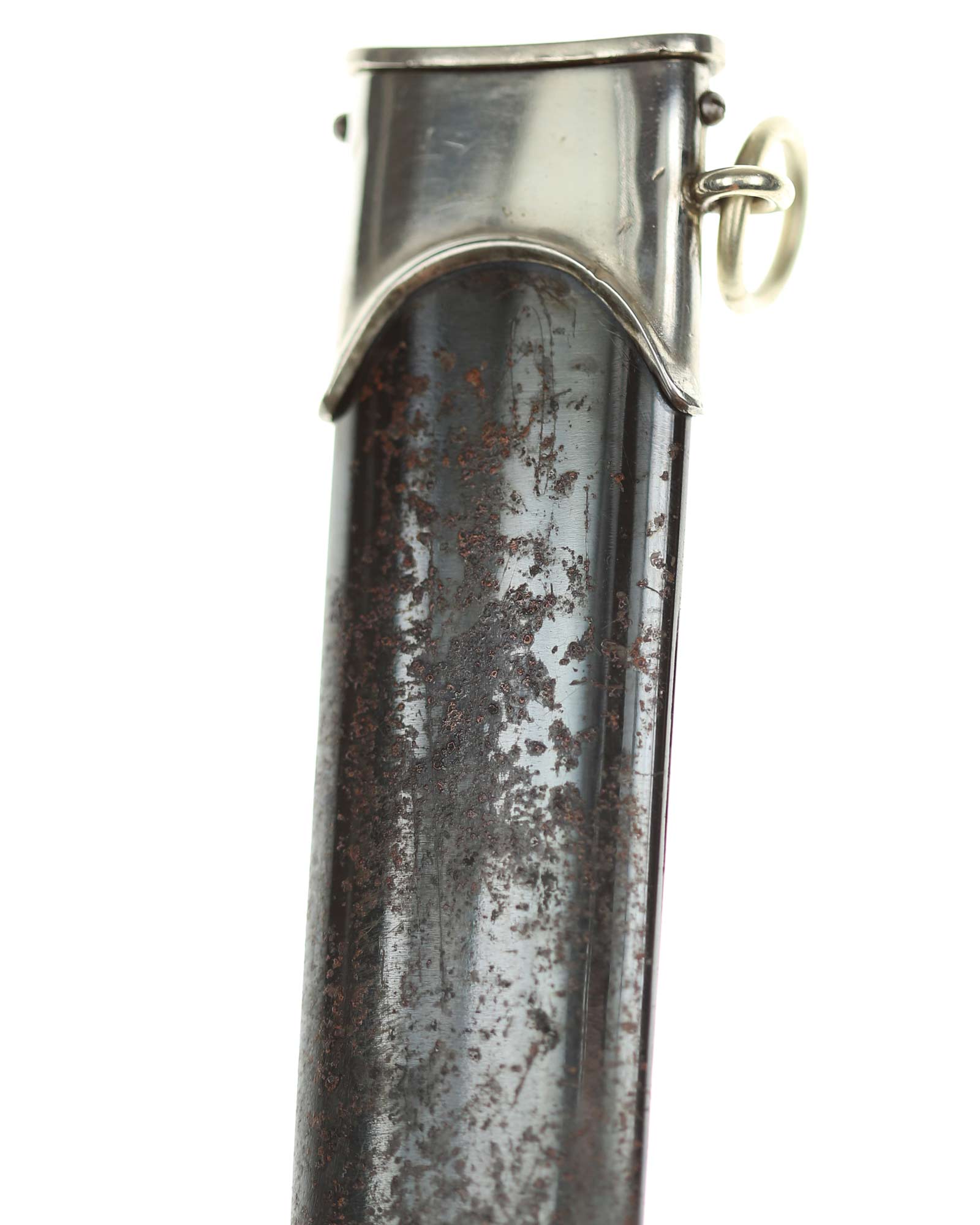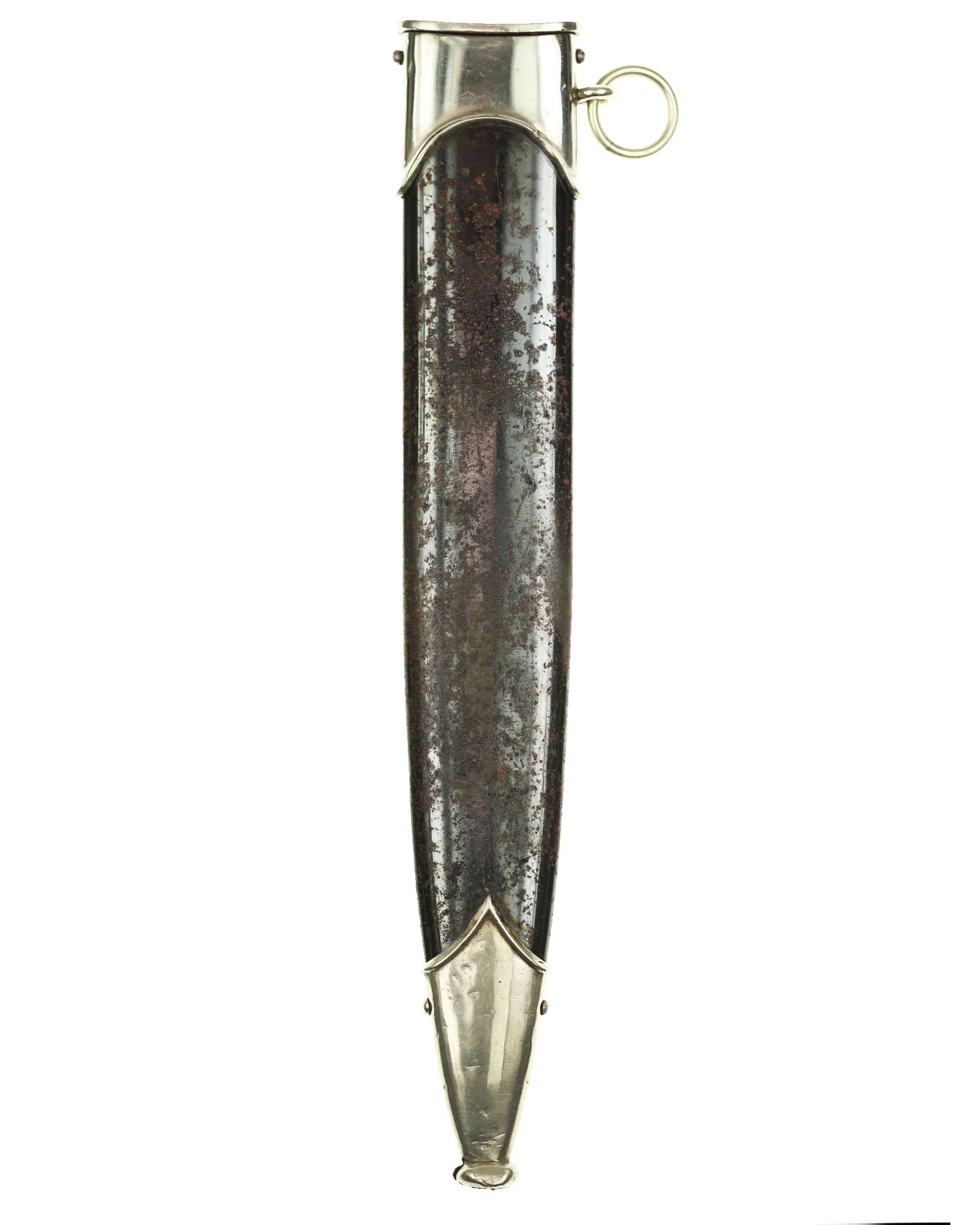 Scheide: Die Scheide ist aus Eisen und mit schwarzer Originalbrünierung. Die beiden Scheidenbeschläge sind aus vernickeltem Stahlblech, diese werden mit jeweils zwei Schrauben seitlich gehalten. Am oberen Beschlag befindet sich der Ring für das Tragegehänge.