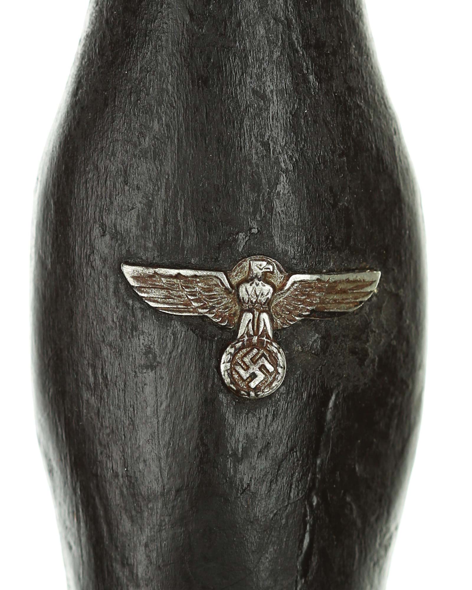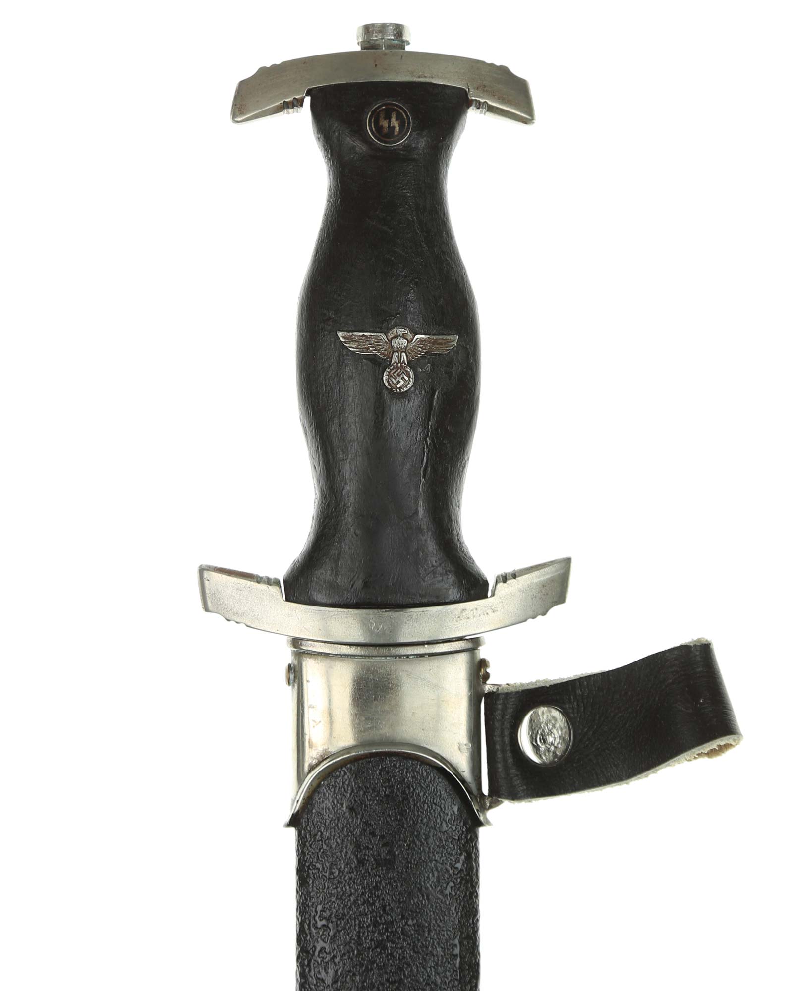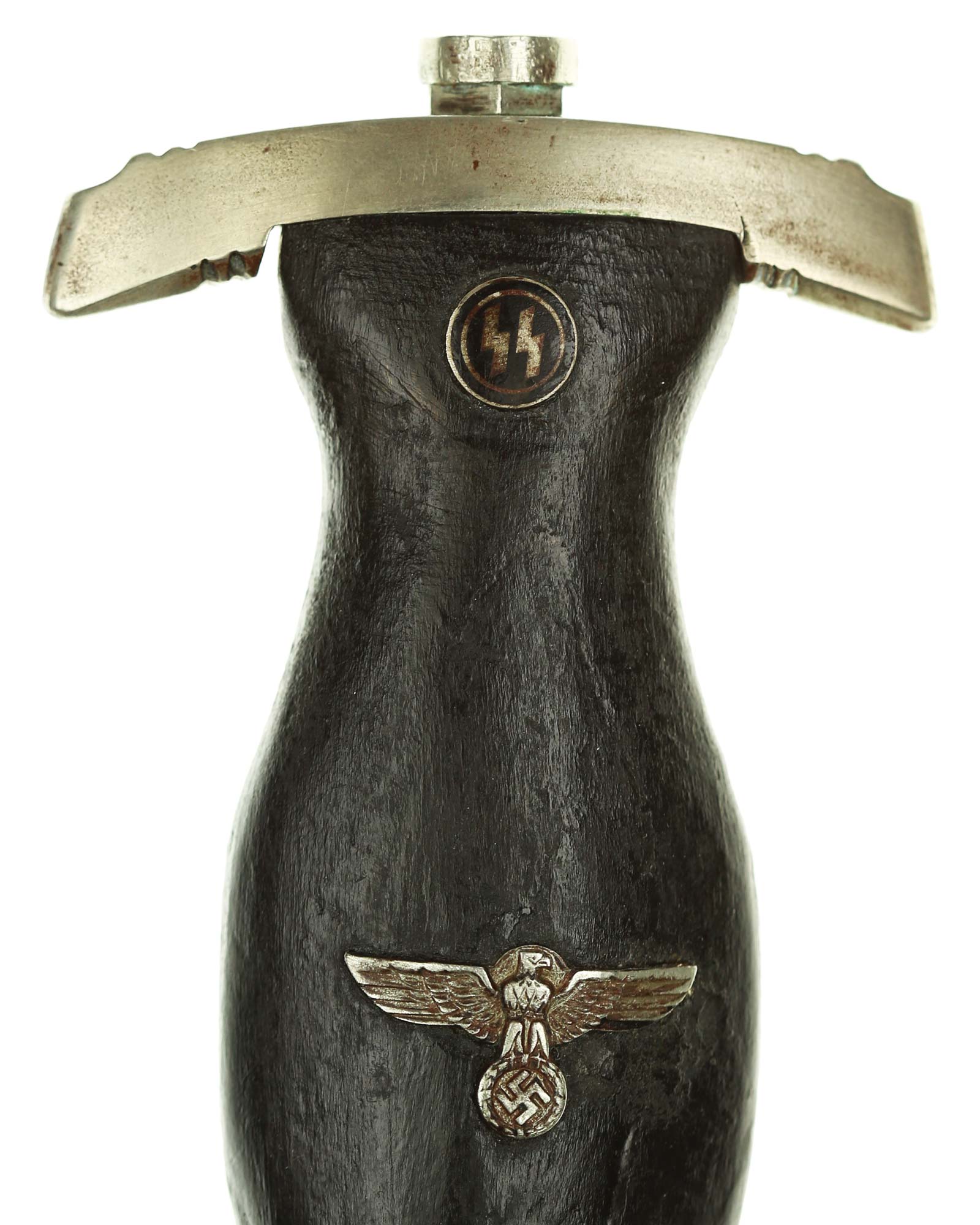 Griff: Der Griff besteht aus Holz, was mit der Zeit ausgetauscht wurde. Auf diesem befinden sich die SS Runen und der Hoheitsadler aus Nickel, diese sind innen geklammert. Die Parierstangen sind aus Neusilber. Die untere Parierstange ist auf der Rückeseite mit römisch "III" versehen.