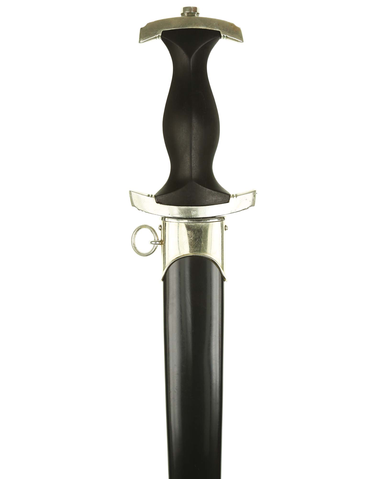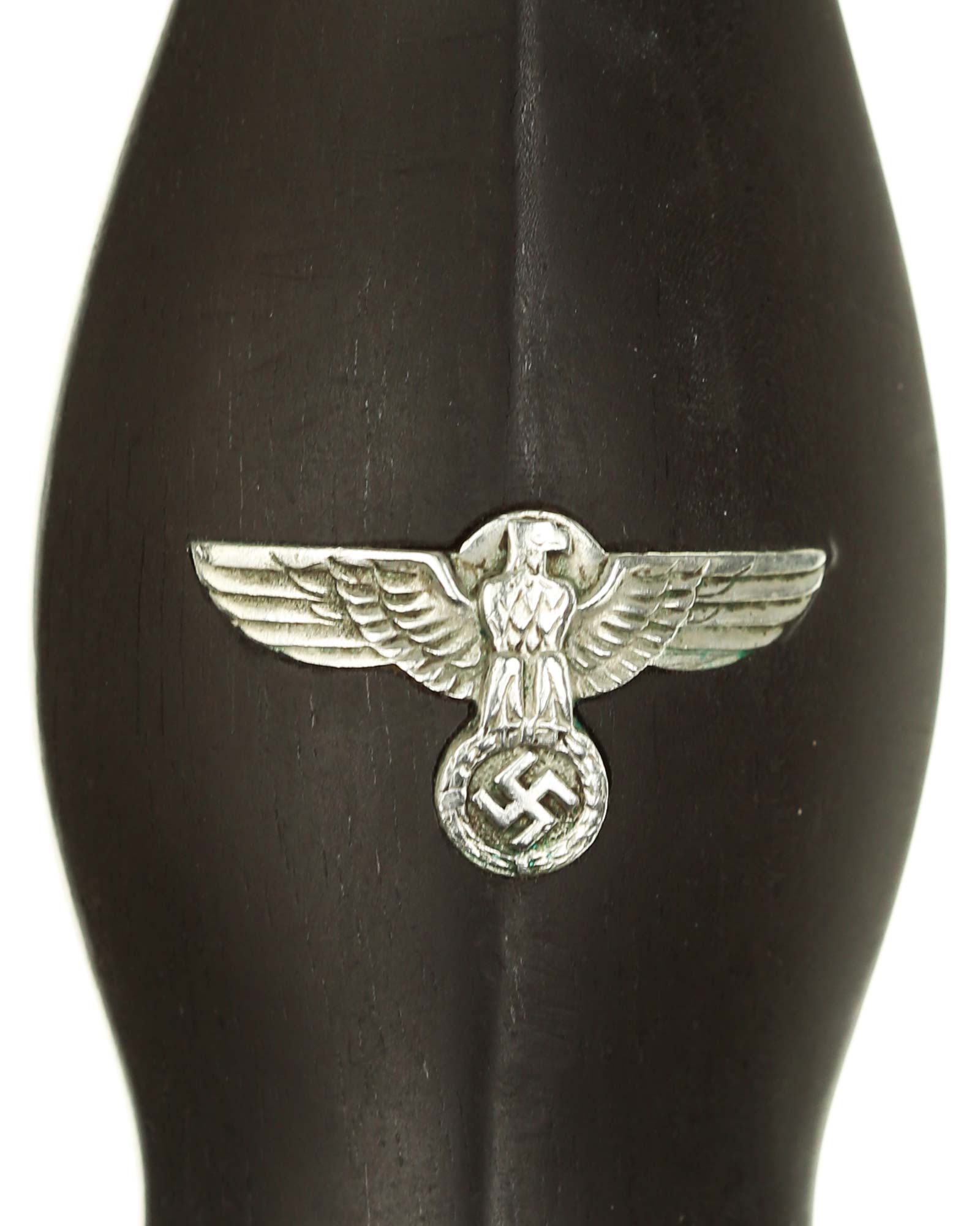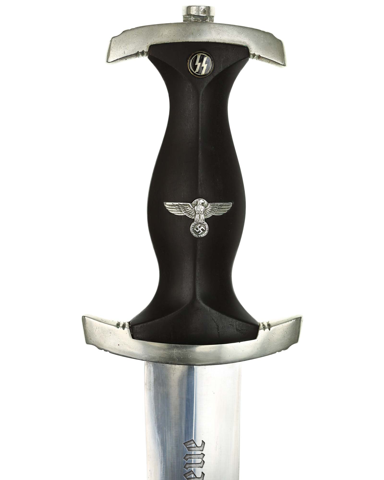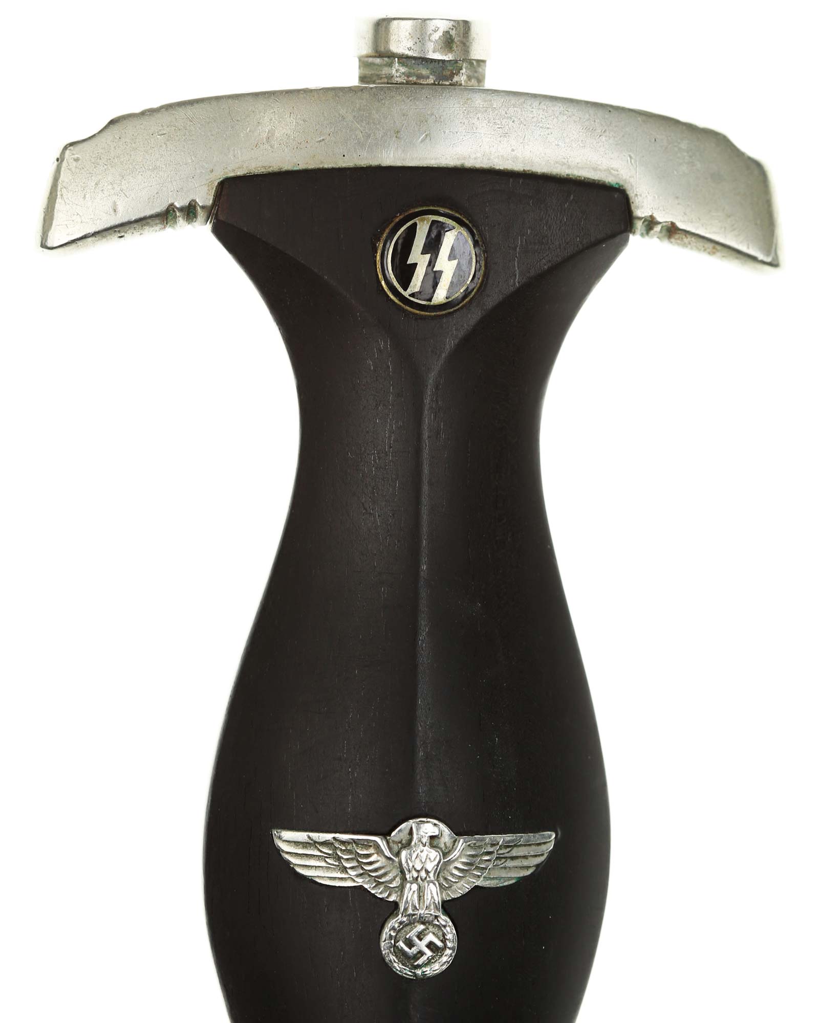 Griff: Der Griff besteht aus schwarzem Ebenholz, auf diesem befinden sich die SS Runen und der Hoheitsadler aus Nickel, diese sind innen geklammert. Die Parierstangen sind aus Neusilber. Die untere Parierstange ist auf der Rückeseite mit römisch "III" versehen.