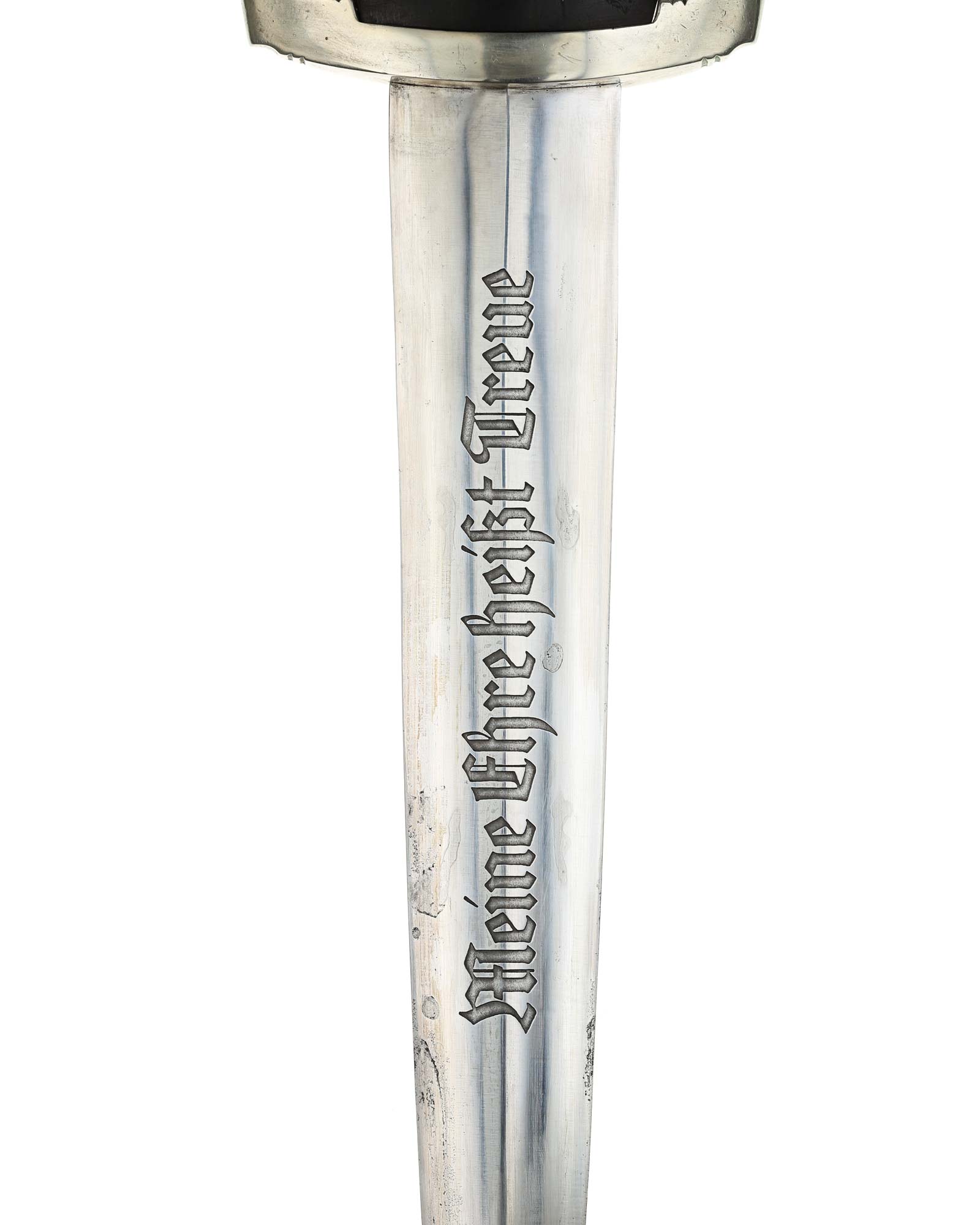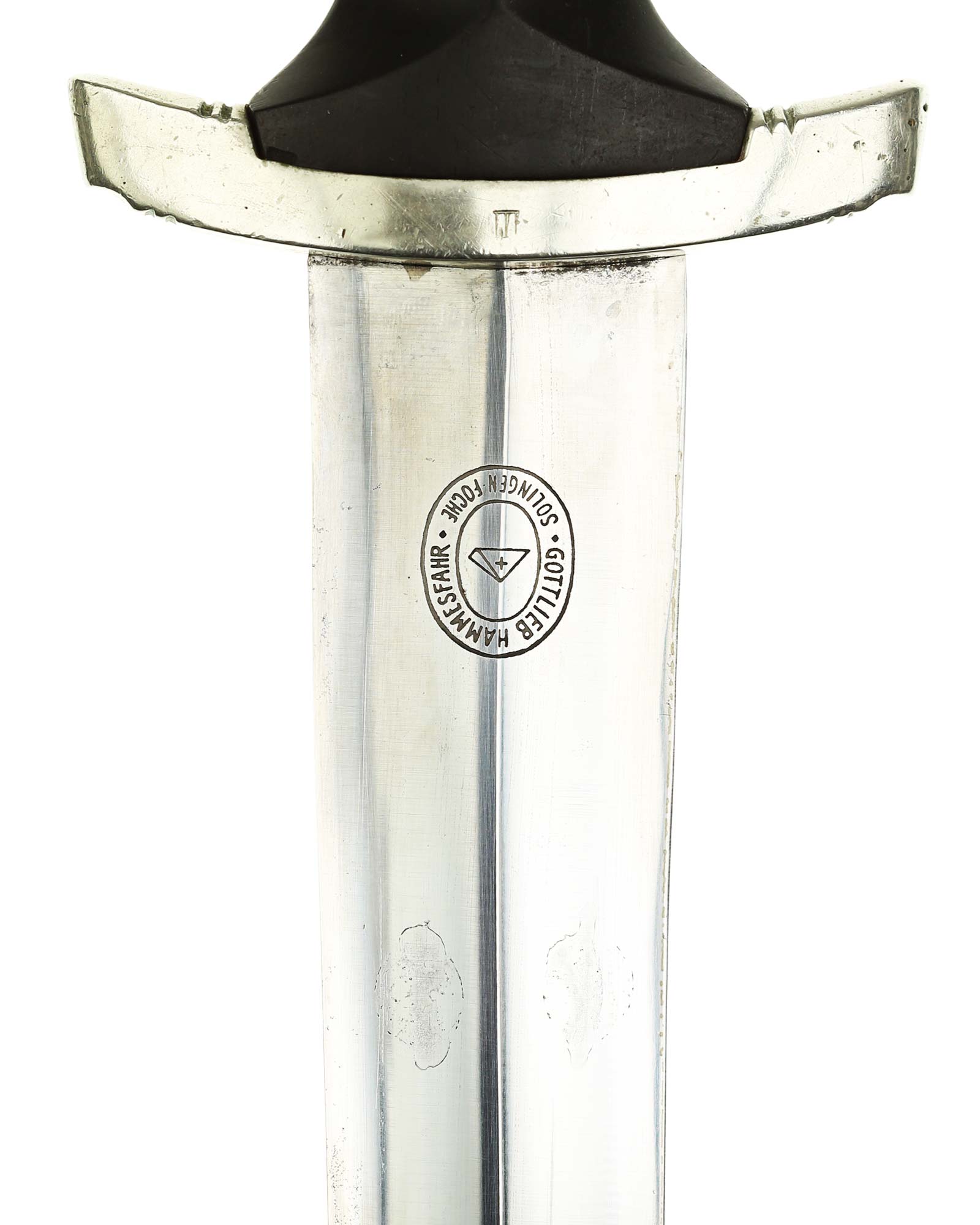 Klinge: Die Klinge ist in einem guten Zustand. Auf der Vorderseite der Klinge befindet sich die SS Devise mit der Inschrift: Meine Ehre heißt Treue, diese ist tief und zackig. Auf der Rückseite befindet sich das Herstellerlogo: Gottlieb Hammesfahr Solingen-Foche. Die Schultern der Klinge passen perfekt auf die untere Parierstange.