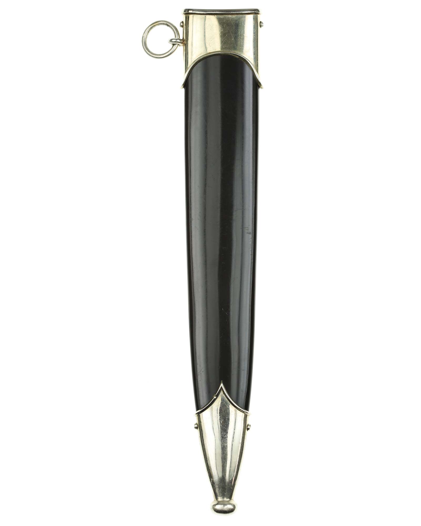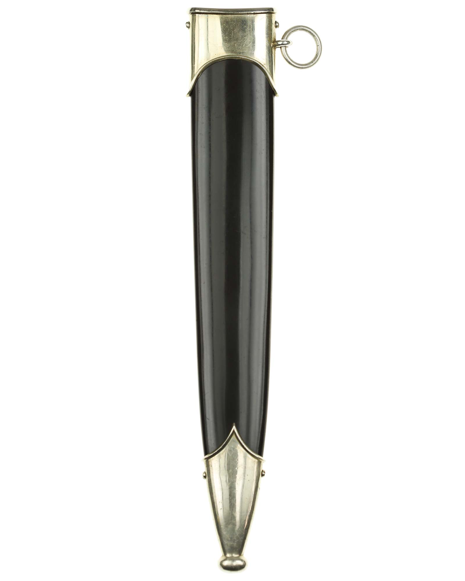 Scheide: Die Scheide ist aus Eisen und mit orig. schwarzer Brünierung. Die beiden Scheidenbeschläge sind aus Neusilber. Die Beschläge werden mit jeweils zwei Schräubchen seitlich gehalten. Am oberen Beschlag befindet sich der Ring für das Tragegehänge.