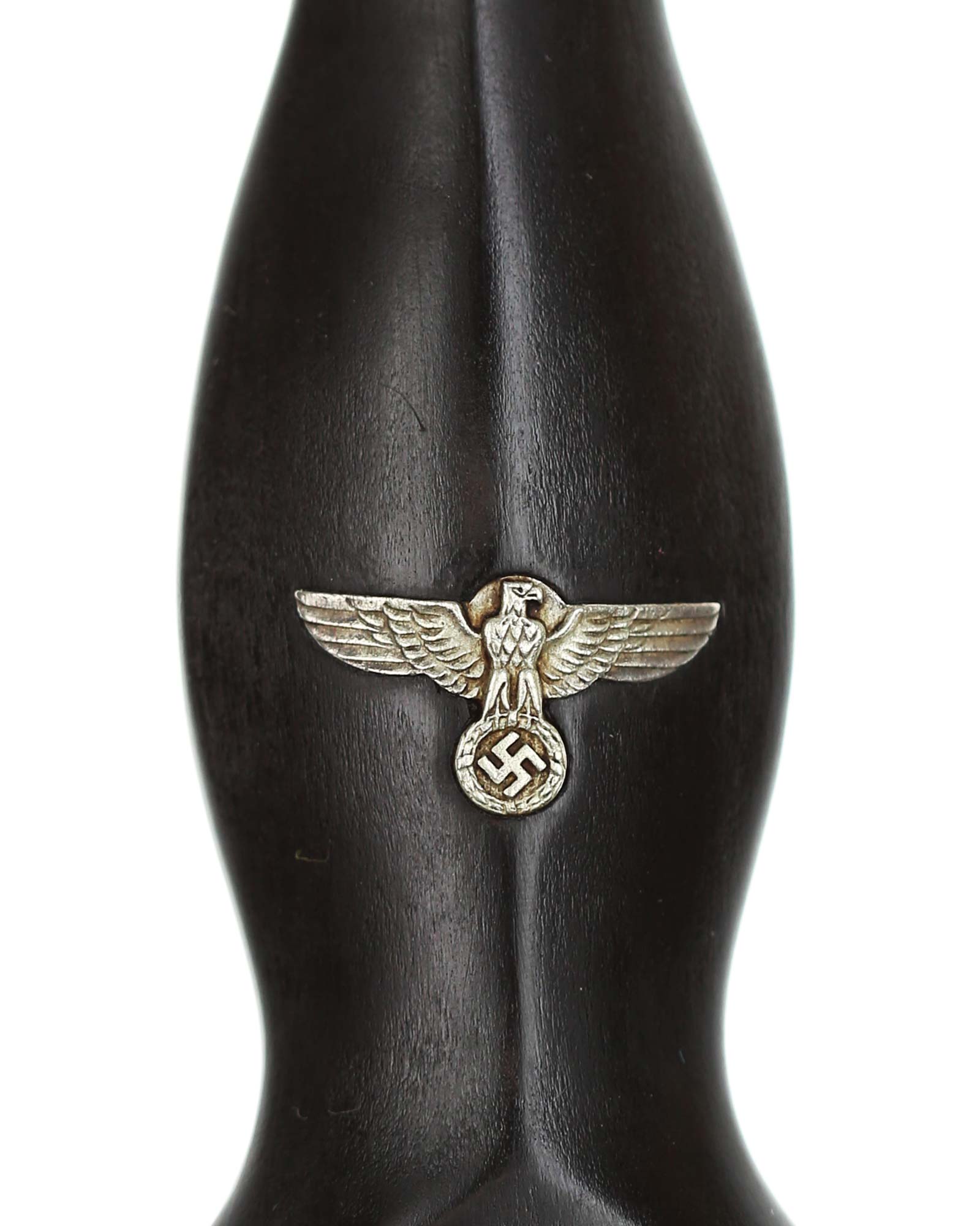 Griff: Der Griff besteht aus Ebenholz, der Hoheitsadler im Griff ist in Nickelausführung, darüber befindet sich das emaillierte SS-Emblem, diese sind innen geklammert. Beide Parierstangen sind aus Neusilber.
