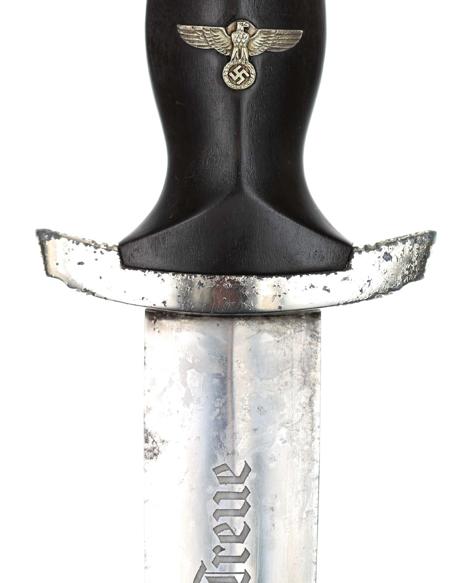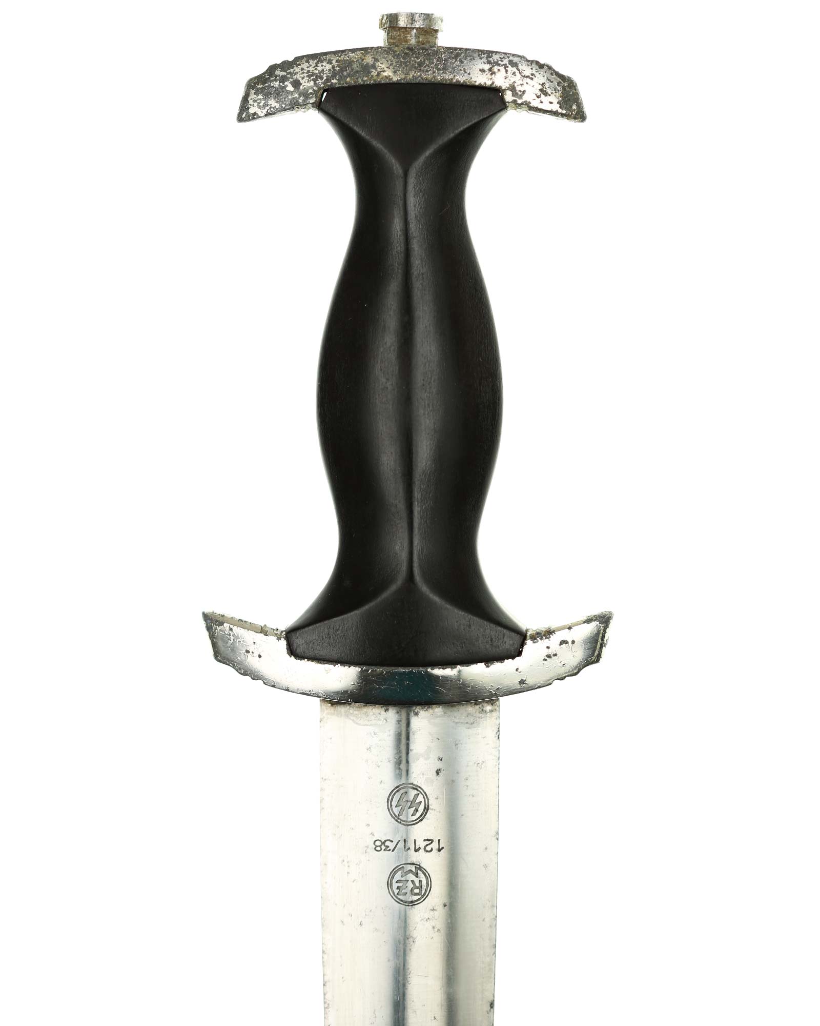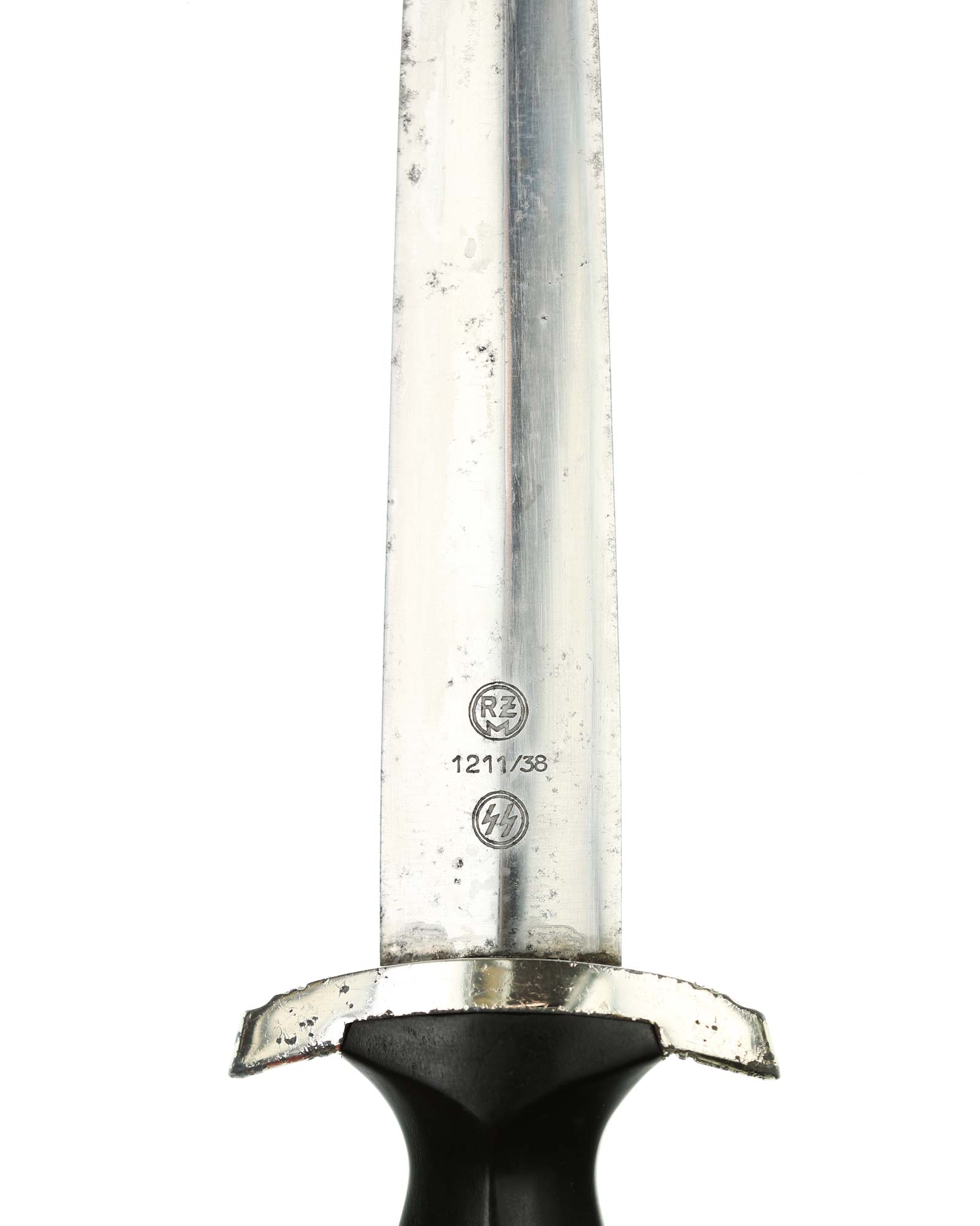 Klinge: Die Klinge ist gut erhalten, auf der Vorderseite der Klinge befindet sich die SS Devise, mit der Inschrift: Meine Ehre heißt Treue, die Rückseite ist blank mit dem RZM Code: RZM 1211/38 SS (Ernst Pack Solingen).