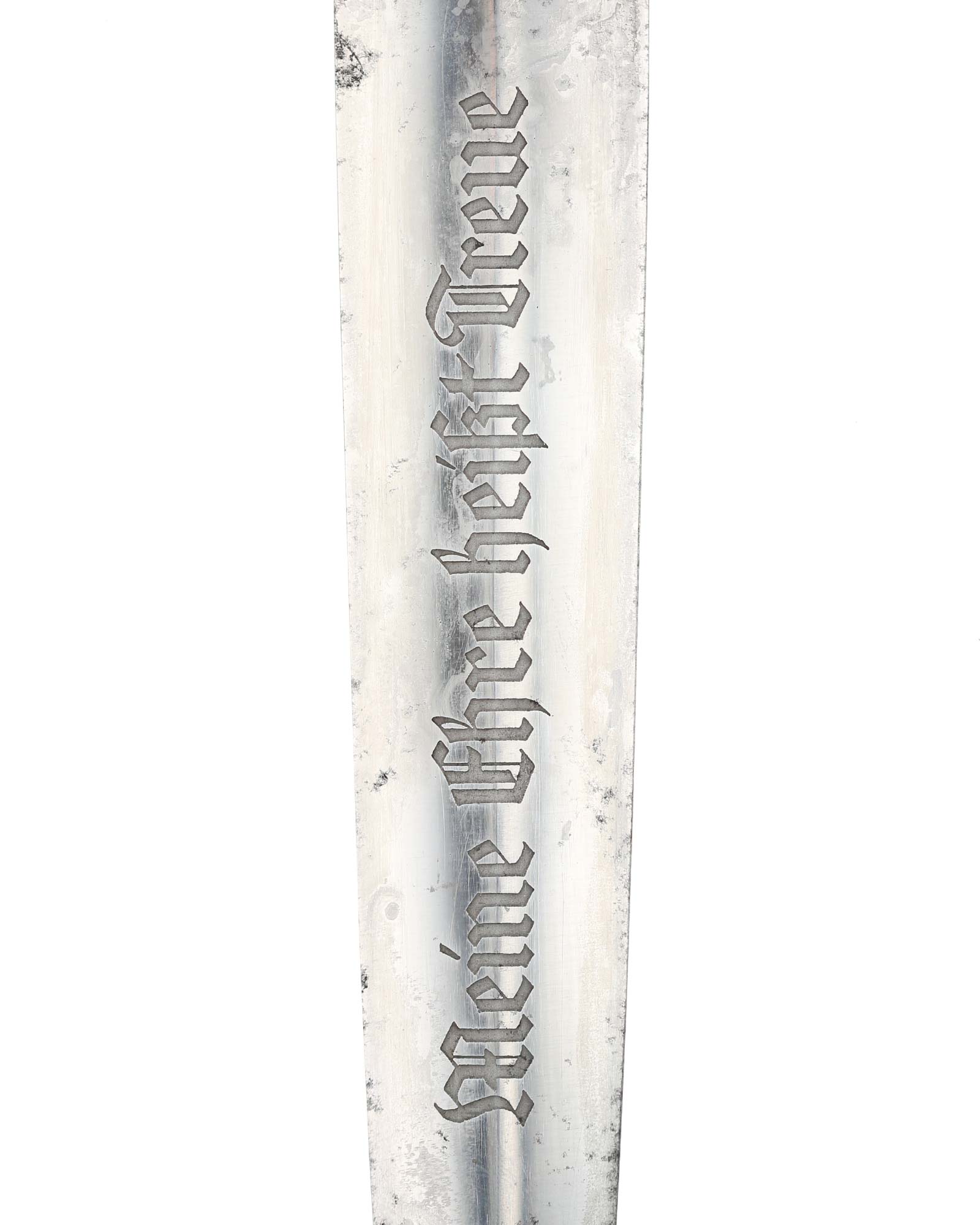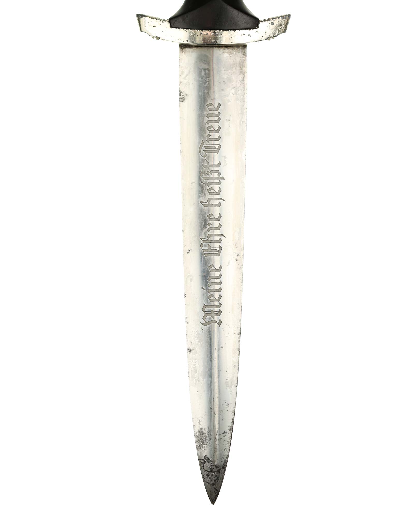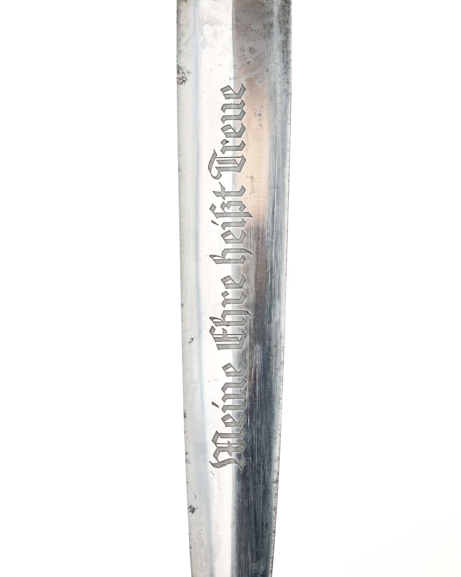 Klinge: Die Klinge ist gut erhalten, auf der Vorderseite der Klinge befindet sich die SS Devise, mit der Inschrift: Meine Ehre heißt Treue, die Rückseite ist blank mit dem RZM Code: RZM 1211/38 SS (Ernst Pack Solingen).