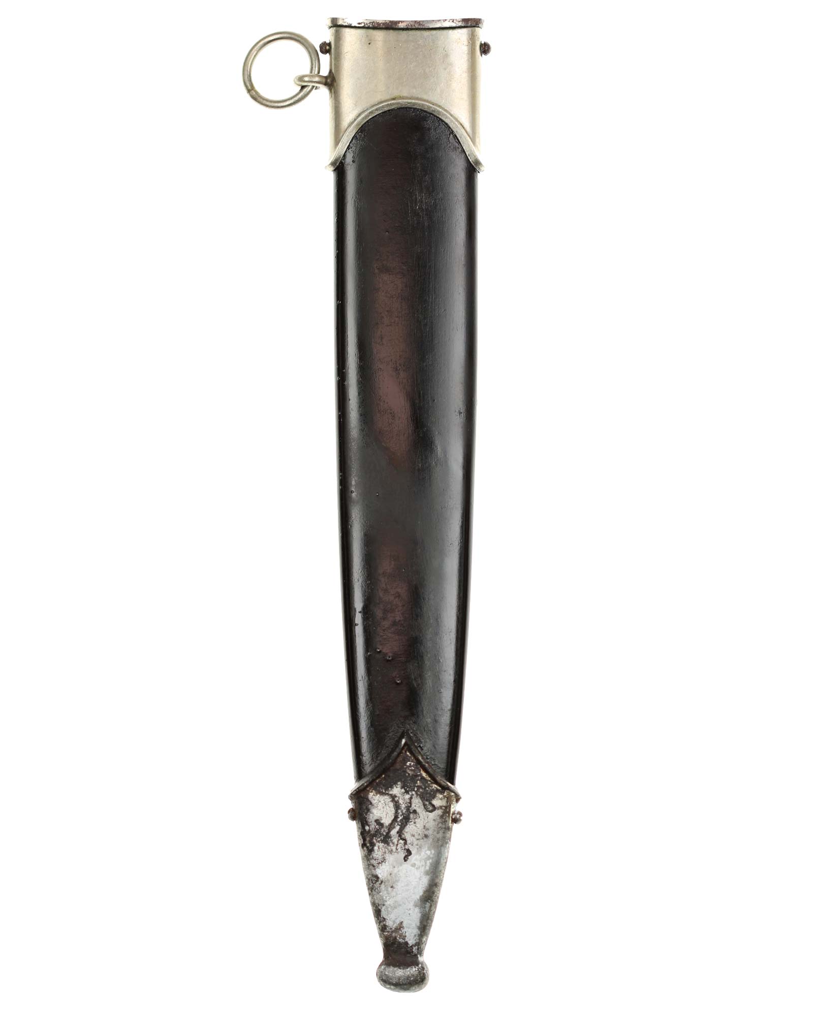 Scheide: Die Scheide ist aus Eisen und mit schwarzer Lackierung. Die beiden Scheidenbeschläge sind aus vernickeltem Stahlblech. Die Beschläge werden mit jeweils zwei Schräubchen seitlich gehalten.