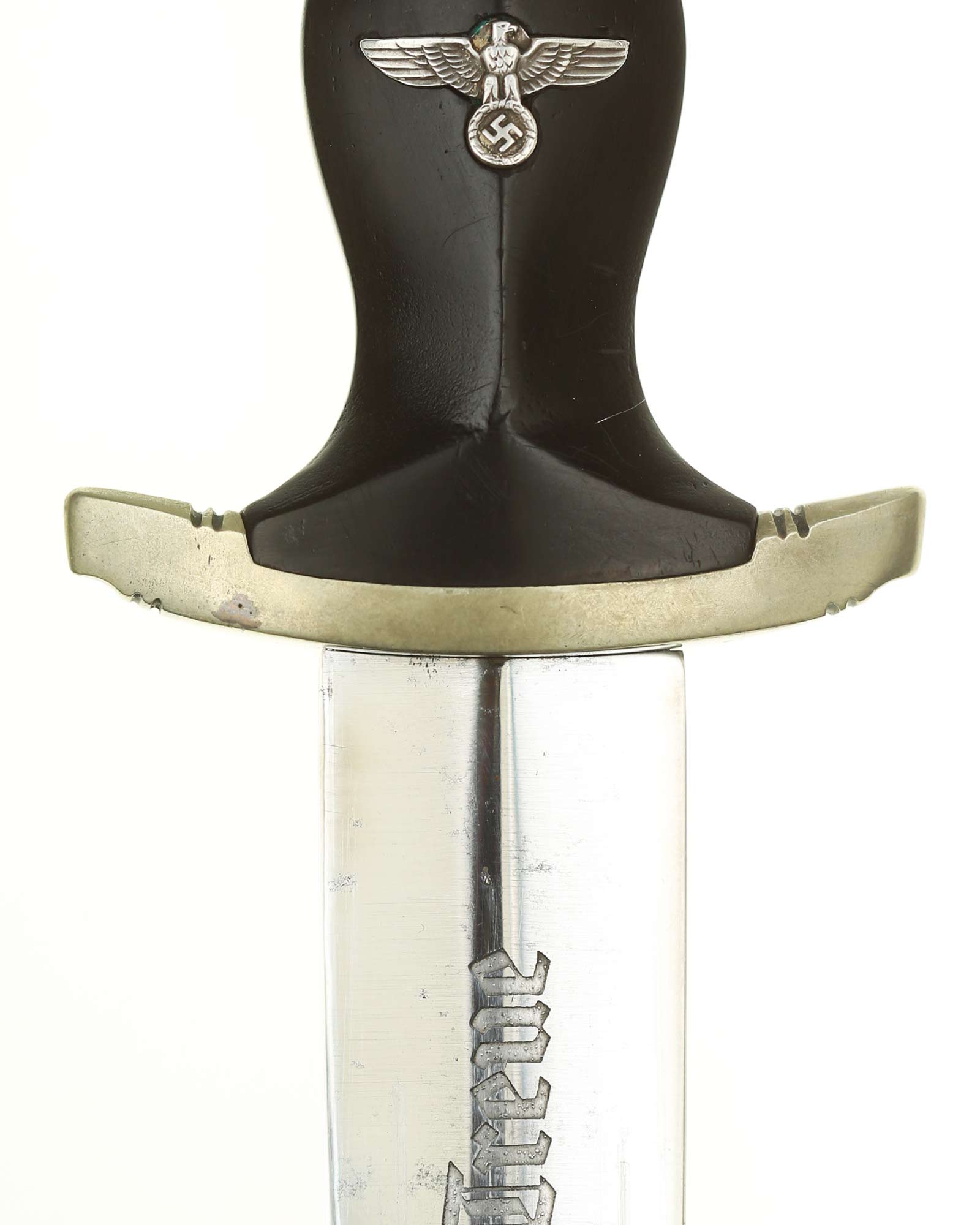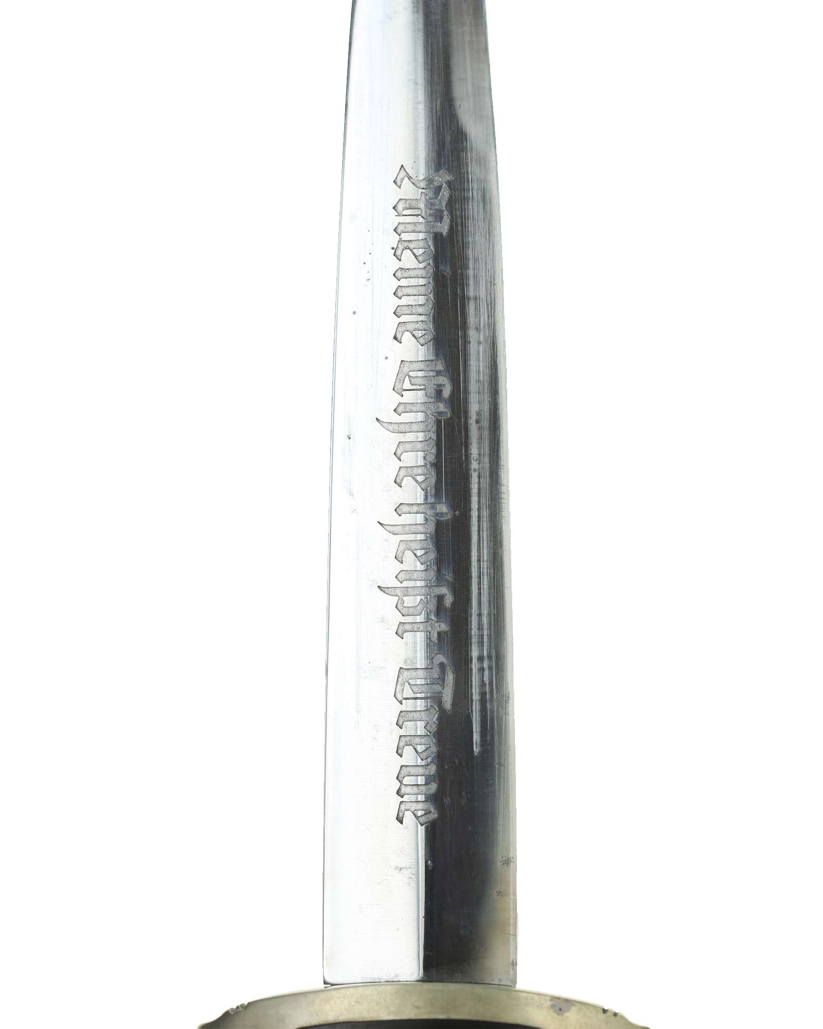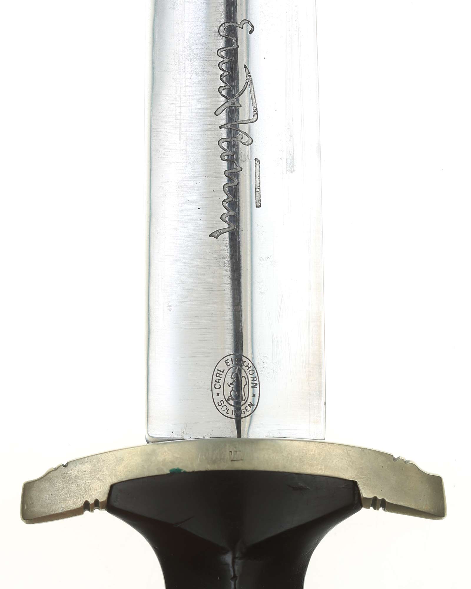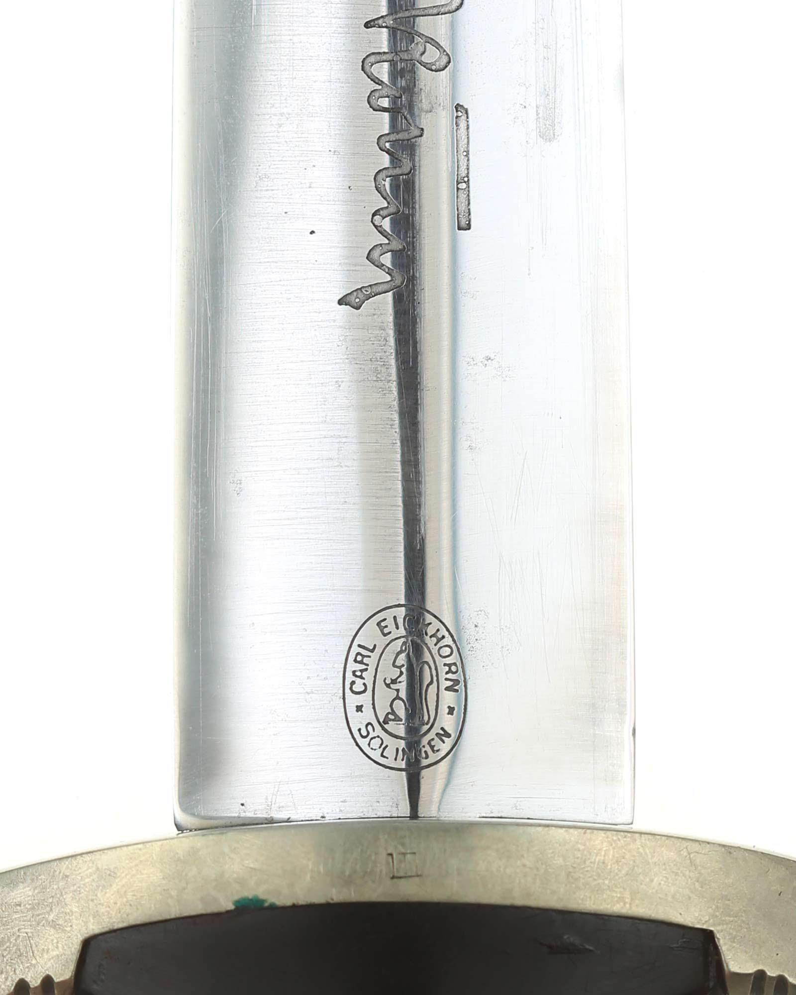 Klinge: Die Klinge ist blank und ohne Rost. Auf der Vorderseite der Klinge befindet sich die SS Devise, mit der Inschrift: Meine Ehre heißt Treue, die Rückseite ist mit kompletter Inschrift: „In herzlicher Kameradschaft Ernst Röhm“. Unten befindet sich das Herstellerlogo: Carl Eickhorn, Solingen. Klinge beidseitig mit leichten Schleifspuren von der Scheide.