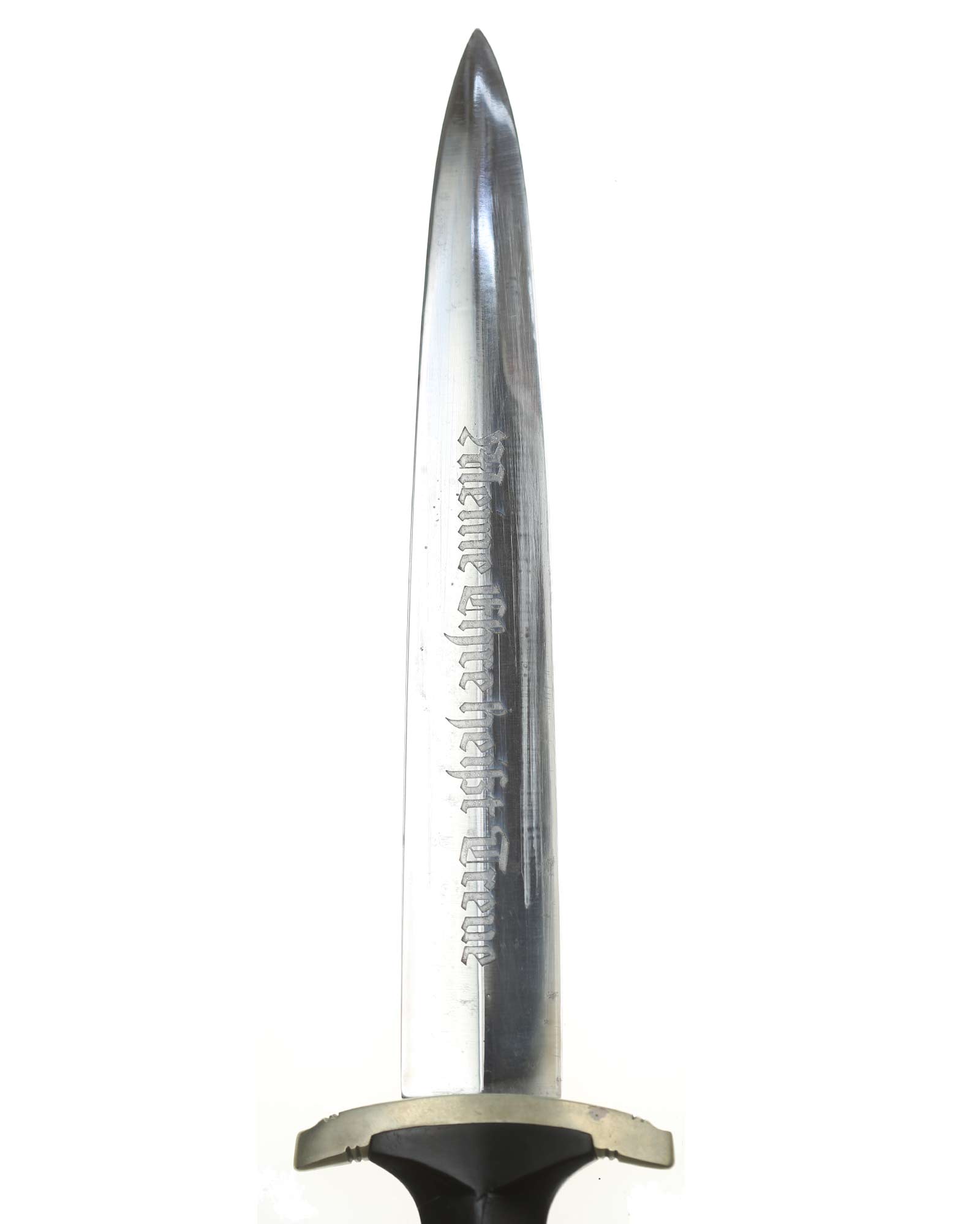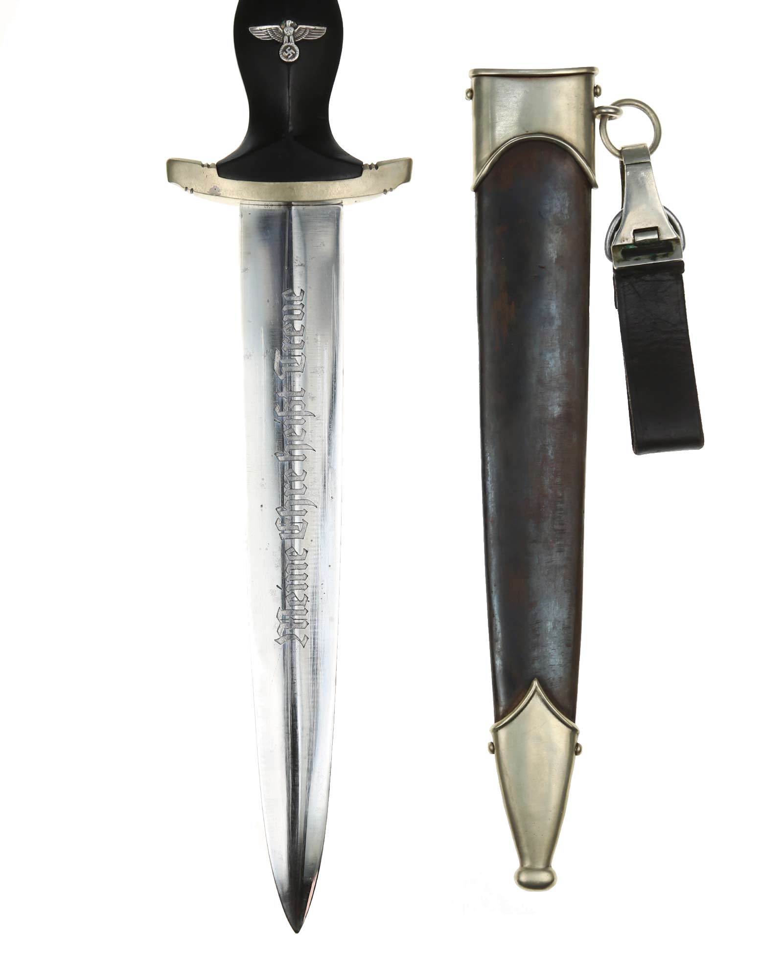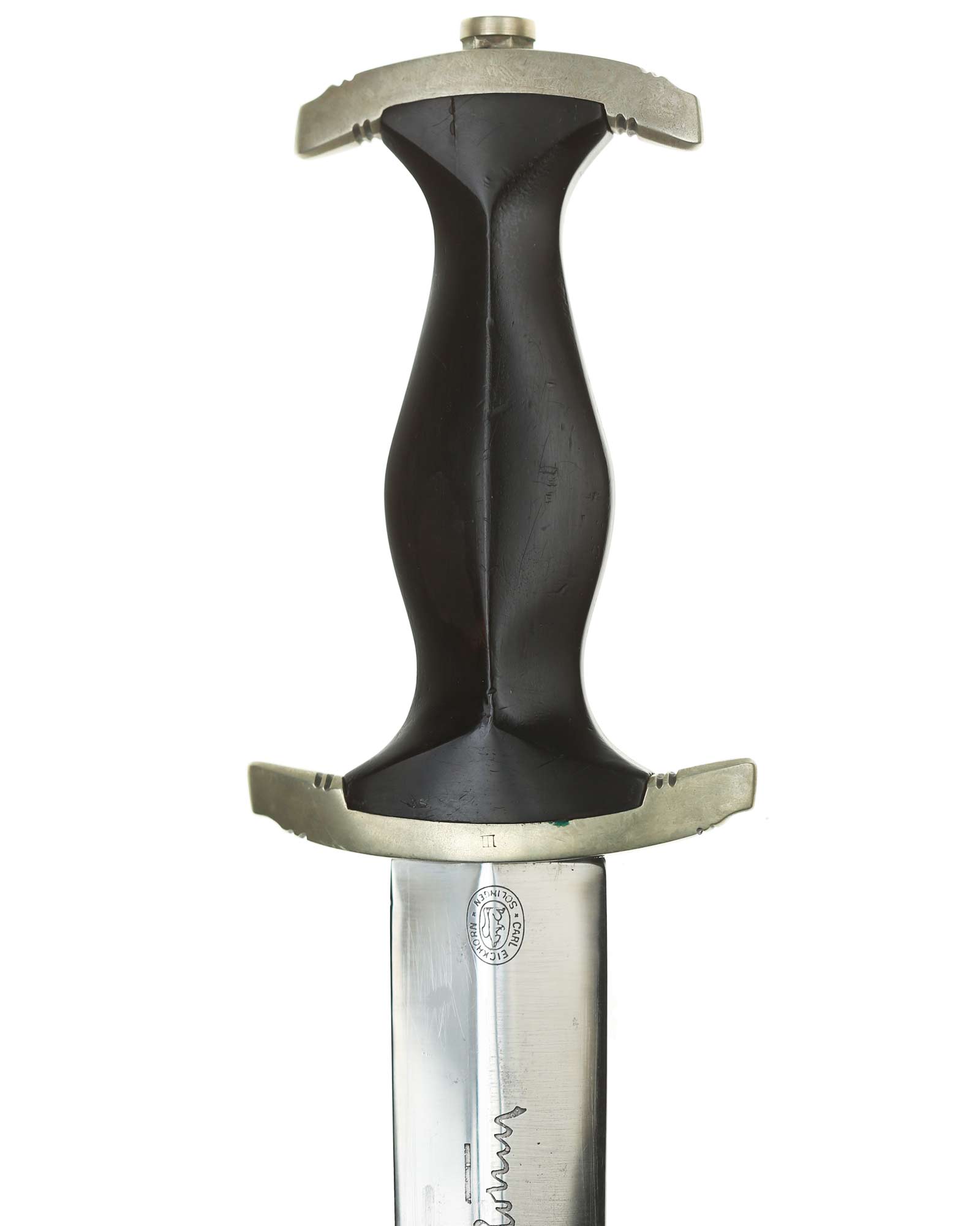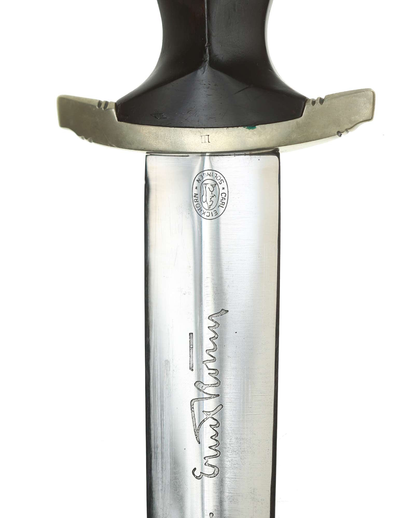 Klinge: Die Klinge ist blank und ohne Rost. Auf der Vorderseite der Klinge befindet sich die SS Devise, mit der Inschrift: Meine Ehre heißt Treue, die Rückseite ist mit kompletter Inschrift: „In herzlicher Kameradschaft Ernst Röhm“. Unten befindet sich das Herstellerlogo: Carl Eickhorn, Solingen. Klinge beidseitig mit leichten Schleifspuren von der Scheide.