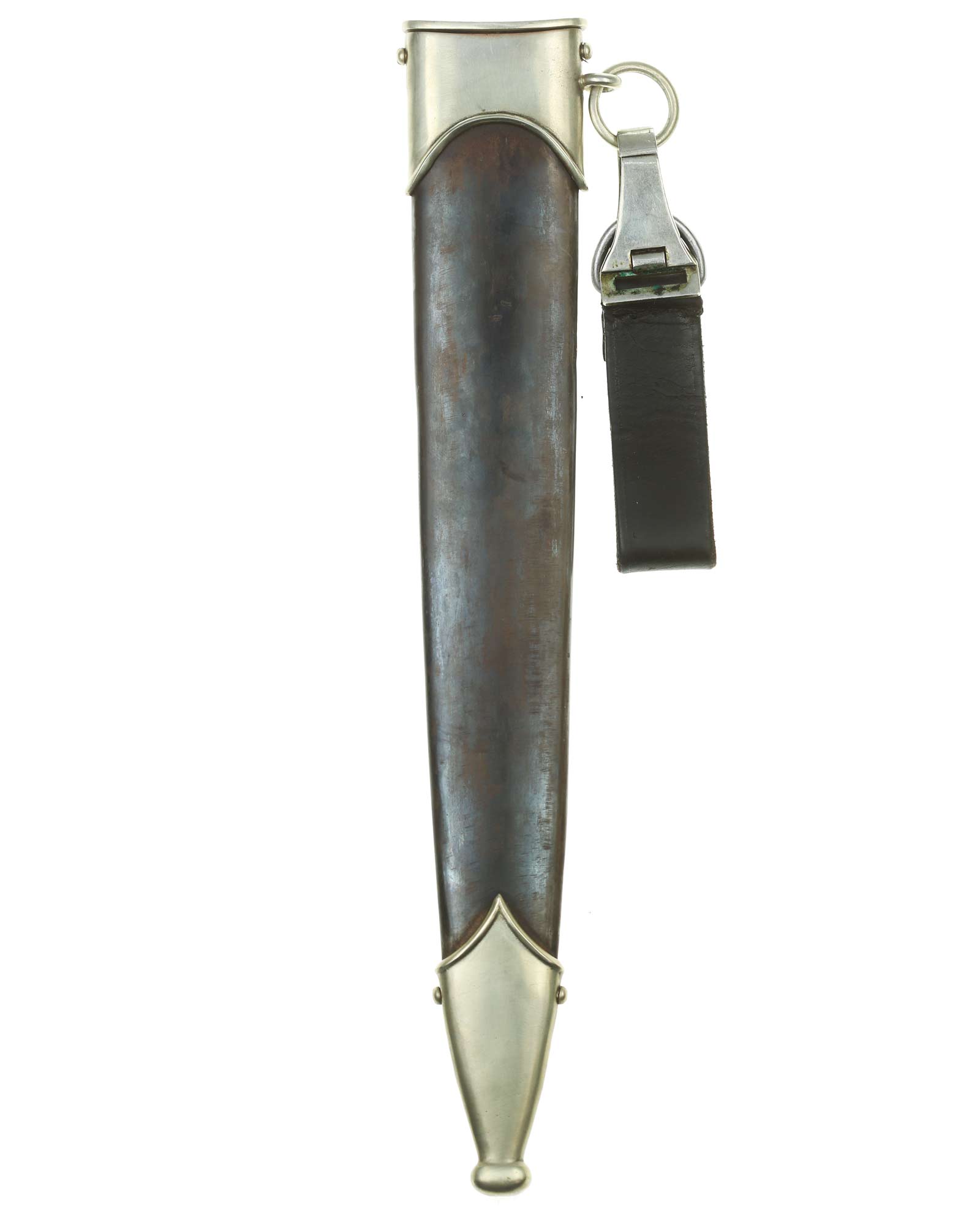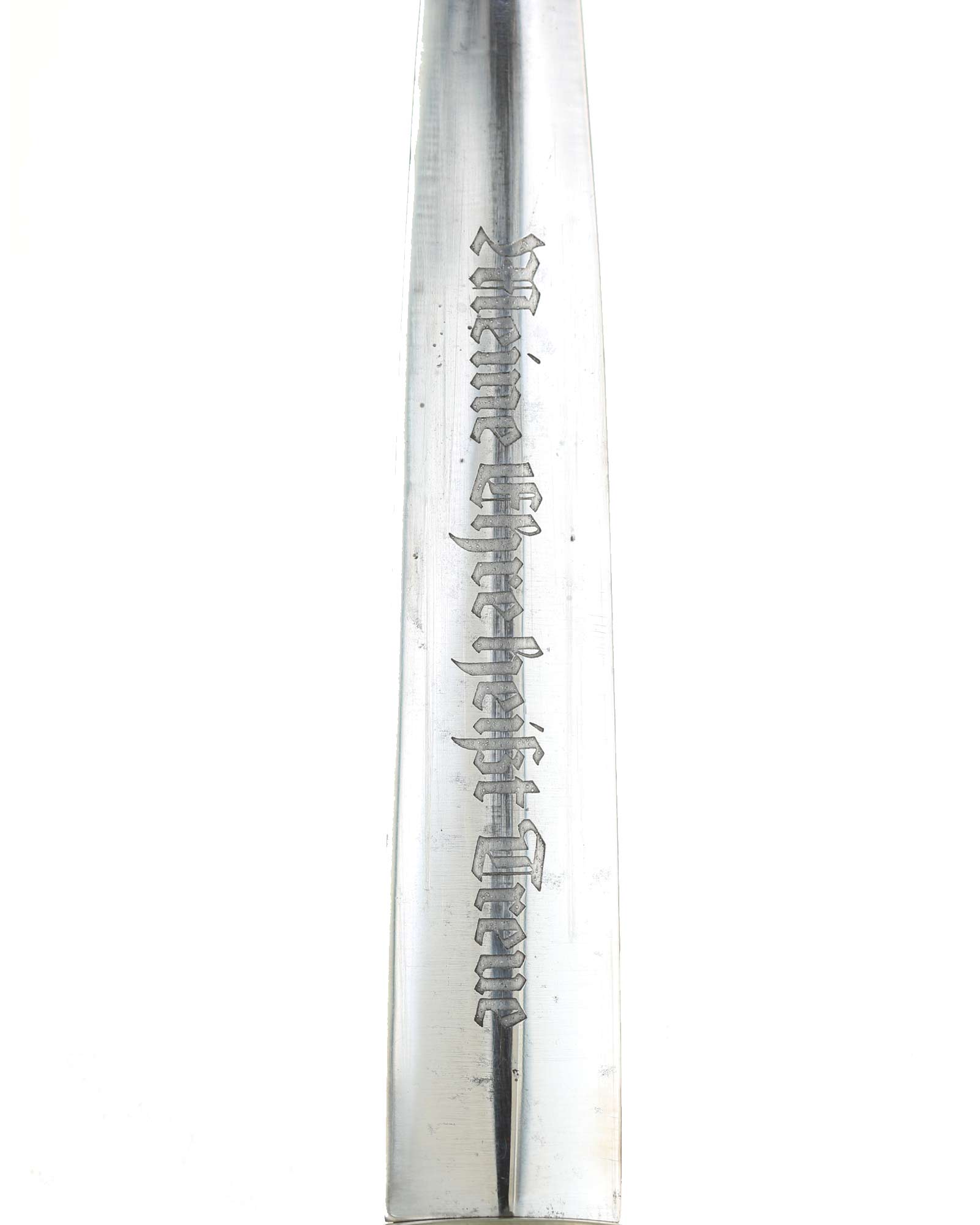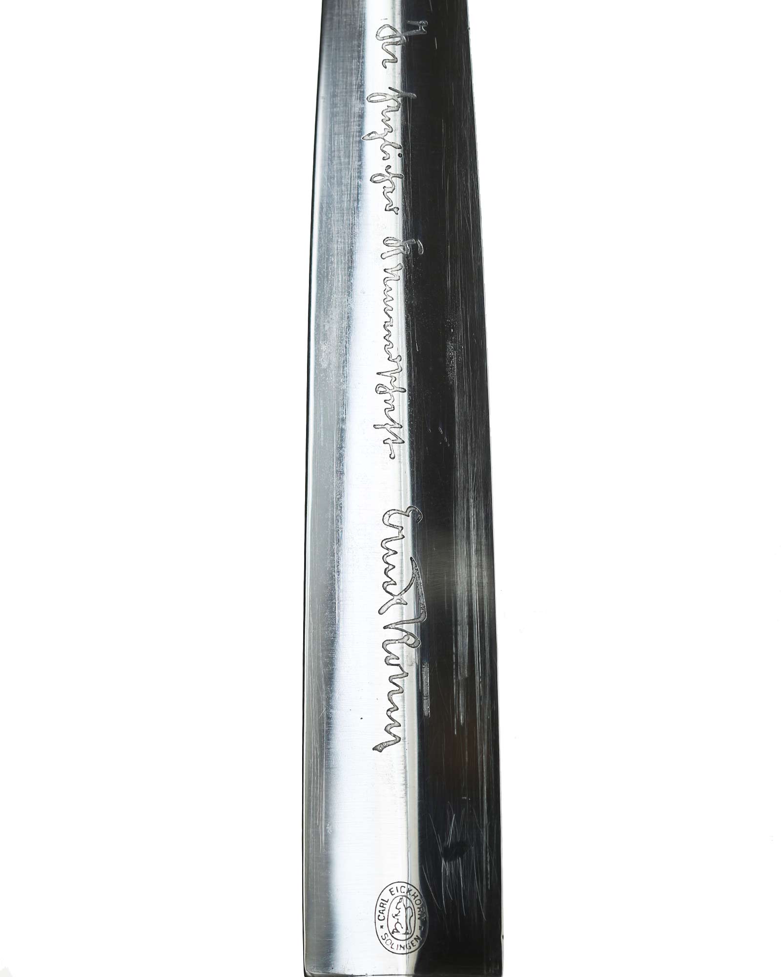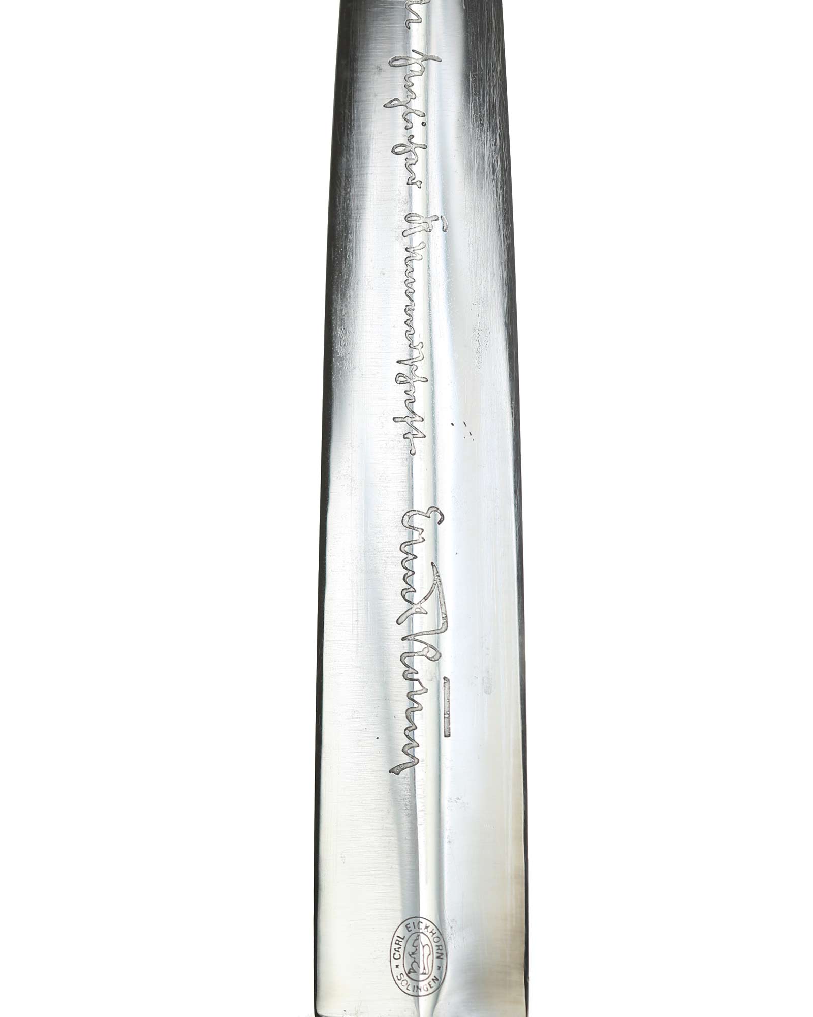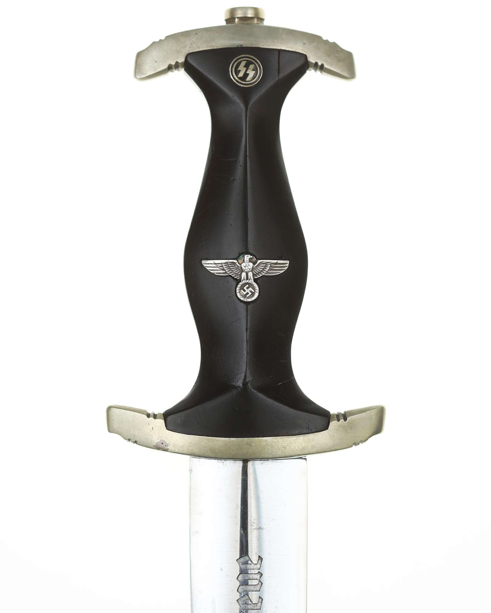 Klinge: Die Klinge ist blank und ohne Rost. Auf der Vorderseite der Klinge befindet sich die SS Devise, mit der Inschrift: Meine Ehre heißt Treue, die Rückseite ist mit kompletter Inschrift: „In herzlicher Kameradschaft Ernst Röhm“. Unten befindet sich das Herstellerlogo: Carl Eickhorn, Solingen. Klinge beidseitig mit leichten Schleifspuren von der Scheide.