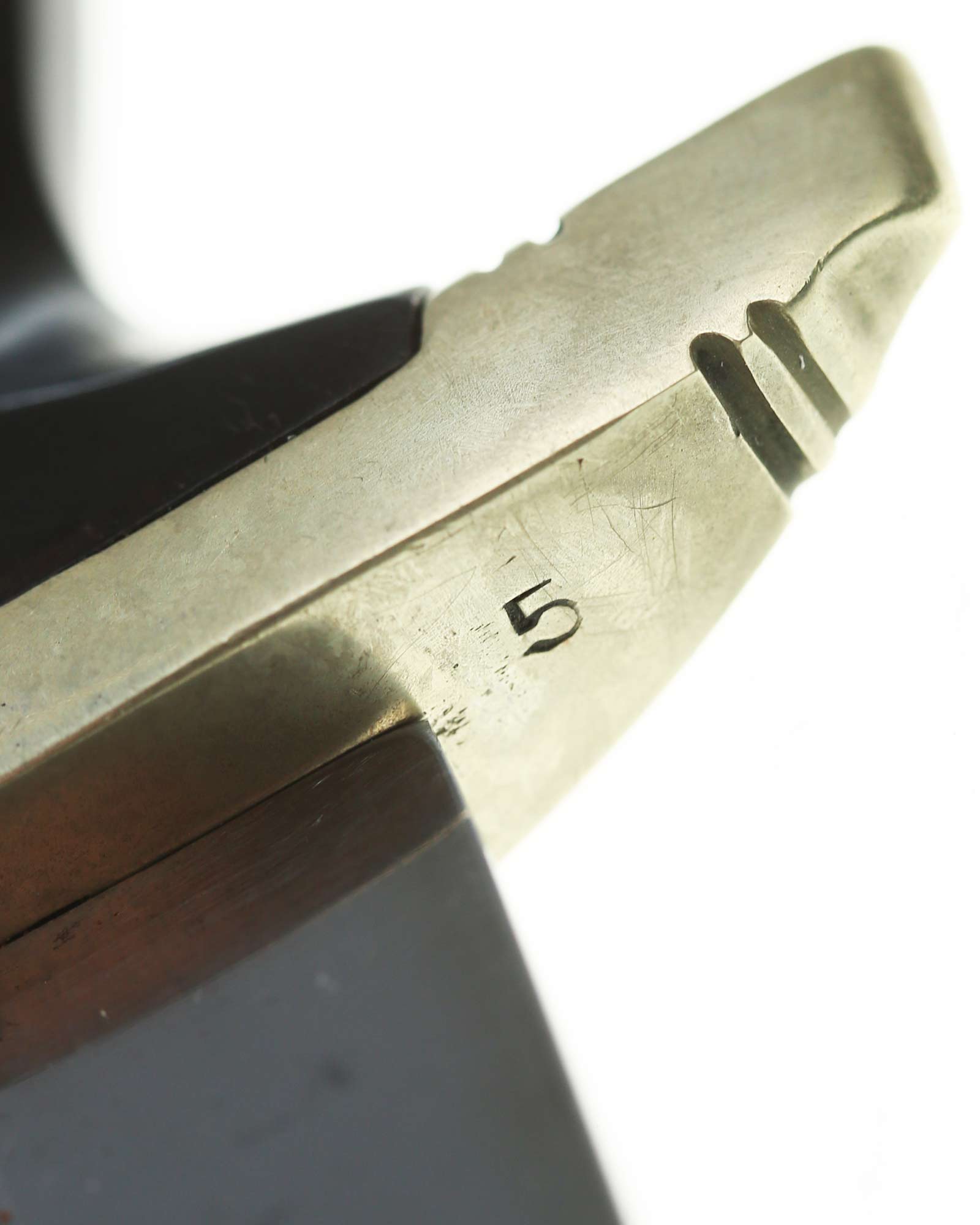 Scheide: Die Scheide ist aus Eisen und mit Brünierung. Diese hat keine Beulen oder Dellen. Die beiden Scheidenbeschläge sind aus vernickeltem Stahlblech. Die Beschläge werden mit jeweils zwei Schräubchen seitlich gehalten. Am oberen Beschlag befindet sich der Ring für das Tragegehänge.