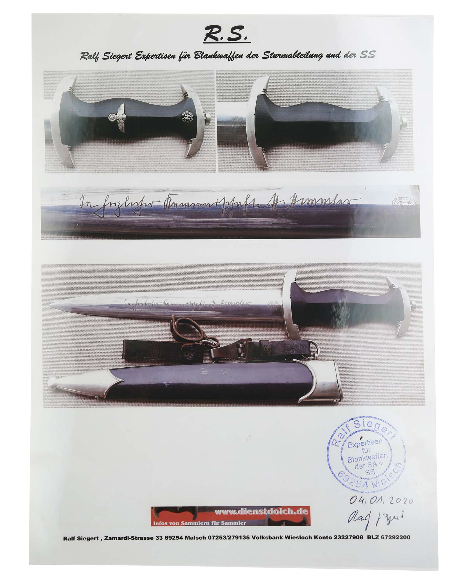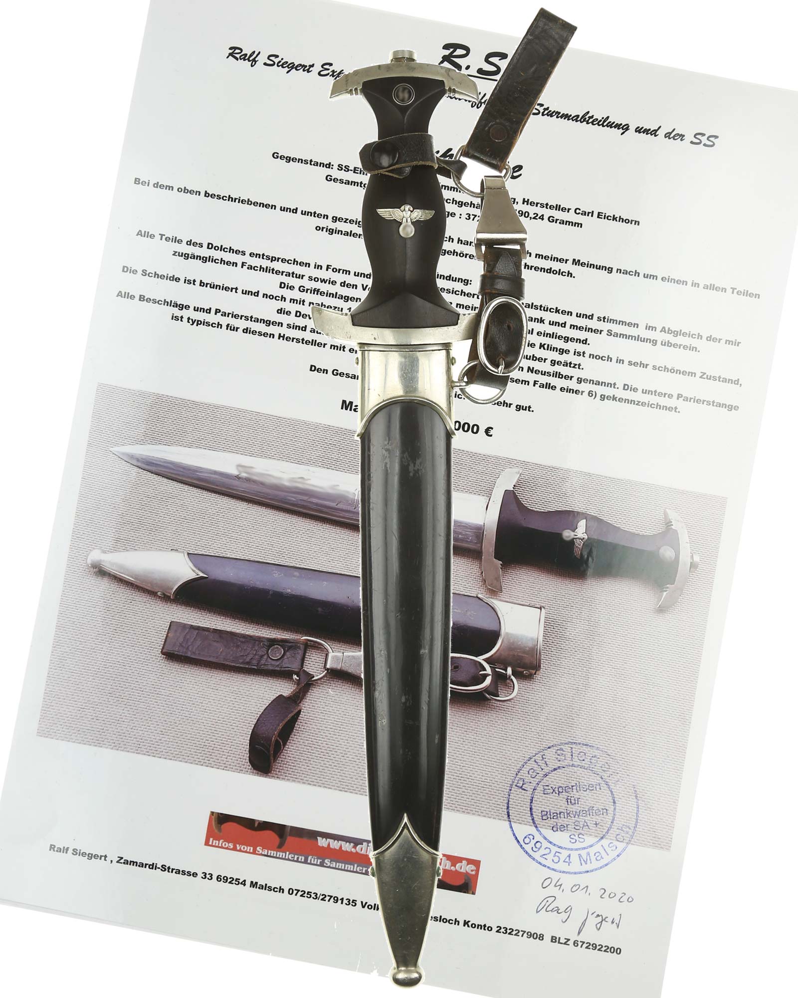 Ehrendolch der Schutzstaffel [SS] in früher Fertigung 1933-1935. Der SS Dolch ist mit kompletter Himmler Widmung. Der Hersteller auf der Klinge ist Carl Eickhorn in Solingen. SS Himmlerdolch mit Expertise von Ralf Siegert.