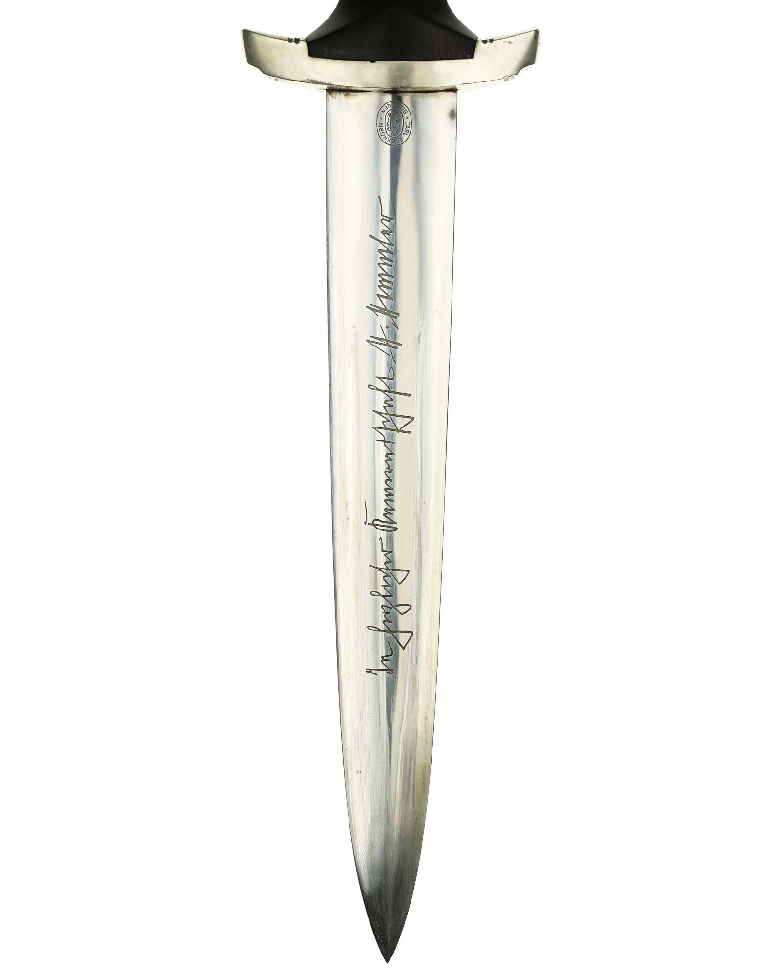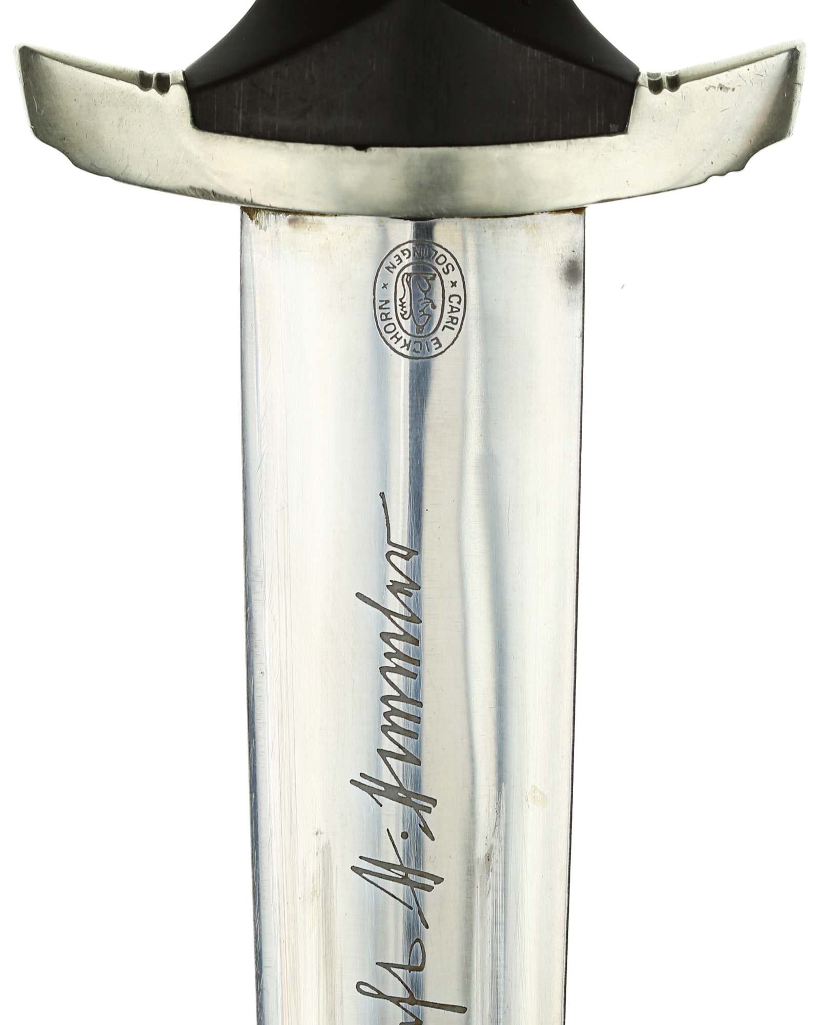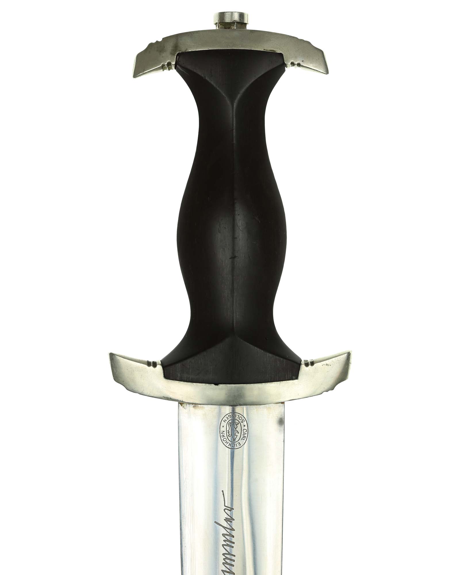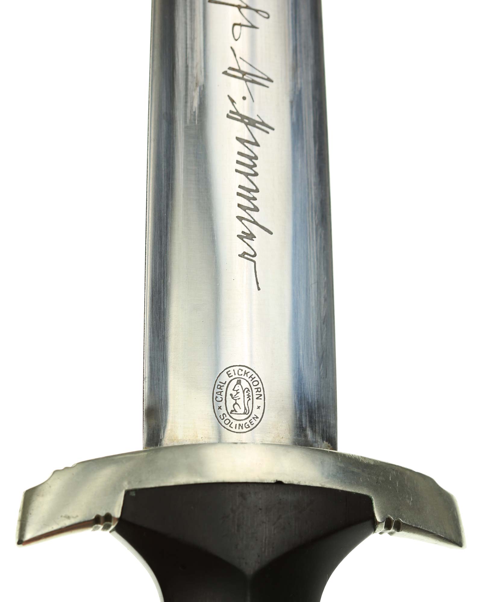 Klinge: Die Klinge ist ohne Rost. Auf der Vorderseite der Klinge befindet sich die SS Devise, diese ist dunkel und zackig, mit der Inschrift: Meine Ehre heißt Treue, die Rückseite ist mit kompletter Himmler-Inschrift: „In herzlicher Kameradschaft H. Himmler“. Unten befindet sich das Herstellerlogo: Carl Eickhorn, Solingen. Klinge beidseitig mit leichten Schleifspuren von der Scheide. Die Schultern der Klinge passen perfekt auf die untere Parierstange.