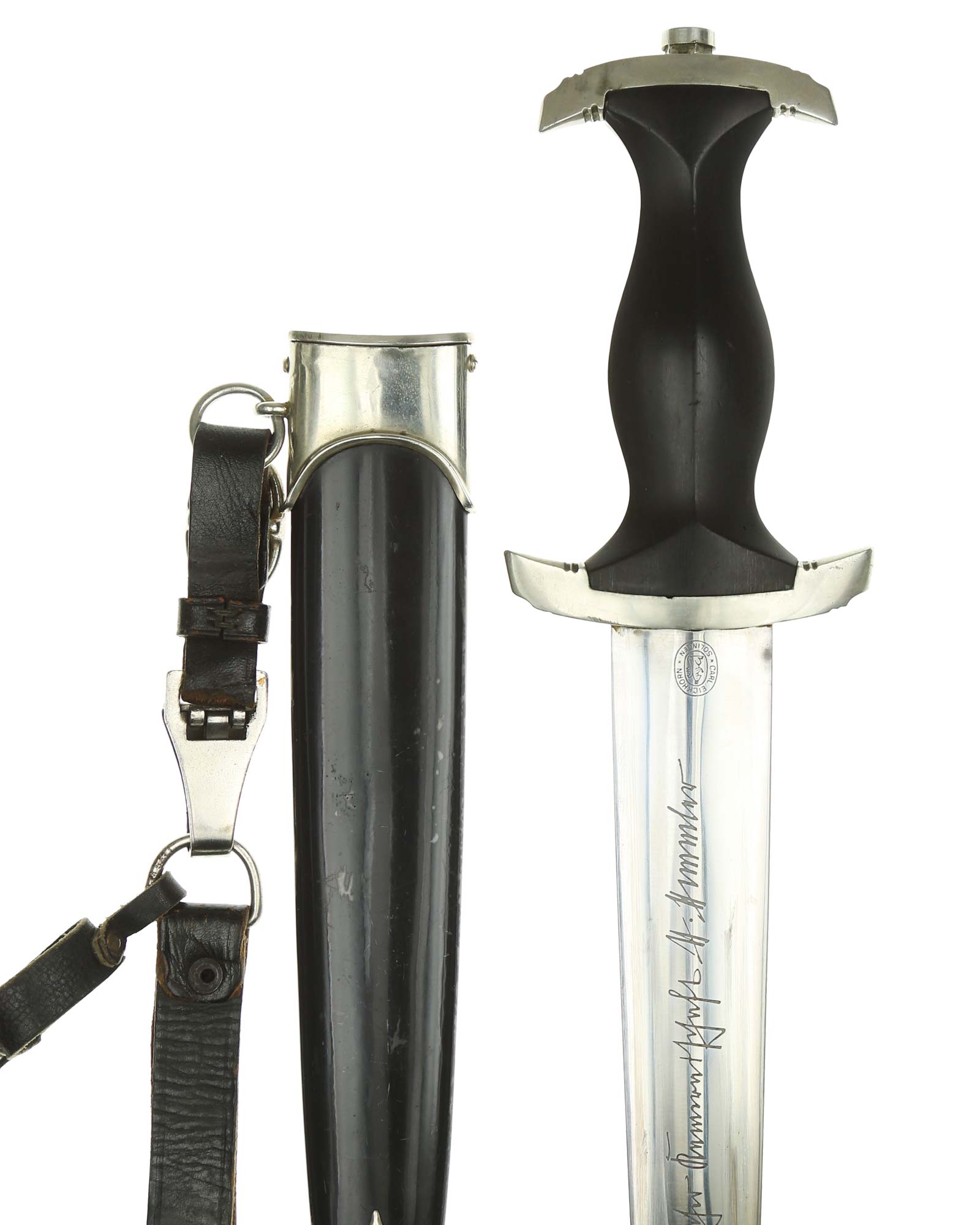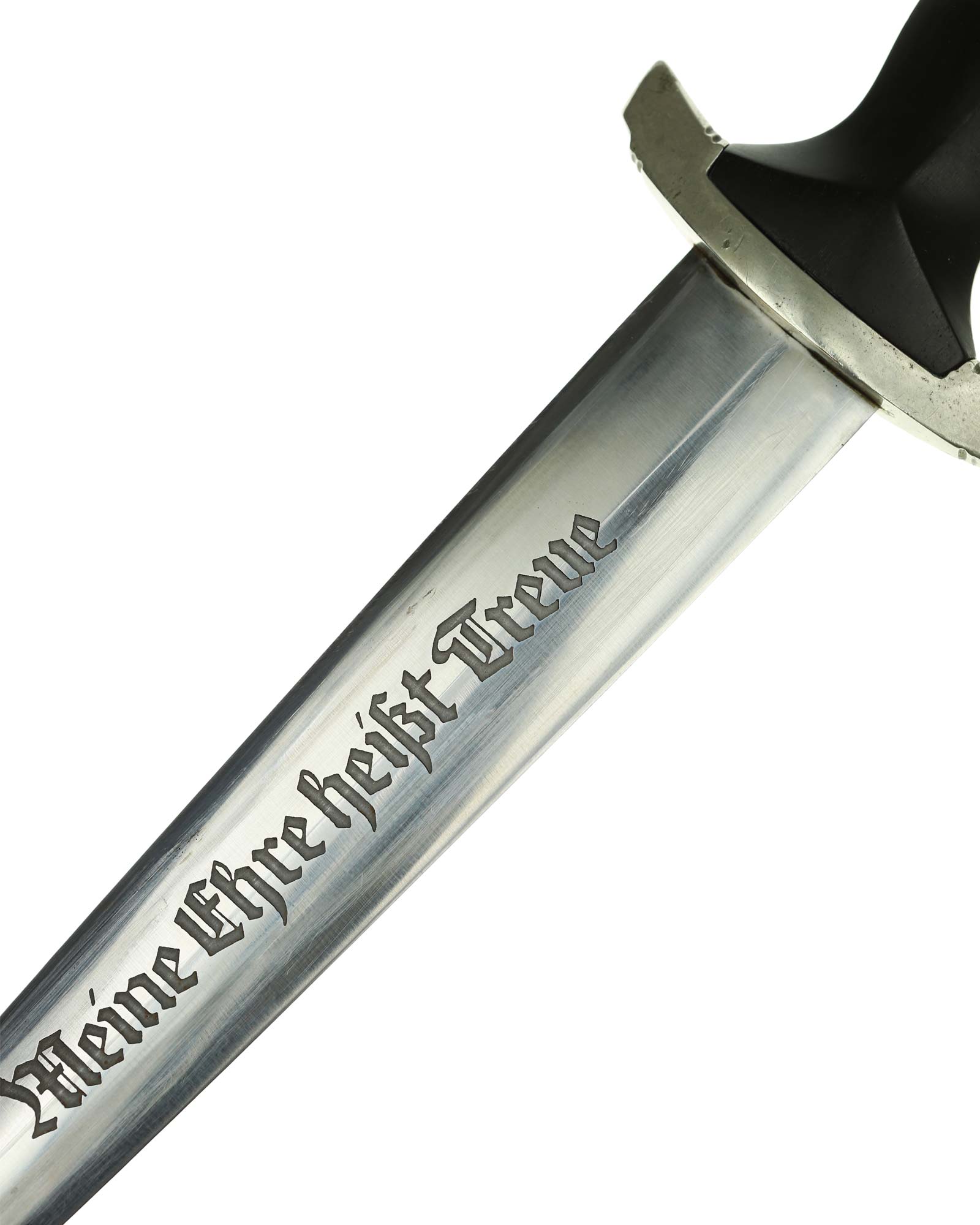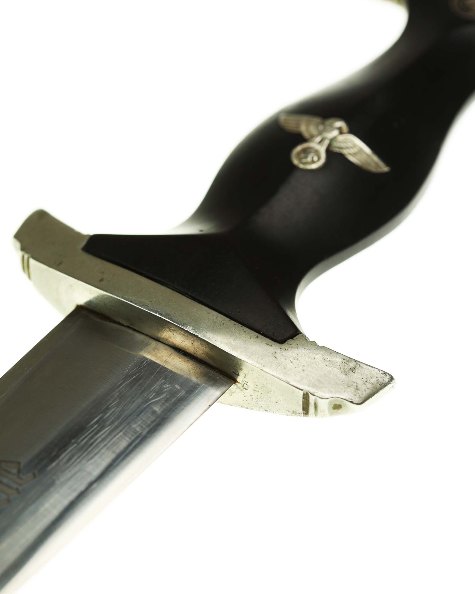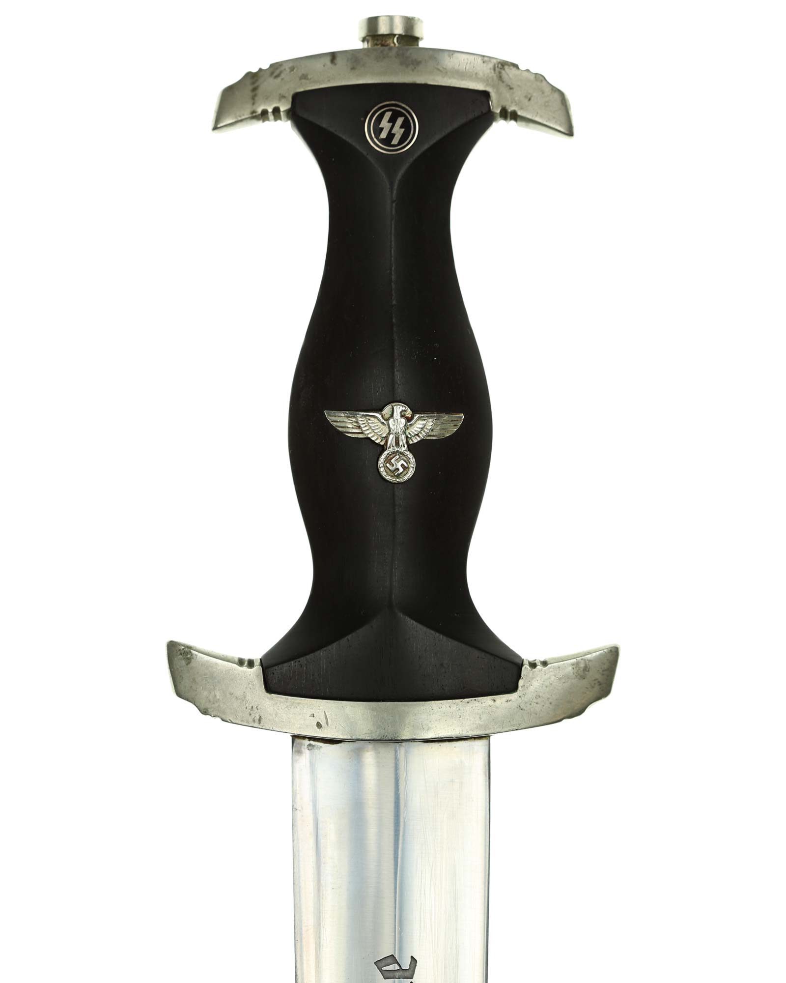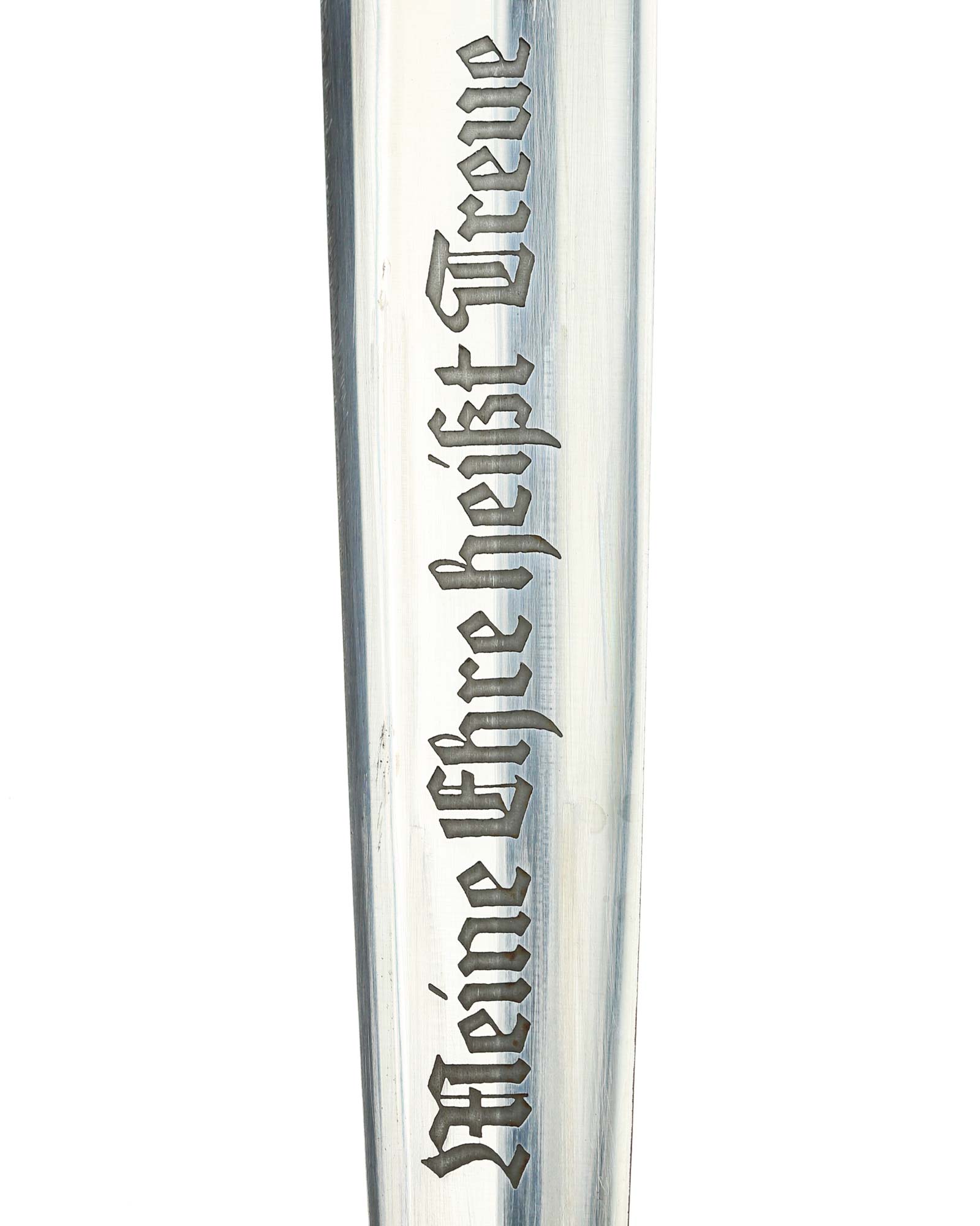 Klinge: Die Klinge ist ohne Rost. Auf der Vorderseite der Klinge befindet sich die SS Devise, diese ist dunkel und zackig, mit der Inschrift: Meine Ehre heißt Treue, die Rückseite ist mit kompletter Himmler-Inschrift: „In herzlicher Kameradschaft H. Himmler“. Unten befindet sich das Herstellerlogo: Carl Eickhorn, Solingen. Klinge beidseitig mit leichten Schleifspuren von der Scheide. Die Schultern der Klinge passen perfekt auf die untere Parierstange.