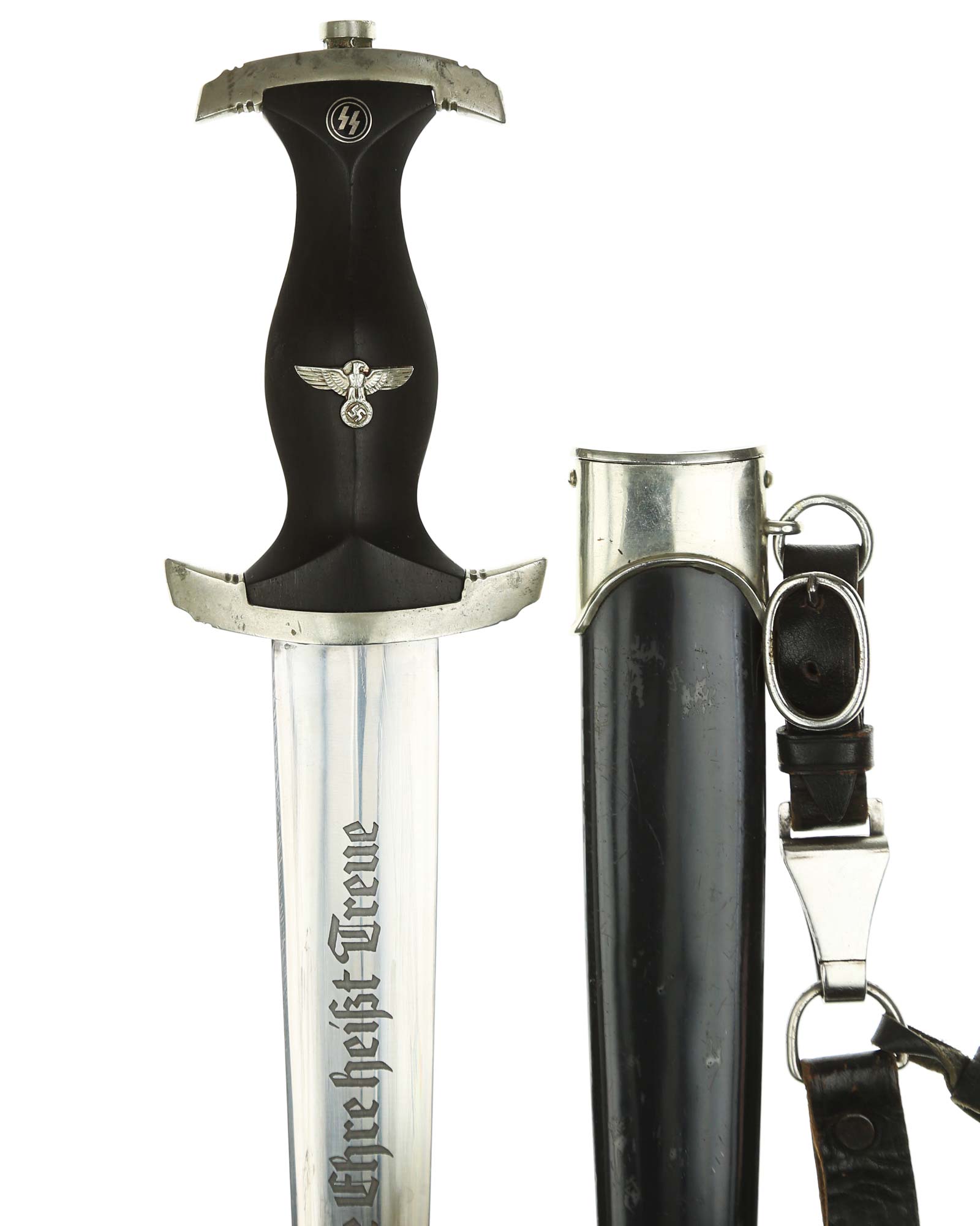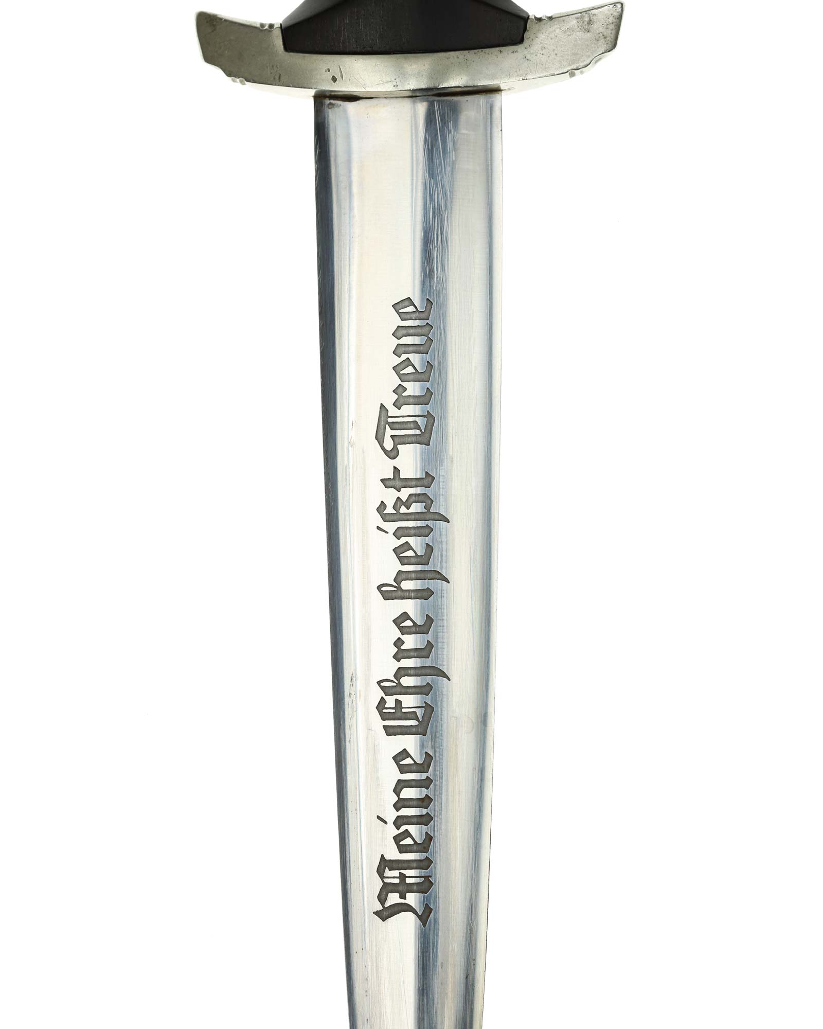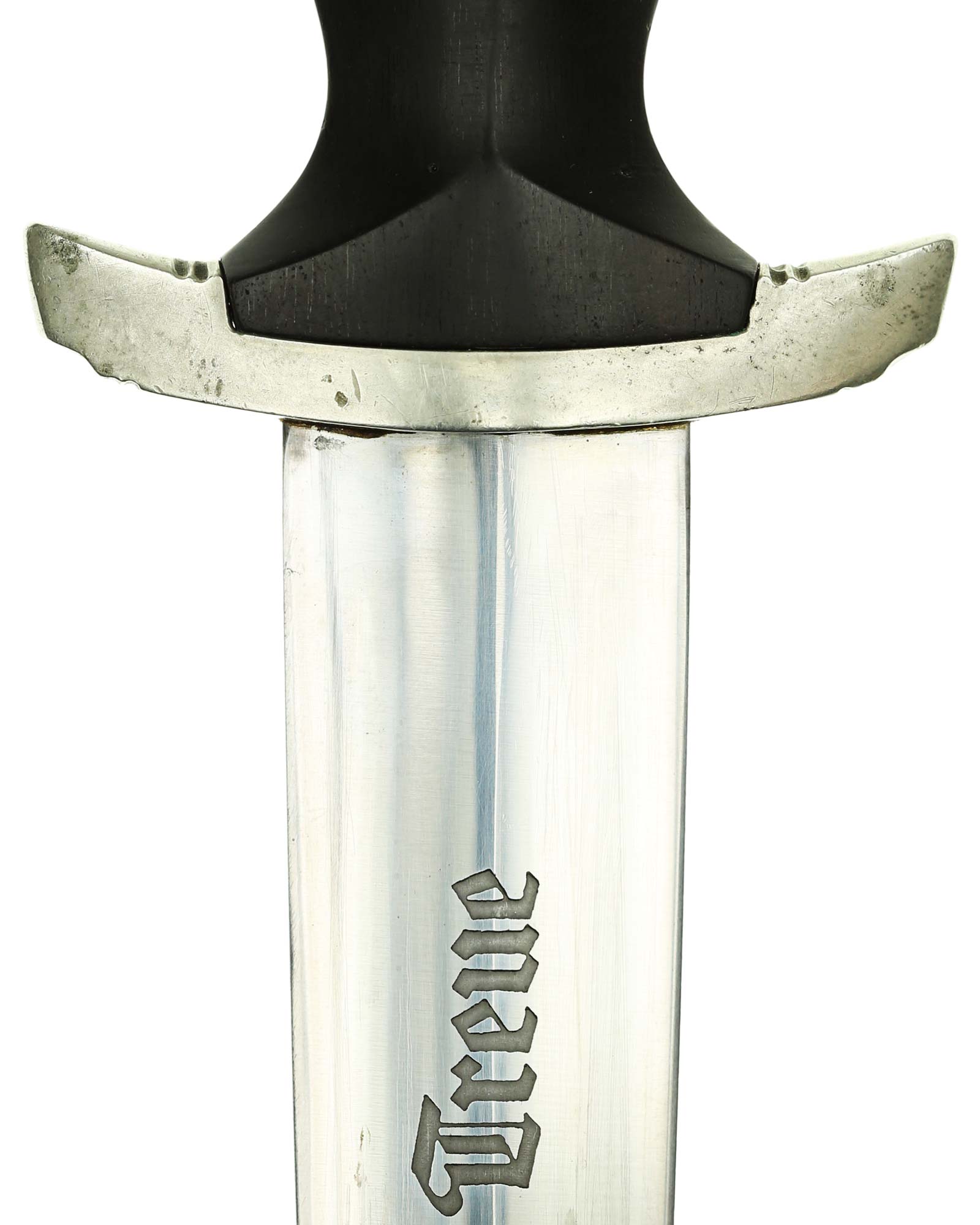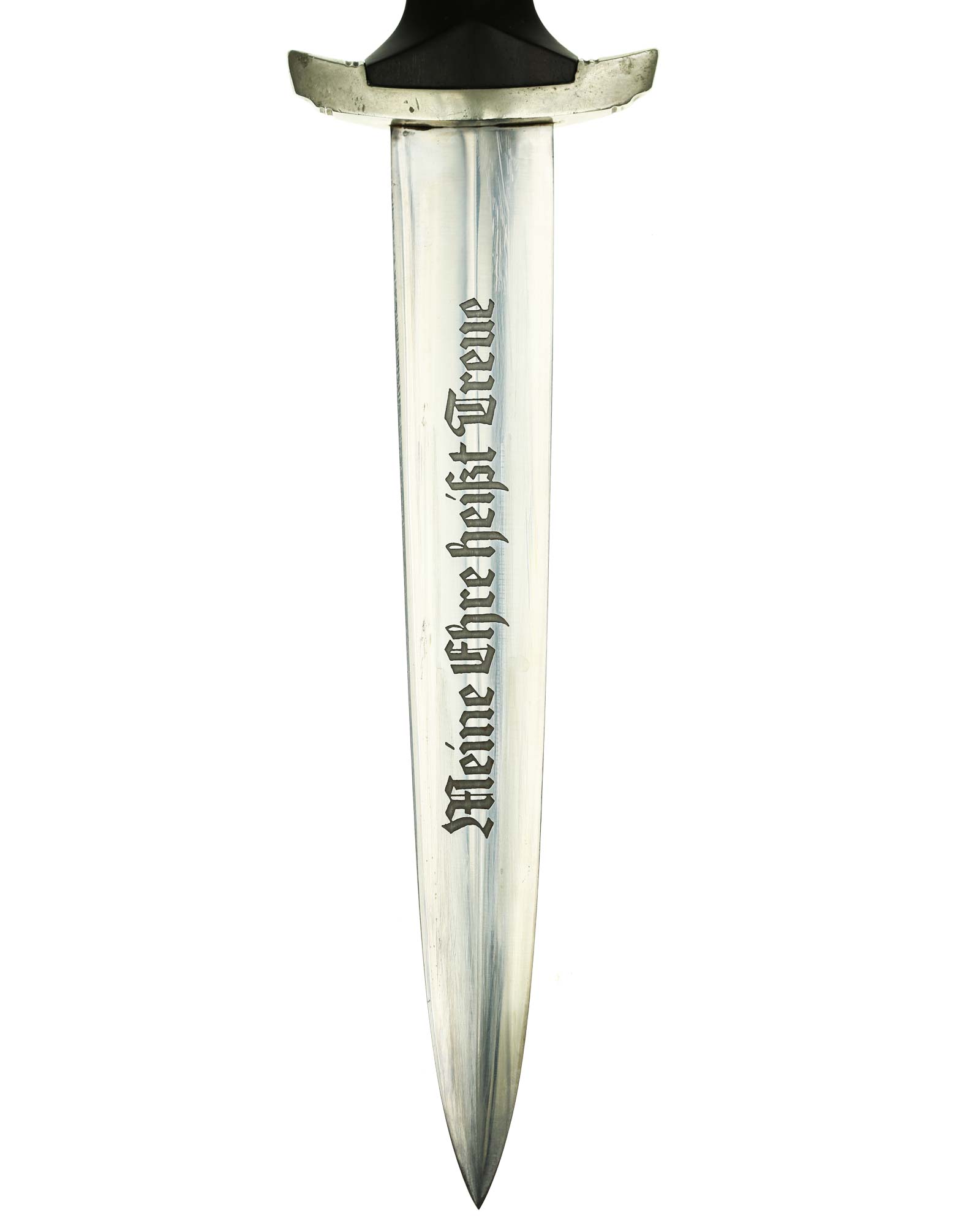 Klinge: Die Klinge ist ohne Rost. Auf der Vorderseite der Klinge befindet sich die SS Devise, diese ist dunkel und zackig, mit der Inschrift: Meine Ehre heißt Treue, die Rückseite ist mit kompletter Himmler-Inschrift: „In herzlicher Kameradschaft H. Himmler“. Unten befindet sich das Herstellerlogo: Carl Eickhorn, Solingen. Klinge beidseitig mit leichten Schleifspuren von der Scheide. Die Schultern der Klinge passen perfekt auf die untere Parierstange.