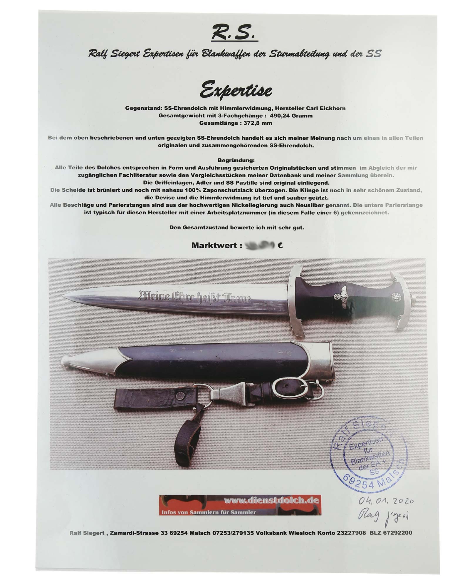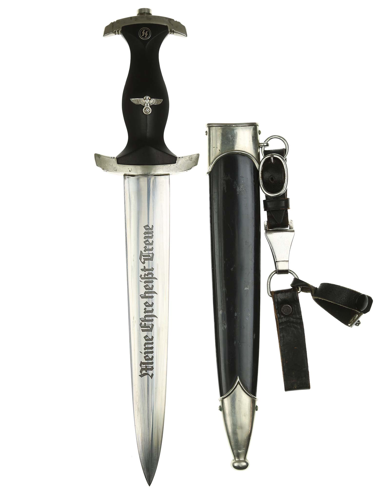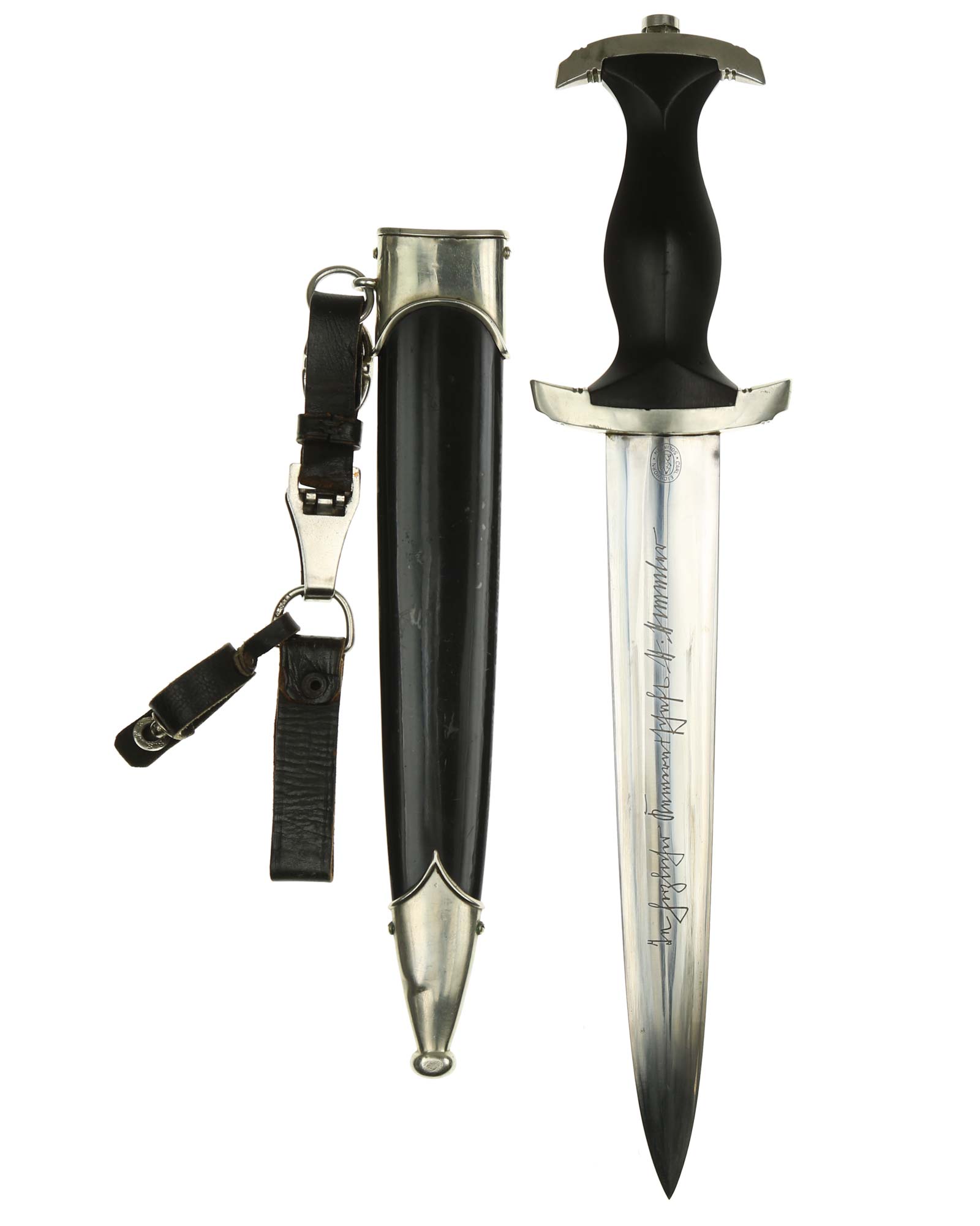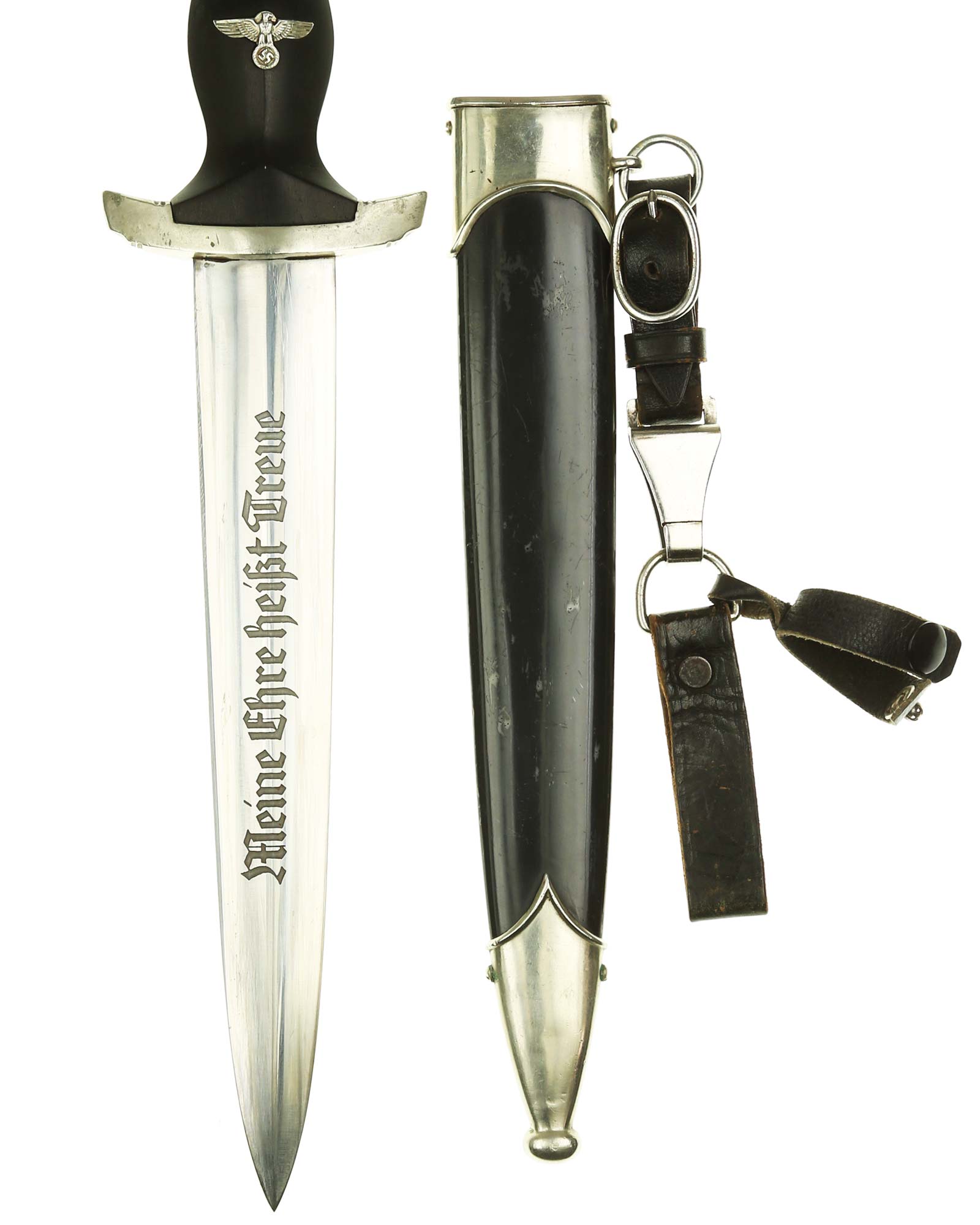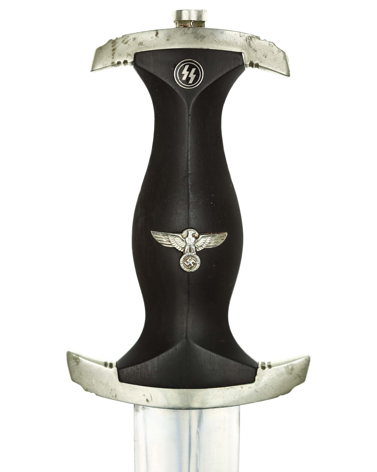 Klinge: Die Klinge ist ohne Rost. Auf der Vorderseite der Klinge befindet sich die SS Devise, diese ist dunkel und zackig, mit der Inschrift: Meine Ehre heißt Treue, die Rückseite ist mit kompletter Himmler-Inschrift: „In herzlicher Kameradschaft H. Himmler“. Unten befindet sich das Herstellerlogo: Carl Eickhorn, Solingen. Klinge beidseitig mit leichten Schleifspuren von der Scheide. Die Schultern der Klinge passen perfekt auf die untere Parierstange.