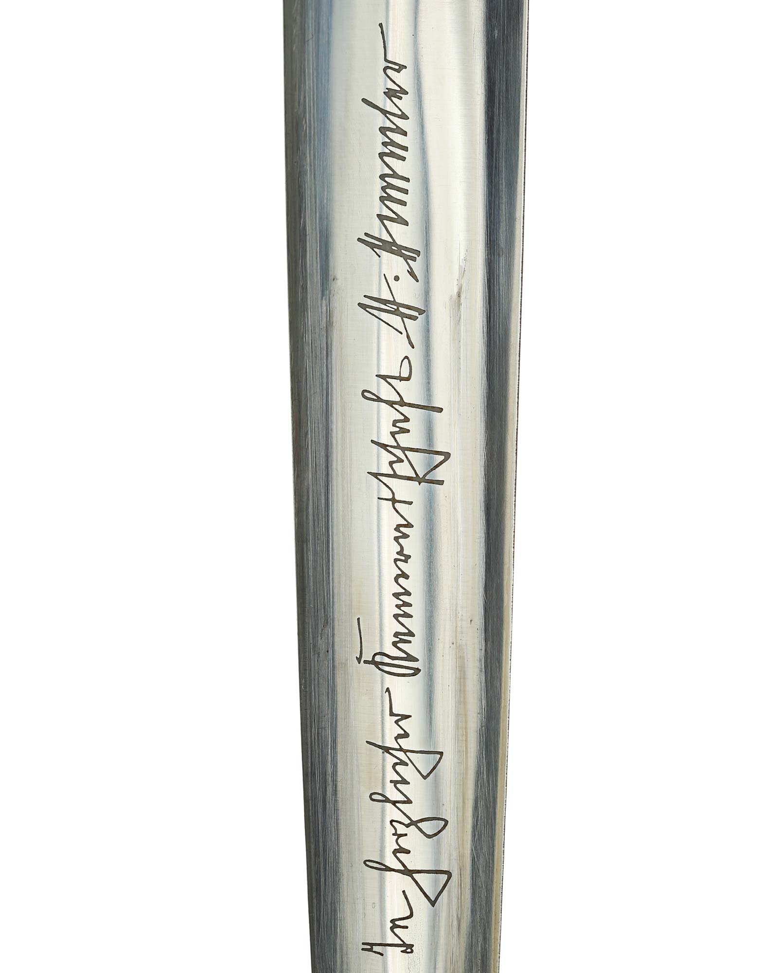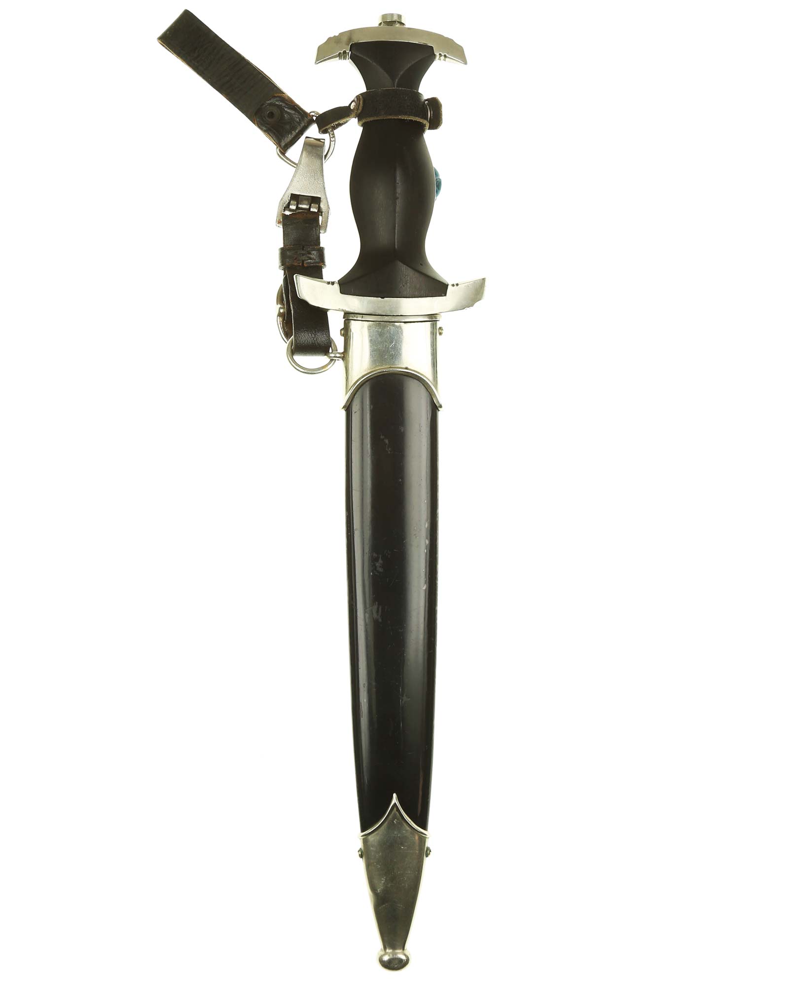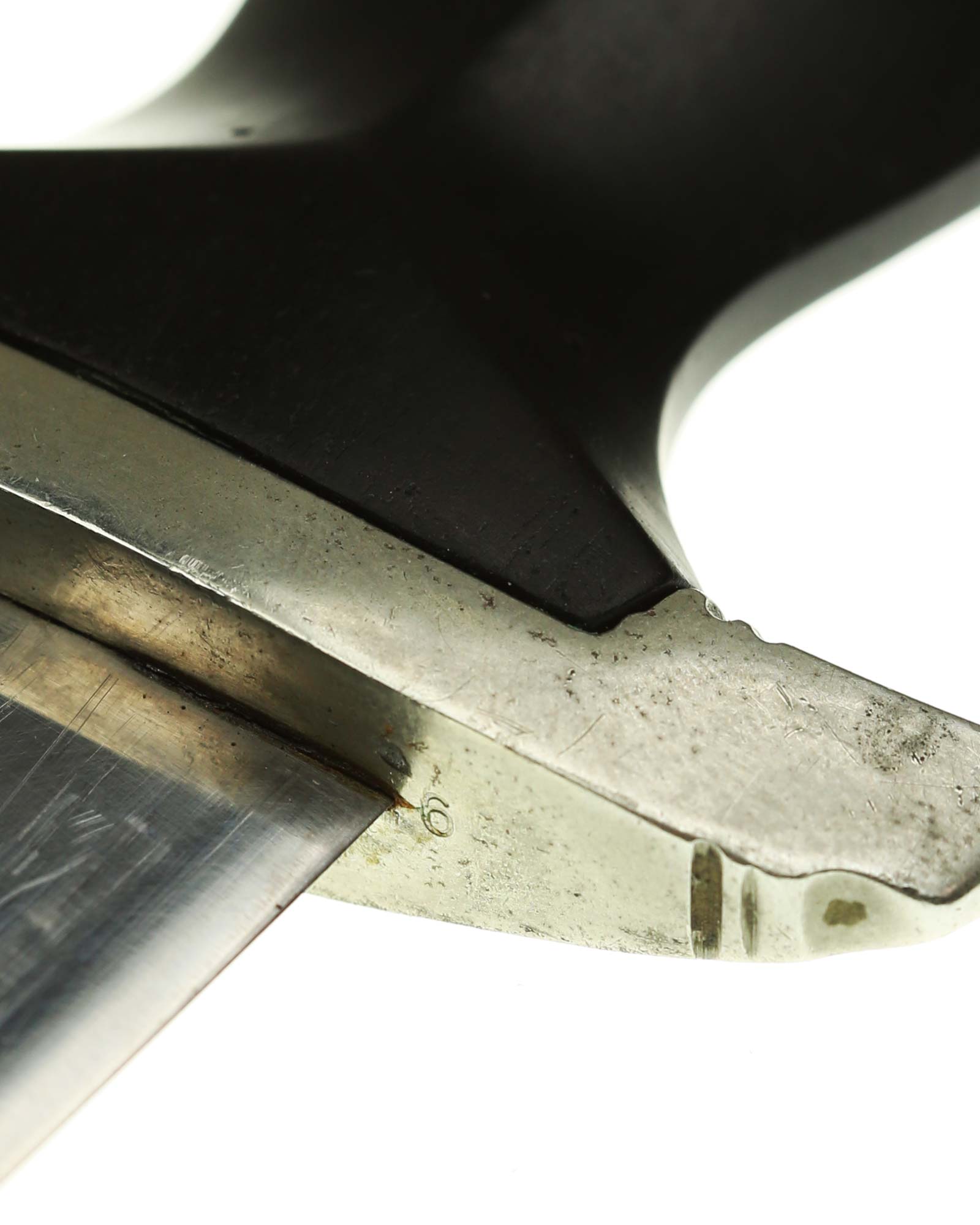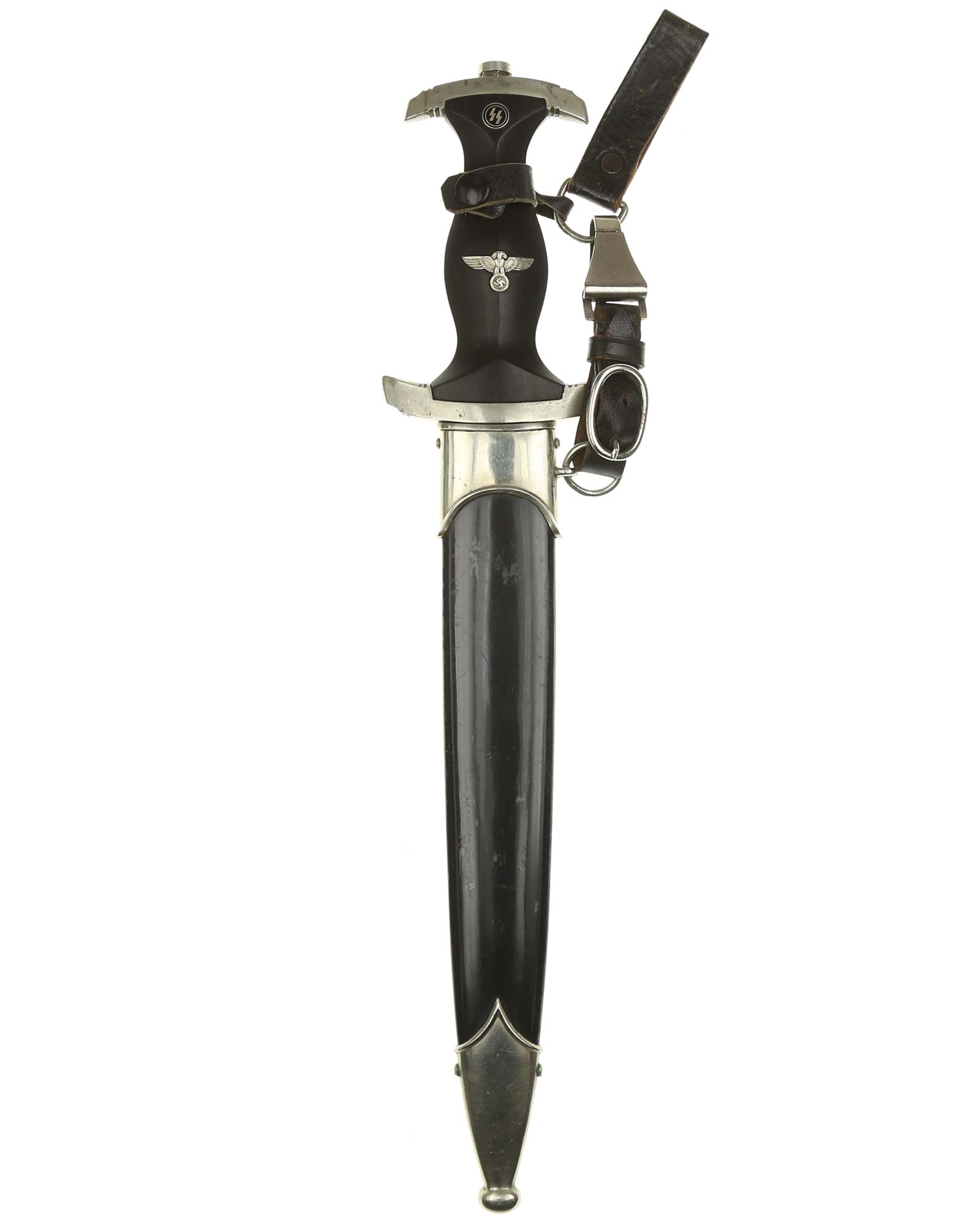 Klinge: Die Klinge ist ohne Rost. Auf der Vorderseite der Klinge befindet sich die SS Devise, diese ist dunkel und zackig, mit der Inschrift: Meine Ehre heißt Treue, die Rückseite ist mit kompletter Himmler-Inschrift: „In herzlicher Kameradschaft H. Himmler“. Unten befindet sich das Herstellerlogo: Carl Eickhorn, Solingen. Klinge beidseitig mit leichten Schleifspuren von der Scheide. Die Schultern der Klinge passen perfekt auf die untere Parierstange.