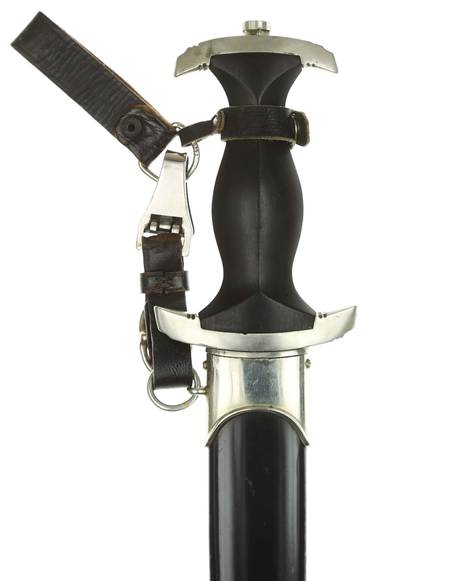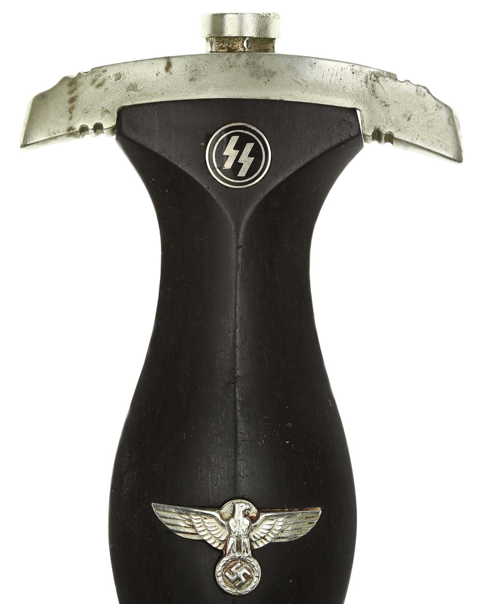 Griff: Griff: Der Griff besteht aus Holz. Auf dem Griff befinden sich die SS Runen und der Hoheitsadler, diese sind innen geklammert. Griffschraube ist unbeschädigt. Untere Parierstange mit Arbeitsplatznummer "6" gekennzeichnet. Alle Beschläge und Parierstangen sind aus der hochwertigen Nickellegierung (Neusilber).