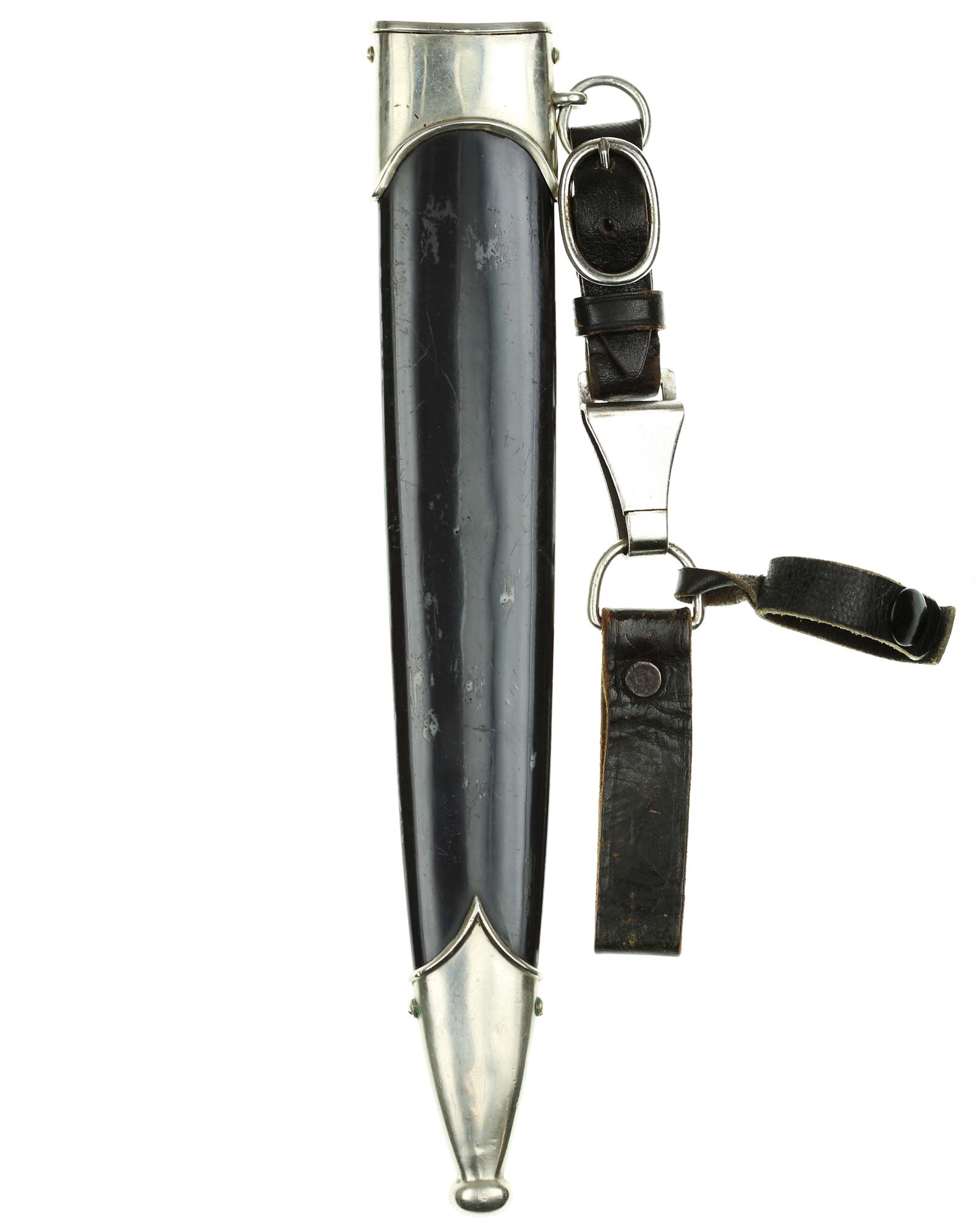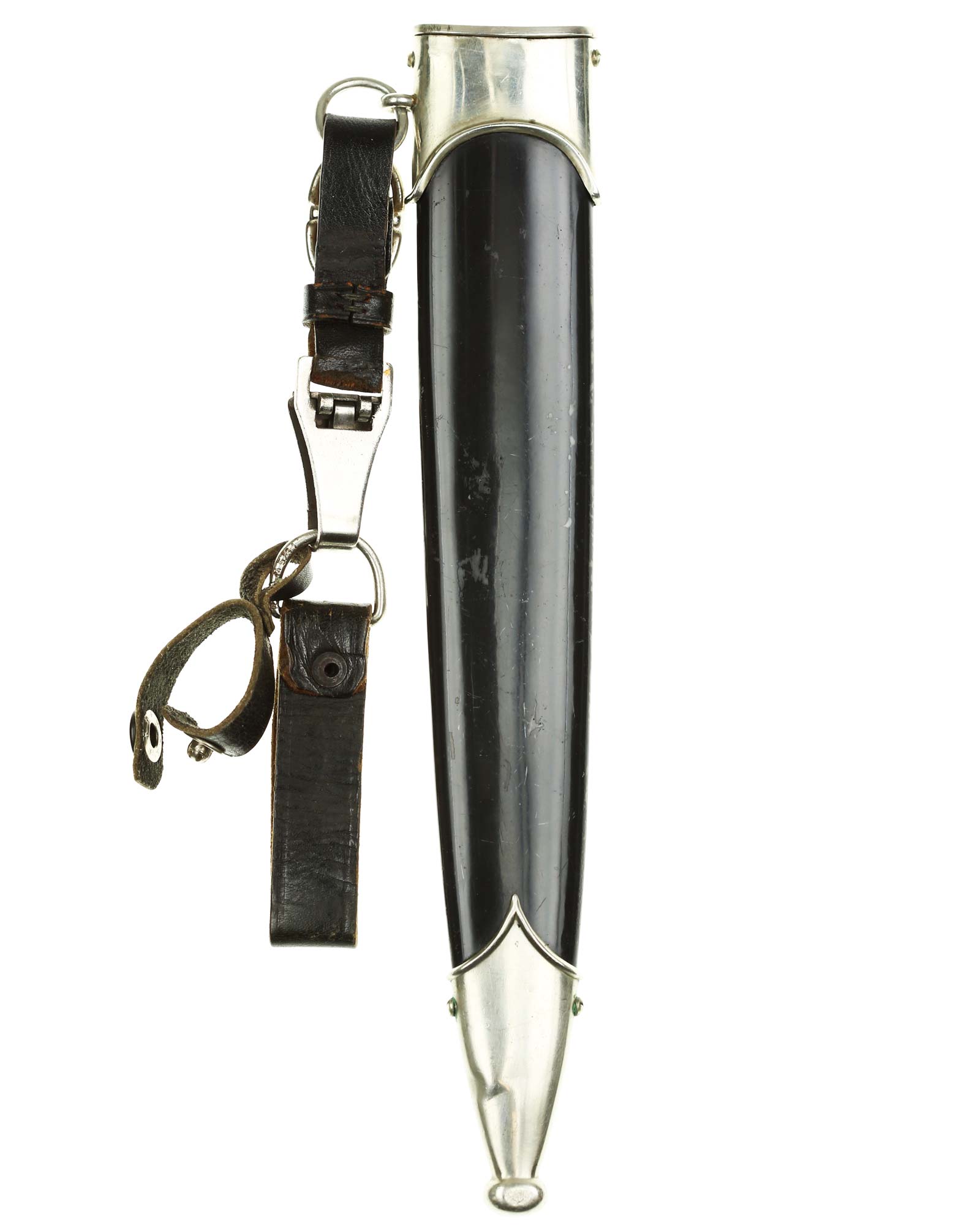 Scheide: Die Scheide ist aus Eisen und mit originaler Brünierung. Diese hat keine Beulen oder Dellen. Die beiden Scheidenbeschläge sind aus vernickeltem Stahlblech. Die Beschläge werden mit jeweils zwei Schräubchen seitlich gehalten. Am oberen Beschlag befindet sich der Ring für das Tragegehänge.
