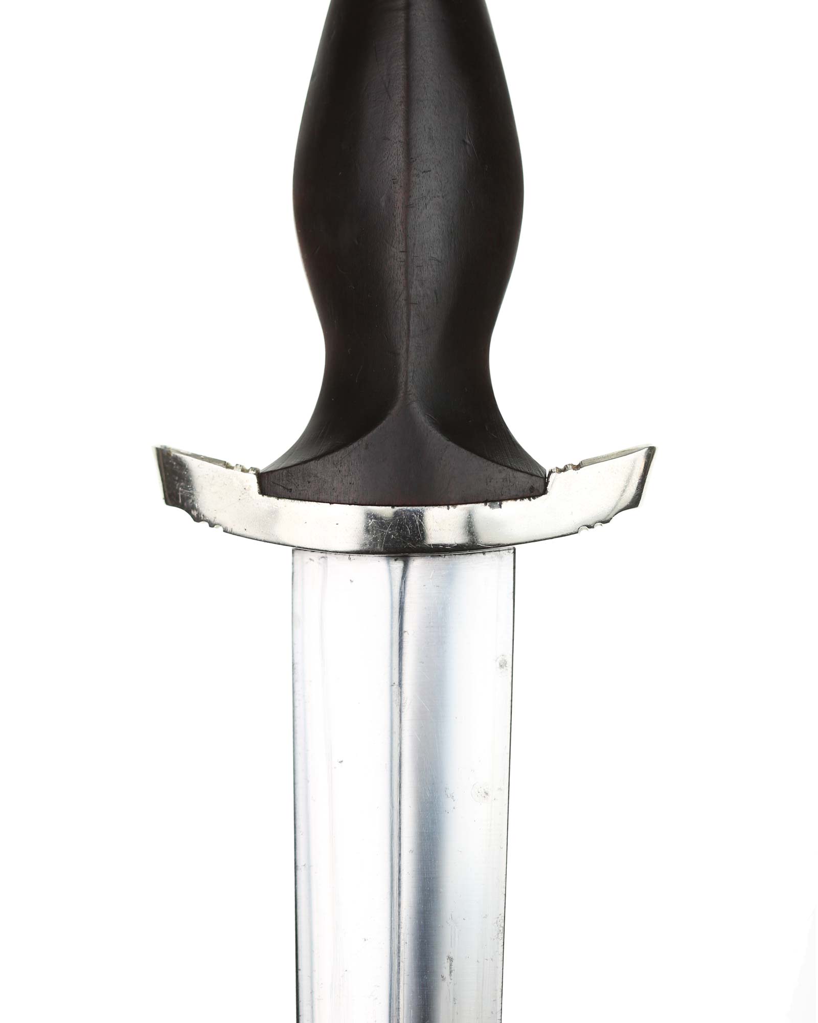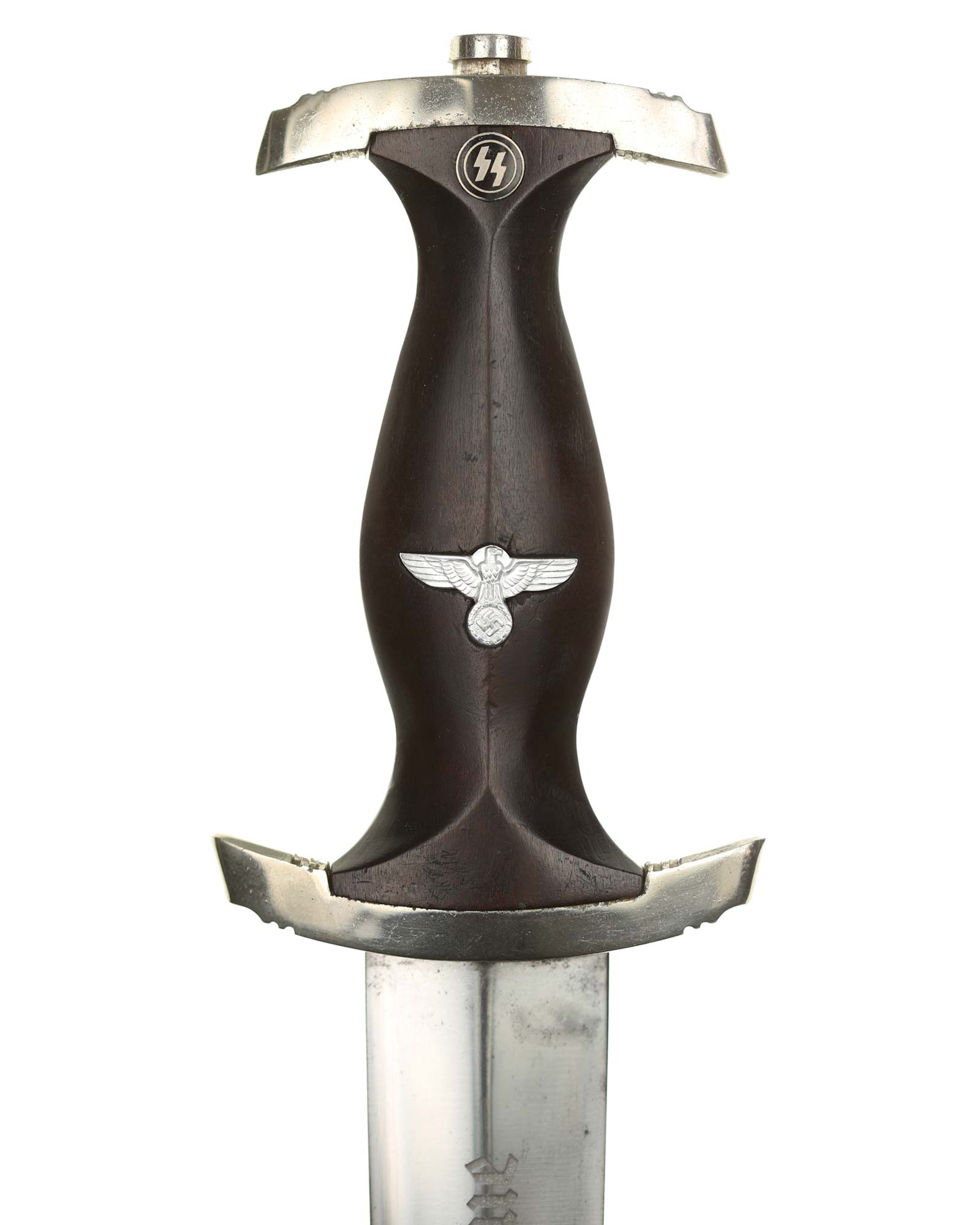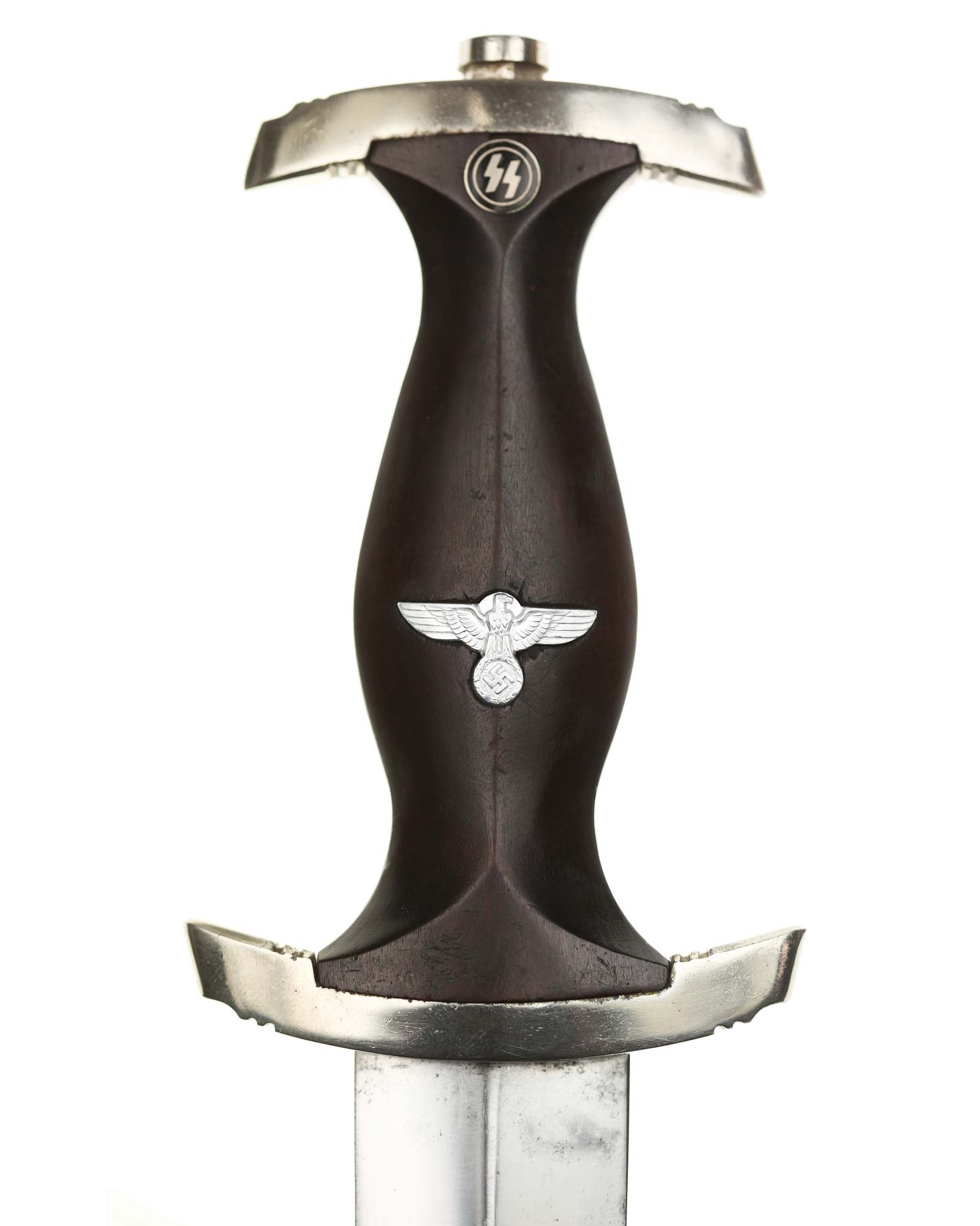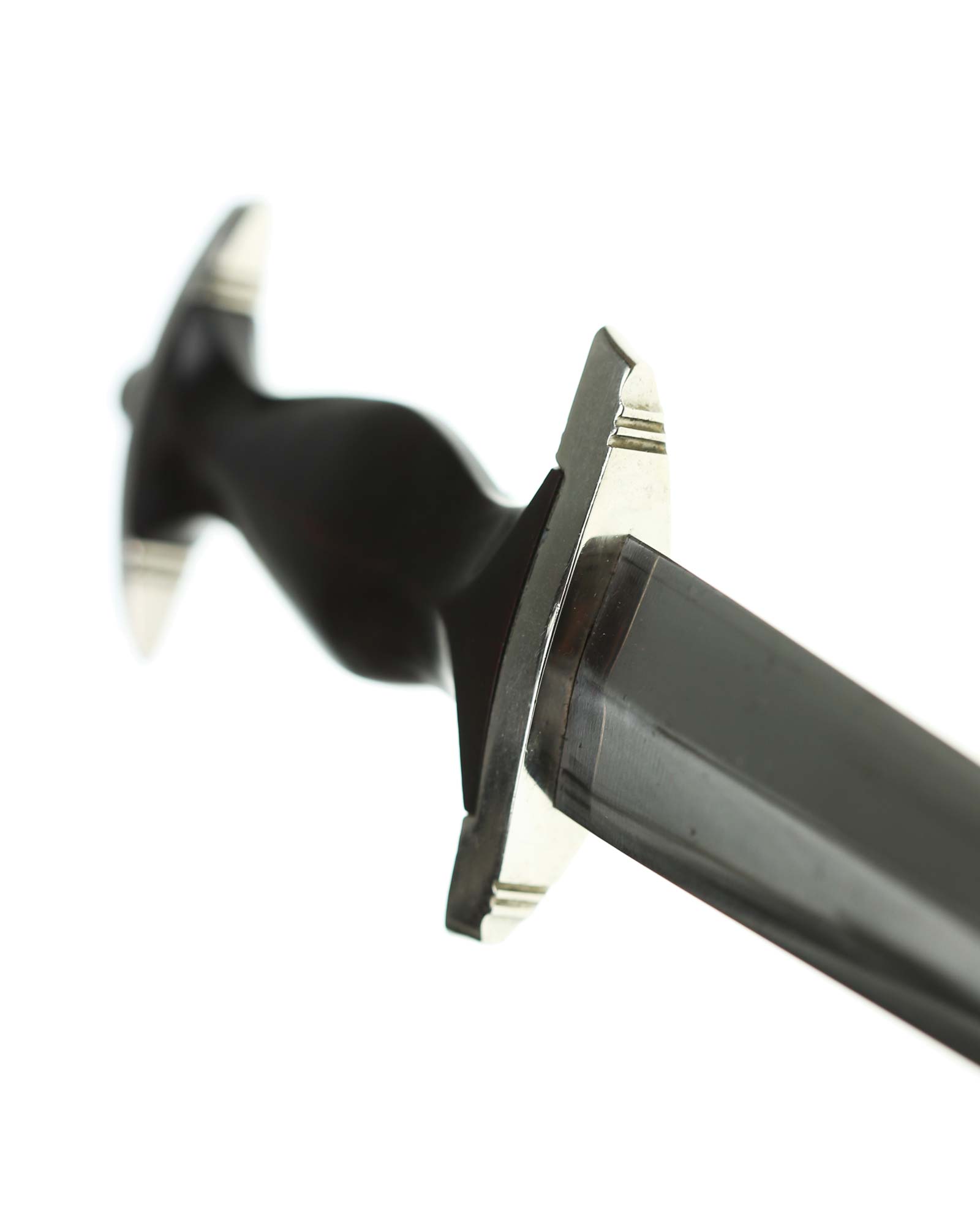 Griff: Der Griff besteht aus einem schwarzen Ebenholz. Auf dem Griff befinden sich die SS Runen und der Hoheitsadler, diese sind innen geklammert.