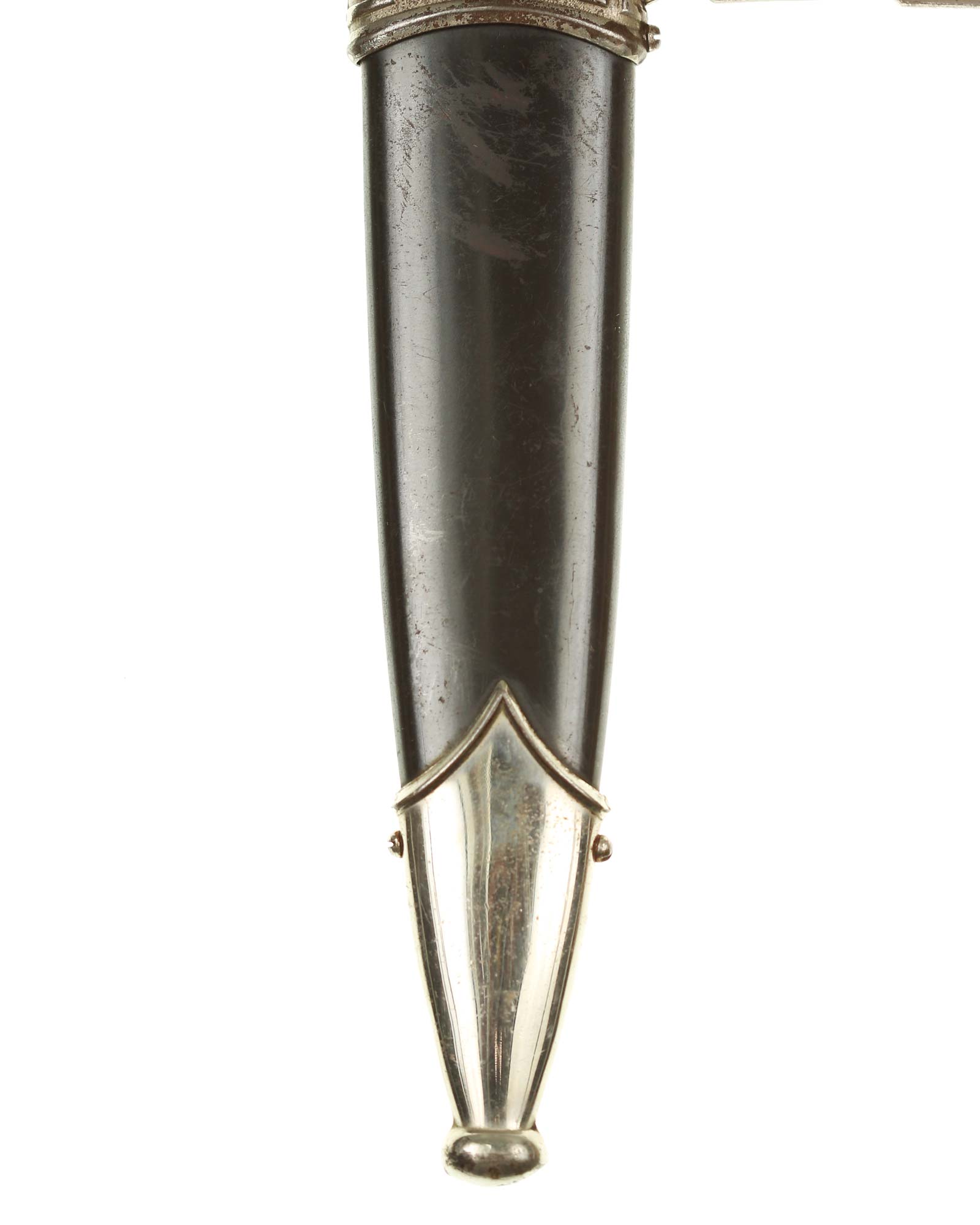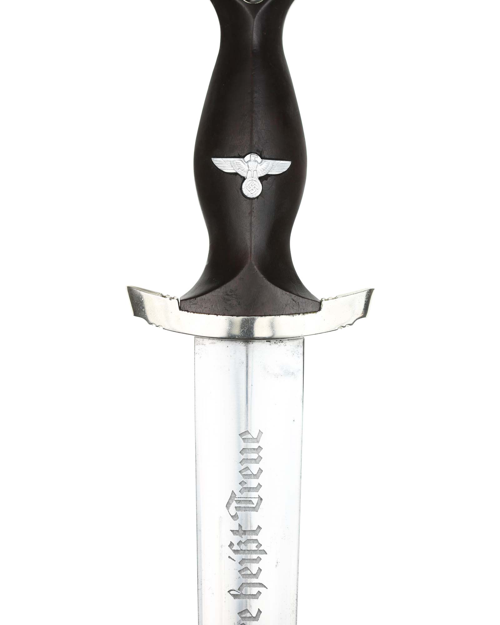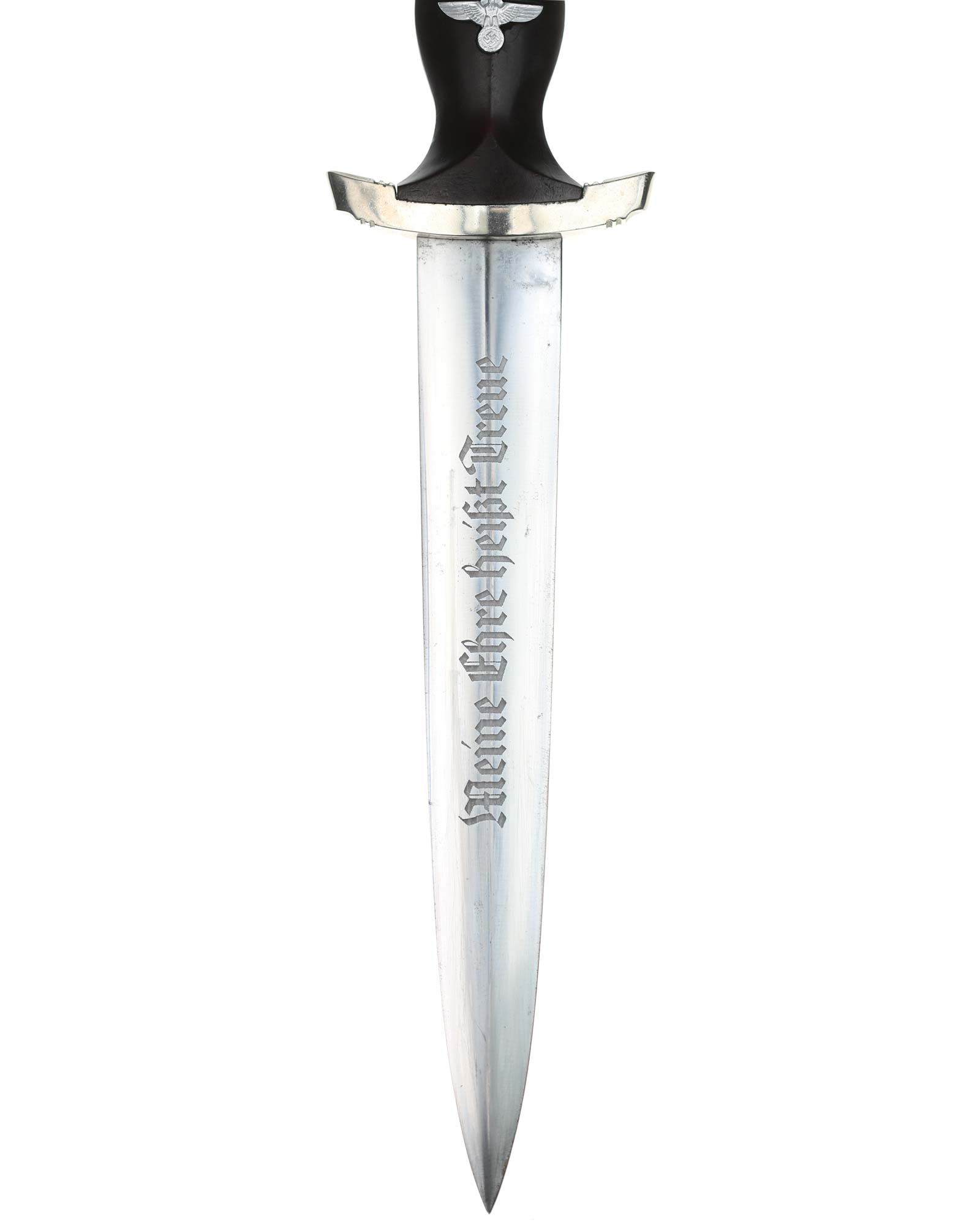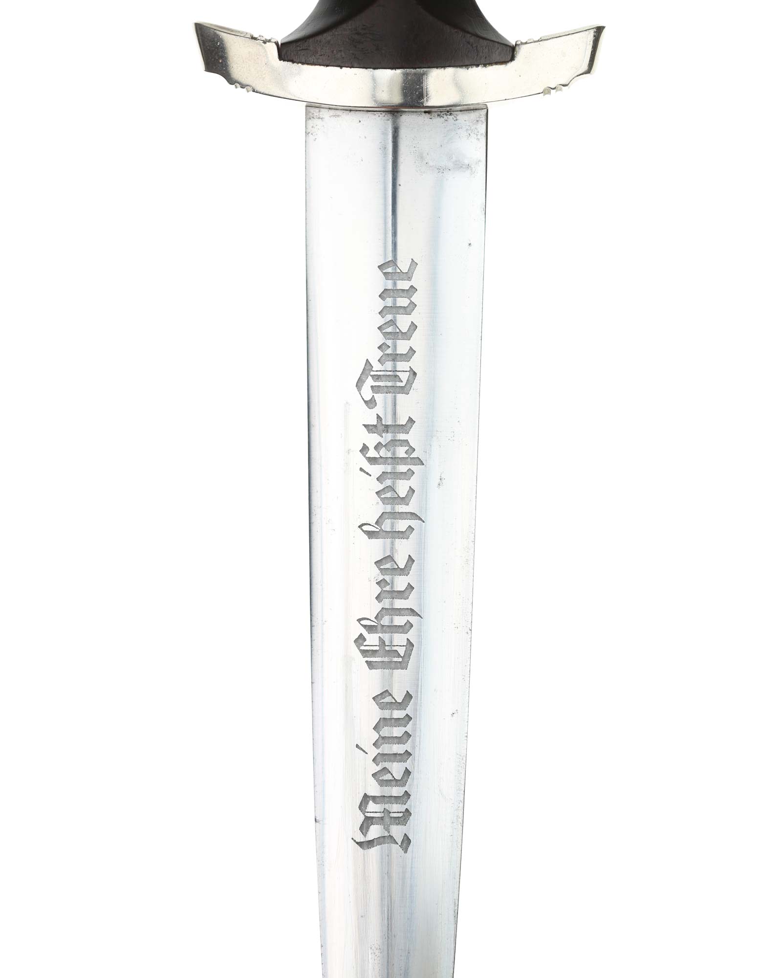 Klinge: Die Klinge ist spiegelblank ohne Rost oder Kerben. Auf der vorderen Seite der Klinge befindet sich die SS Devise mit der Inschrift: Meine Ehre heißt Treue, die Rückseite ist blank ohne Hersteller, wie es vorschriftlich auch sein sollte. Die Klingenspitze ist erhalten und ungekürzt.