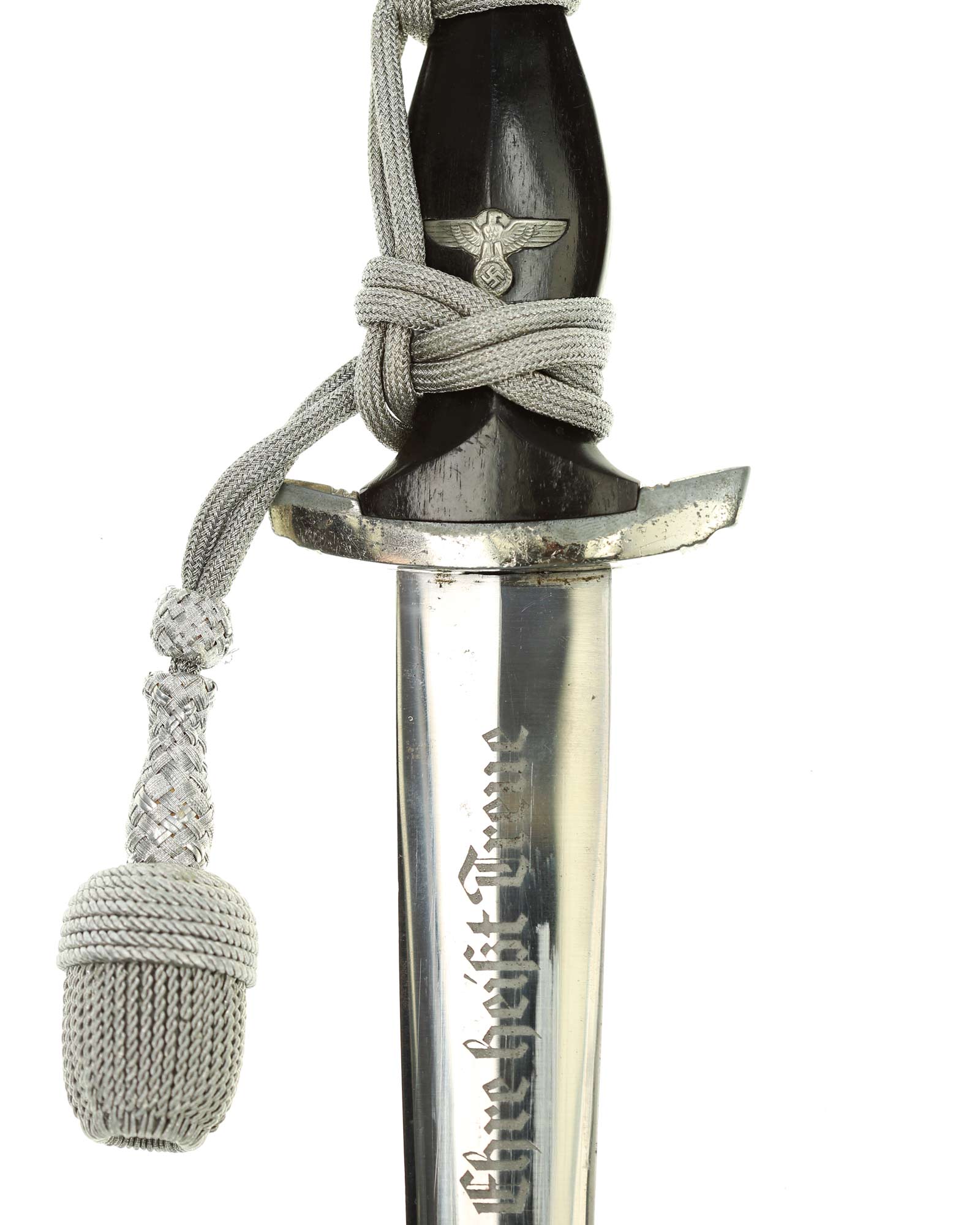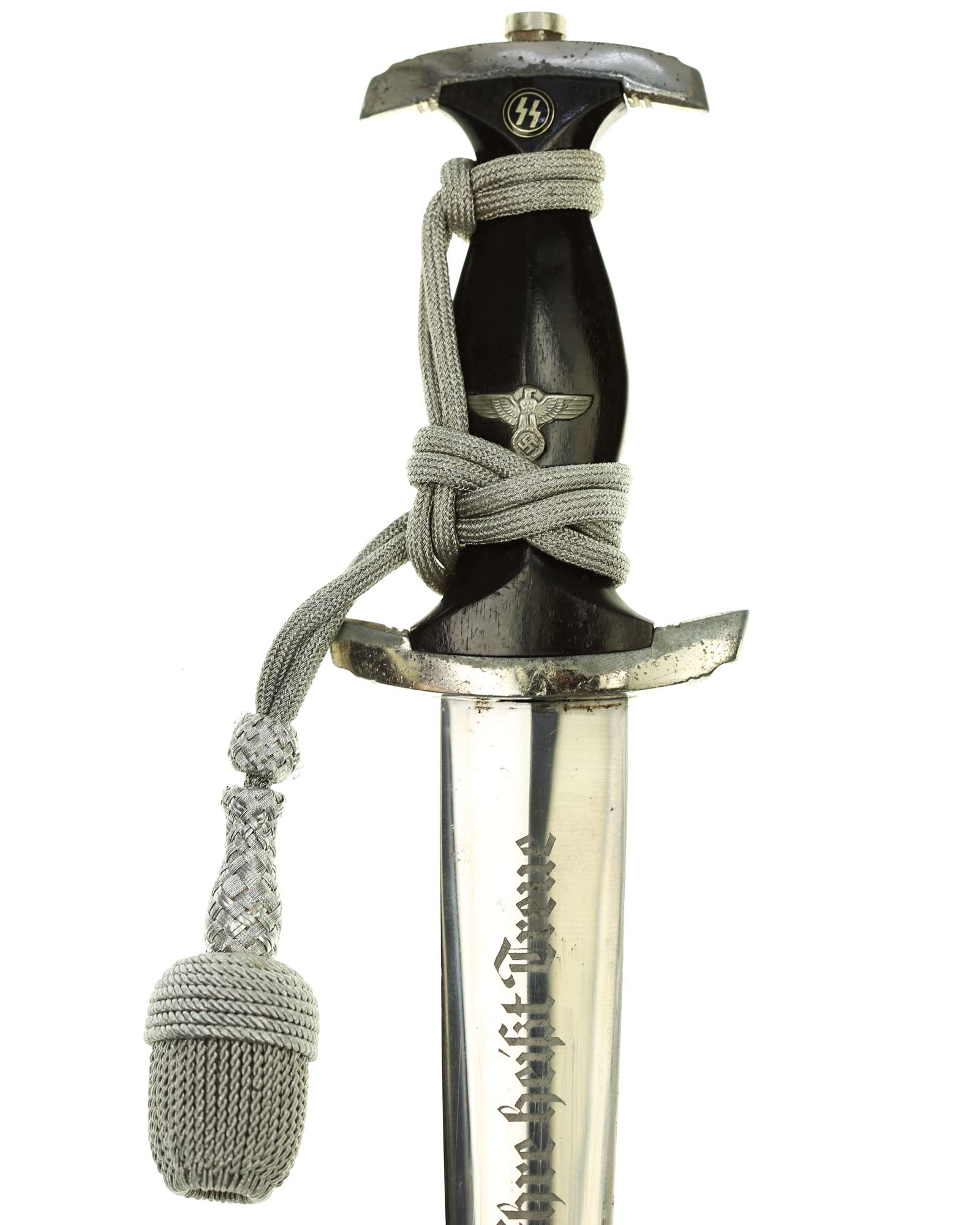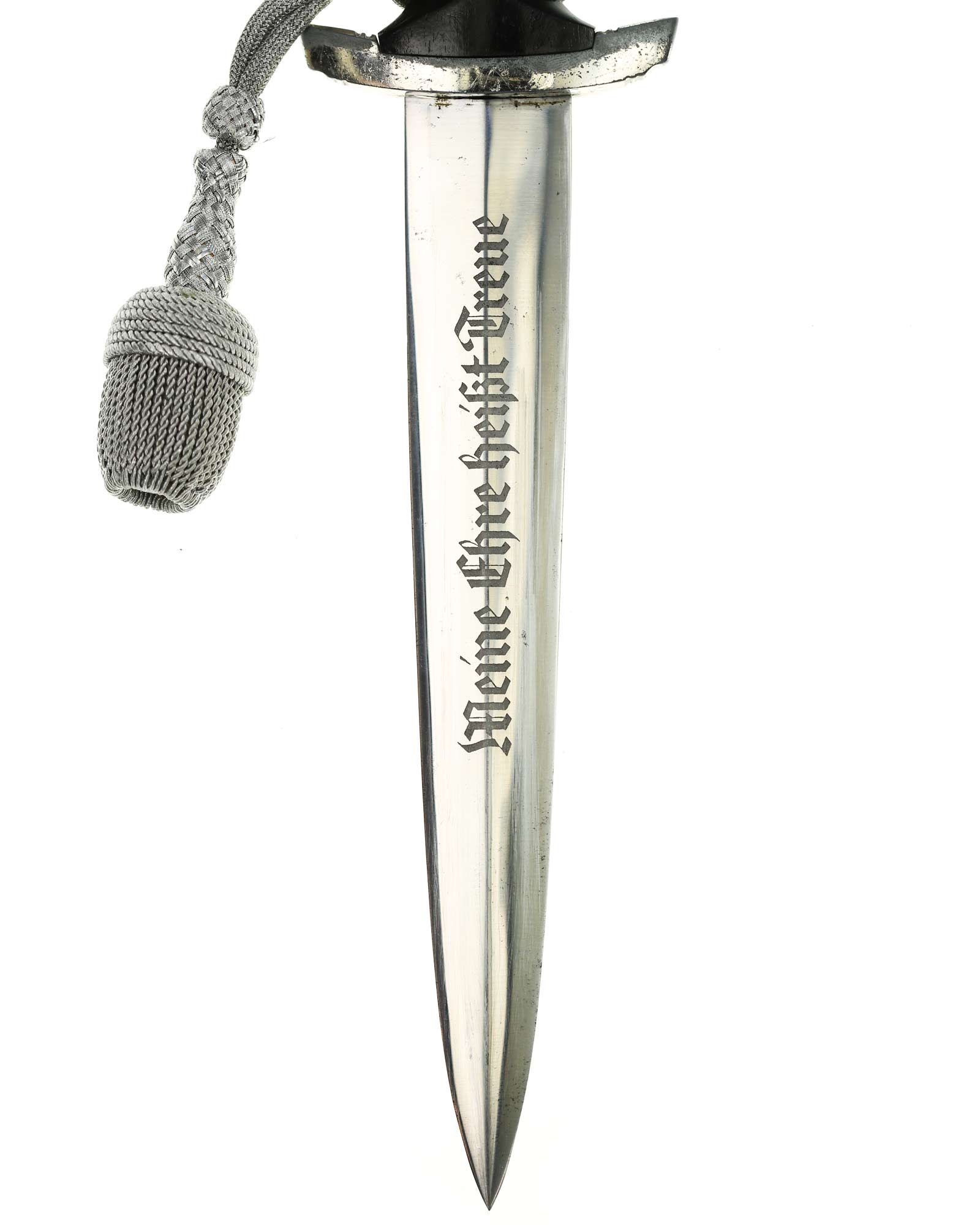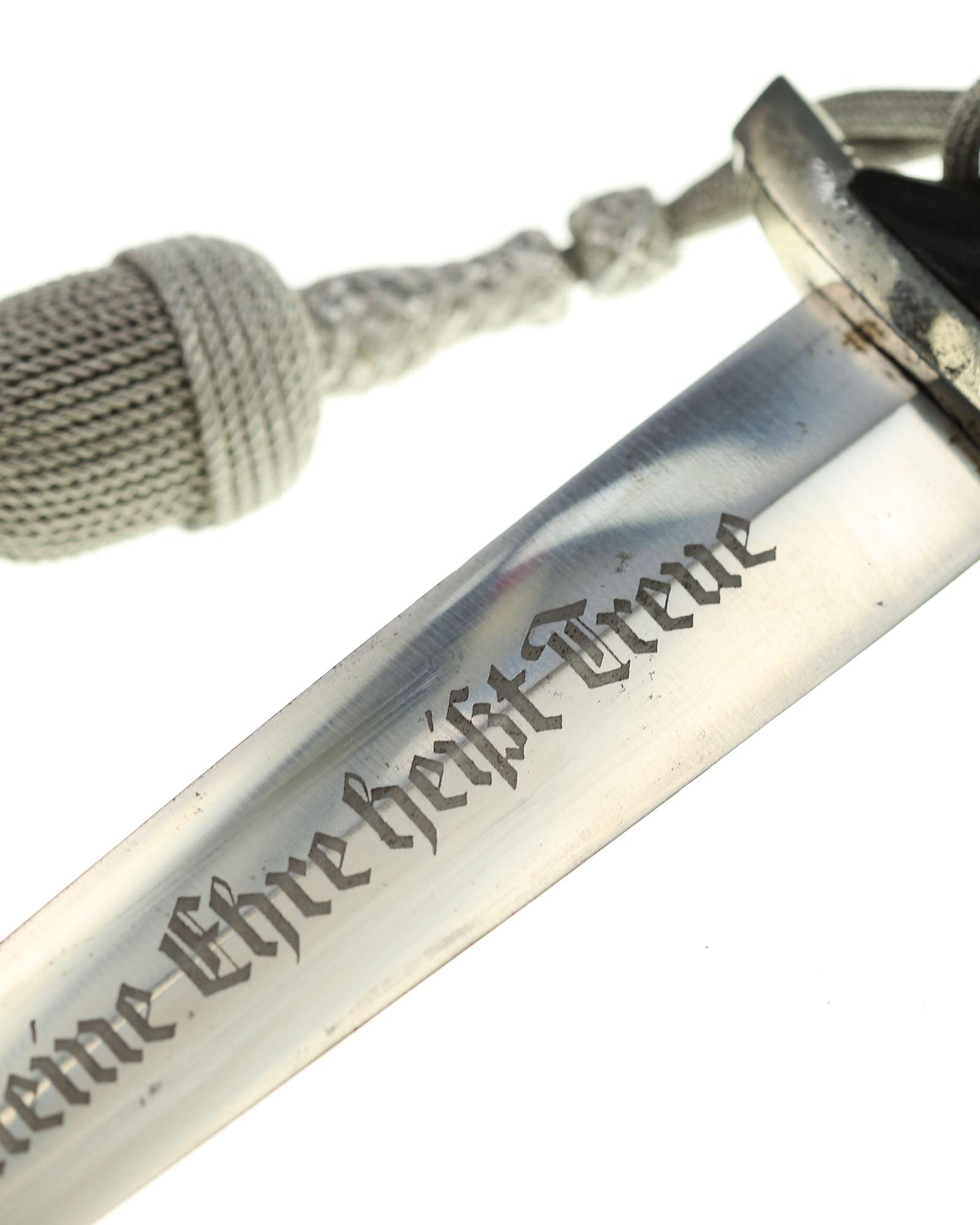 Klinge: Die Klinge zweischneidig und spiegelblank, ohne Rost und Kerben. Auf der Vorderseite der Klinge befindet sich die SS Devise mit der Inschrift: Meine Ehre heißt Treue, die Rückseite ist blank ohne Hersteller, wie es vorschriftlich auch sein sollte. Die Klingenschultern passen perfekt auf die untere Parierstange.